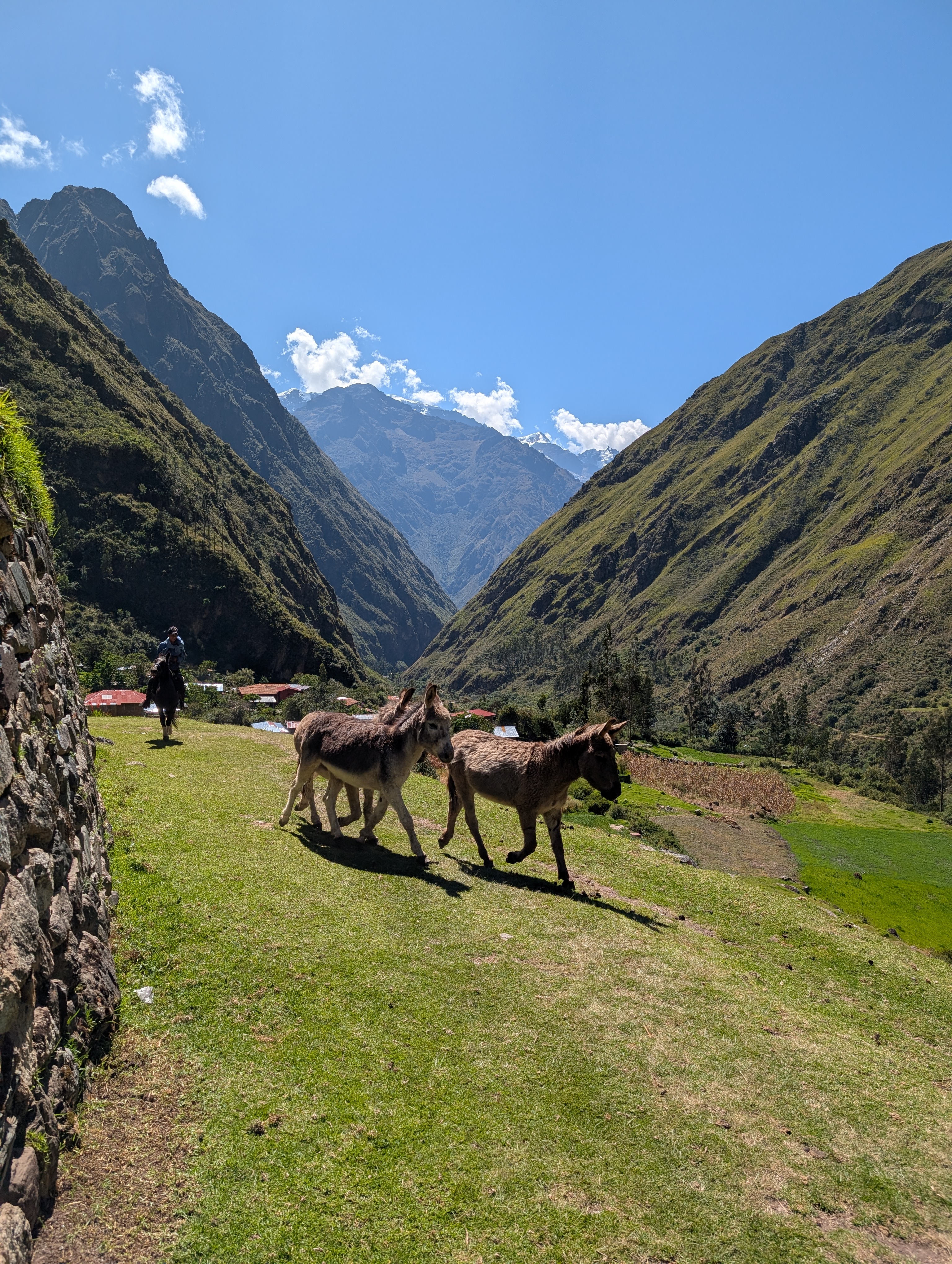 Just before 1 pm we head out and start to meander through some backyards. We pop out onto a rocky pathway and there are a couple dogs running around and some older women with donkeys. Some group’s clients are unable to meet the weight limit and women and children are hired to carry their extra gear between camps. Our arrival at this rocky pathway is so unceremonious that it takes me a while to fully understand that we are now officially on the Inca Trail.