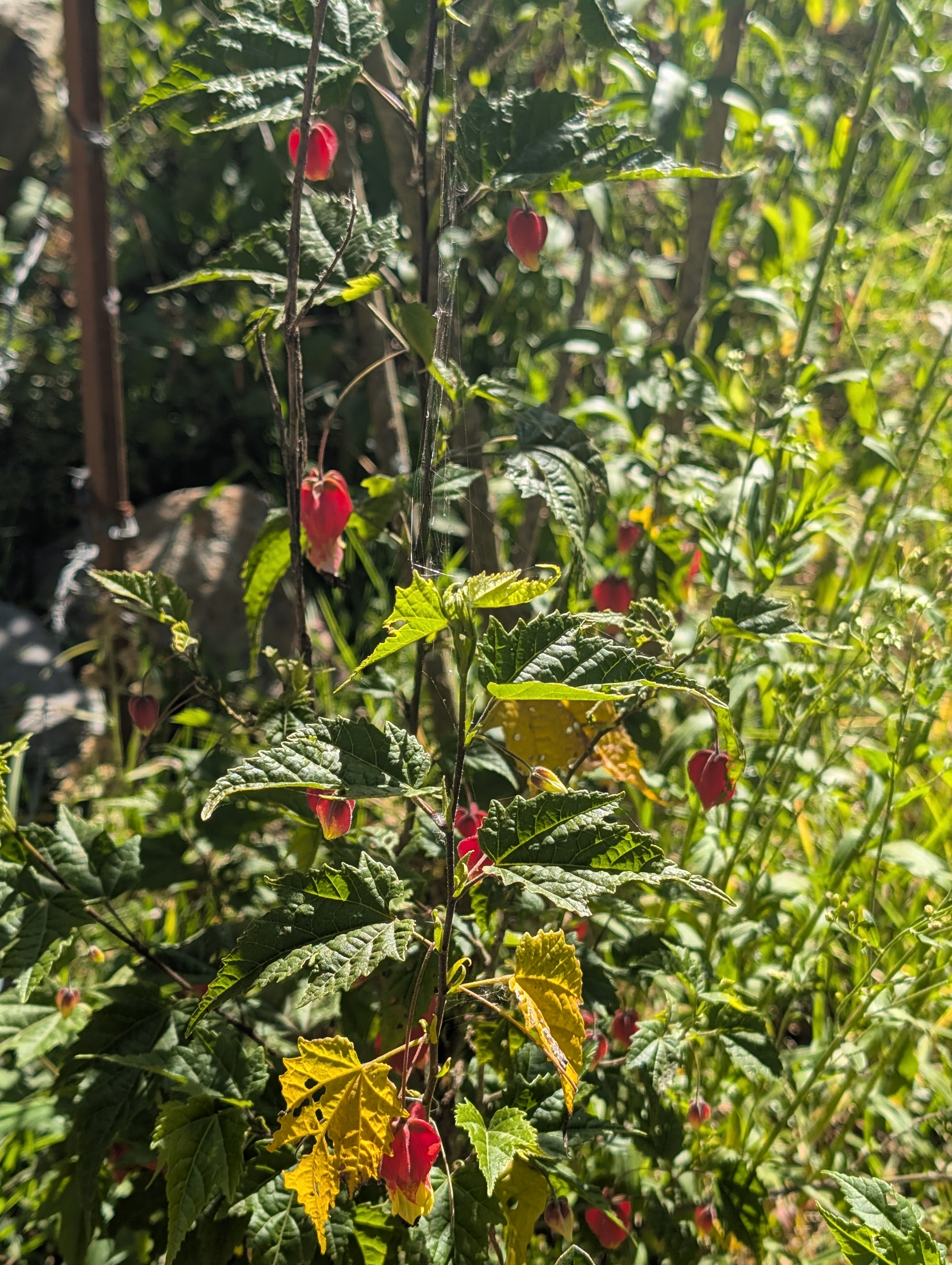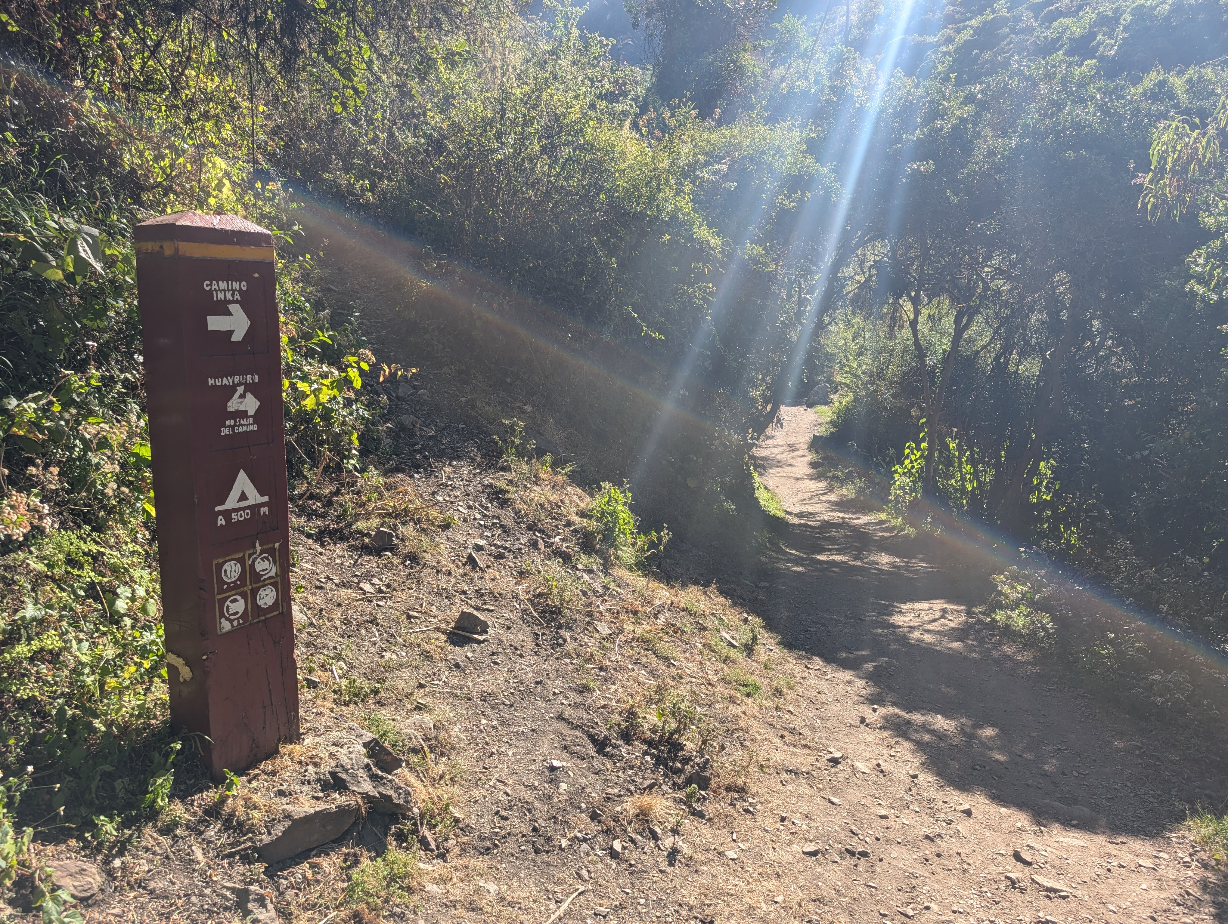 Our big left turn at Huayllabamba, leads us up the Llullucha Canyon where I spy red and yellow Abutilon. Along the trail’s edge, there are wooden signs with markings that I can’t decipher.