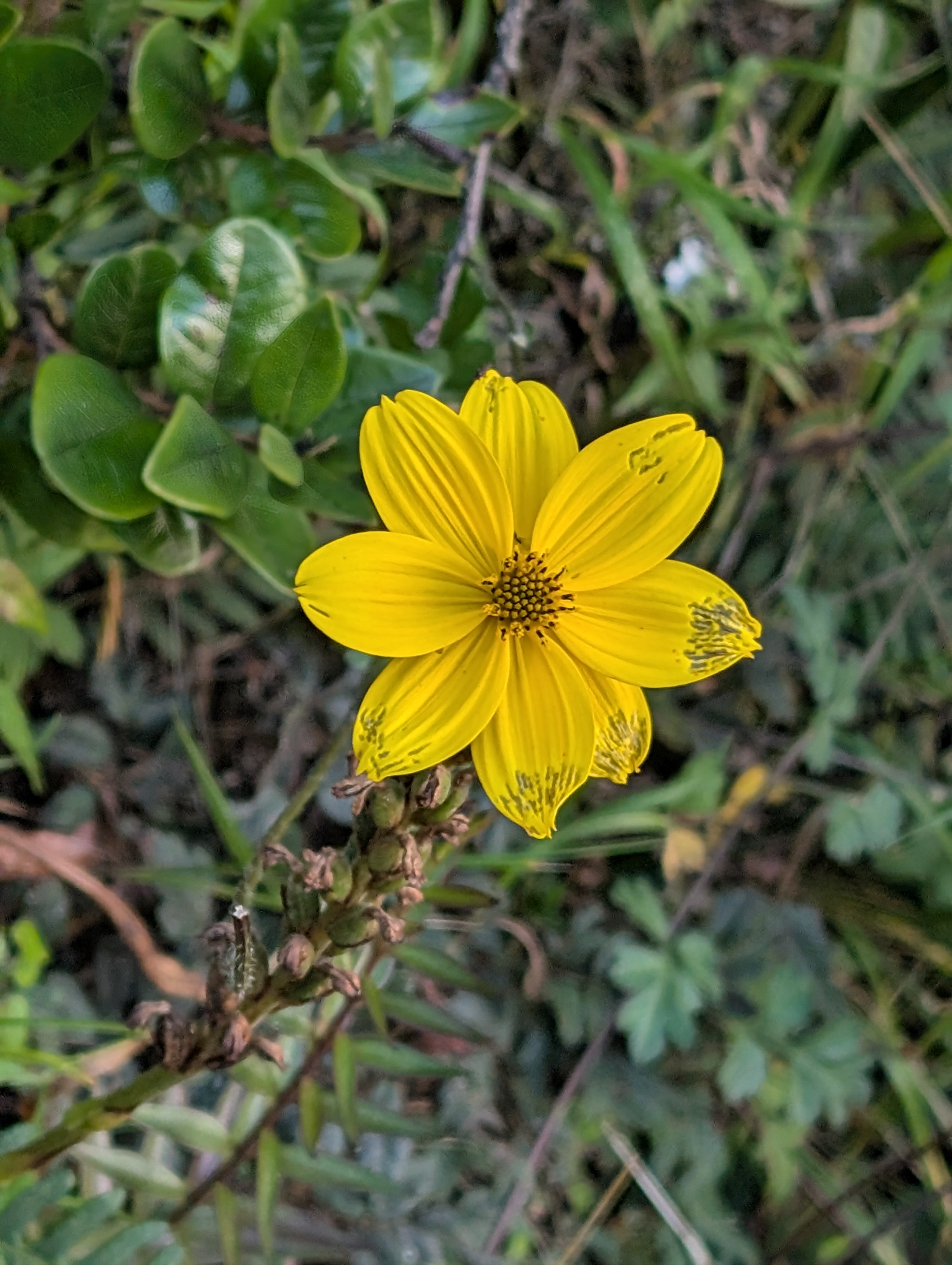We cross the small Rio Wayruru on a bridge built into downed trees. We climb another 10 minutes before arriving at the Ayapata camp about 3 pm. There are porters setting up tents as we descend into camp to use the bathroom. I look at my watch and realize that I forgot to restart it after lunch. Dang! After using the bathroom I restart the recording track. It won’t be perfectly accurate but at least we’ve been hiking in a fairly straight line up the Llullucha Canyon. We pass yellow Bidens flowers and purple Monnina shrubs as we continue climbing the Inca Trail.