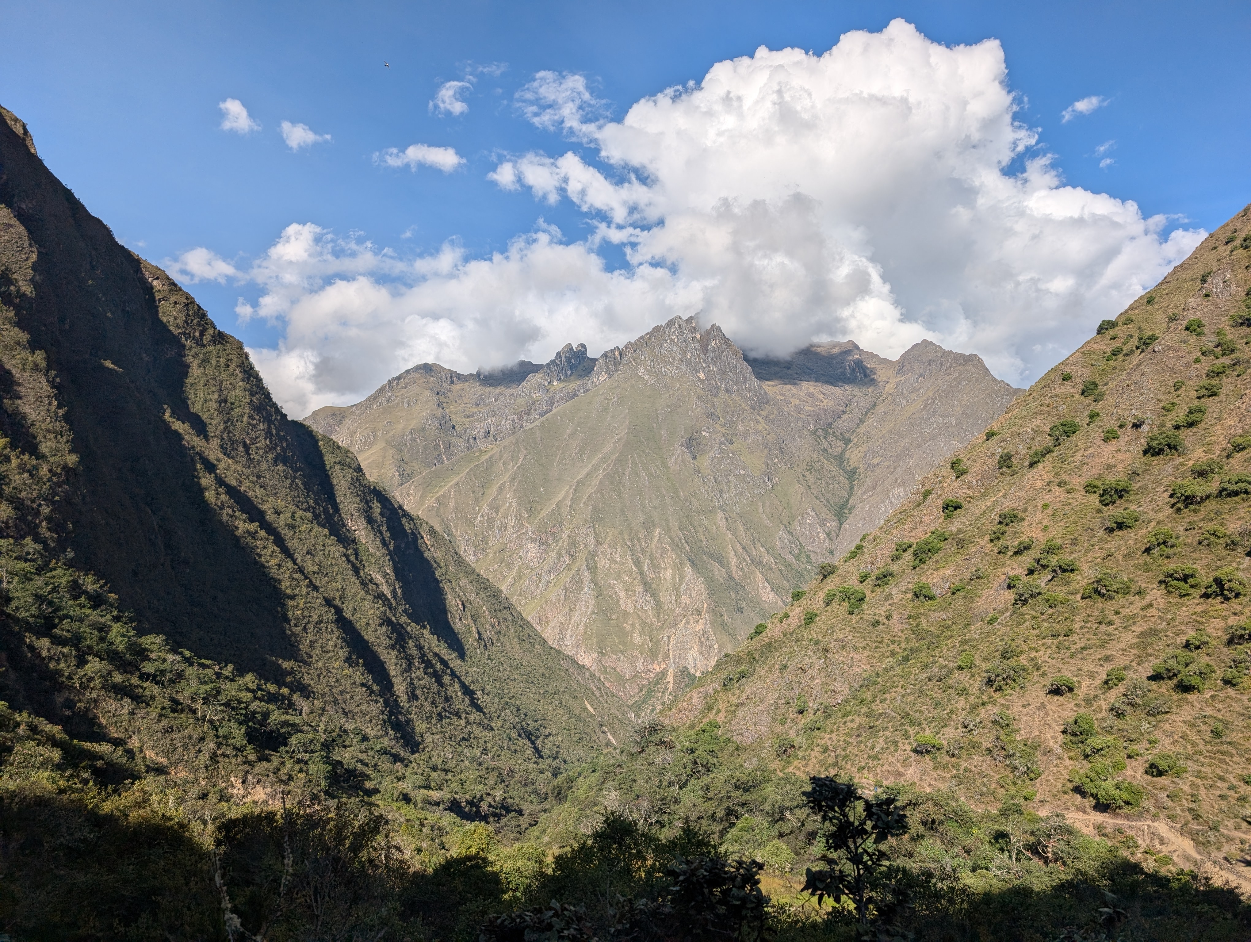 Above: Looking back down the canyon. Look for the dirt Inca Trail near the bottom right of the photo just above the shade. Then zoom in and look for a porter wearing blue.