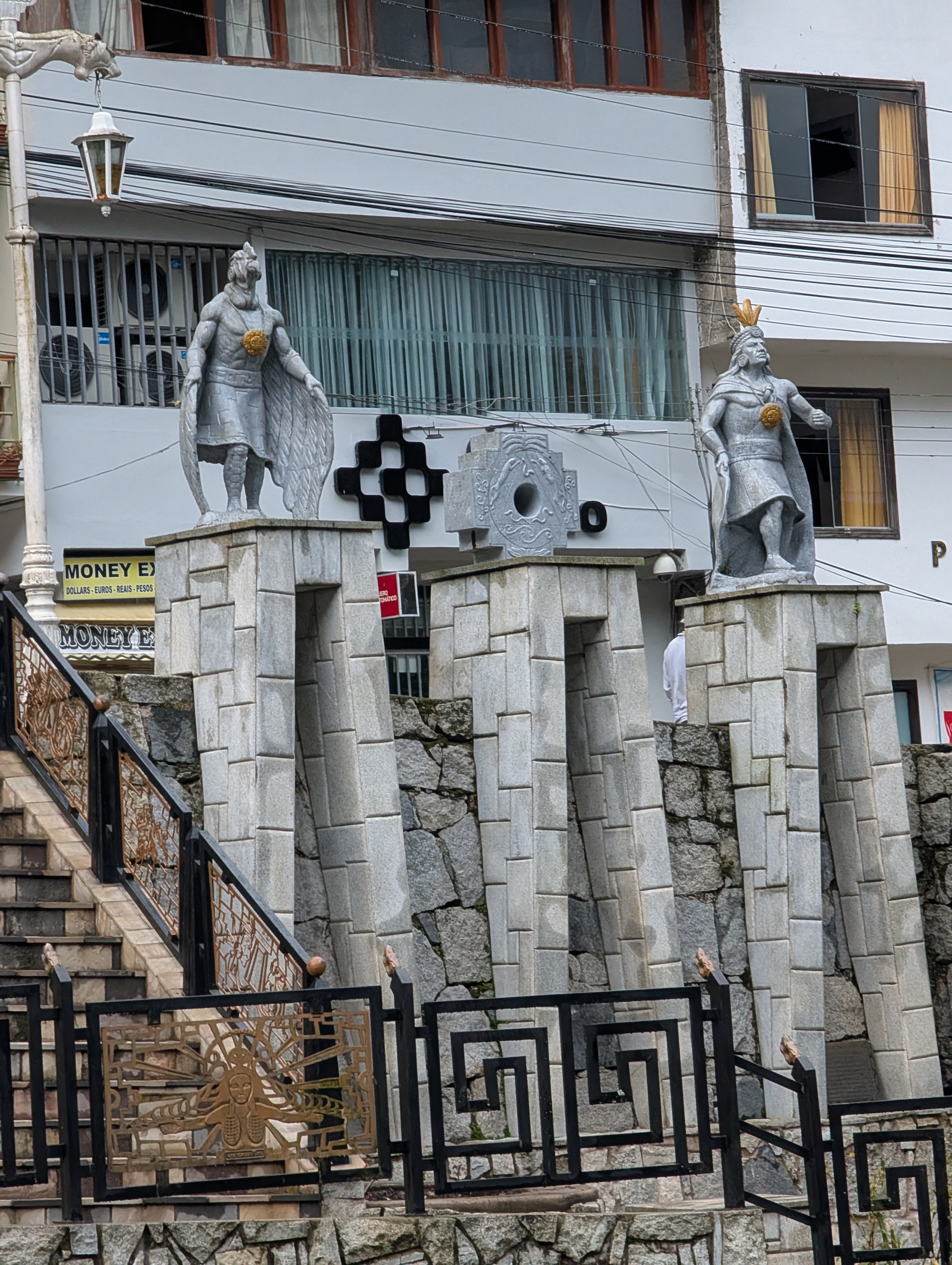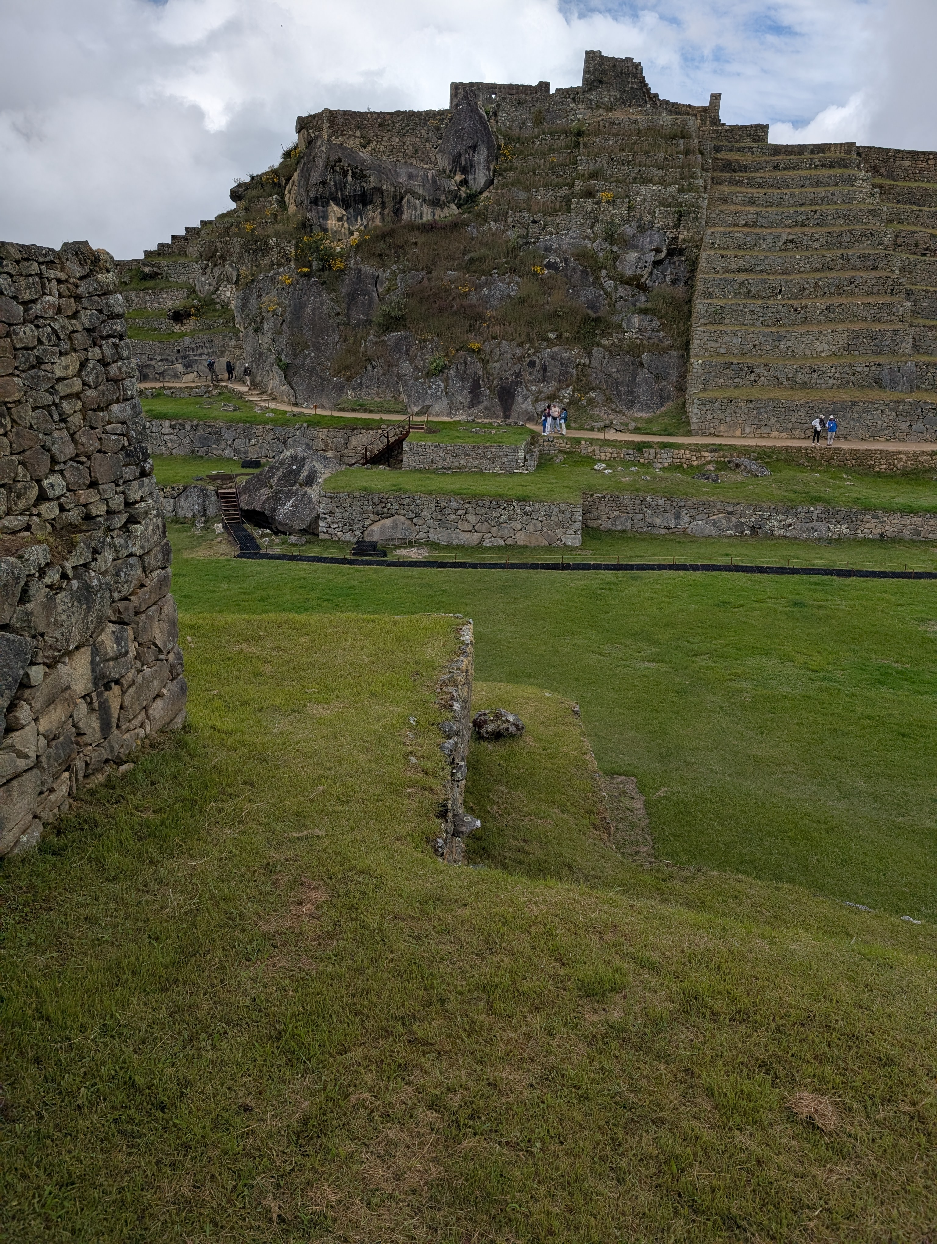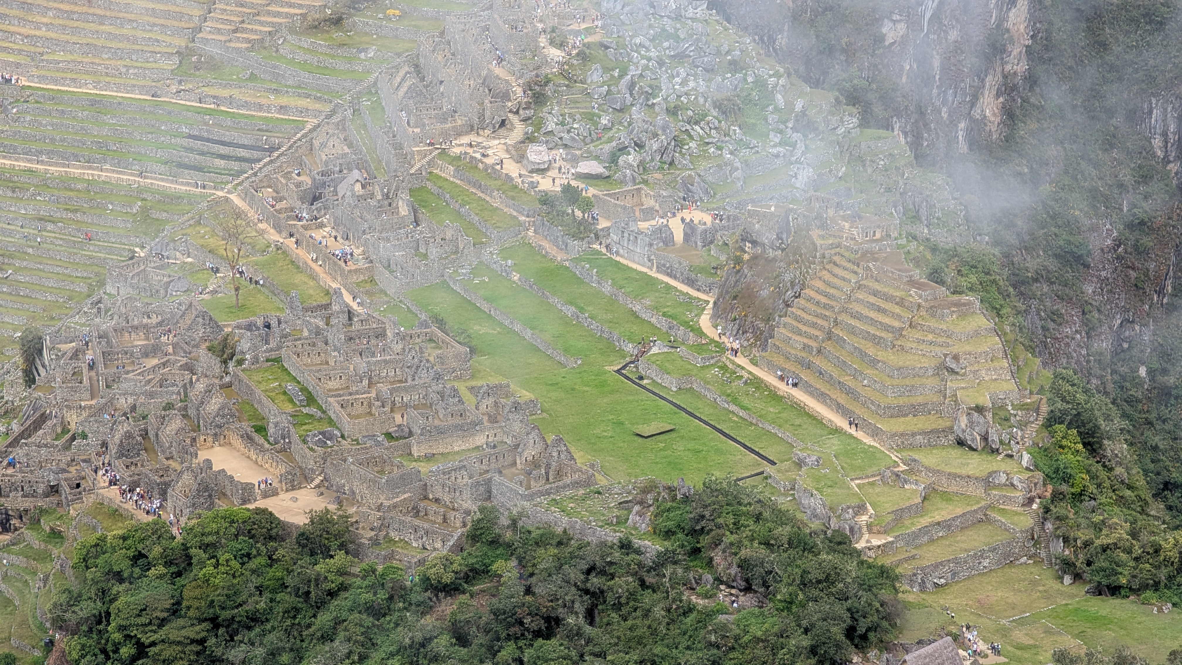 Reminder, here’s a picture from yesterday which shows the area we’re touring today. And yes, Elizabeth and I are about to climb Huaynapicchu, the big peak in the middle. Across the lip and up the nose of the supine face profile. The stairs roughly follow the strip of vegetation to the left of the ridge line facing the camera. And zoom in to see the terraces at the top.