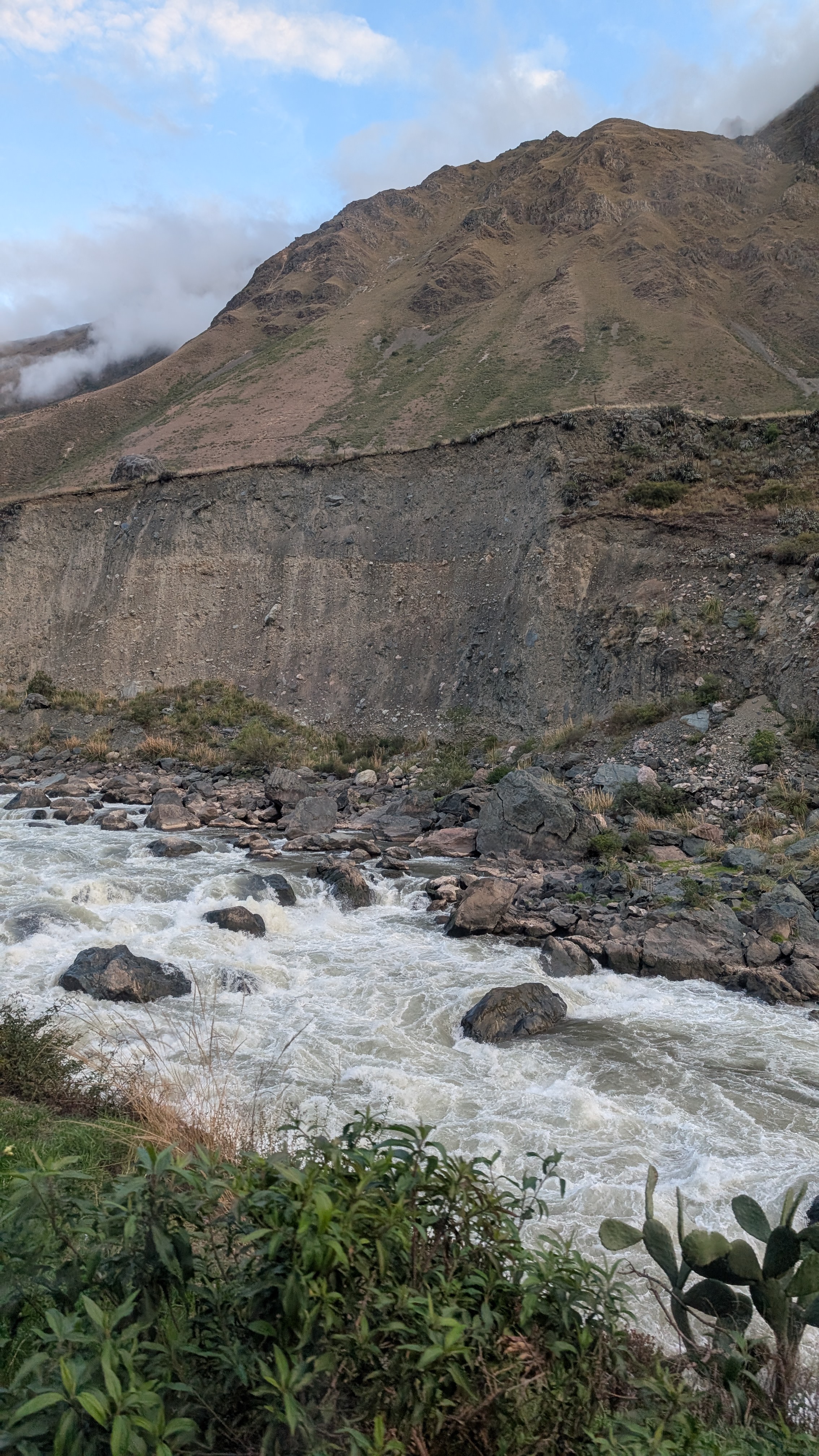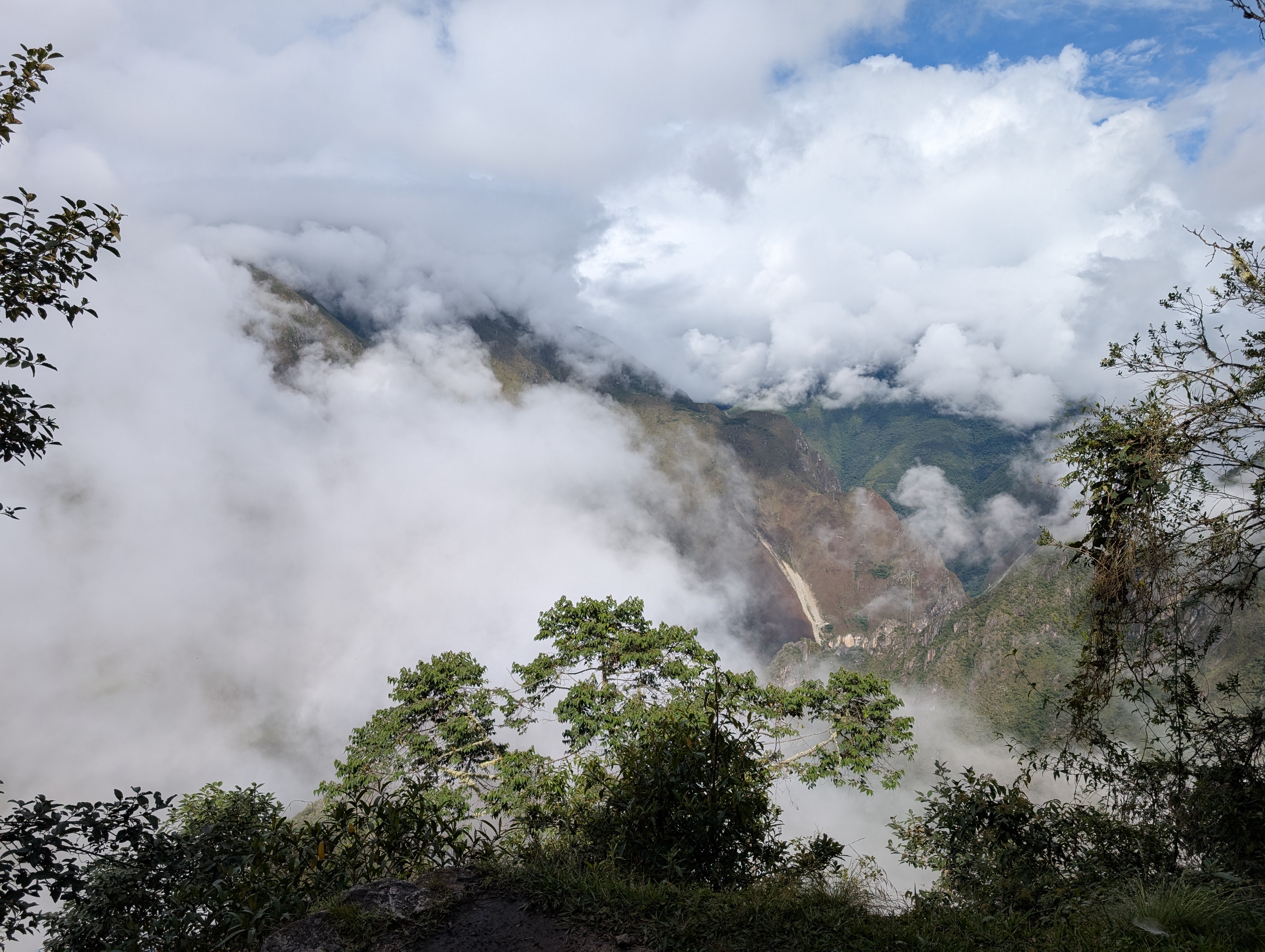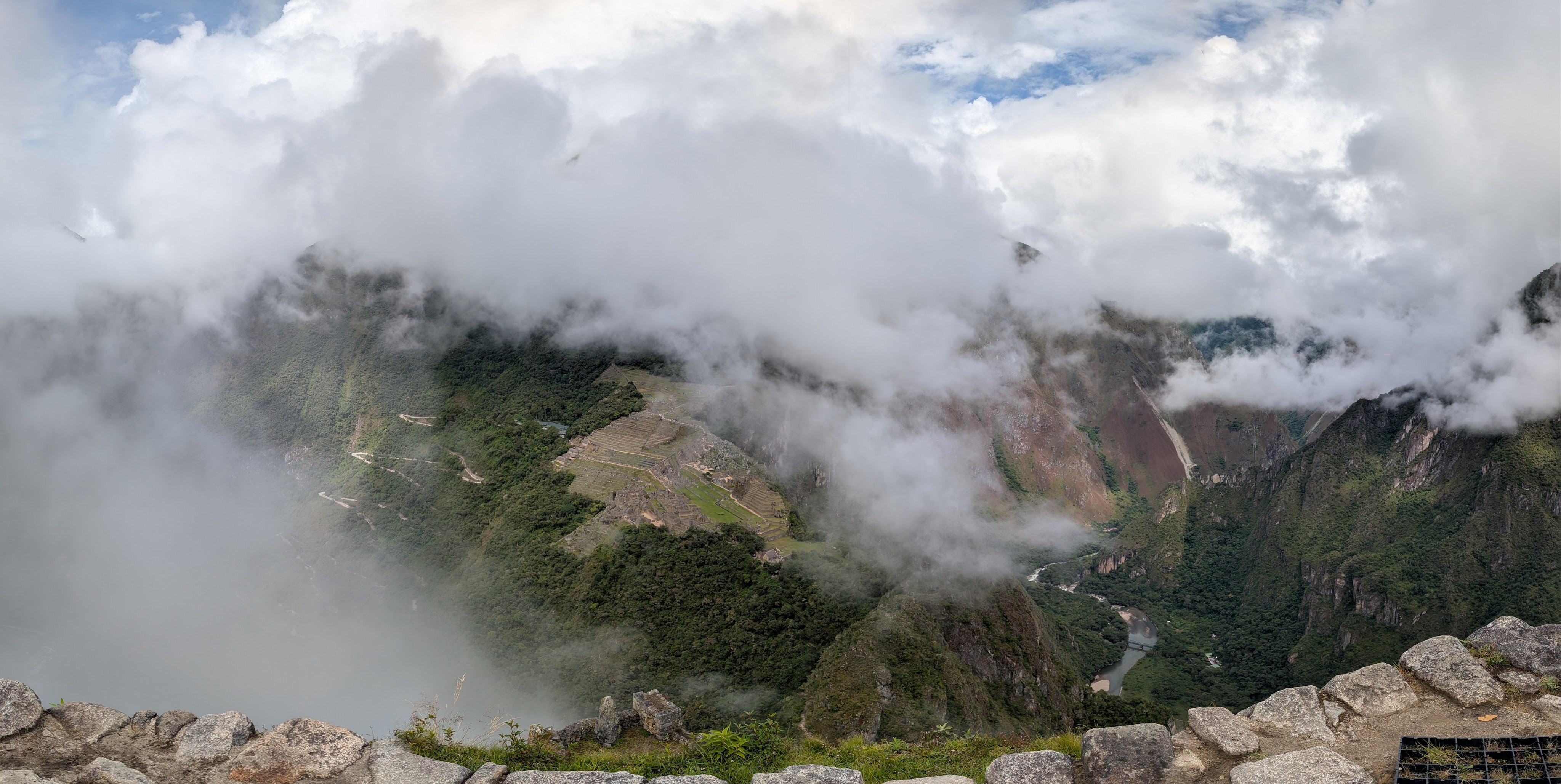 We climb up some rocks and sit for a few minutes. Wow, scrambling around the rocks makes me feel uneasy. One wrong move and it will be a horrific tumble all the way down to the Urubamba River. A nearby guide calls out to Machupicchu and Pachamama with a conch shell. We slowly move towards a rock where everyone is taking their picture with Machupicchu in the background. The clouds keep playing hide and seek with the view.