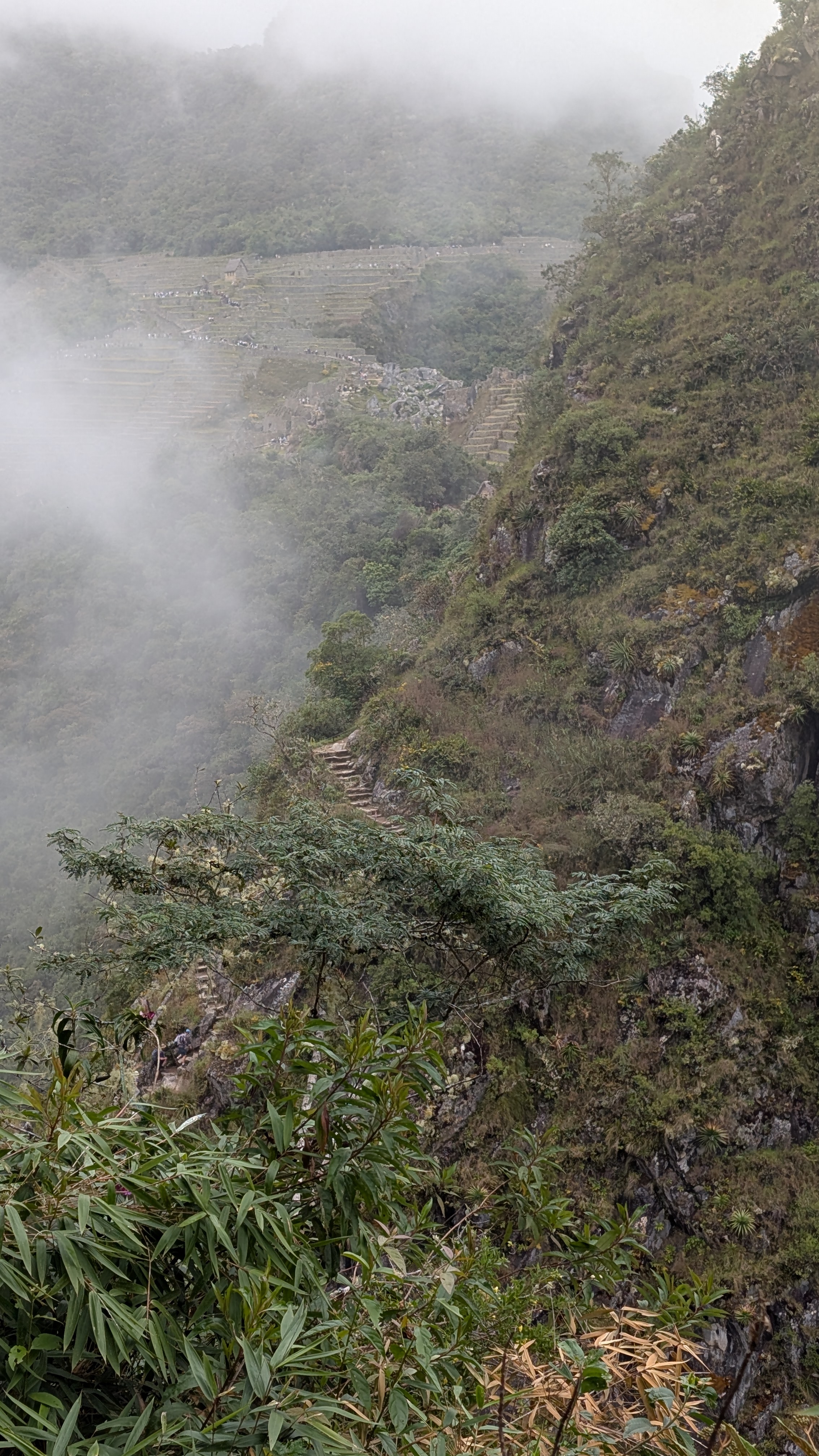An hour+ since arriving at the summit, we move laterally across a terrace and return to the main trail that ascends and descends the mountain. We wait for a bunch of people ascending before we can join the main route. Elizabeth moves quickly and we fly down the trail. There are spots where the stairs are so steep that it’s easier to turn around and go down backwards. There are a lot of people climbing who seem happy to let us by and grateful for a reason to stop and catch their breath.