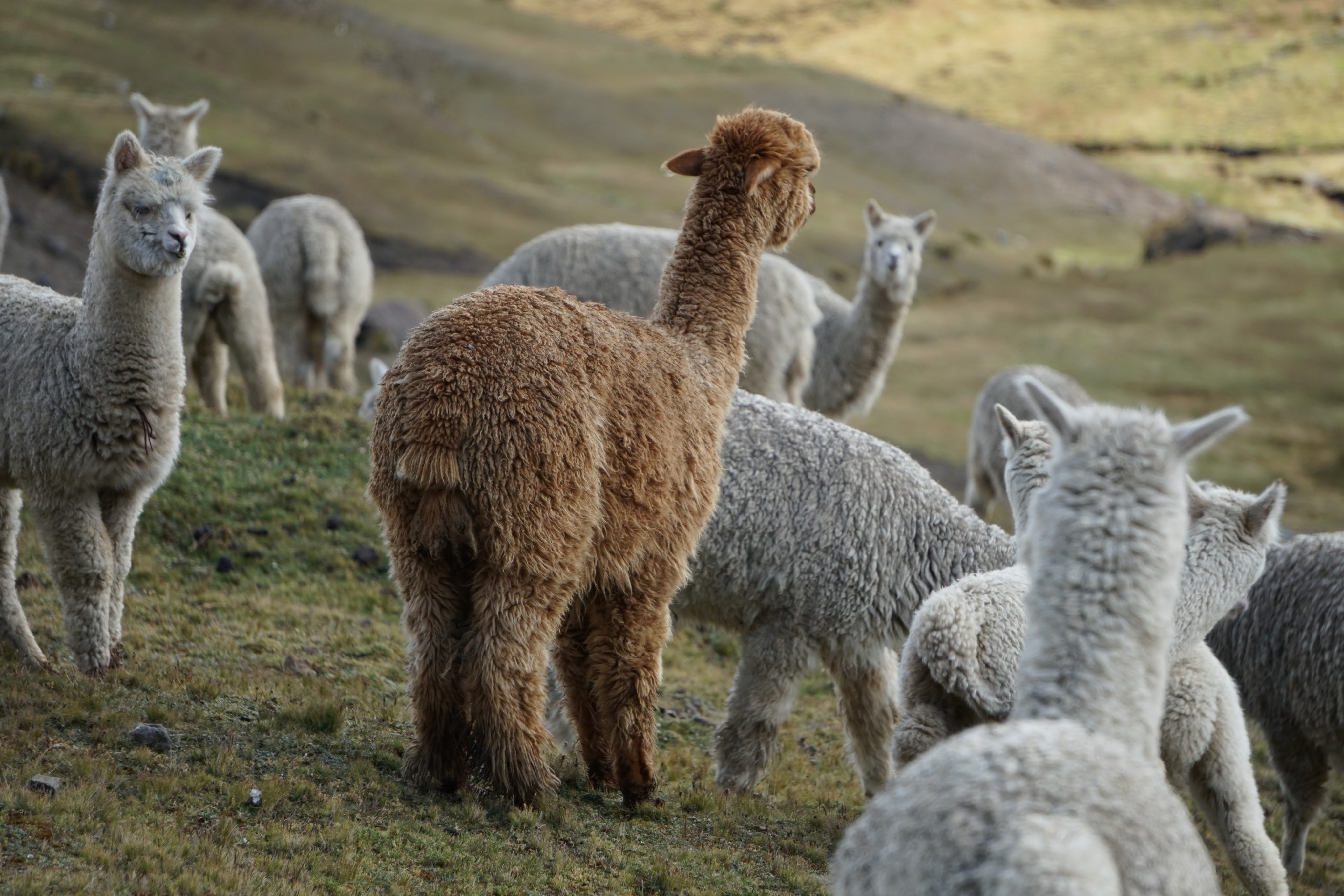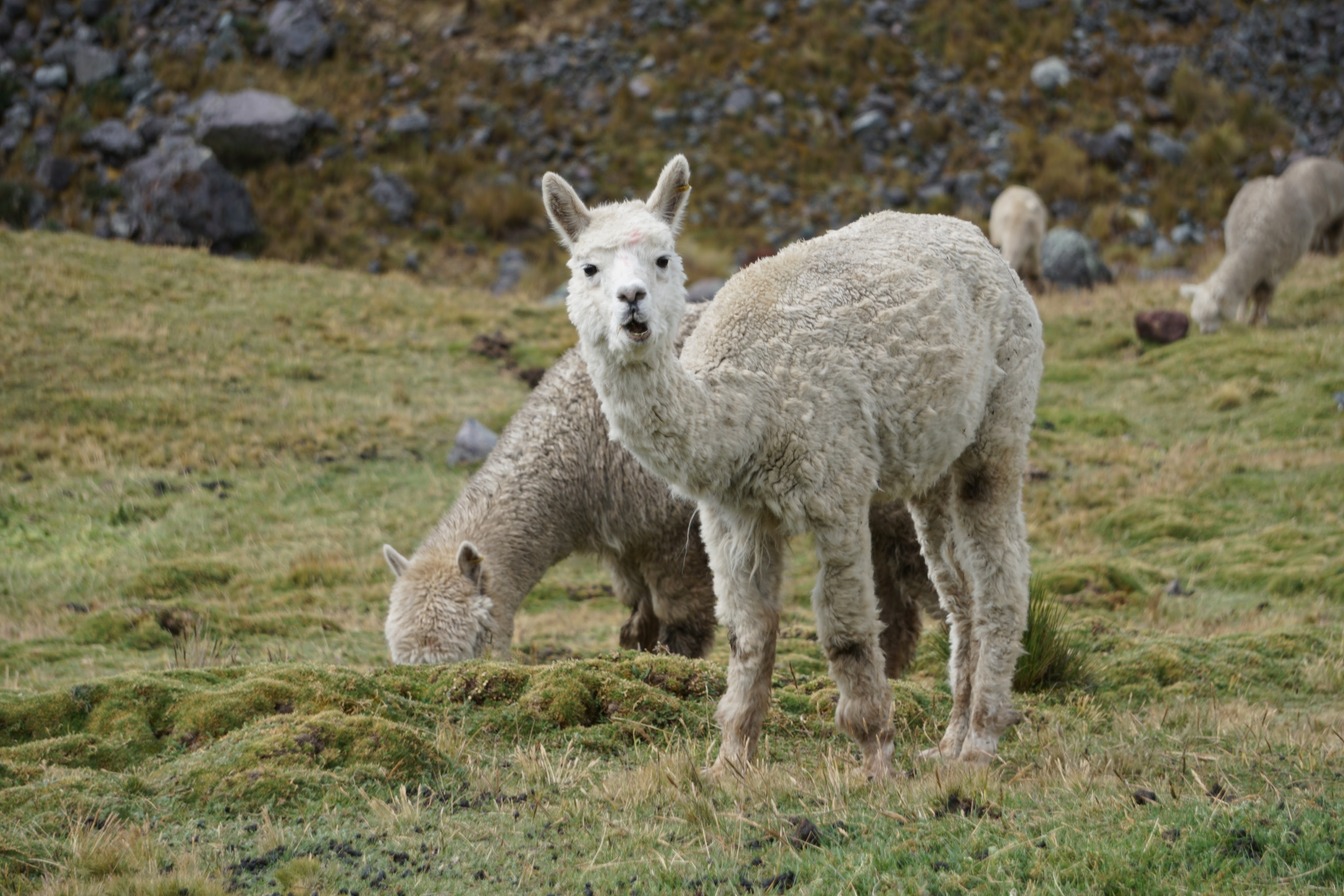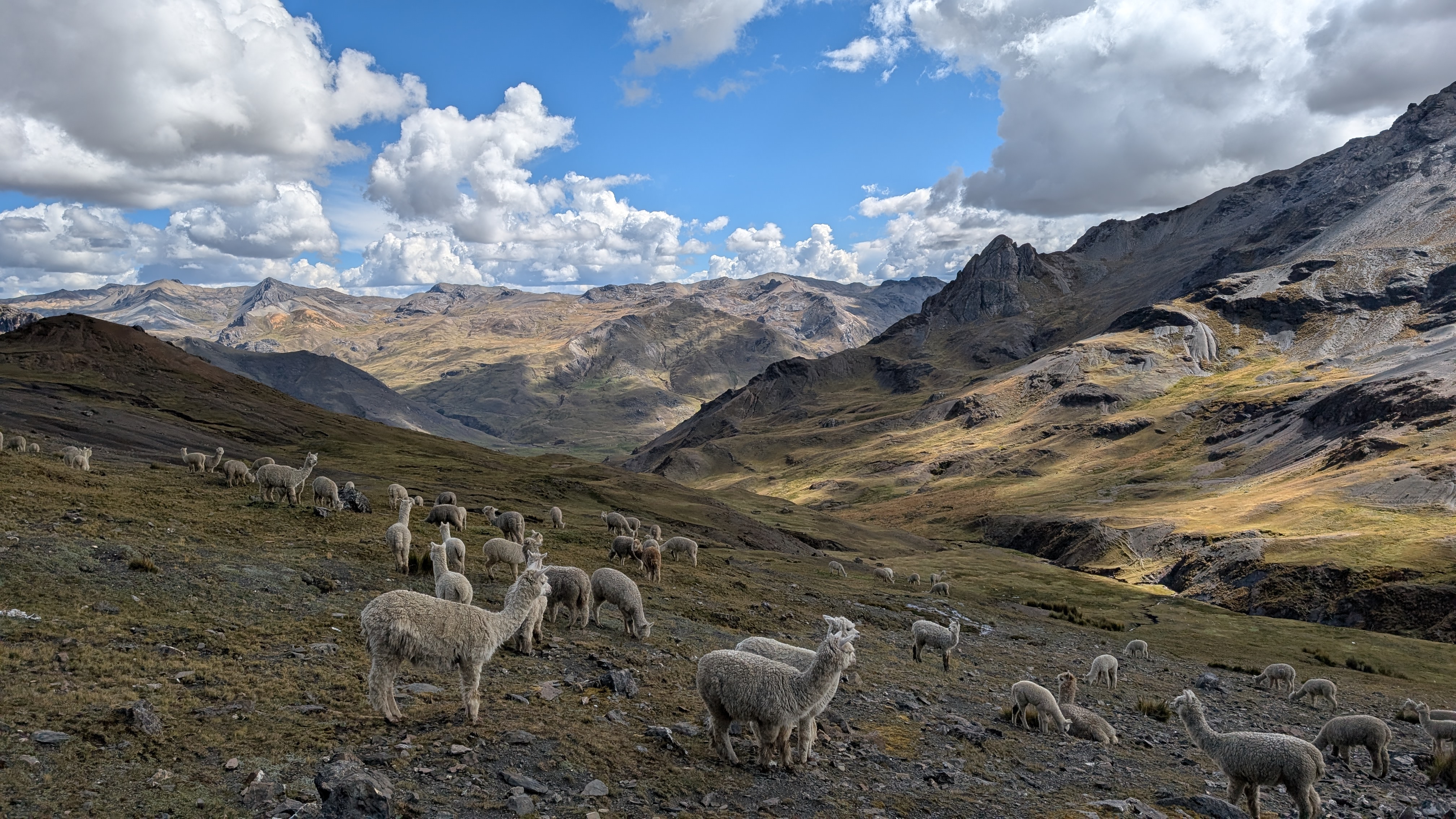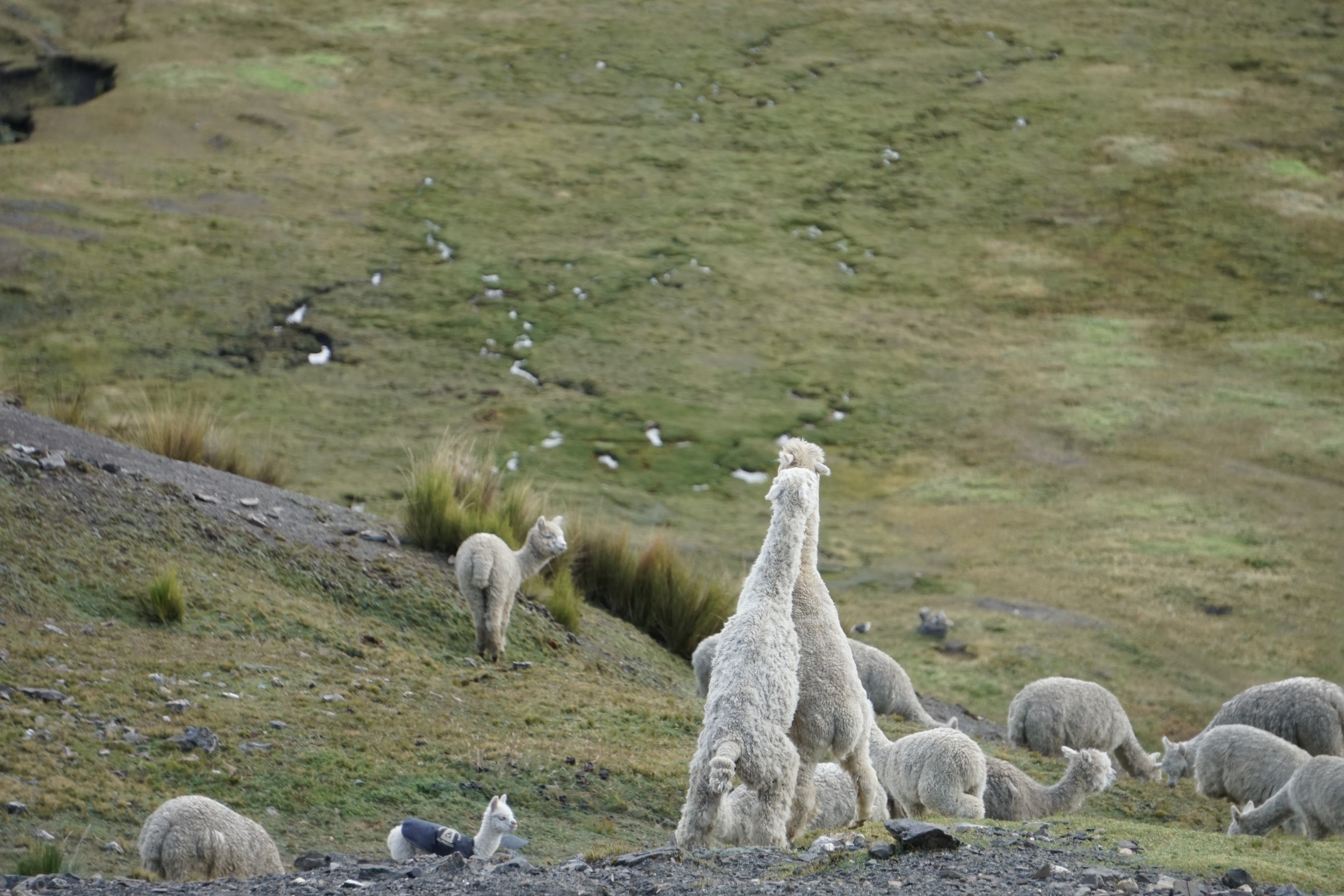 As we climb higher, we meet a herd of alpaca. They are busy living their best lives and grazing along the hillside.