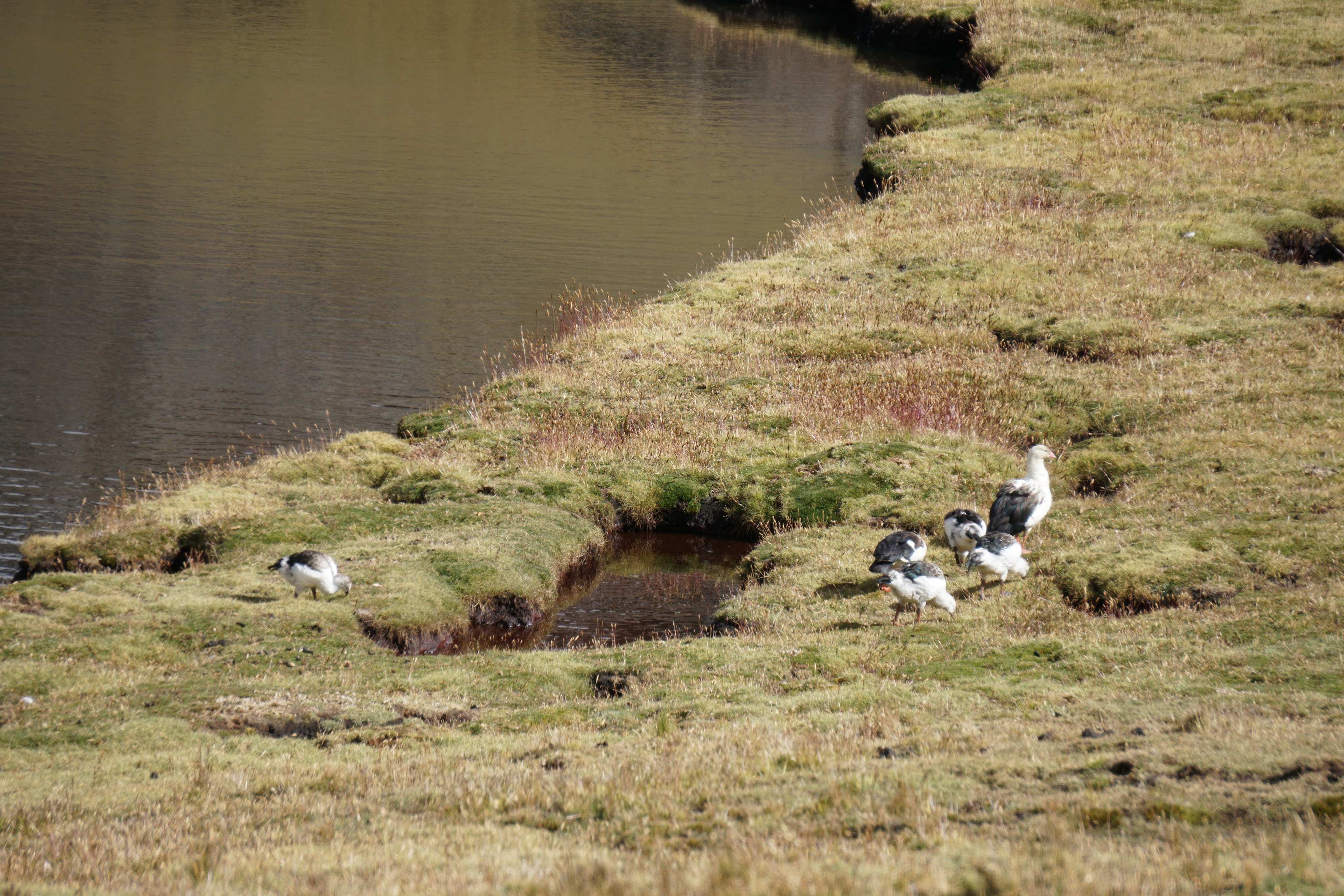 An Andean goose family forages next to a small lake as our lunch destination comes into view. Look into the valley for the small red cooking and eating tent.
