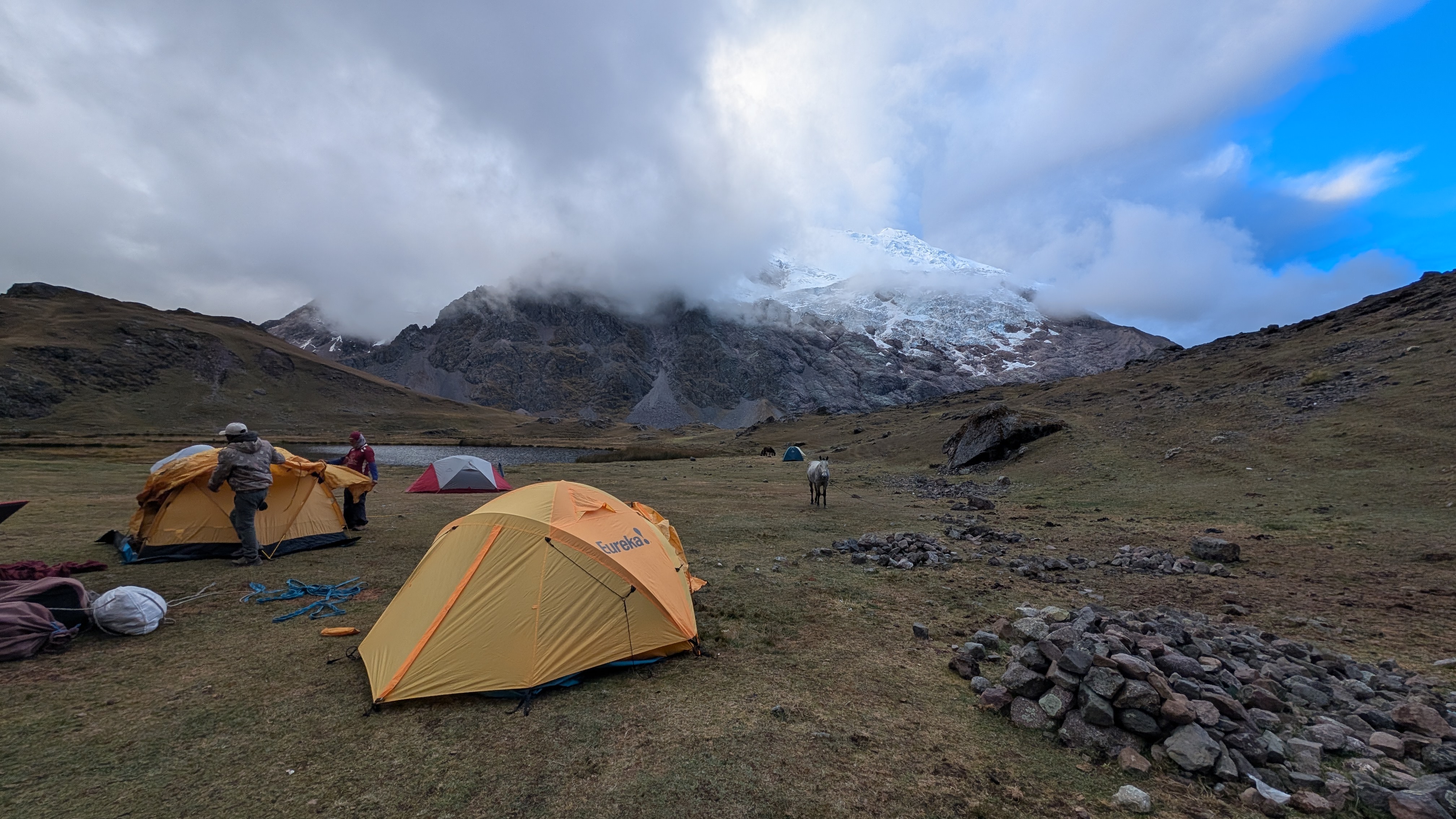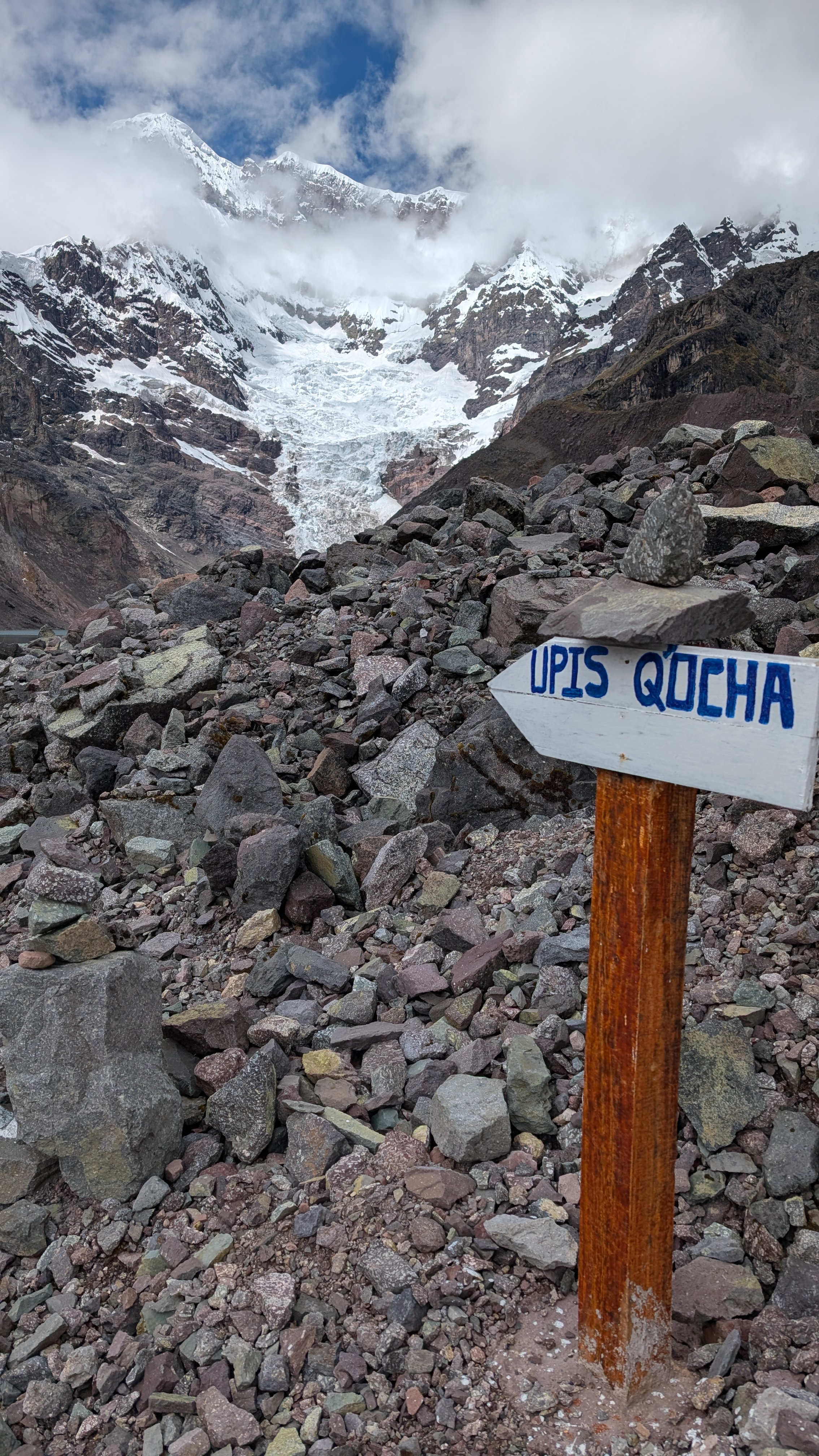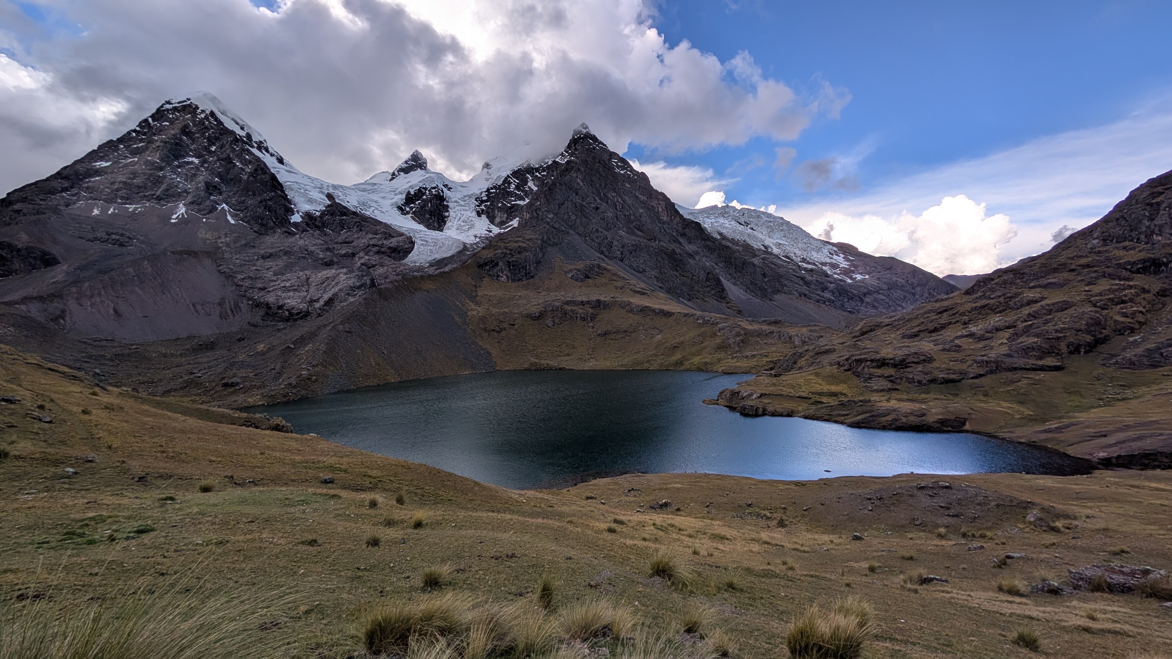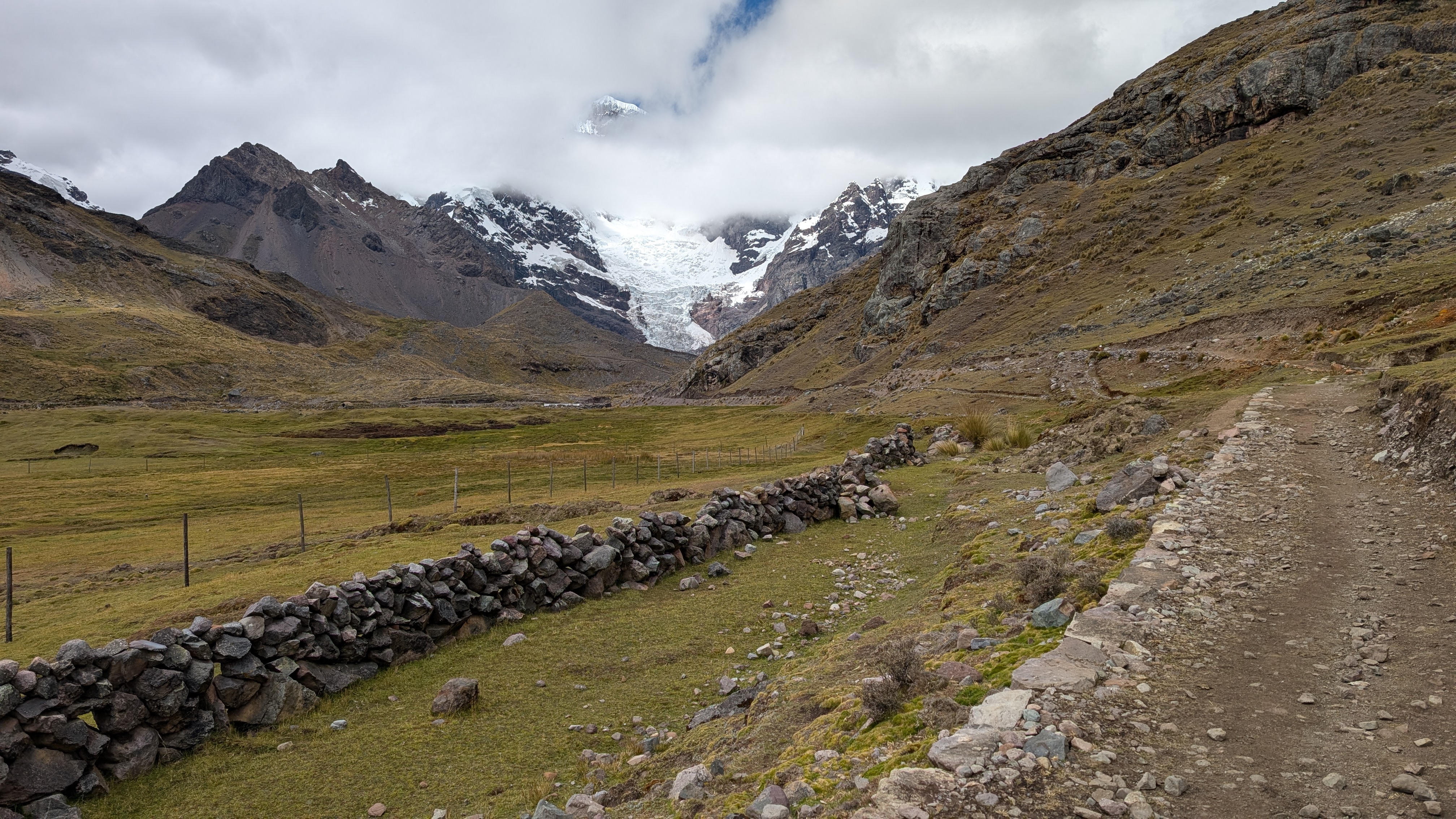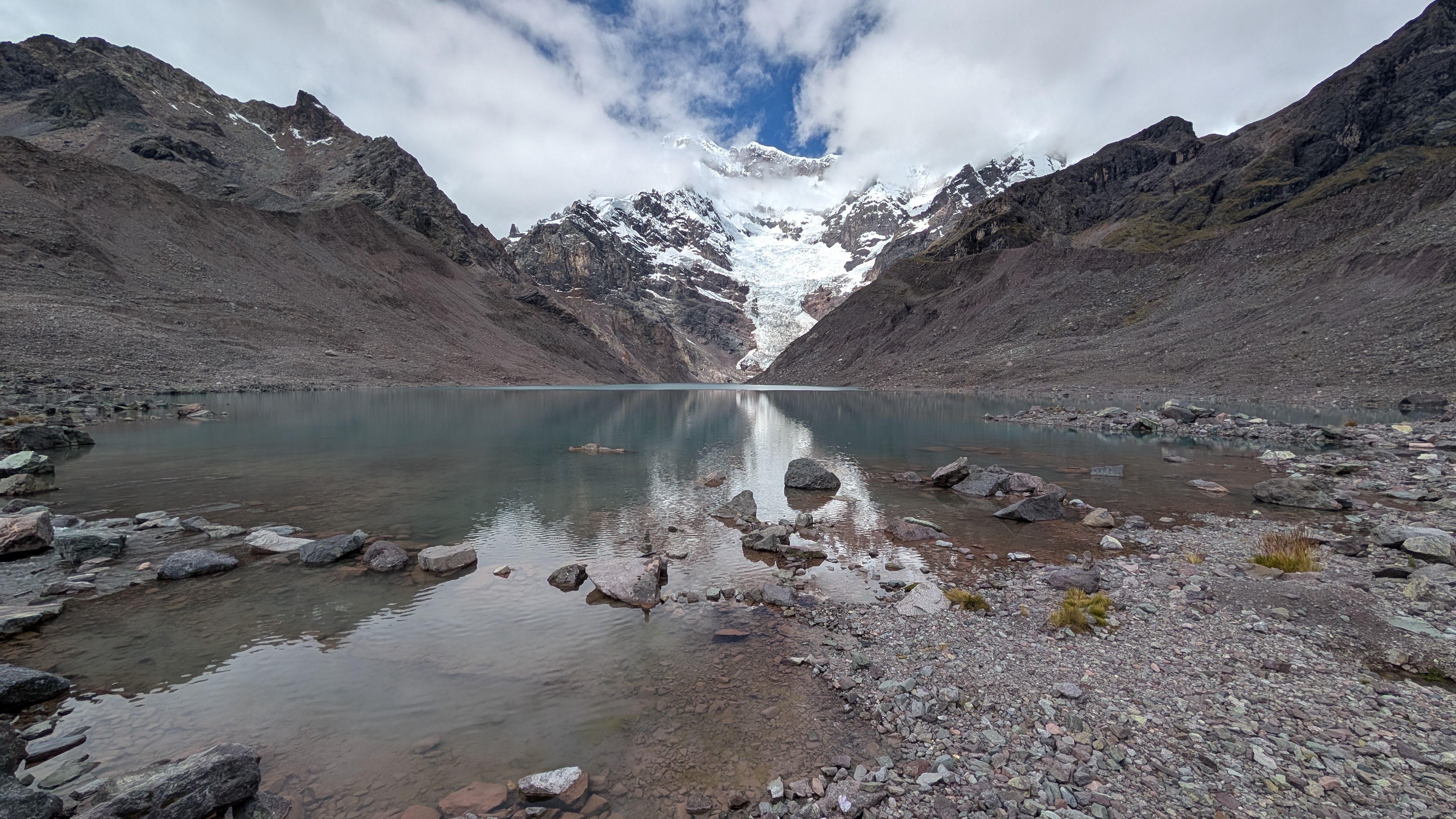 It’s a short and relatively flat trail up to the edge of the lake. There’s a spectacular glacier reaching all the way down the side of Ausangate. Apu Ausangate’s summit flits in and out of view behind the clouds. We’ve been hiking all of an hour and look at this epicness!
