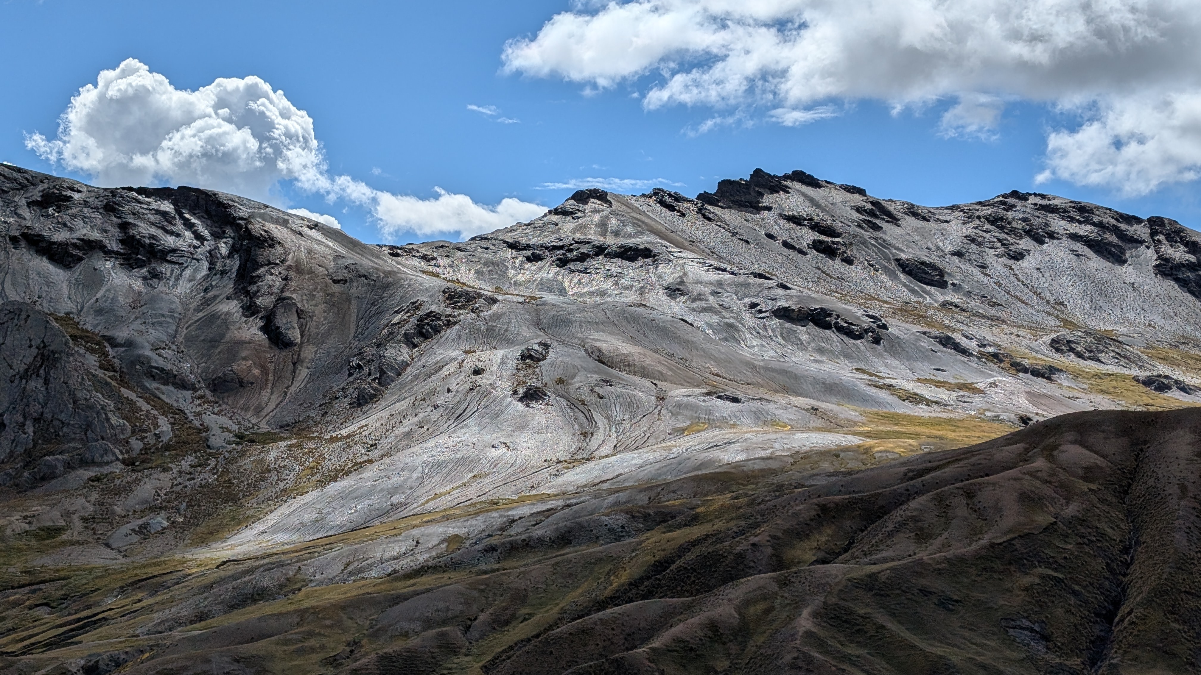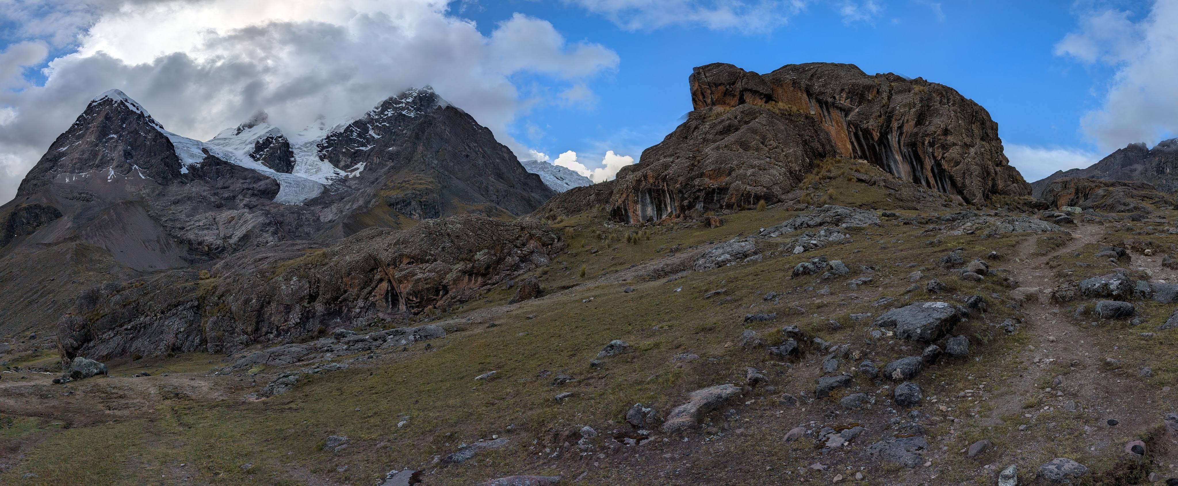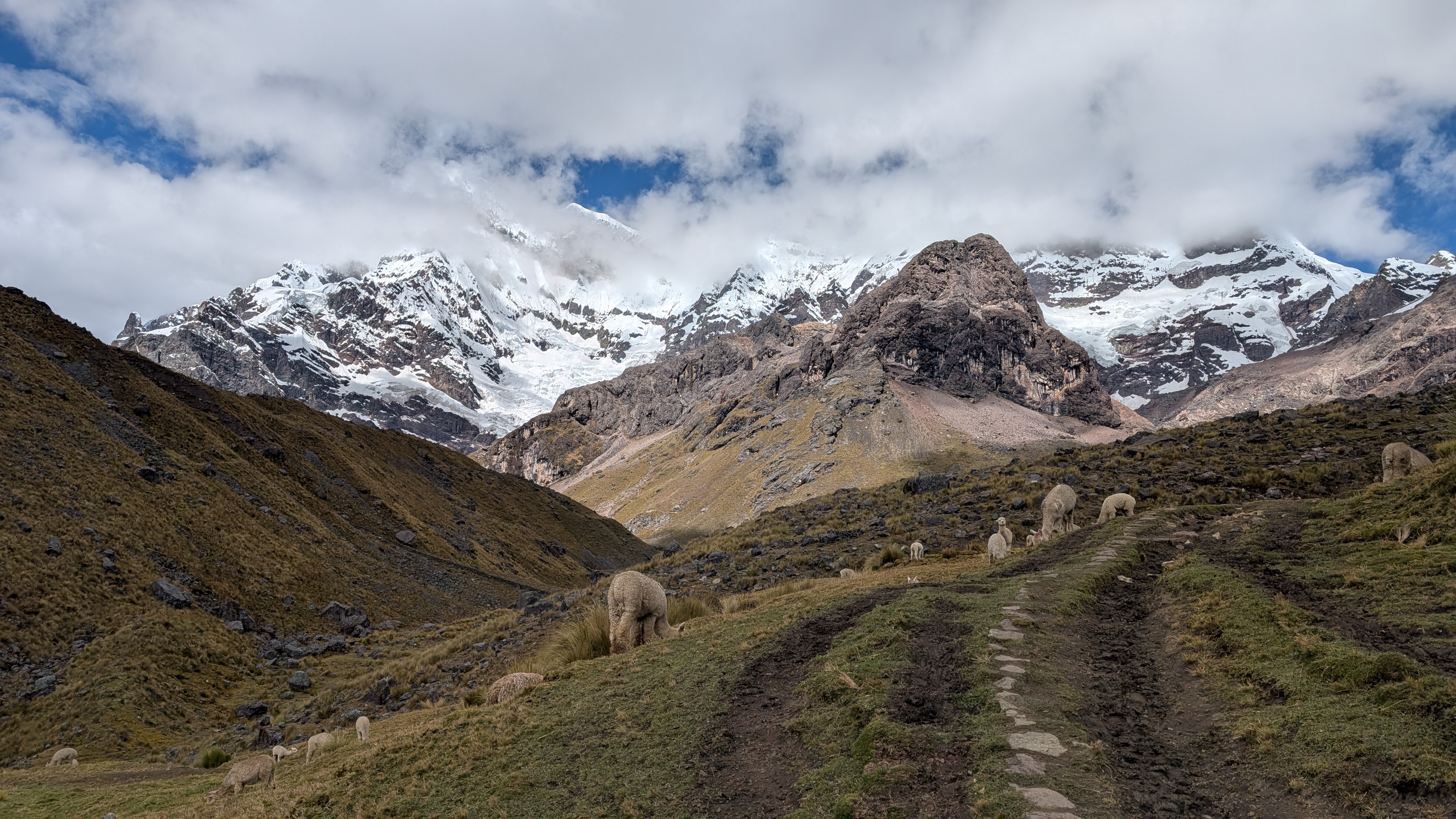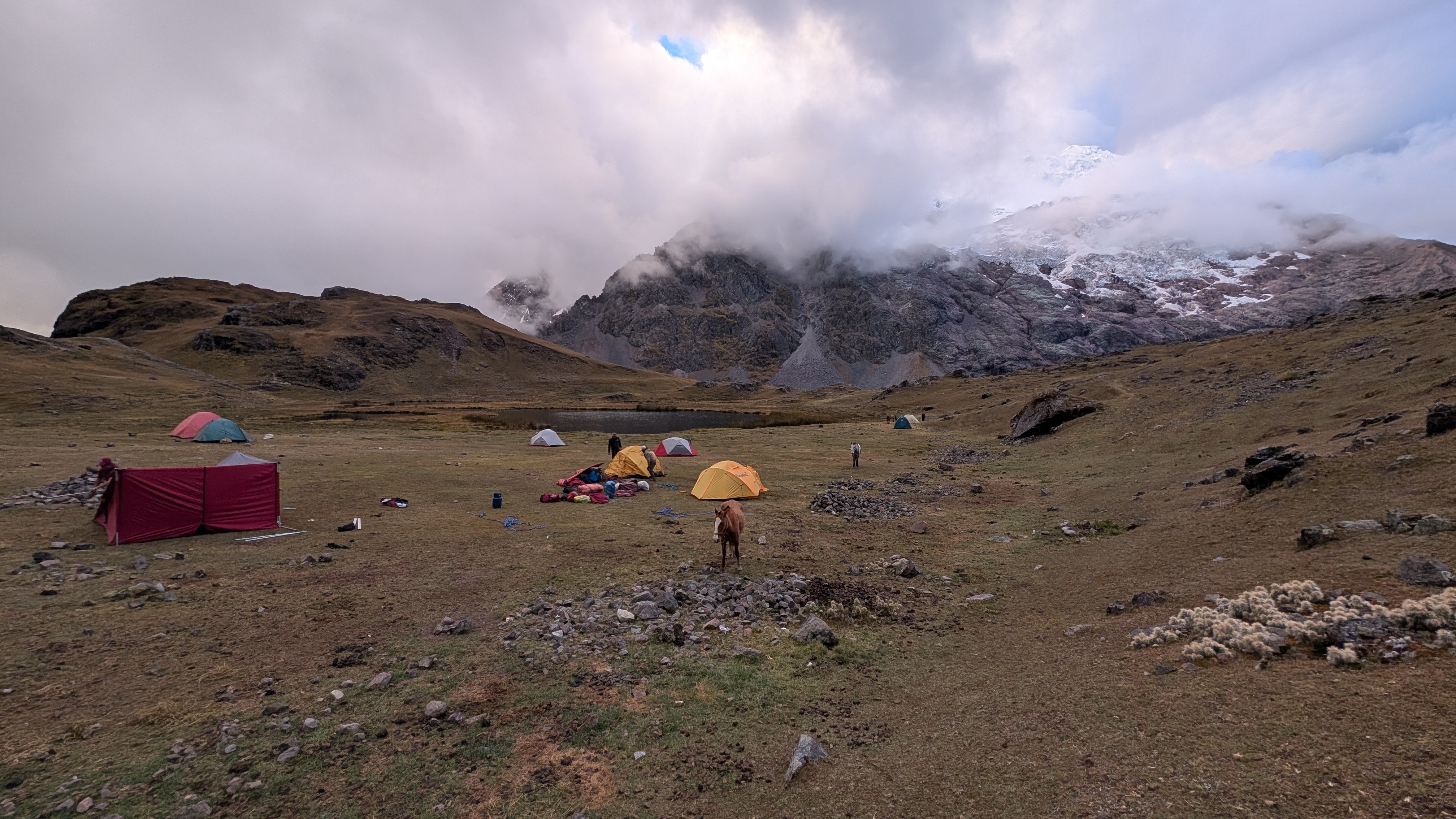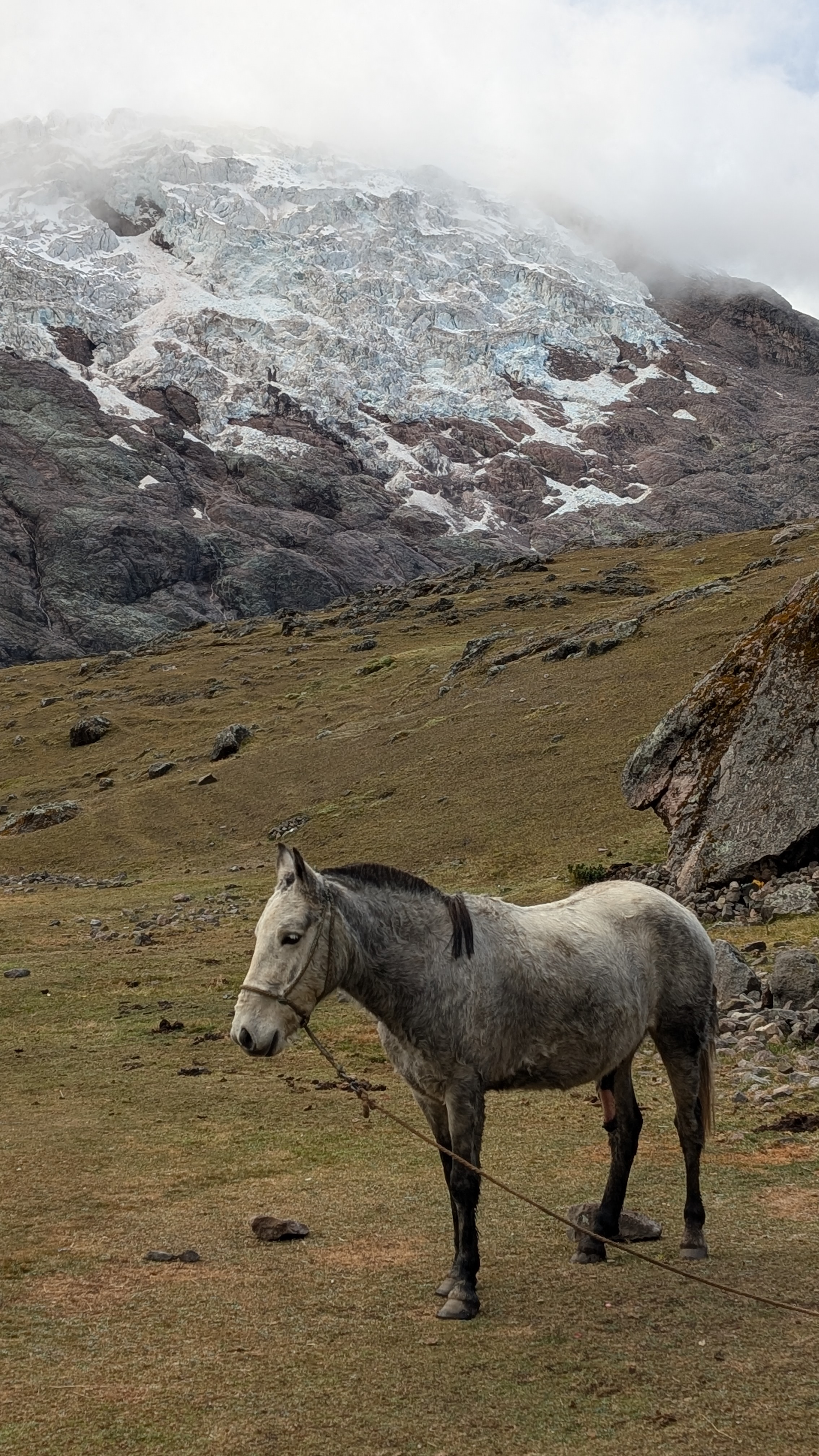 It’s a short and relatively flat trail up to the edge of the lake. There’s a spectacular glacier reaching all the way down the side of Ausangate. Apu Ausangate’s summit flits in and out of view behind the clouds. We’ve been hiking all of an hour and look at this epicness!