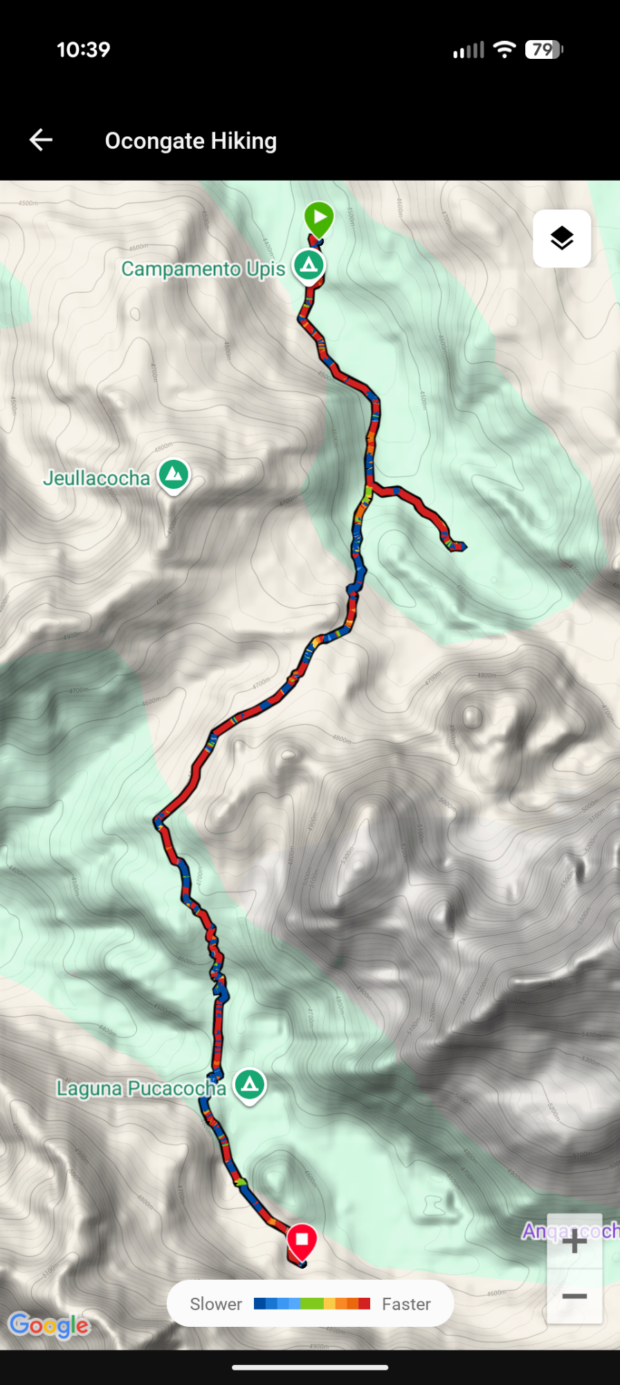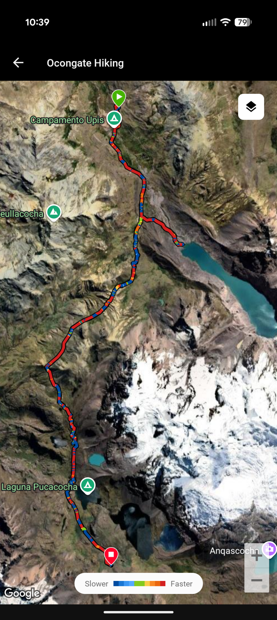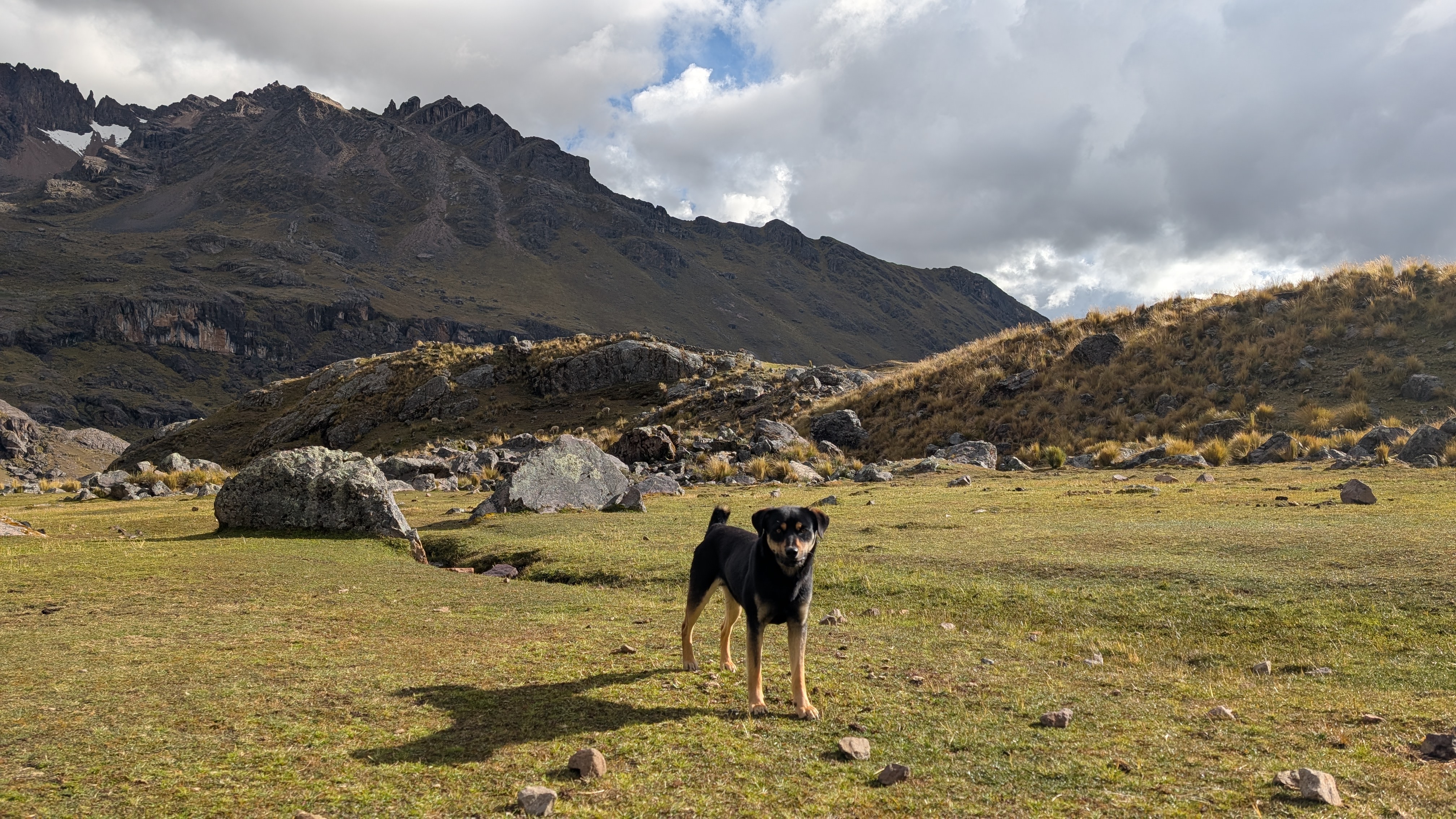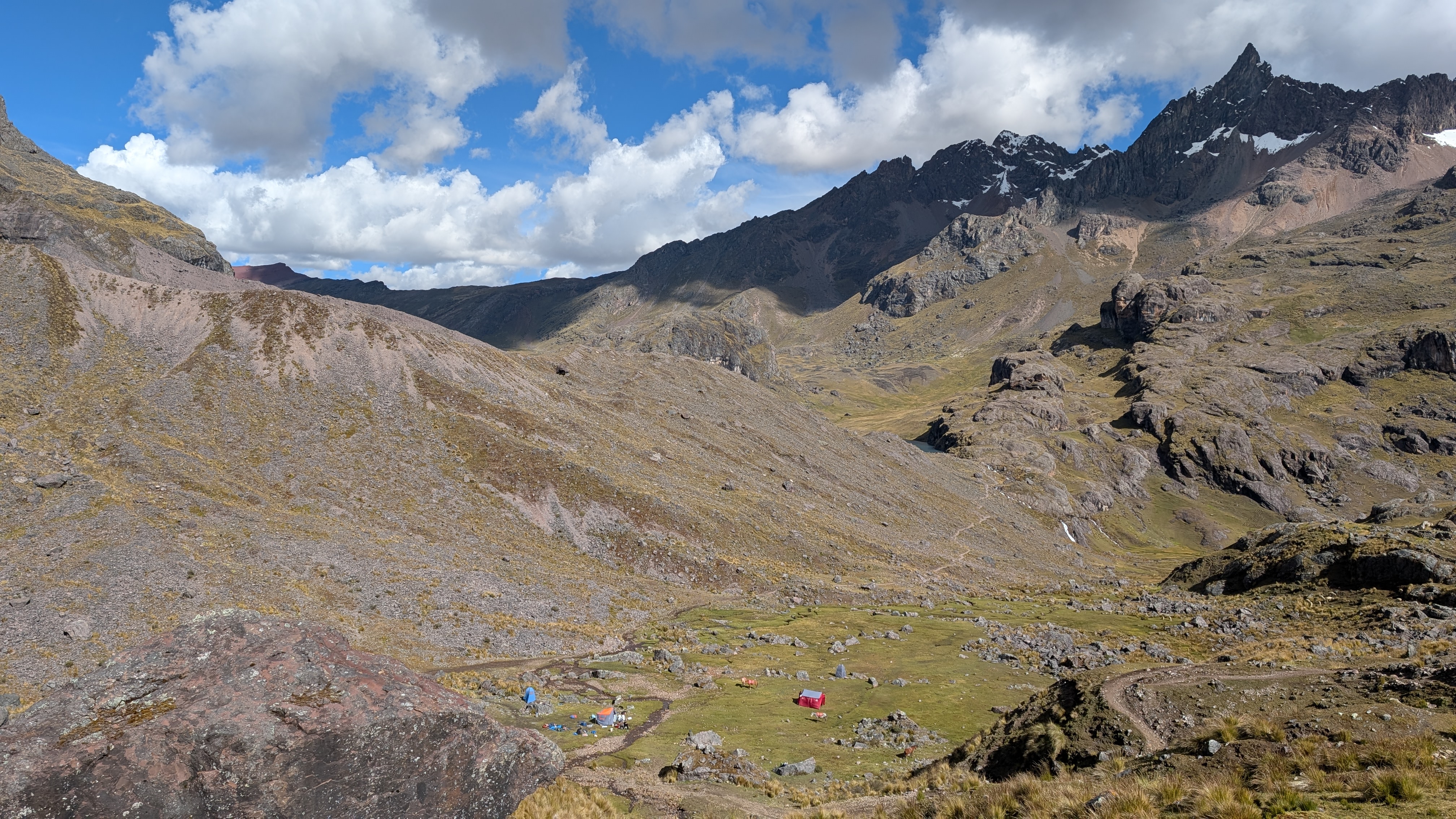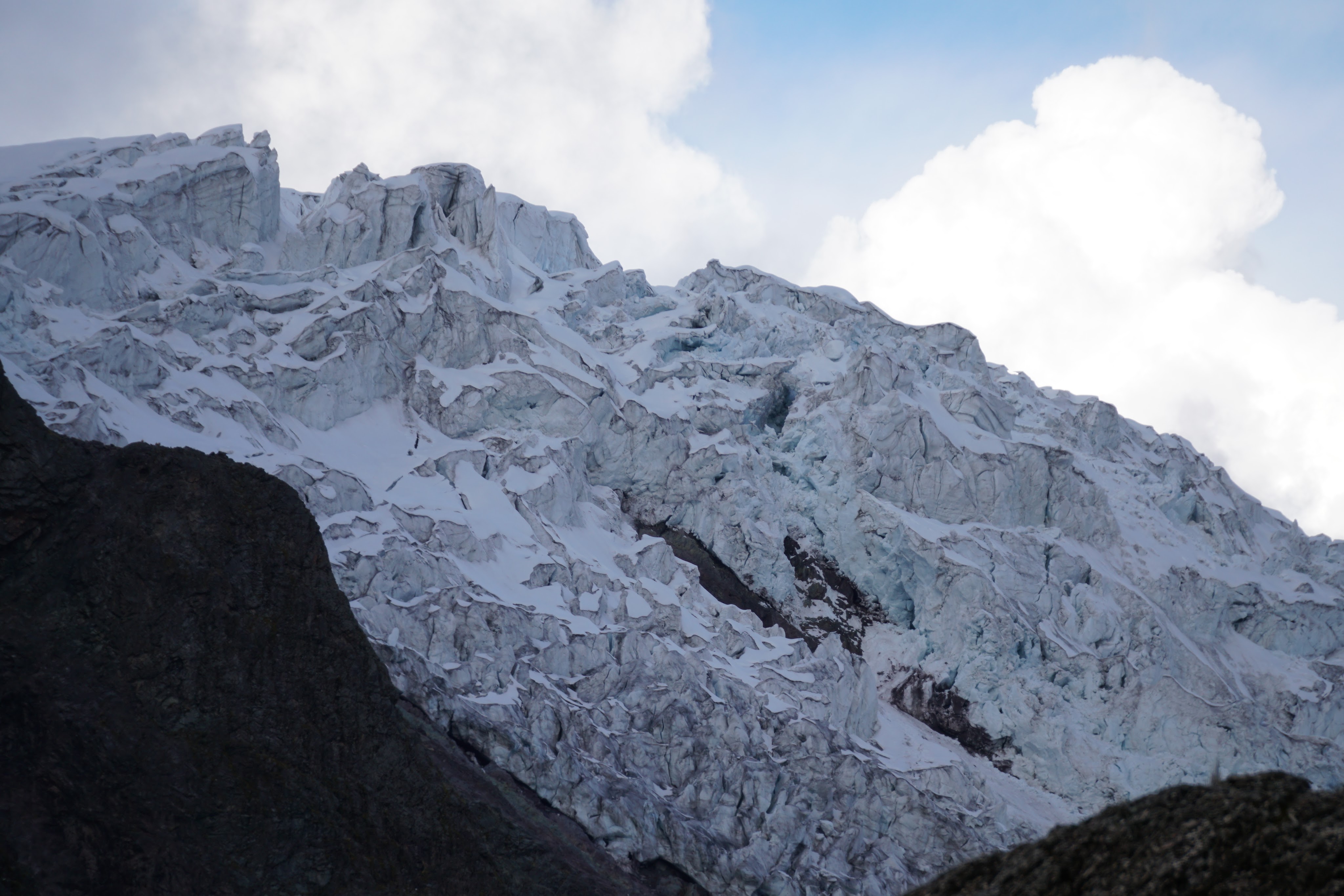 It’s a short and relatively flat trail up to the edge of the lake. There’s a spectacular glacier reaching all the way down the side of Ausangate. Apu Ausangate’s summit flits in and out of view behind the clouds. We’ve been hiking all of an hour and look at this epicness!