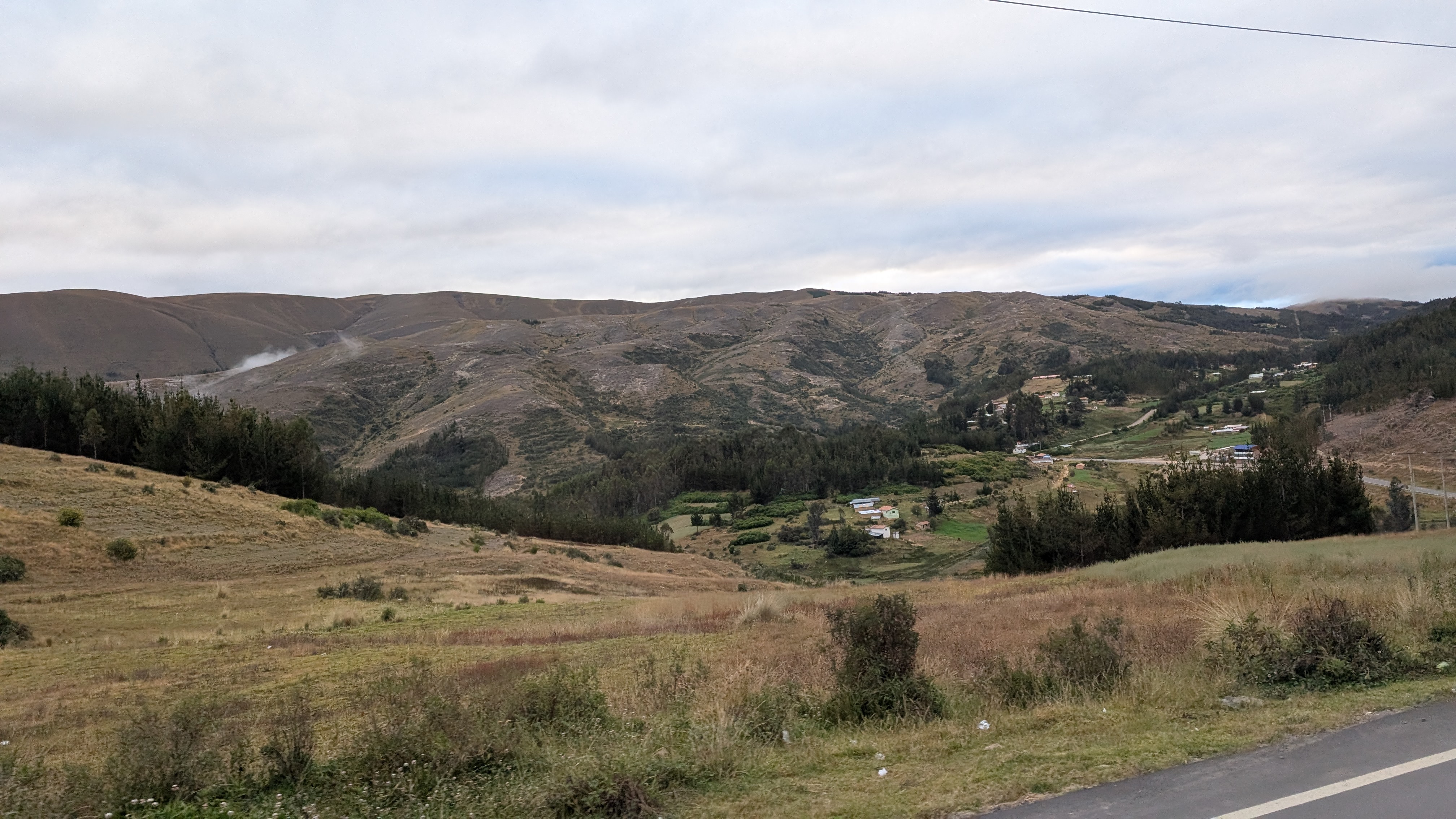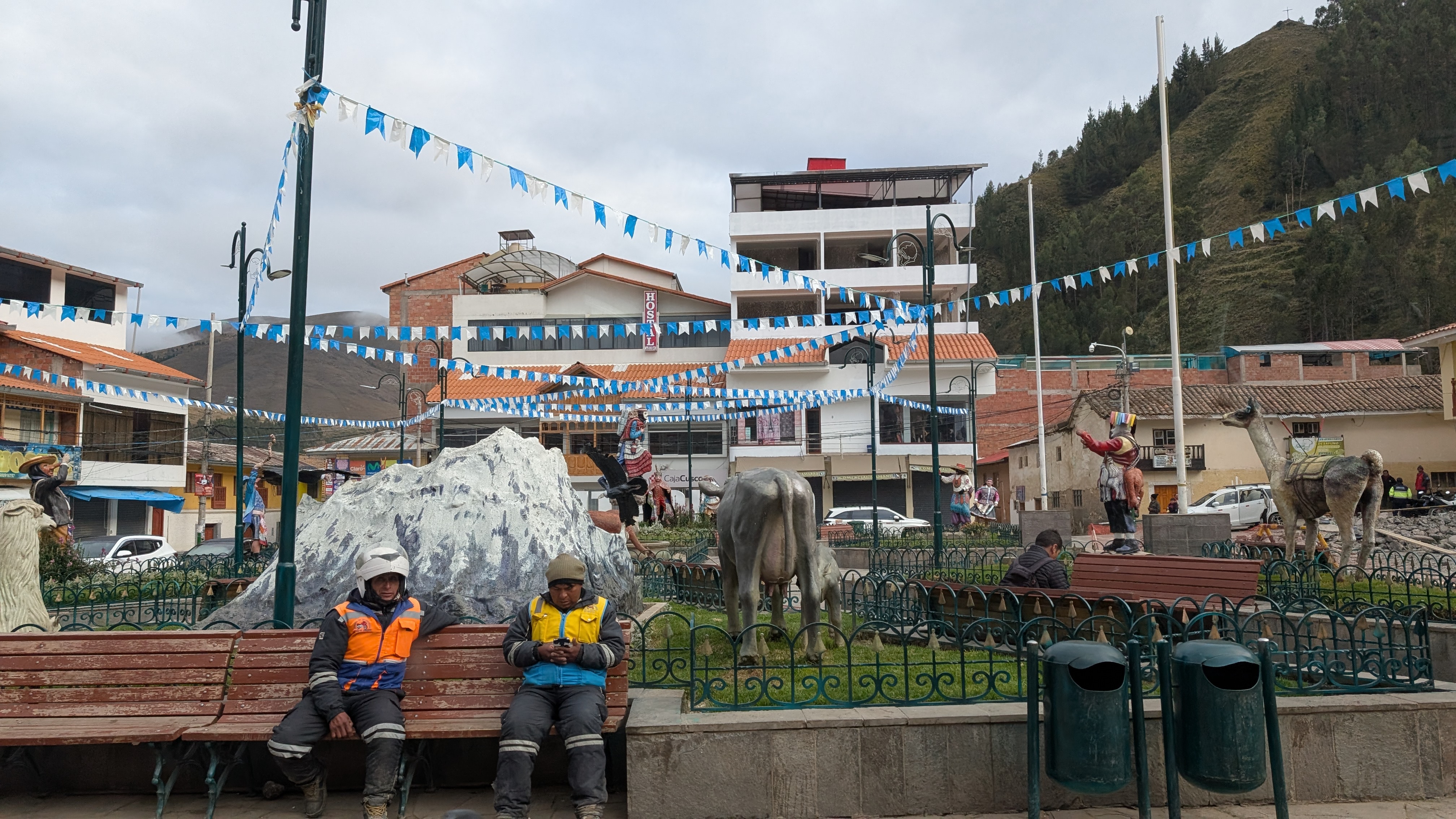 We drive for almost three hours through countryside and the narrow streets of Ocongate before stopping at 7 am in Tinqui for a bathroom break and more grocery shopping. Local vendors are sitting street side selling bread, warm beverages, cheese, avocados and more where a large condor statue stands tall.