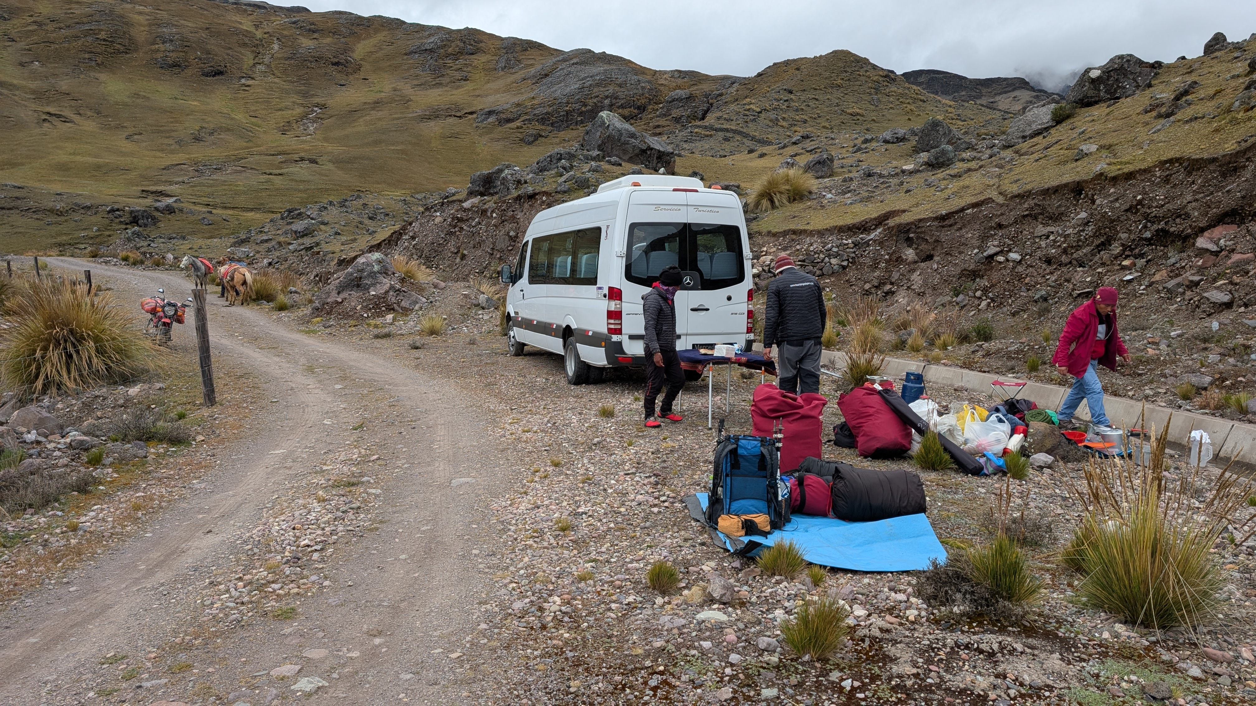 We backtrack down the road a short distance before turning and crossing a bridge over the Tinqui River. We follow dirt road for some distance as we keep an eye out for our horseman. There are small homes scattered across the countryside as we meet a few people driving past on motorbikes. We stop for a period of time, waiting for our horseman to arrive. I take the opportunity to find a mound to pee behind. We drive a ways farther and then reach a spot where we can no longer continue. The driver manages to turn the long van around on the narrow road where we soon pull off to the side. It’s about 9 am and Ronnie, the driver and the chef all start unloading gear and setting up to make breakfast. There are several items that I can’t eat in my to-go lunch from the hotel that I share them with the driver Kike.