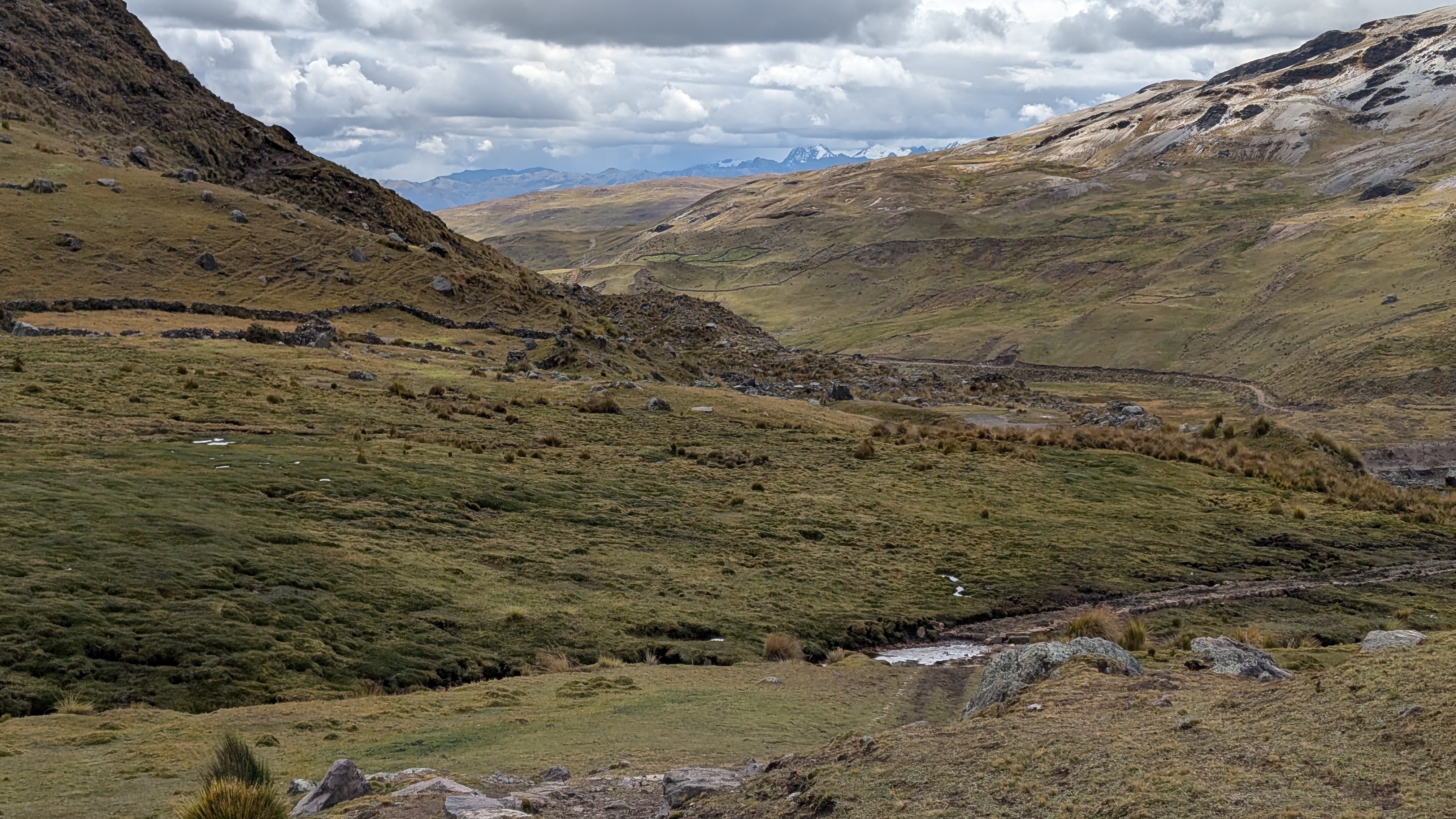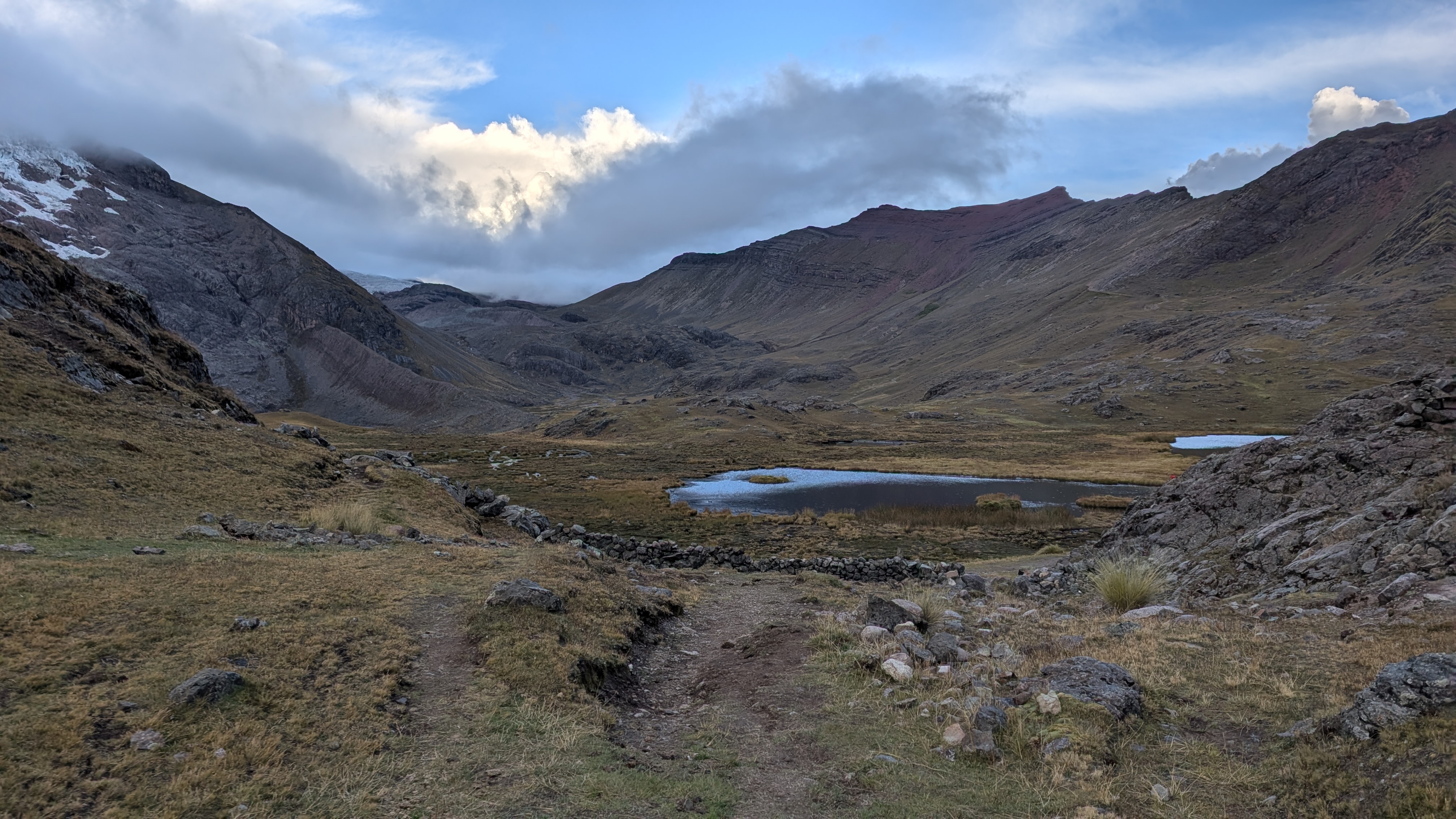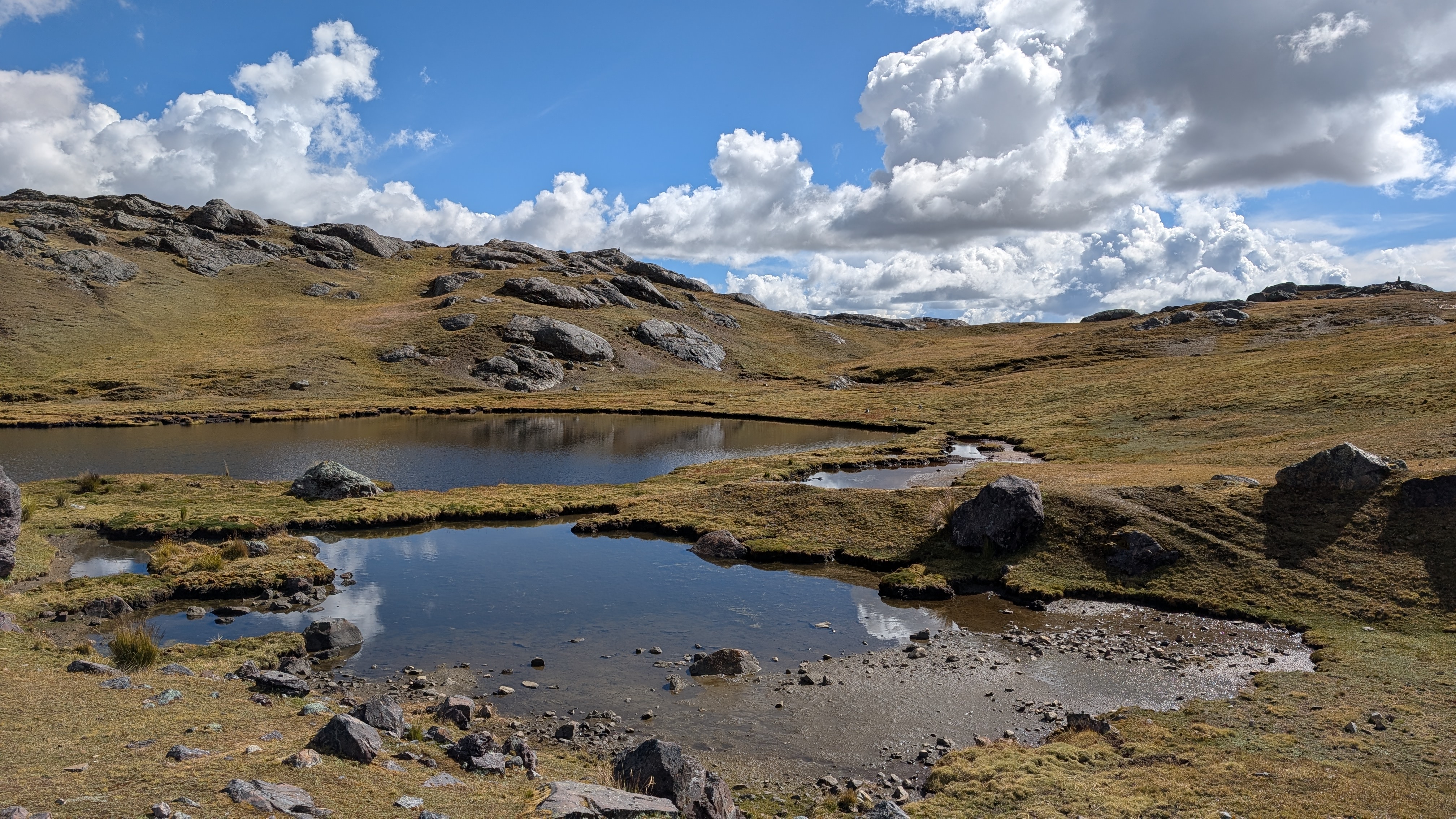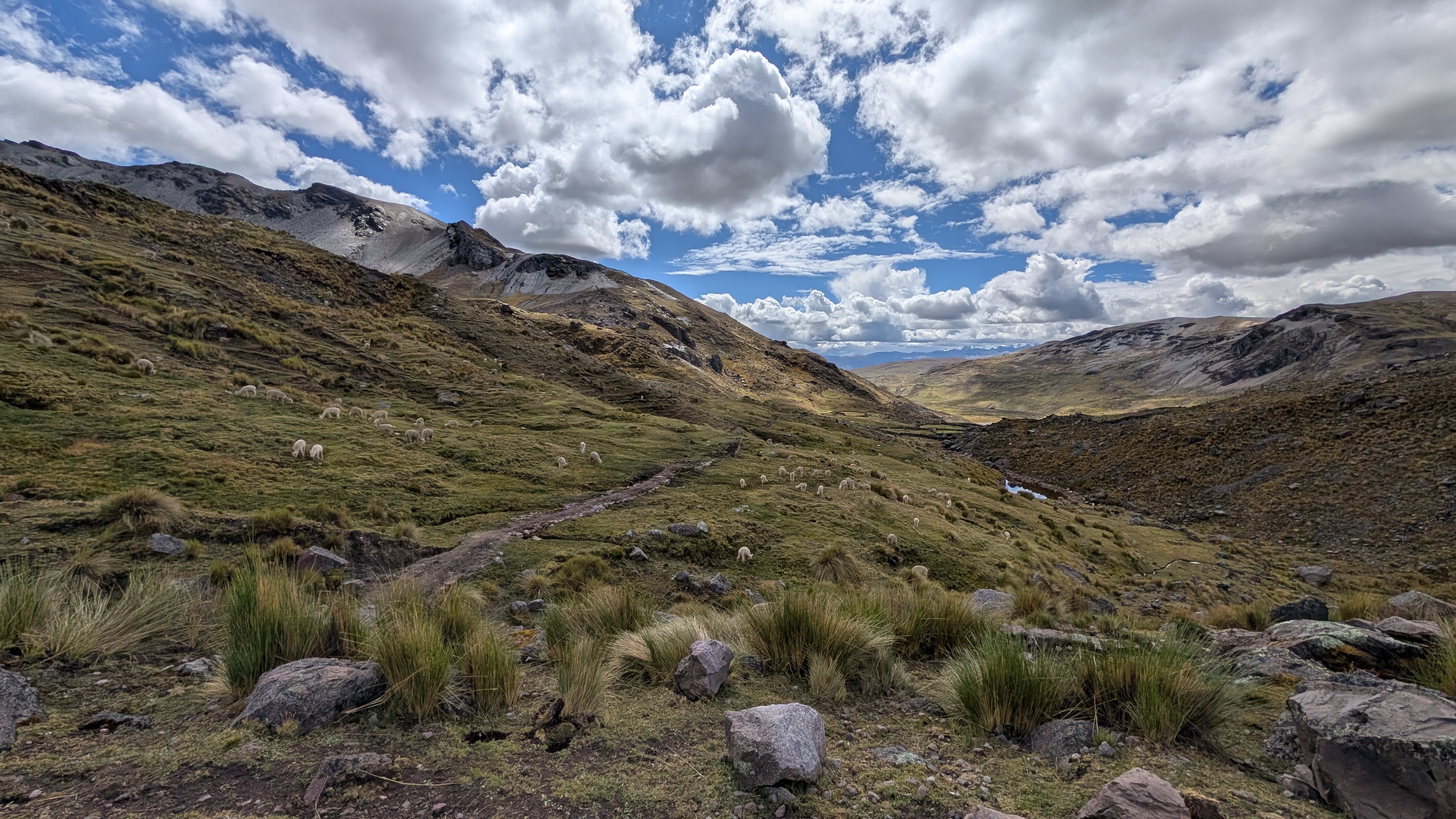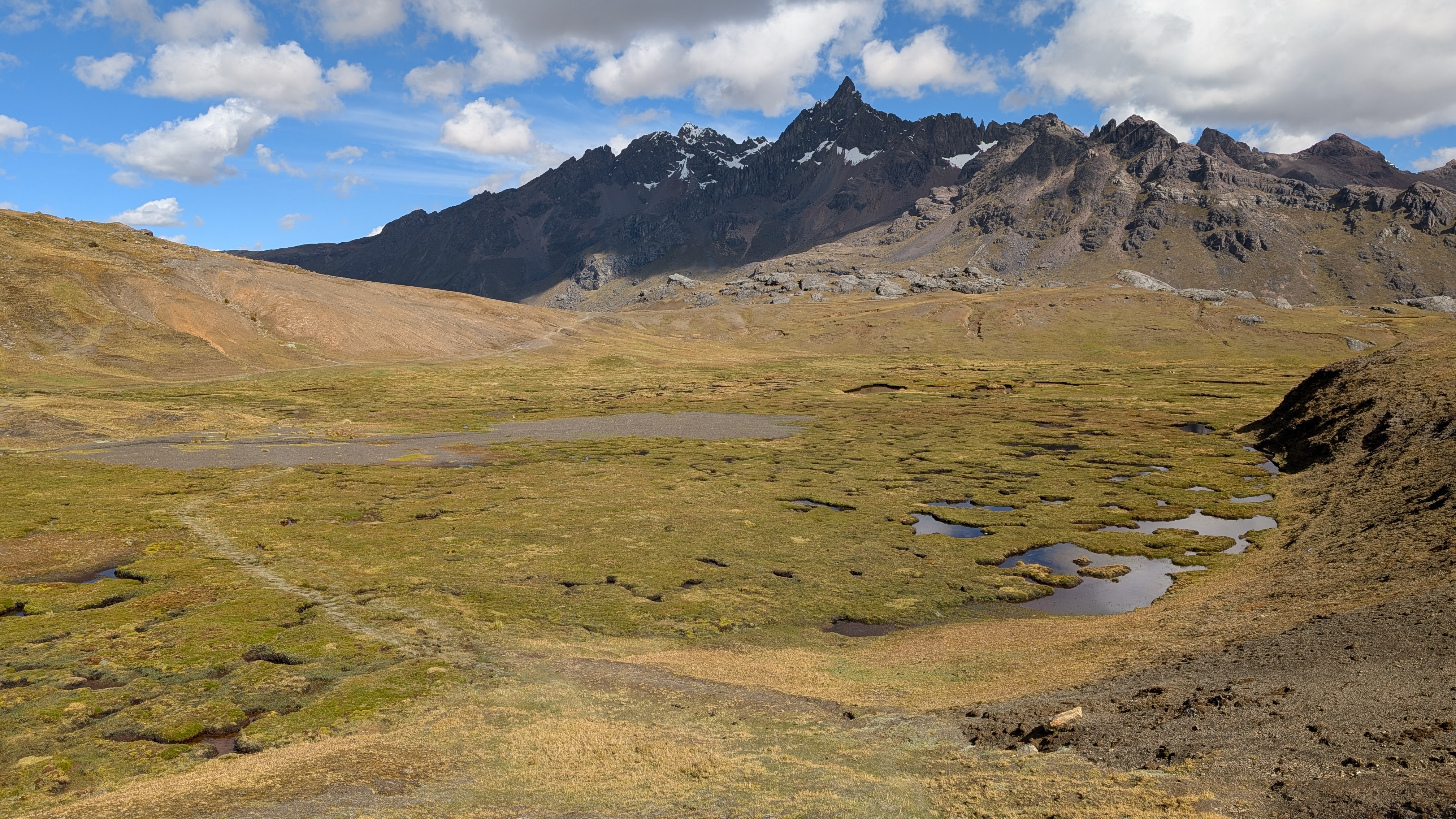 We hike crosscountry past a few small houses before crossing a little stream to a road cut/trail. Our starting elevation is about 14,600 feet. We point ourselves in the direction of a clouded but mighty Apu Ausangate as pools of water bubble on either side of the trail. Volume up!
