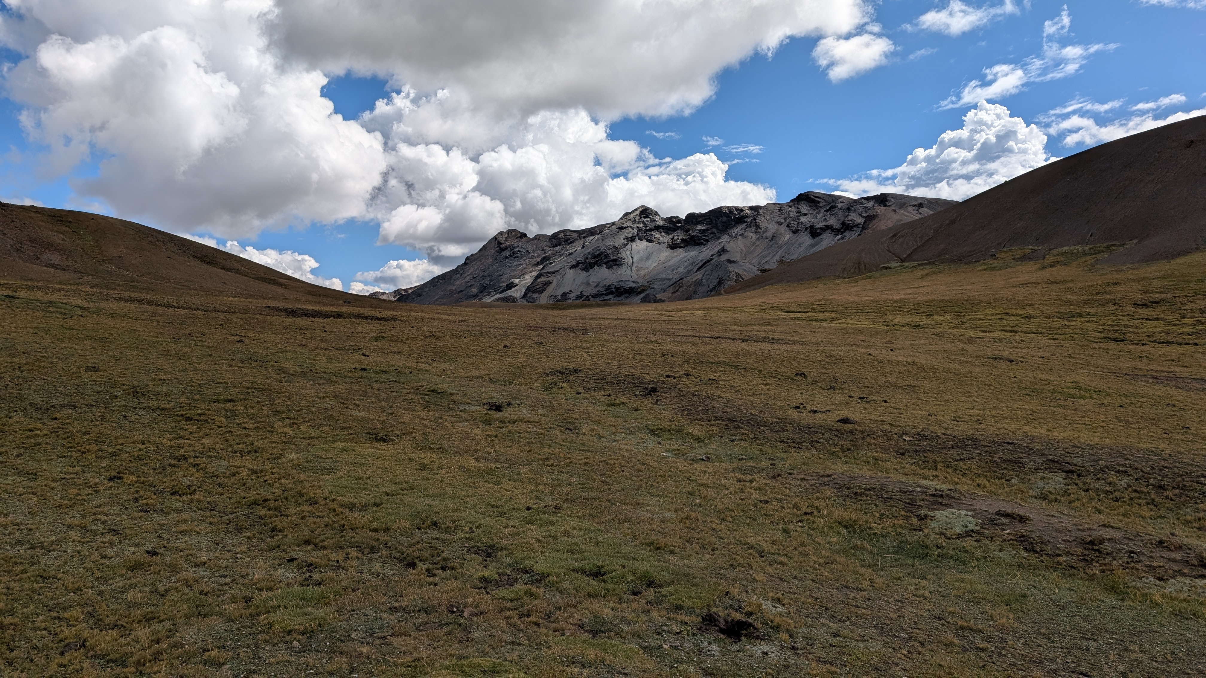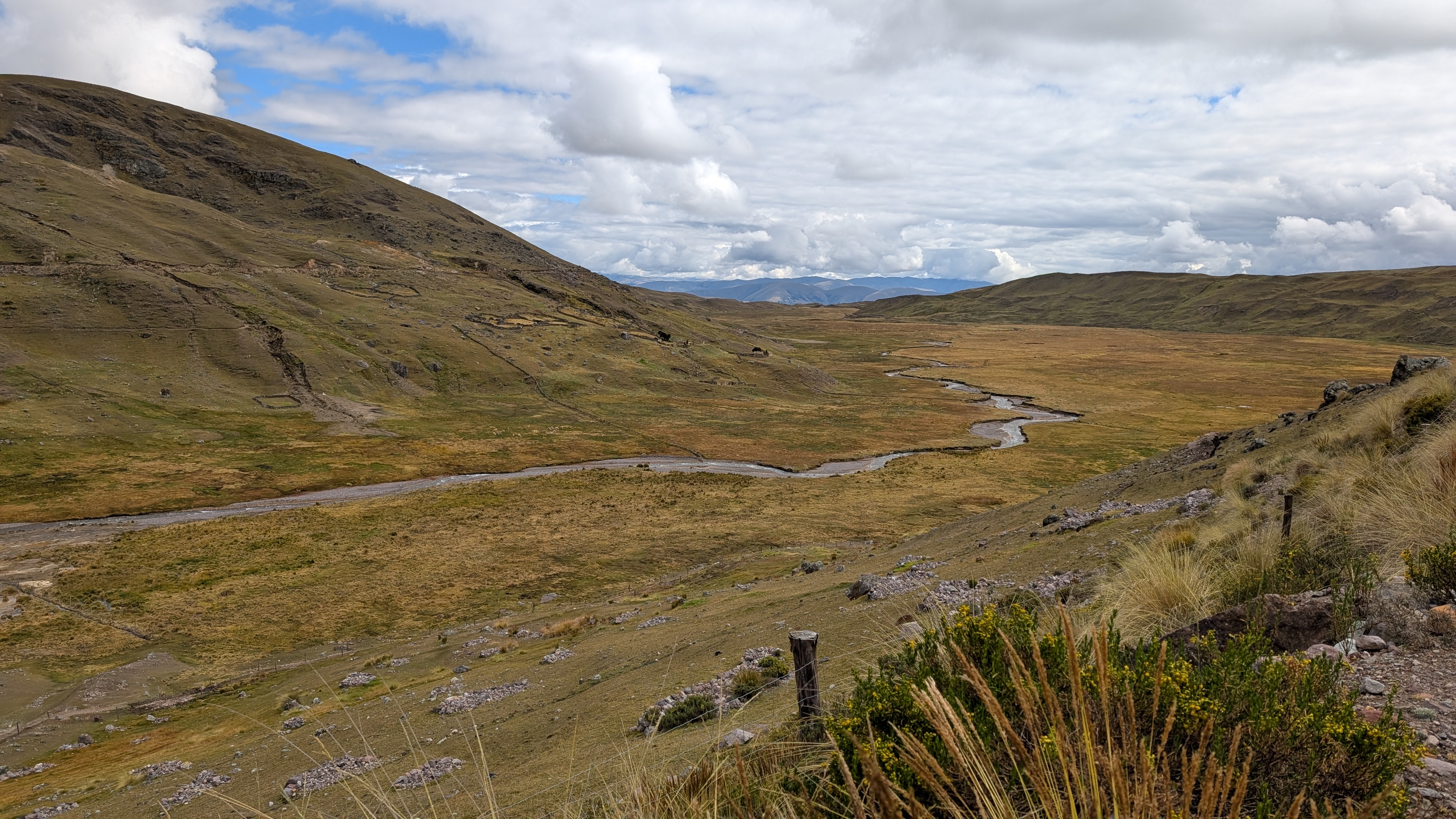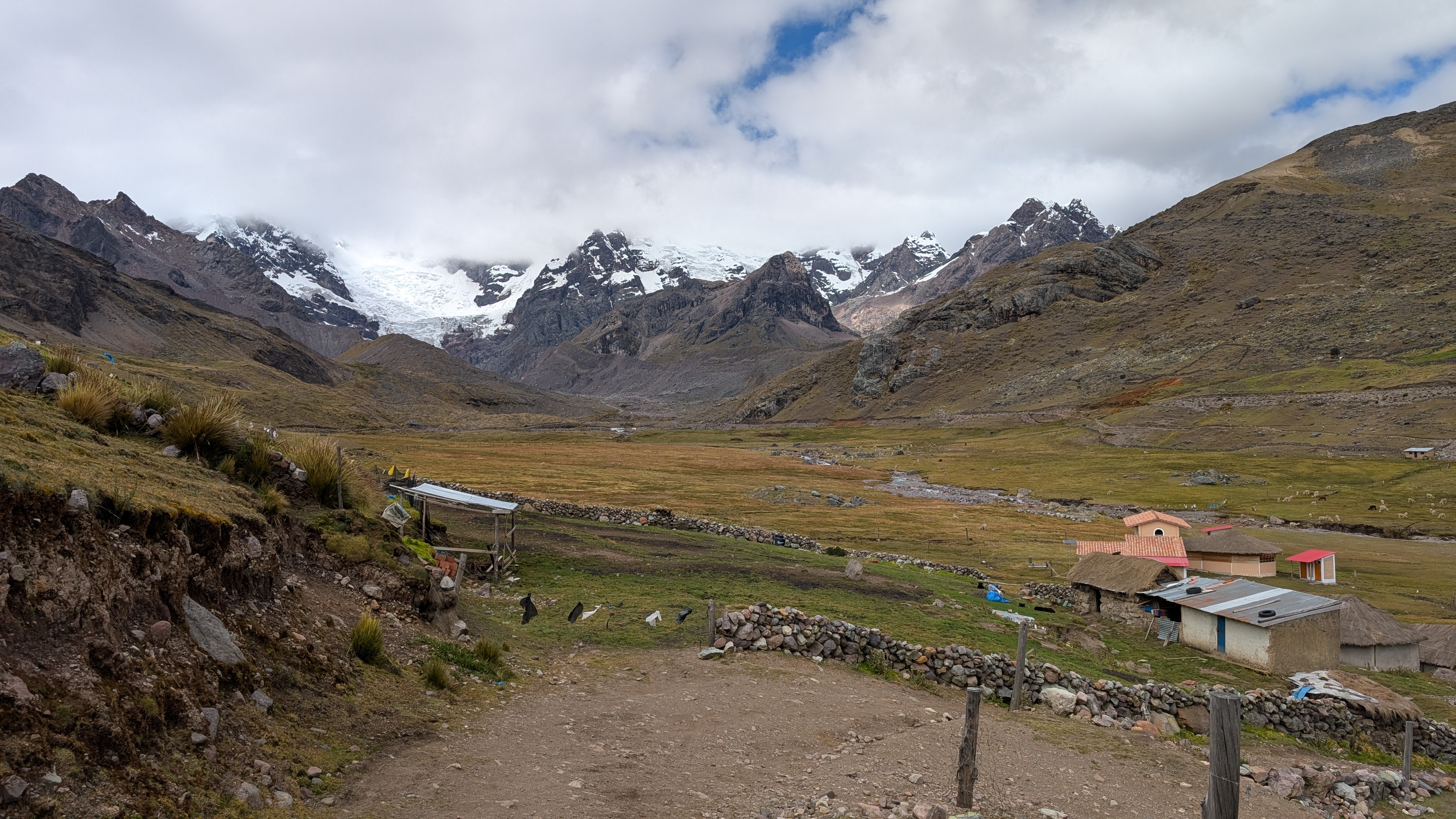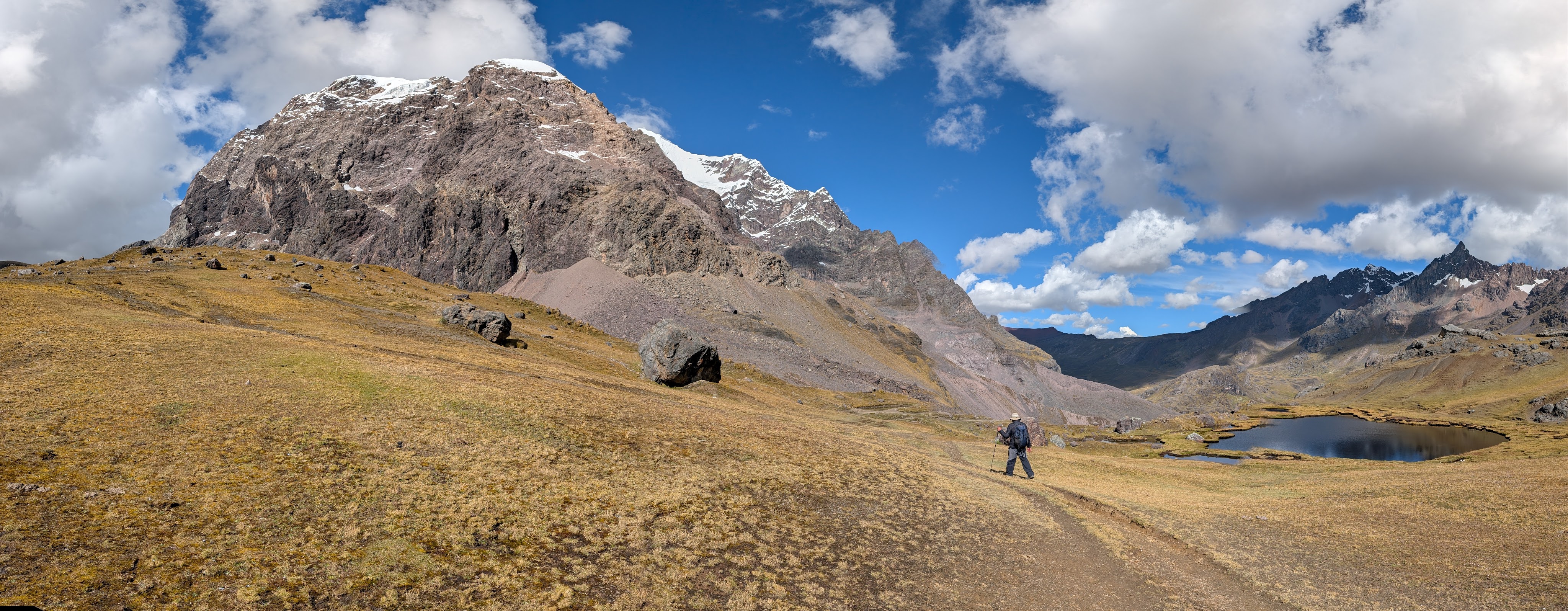 We hike crosscountry past a few small houses before crossing a little stream to a road cut/trail. Our starting elevation is about 14,600 feet. We point ourselves in the direction of a clouded but mighty Apu Ausangate as pools of water bubble on either side of the trail. Volume up!
