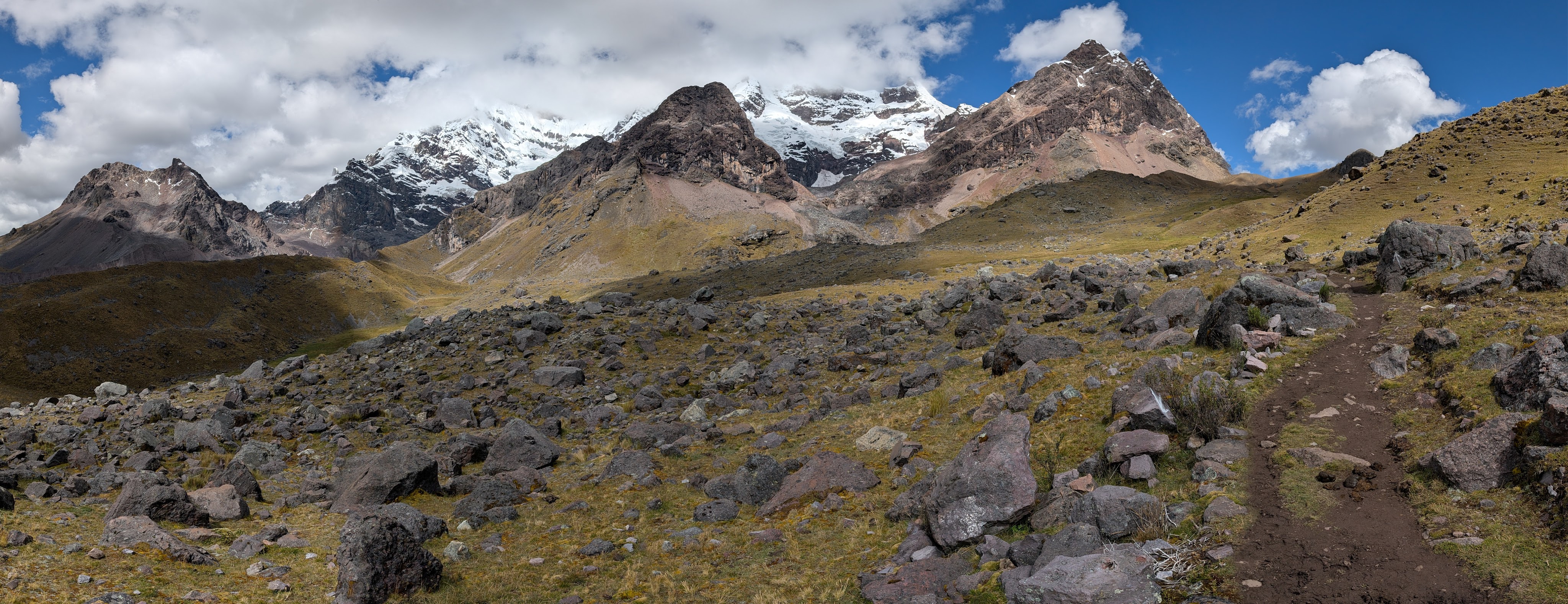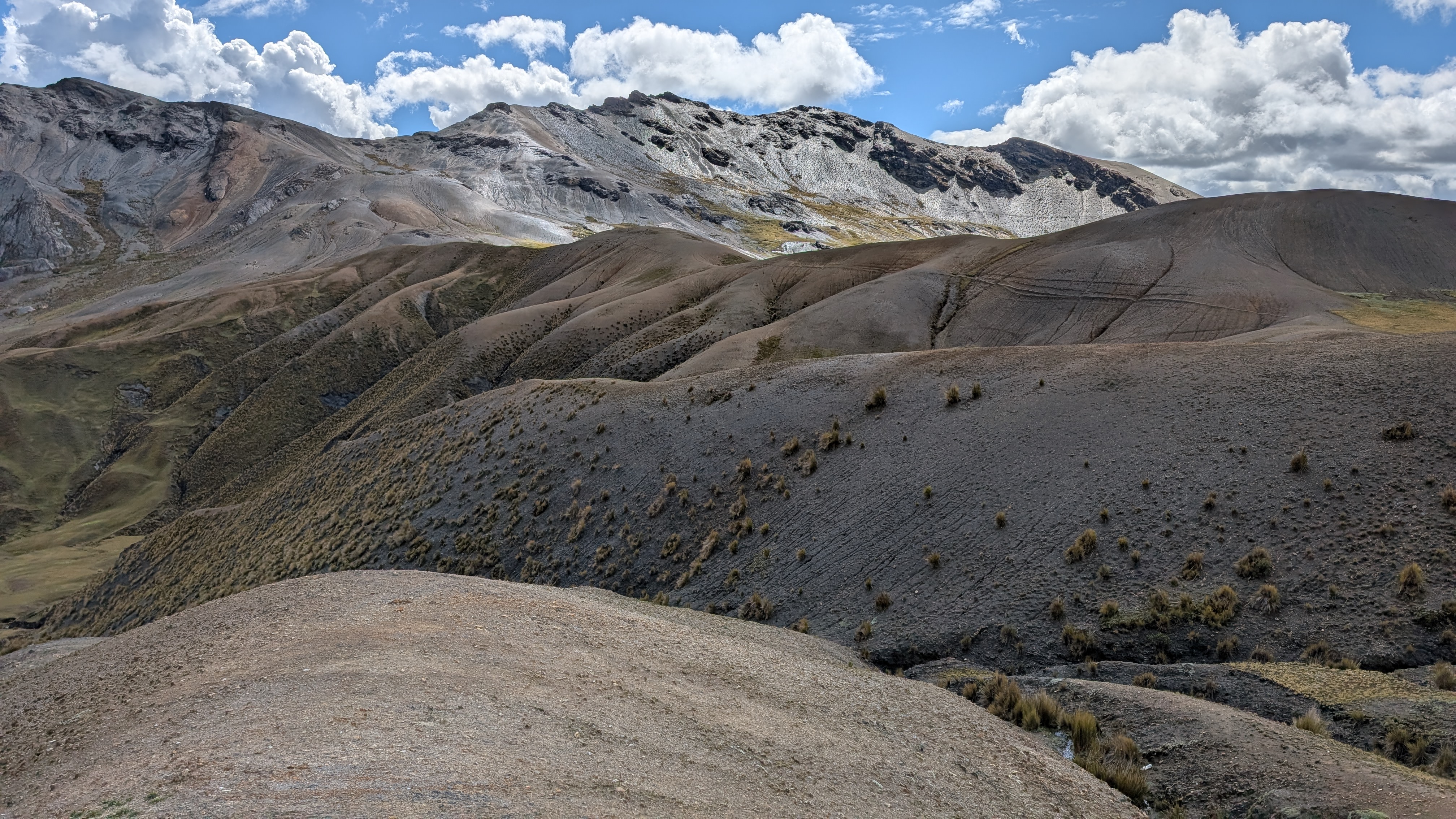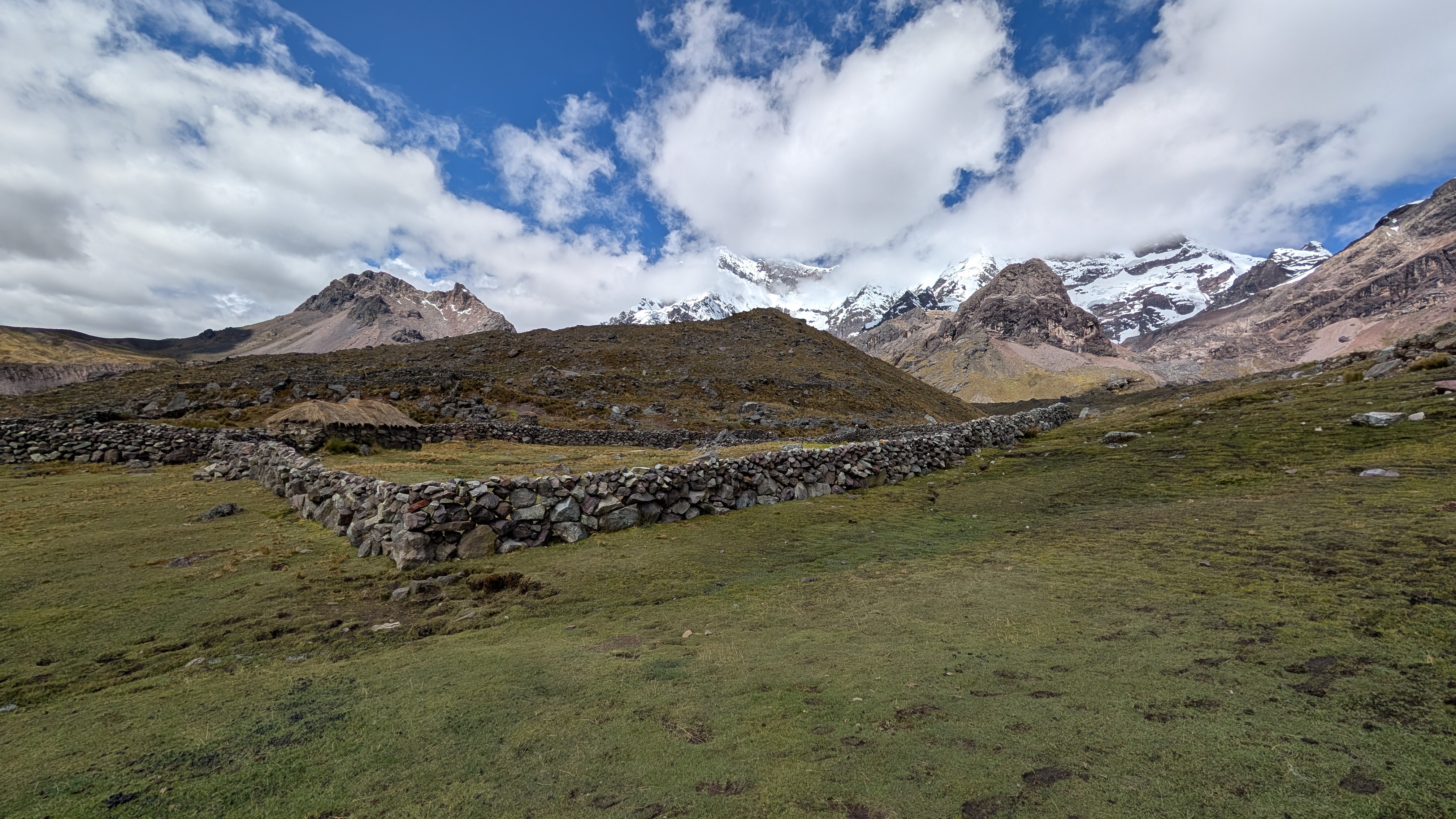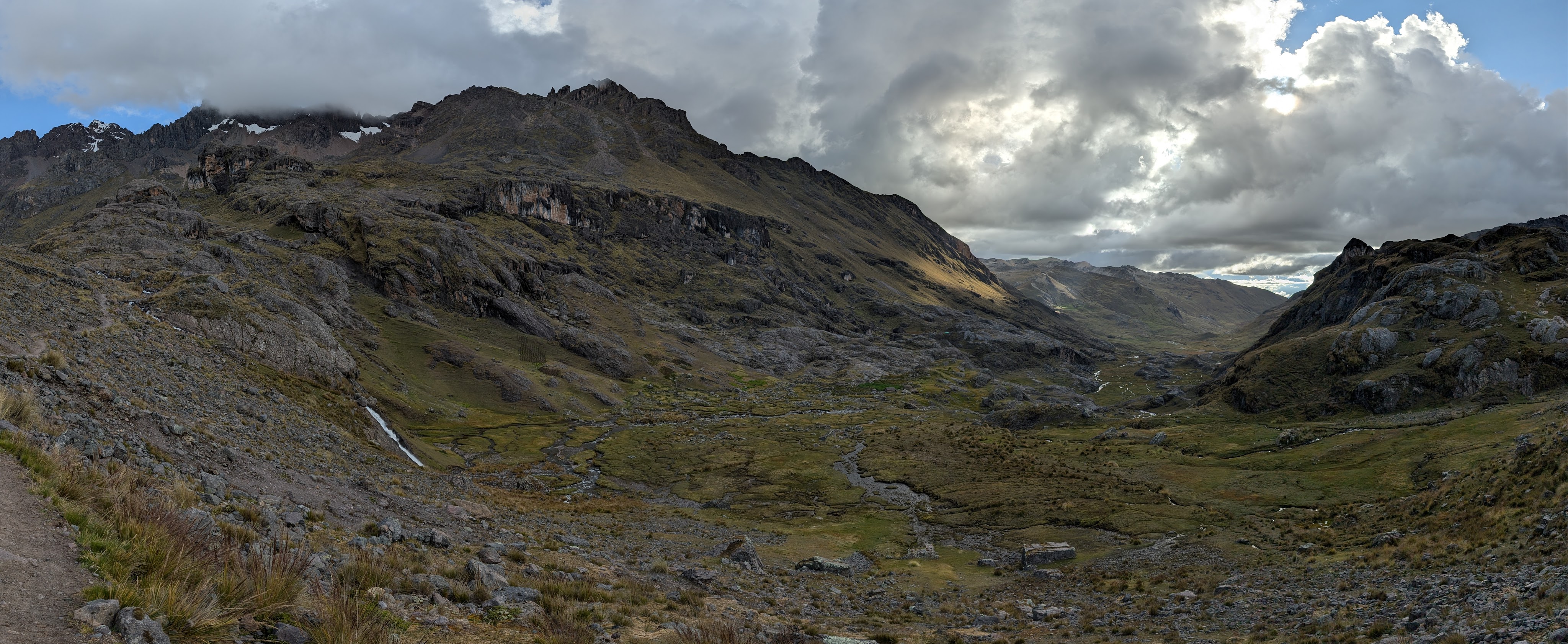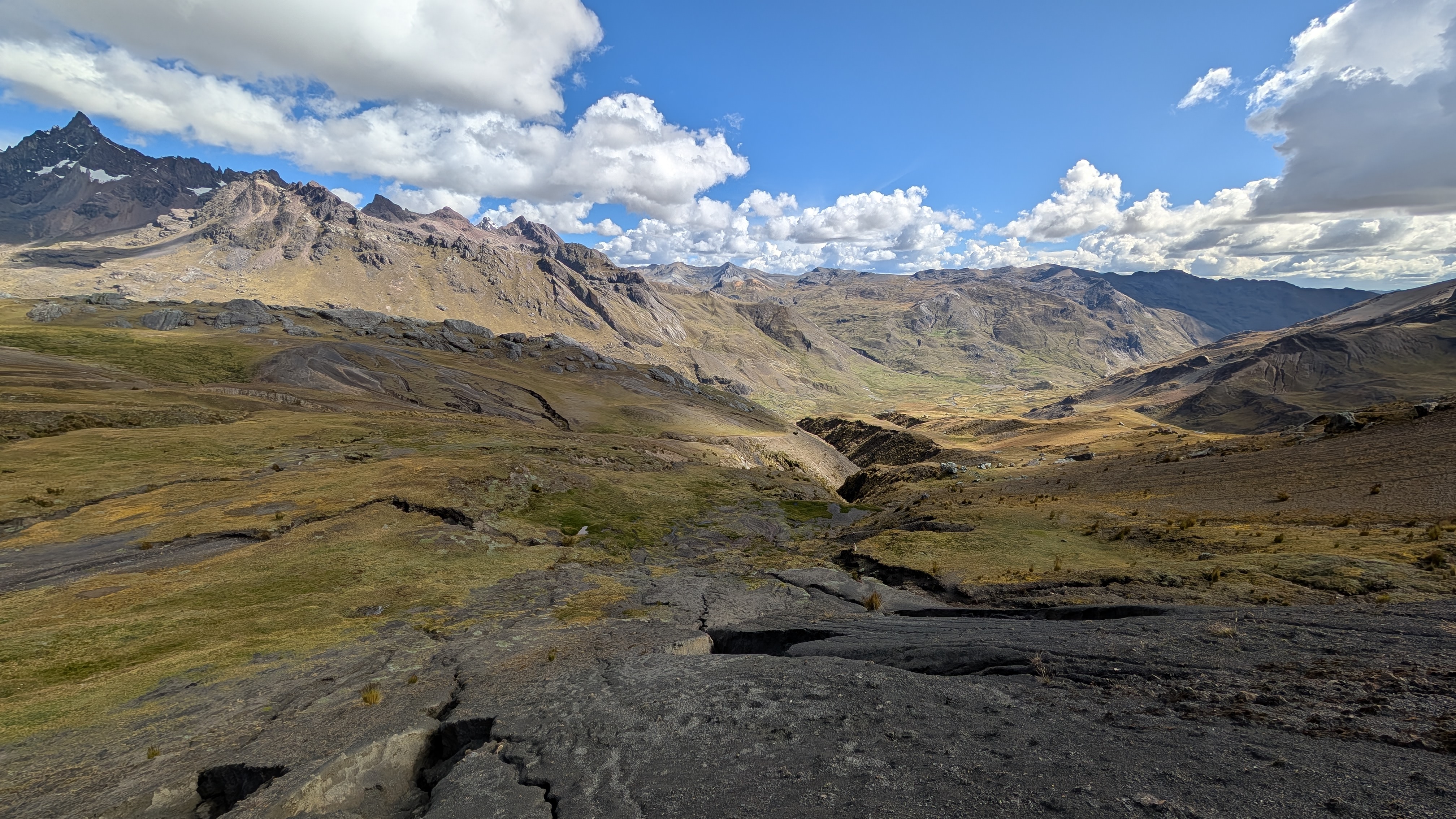 We hike crosscountry past a few small houses before crossing a little stream to a road cut/trail. Our starting elevation is about 14,600 feet. We point ourselves in the direction of a clouded but mighty Apu Ausangate as pools of water bubble on either side of the trail. Volume up!