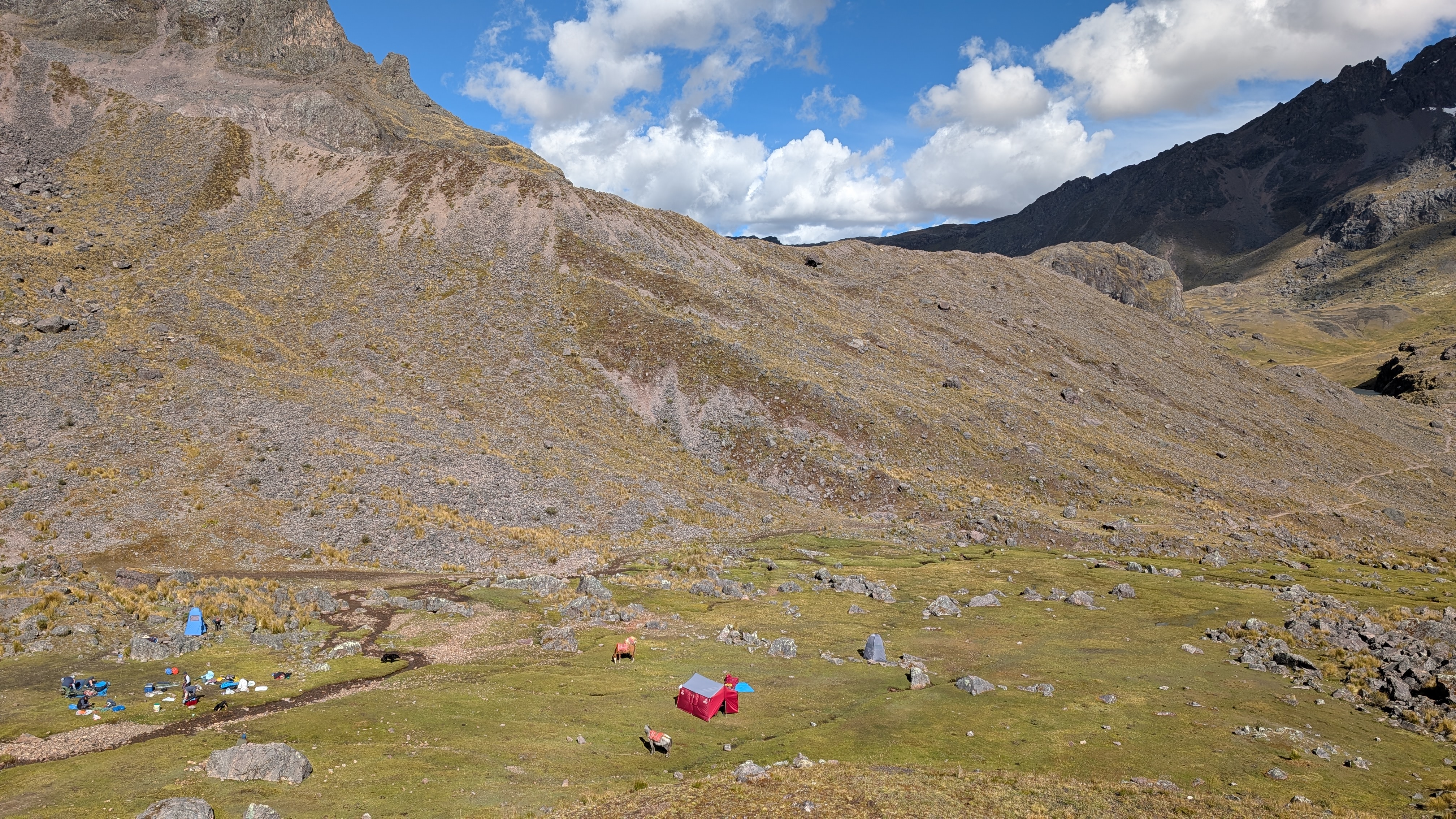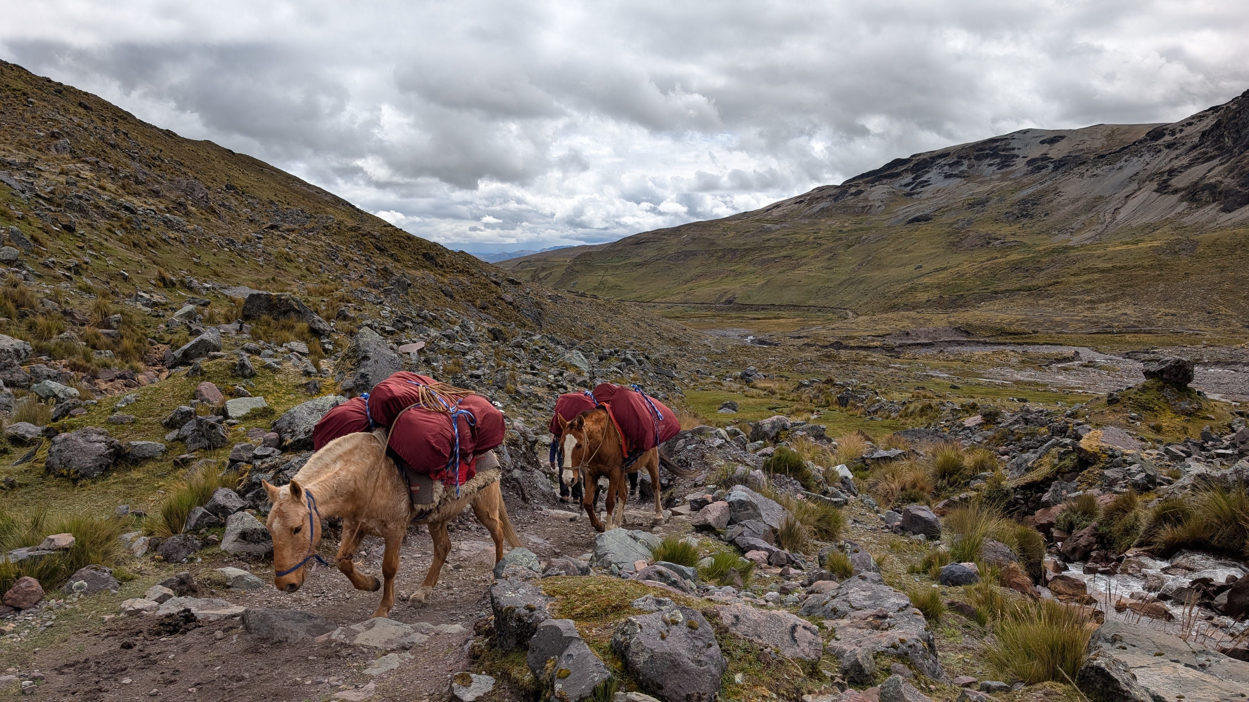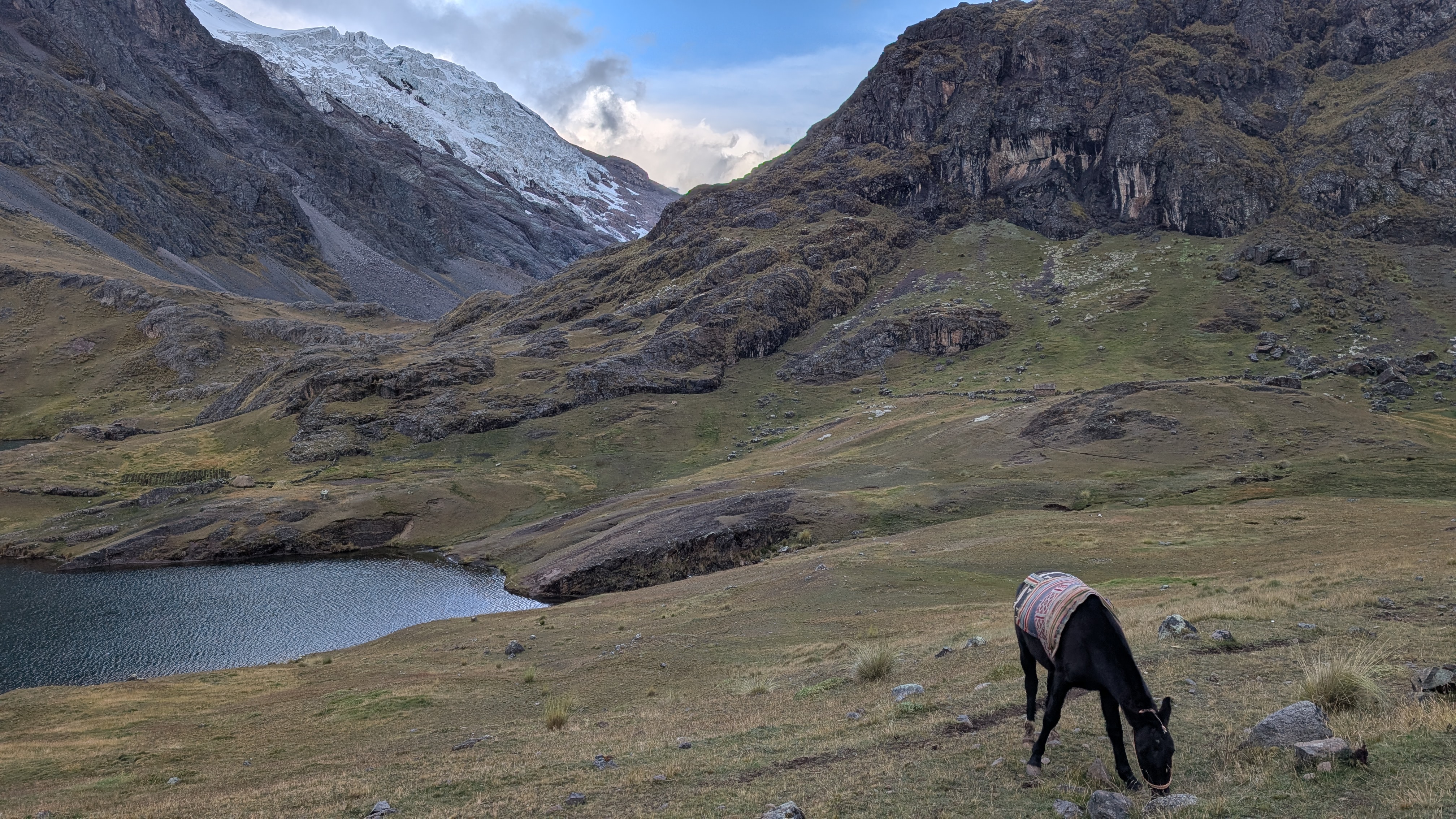 We skirt around a pass where a stream is cascading across its edge. We climb briefly before a series of lakes come into view. At this elevation, the landscape is quite barren so the bright yellow flowers are like a strobe light blasting the horizon. We descend towards the next lake and there are a couple small houses with a horse and alpaca grazing nearby. We pass a few local families along the side of the trail. I give out little fruit leather roll treats to three children who seem quite happy by the surprise.