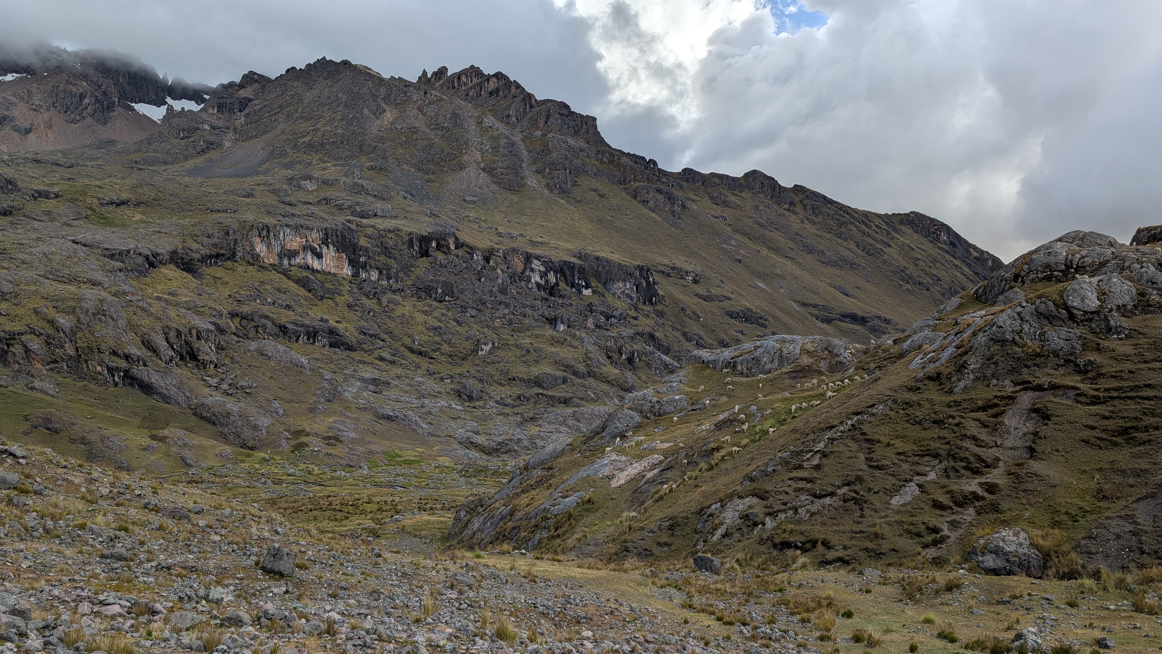 We start hiking again about 3:40 pm and continue to move around the long flanks of Ausangate. As I hike uphill, I can see an alpaca herd far below us in the canyon.
