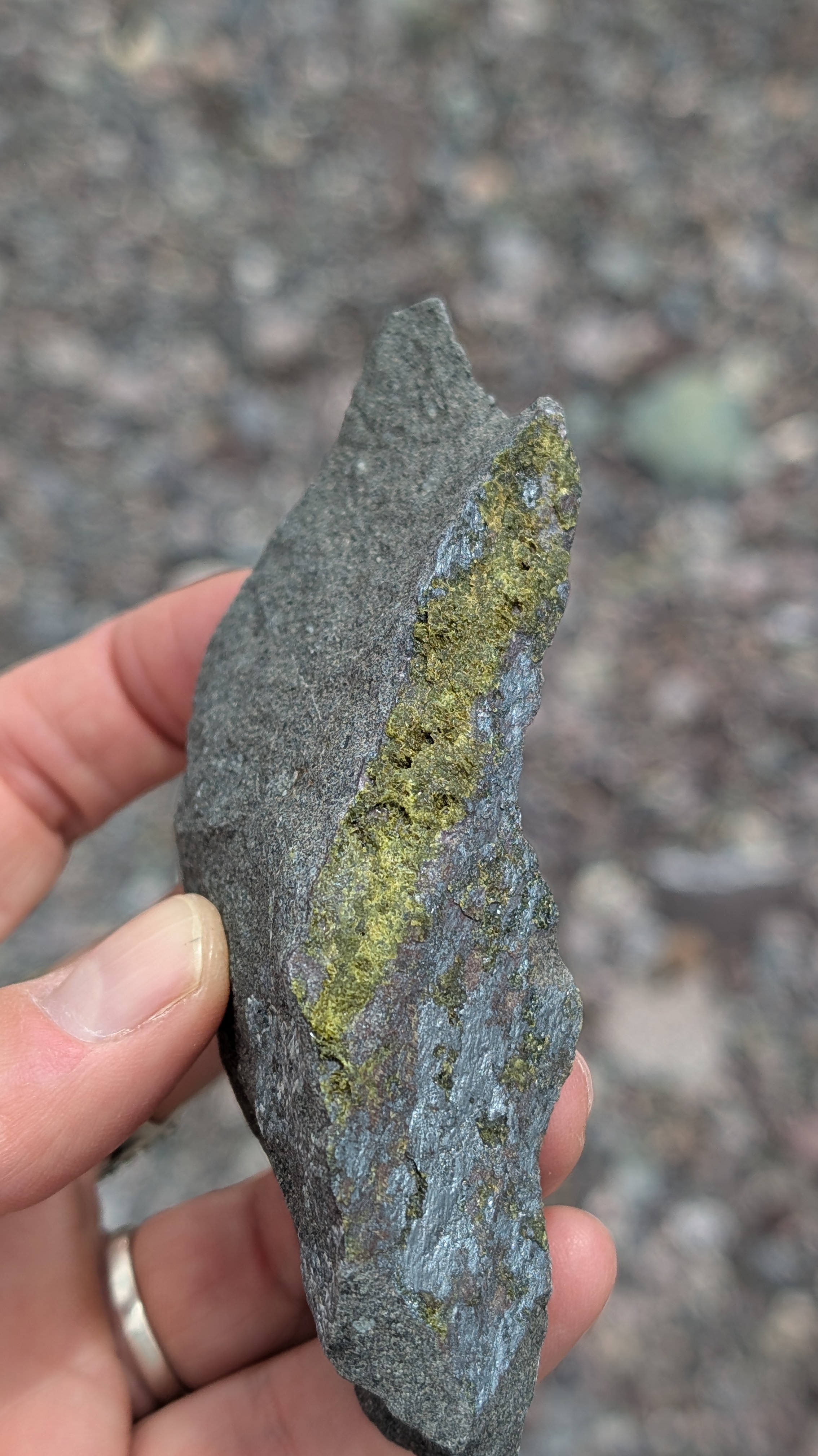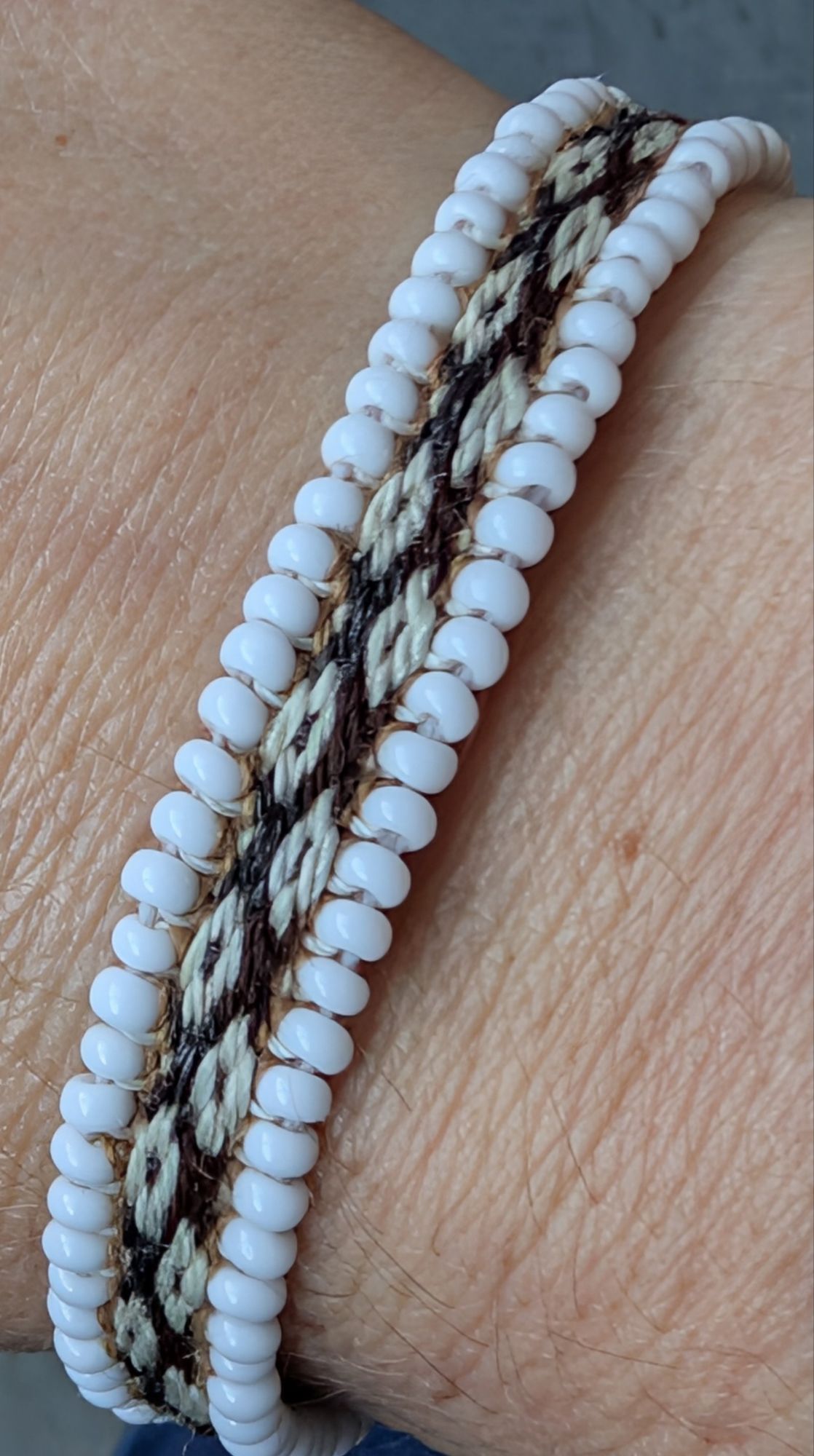 This bird’s wing flapping seems unique but I can’t figure out what bird it is. We tread back to the main trail, past volcanic rocks that appear to have olivine banding. Back on the main trail, I look down across the valley before turning uphill. We climb steadily as the trail passes a home with a large rock wall surrounding it. There’s a man on the side of the trail selling a few items but at first I’m distracted by his adorable young puppy. I try to take its picture but it’s running around too much. My soles bills are too big and Ronnie helps break it down. I buy a woven alpaca bracelet with white beads from Marco for 10 soles. Ronnie helps affix it to my wrist.