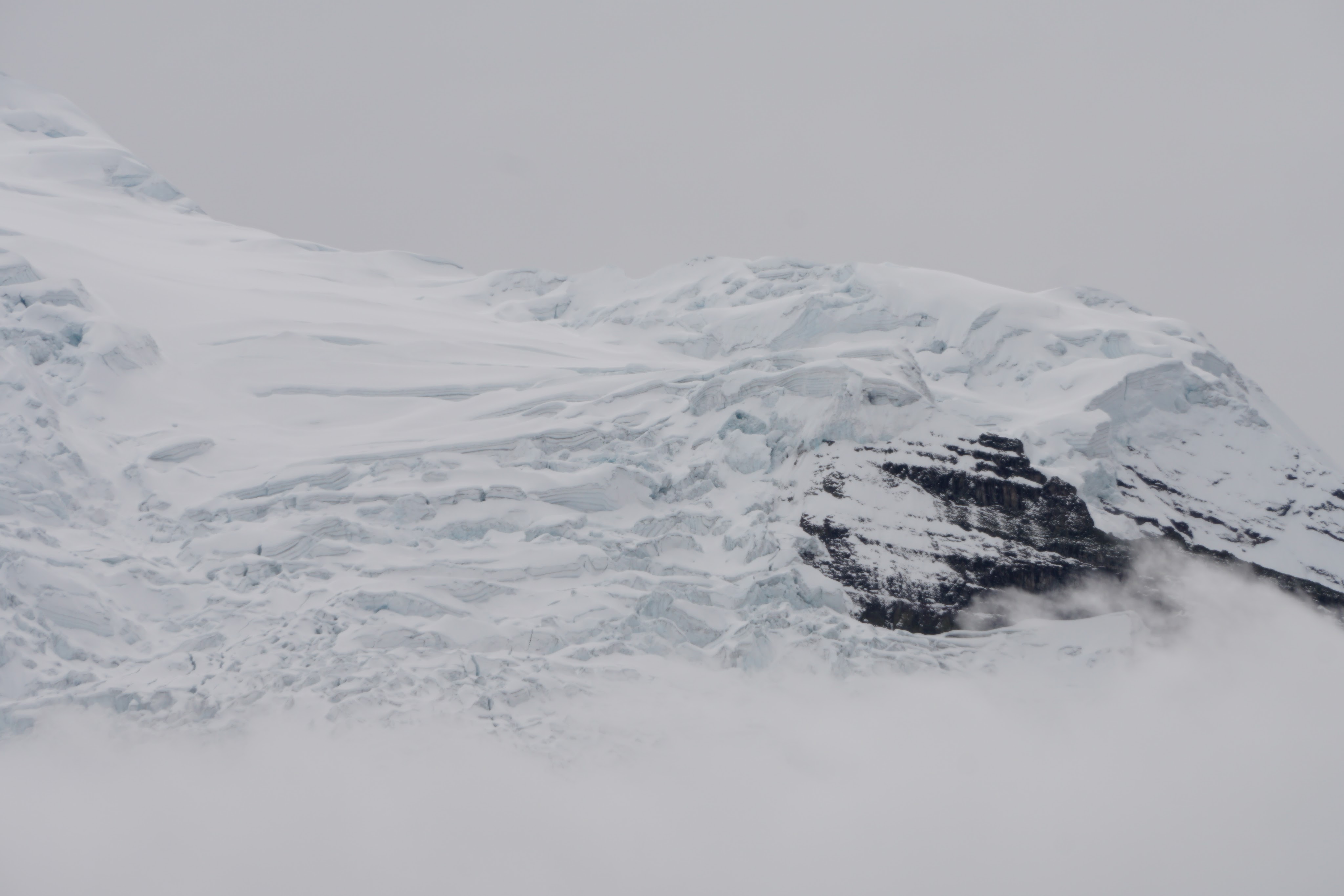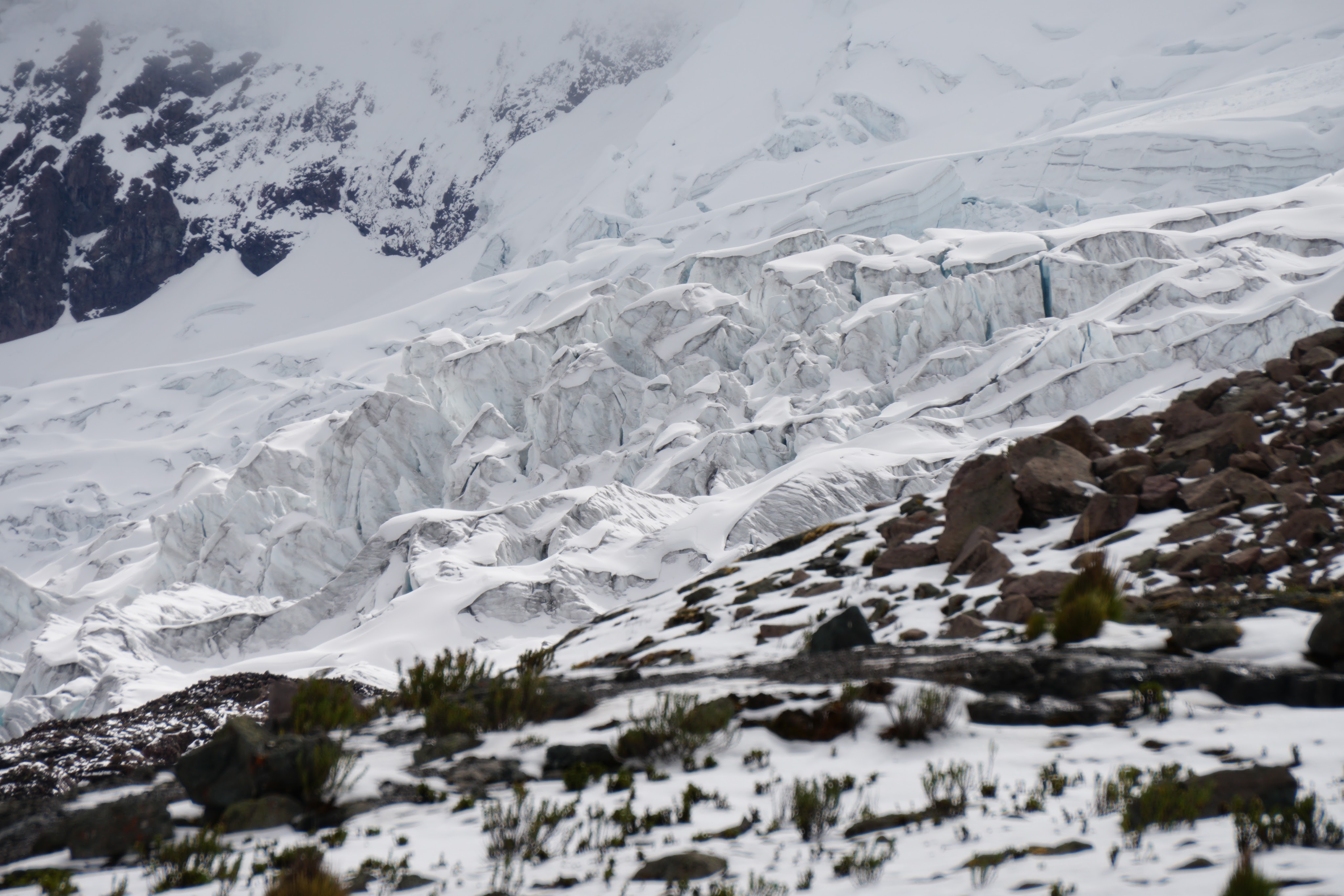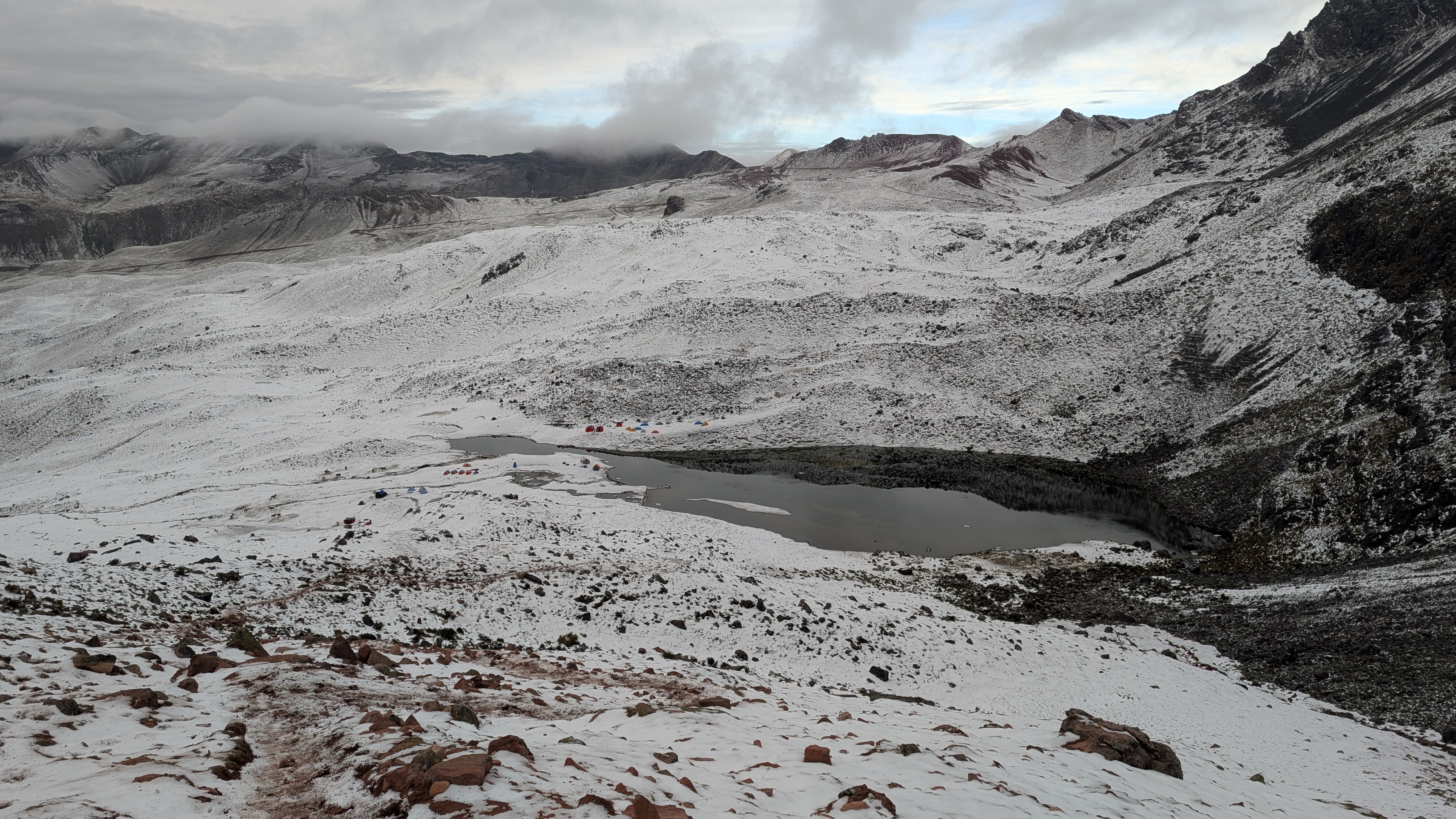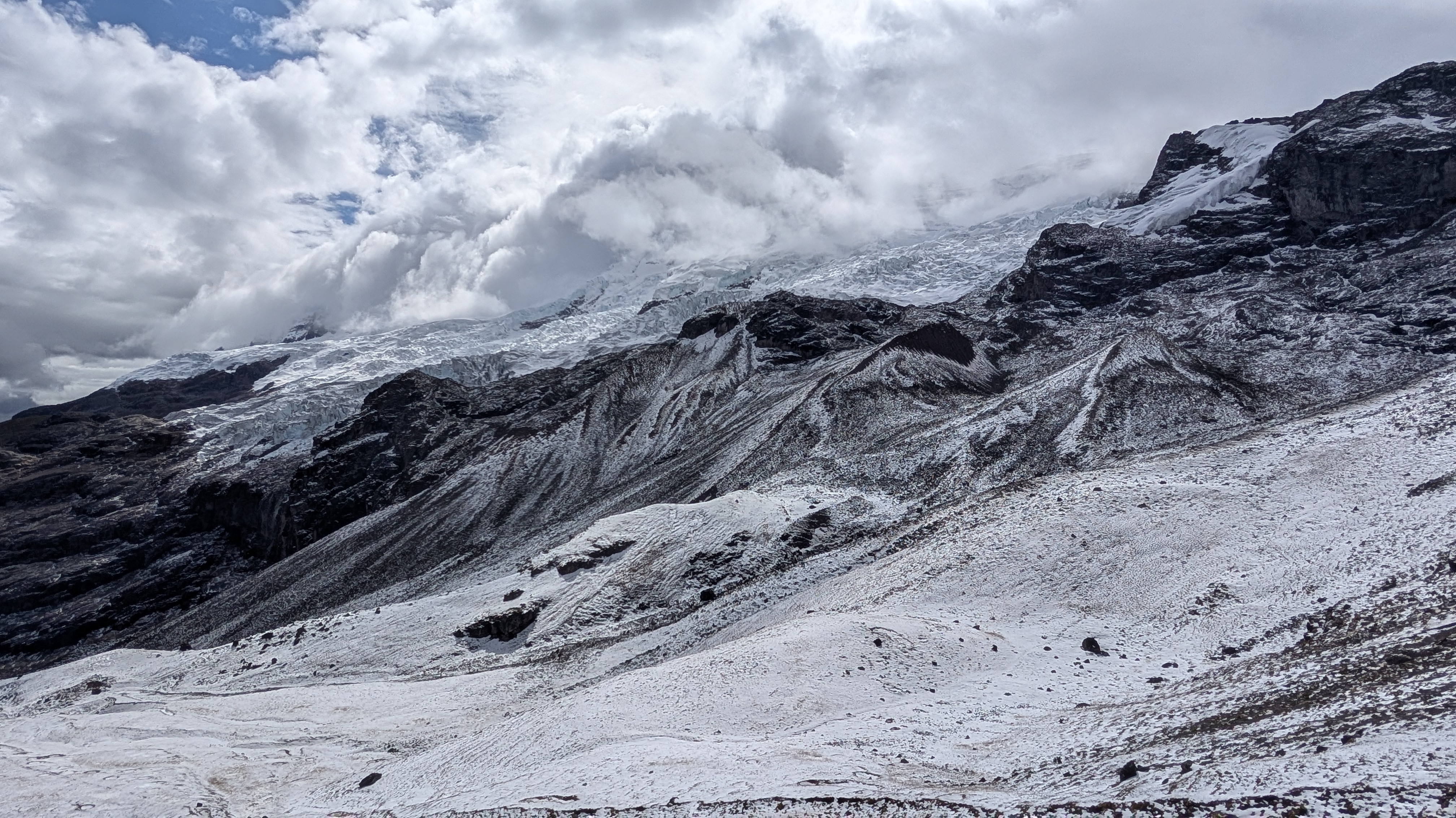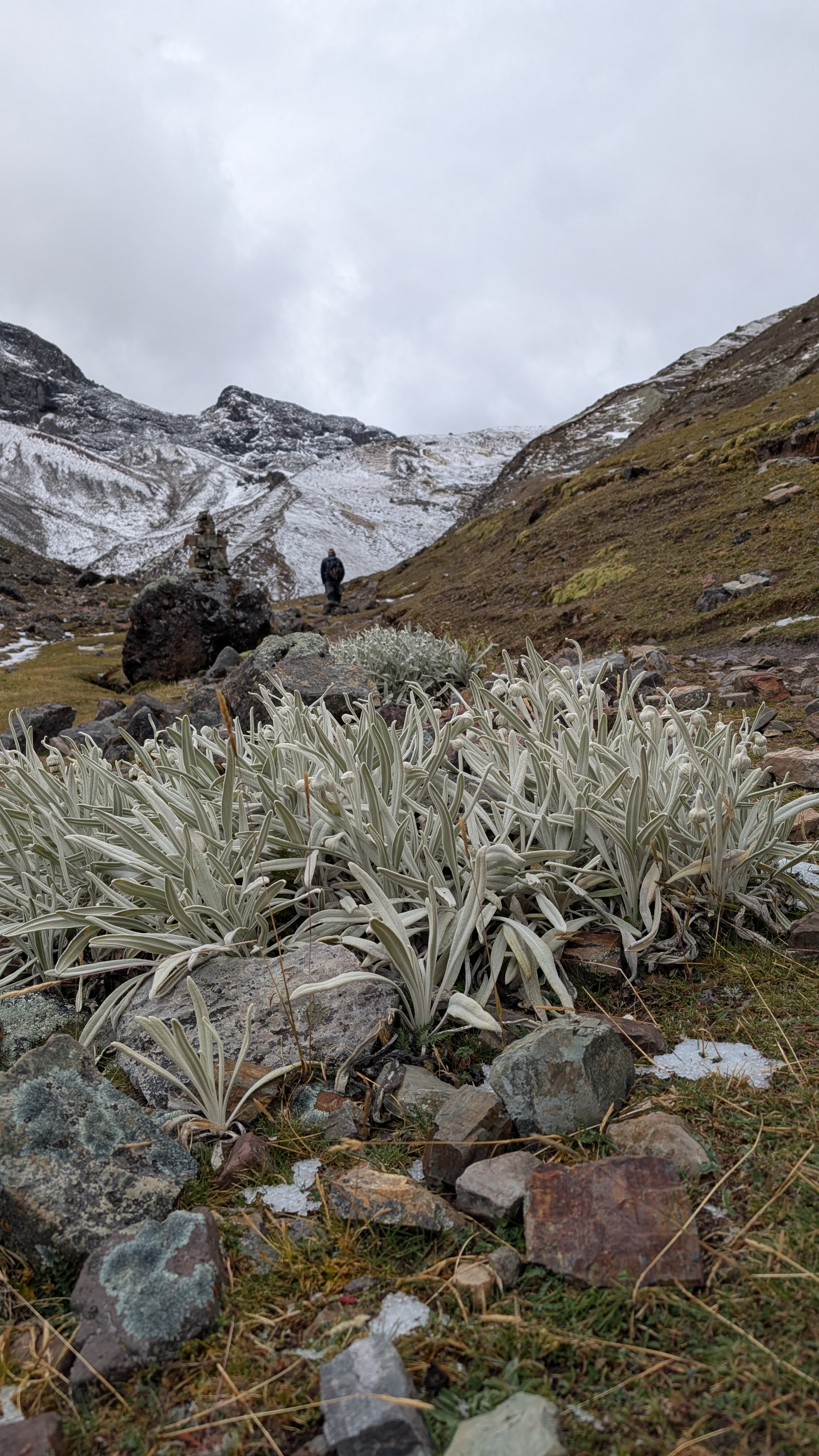 I fall asleep before 9 pm and crunch through the snowy hail layer to the toilet tent about midnight. 4:30 am wake-up for 5:30 am breakfast. The cold must be slowing us down because we don’t start hiking until about 6:20 am. Despite the impending ascent and the warmth which that generates, I keep my alpaca layer on.