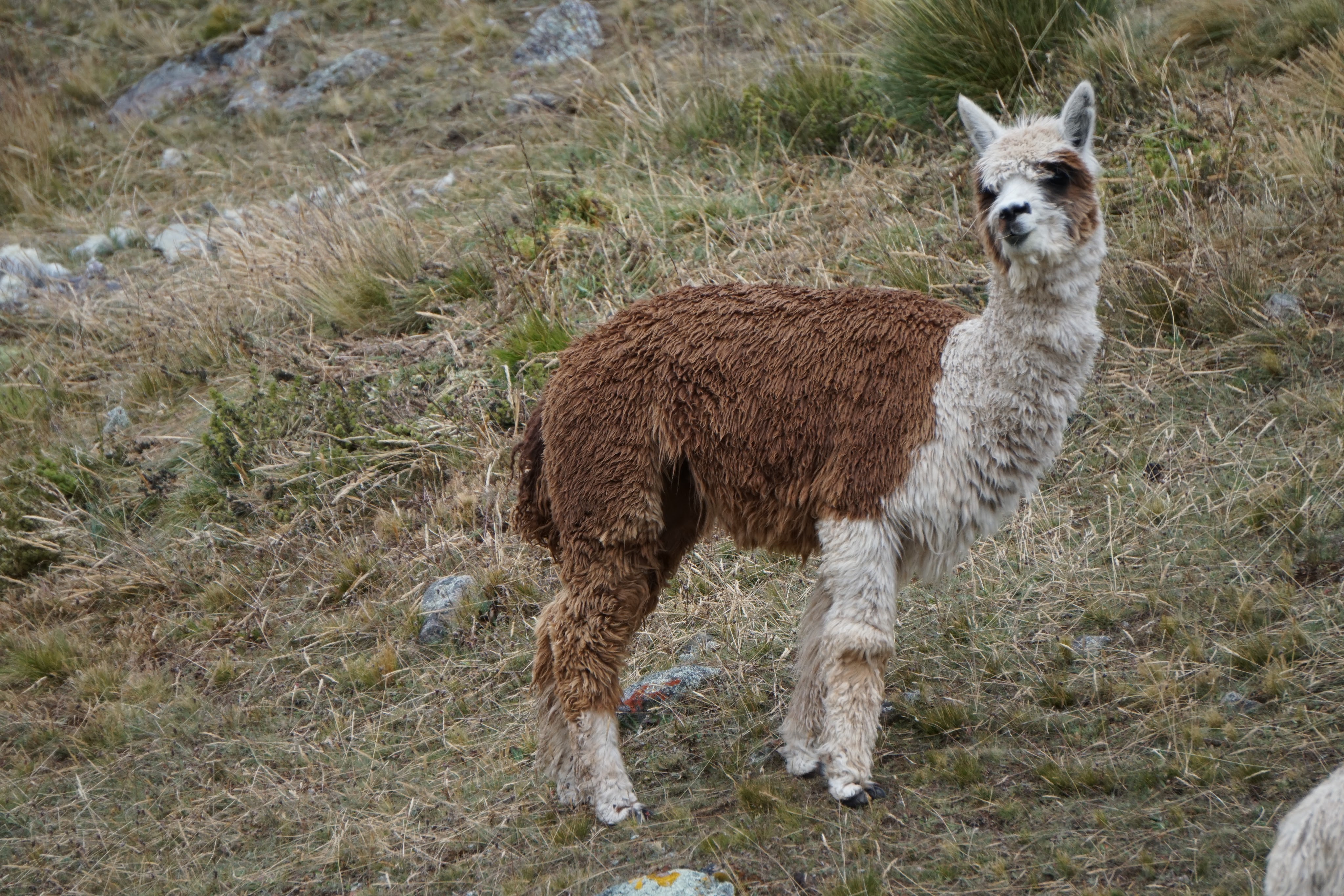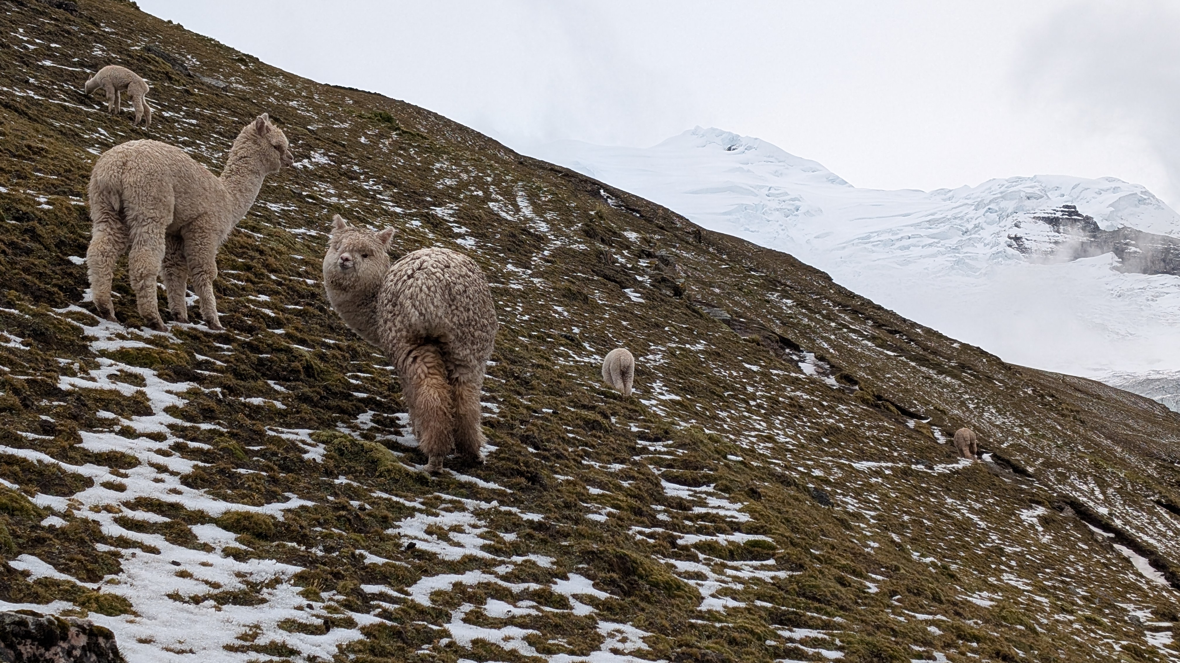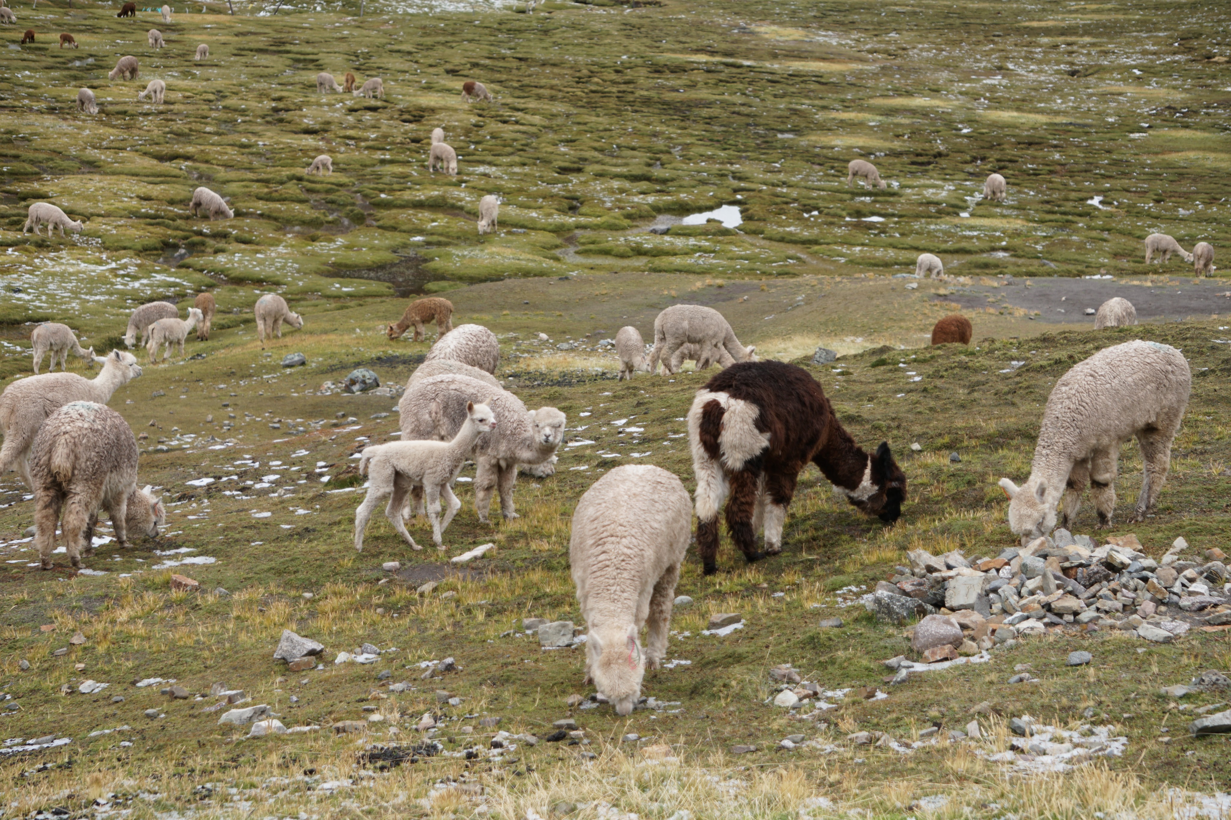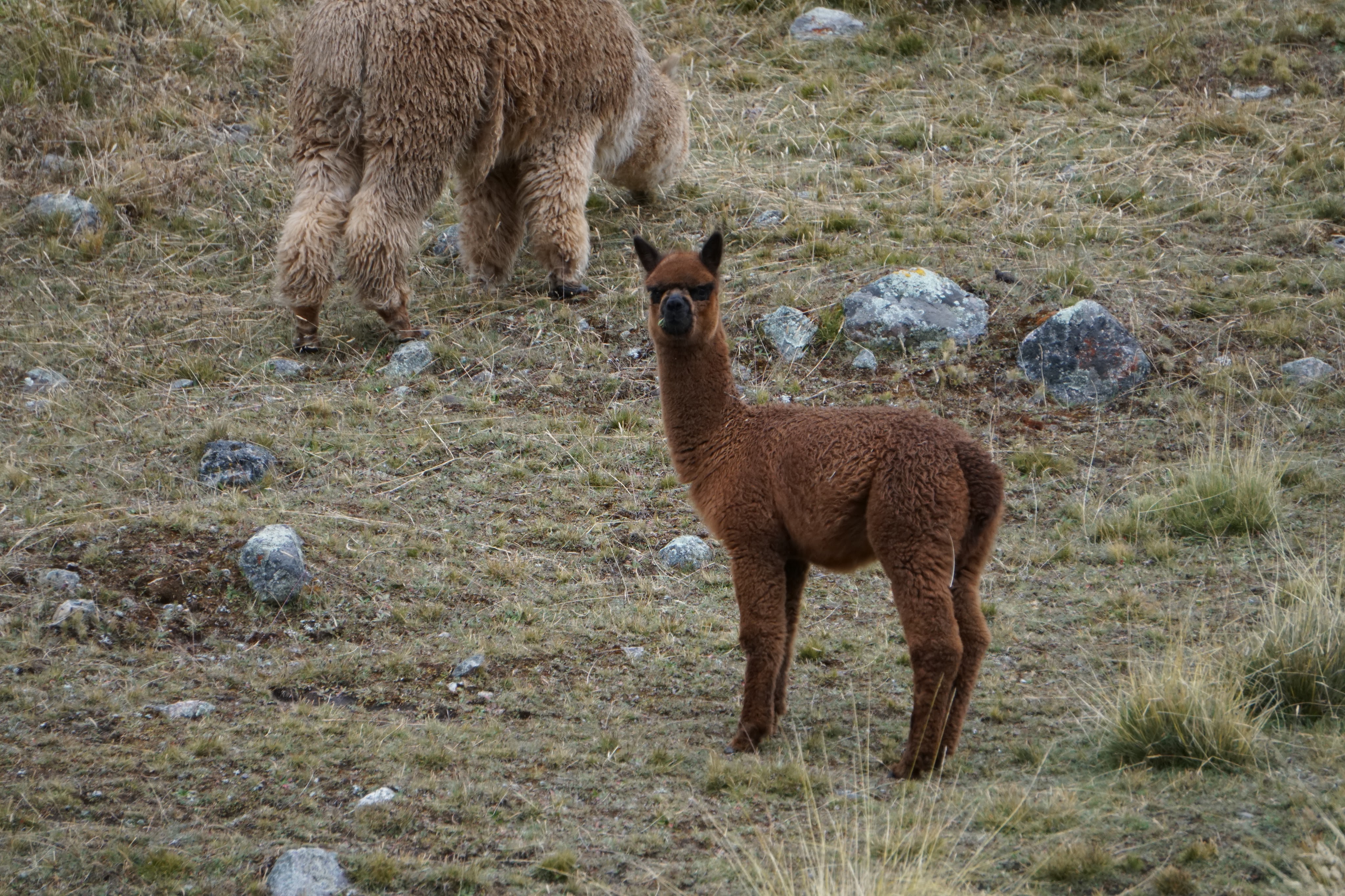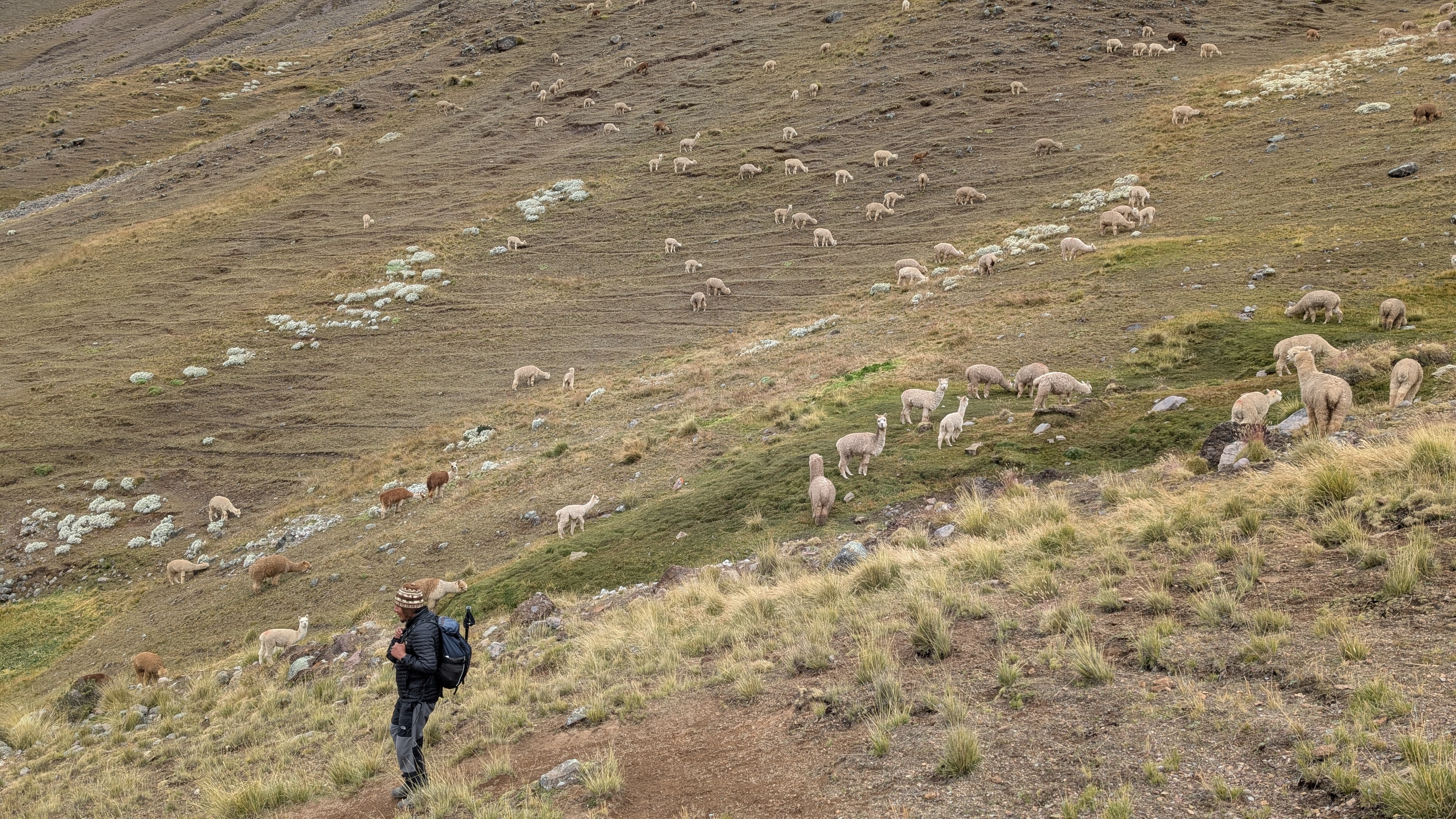 We make quick tracks downhill and as we approach the bottom of the valley, we pass near another herd of alpaca with a few llama too.