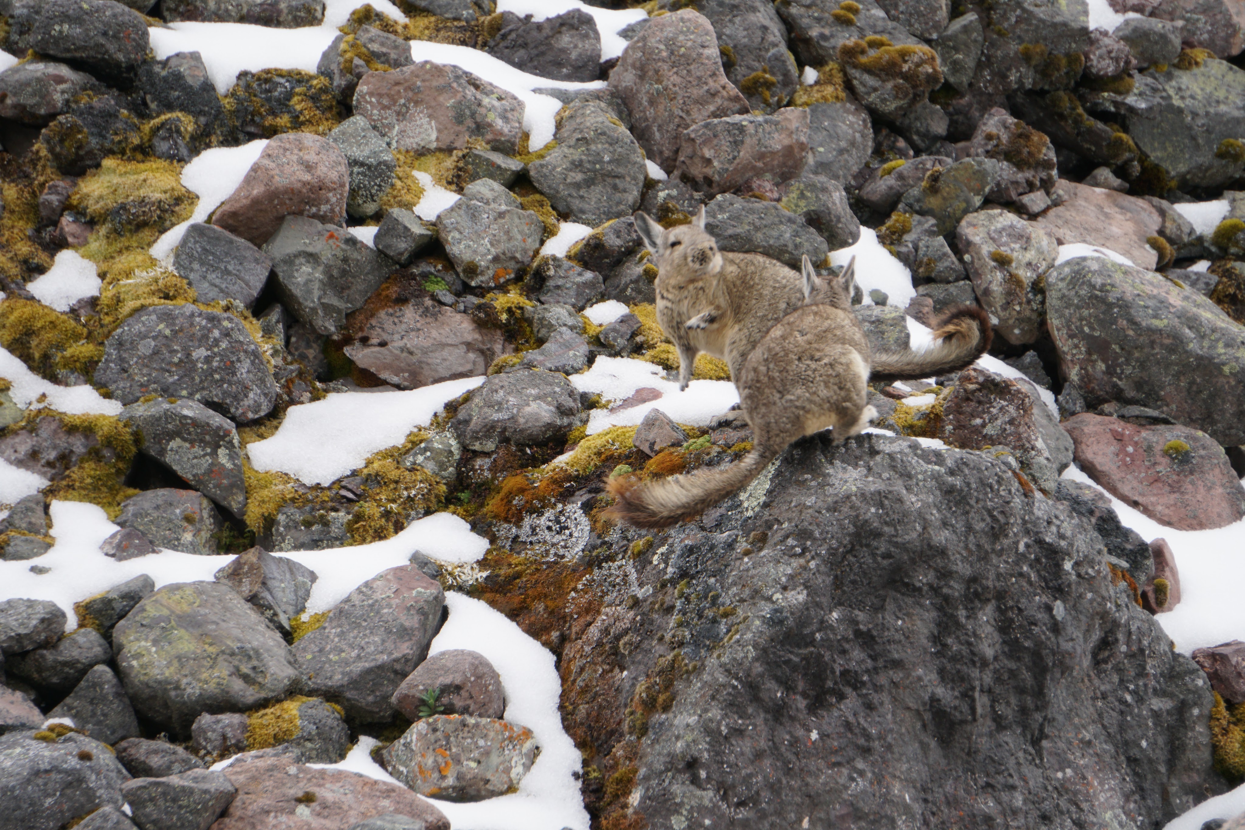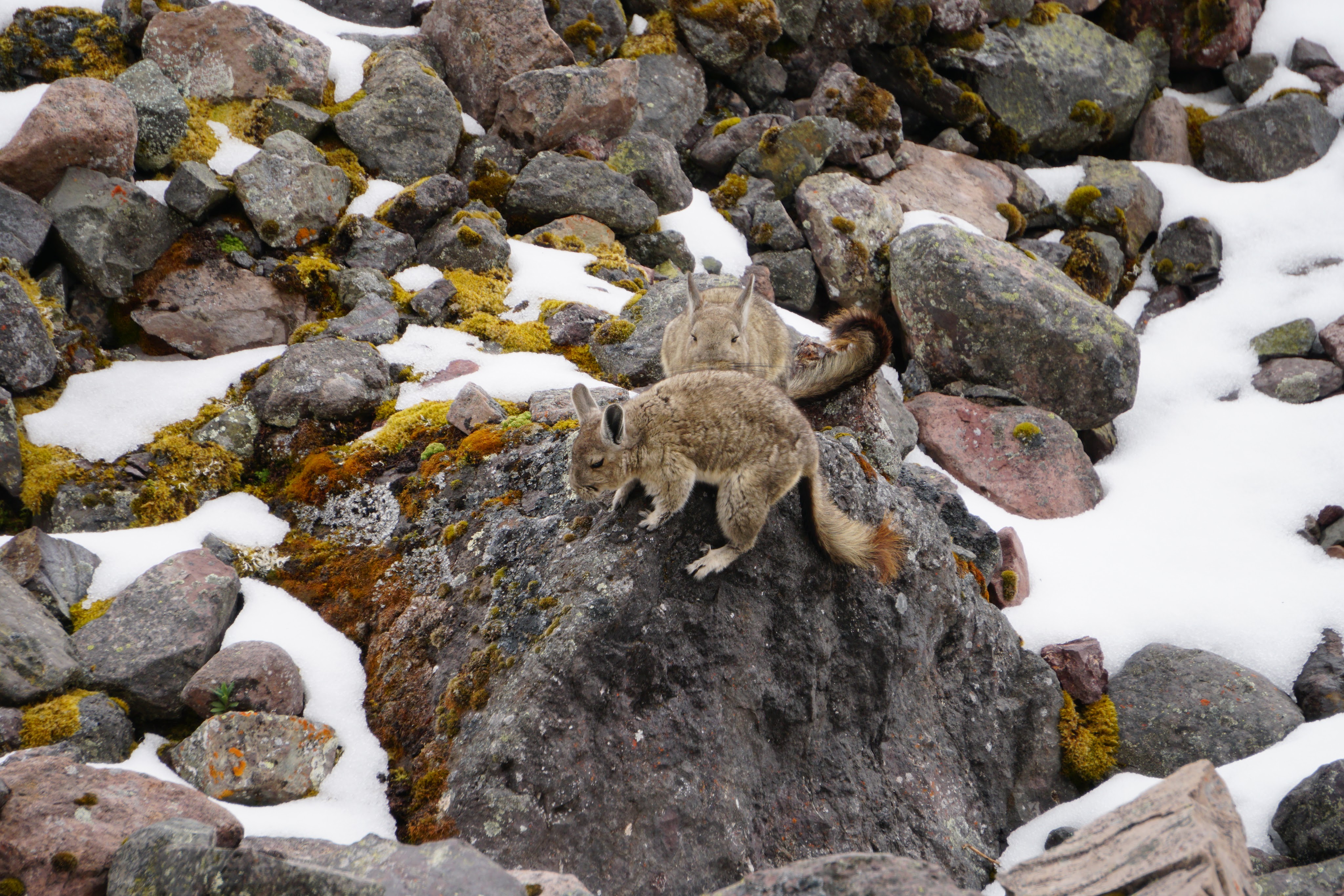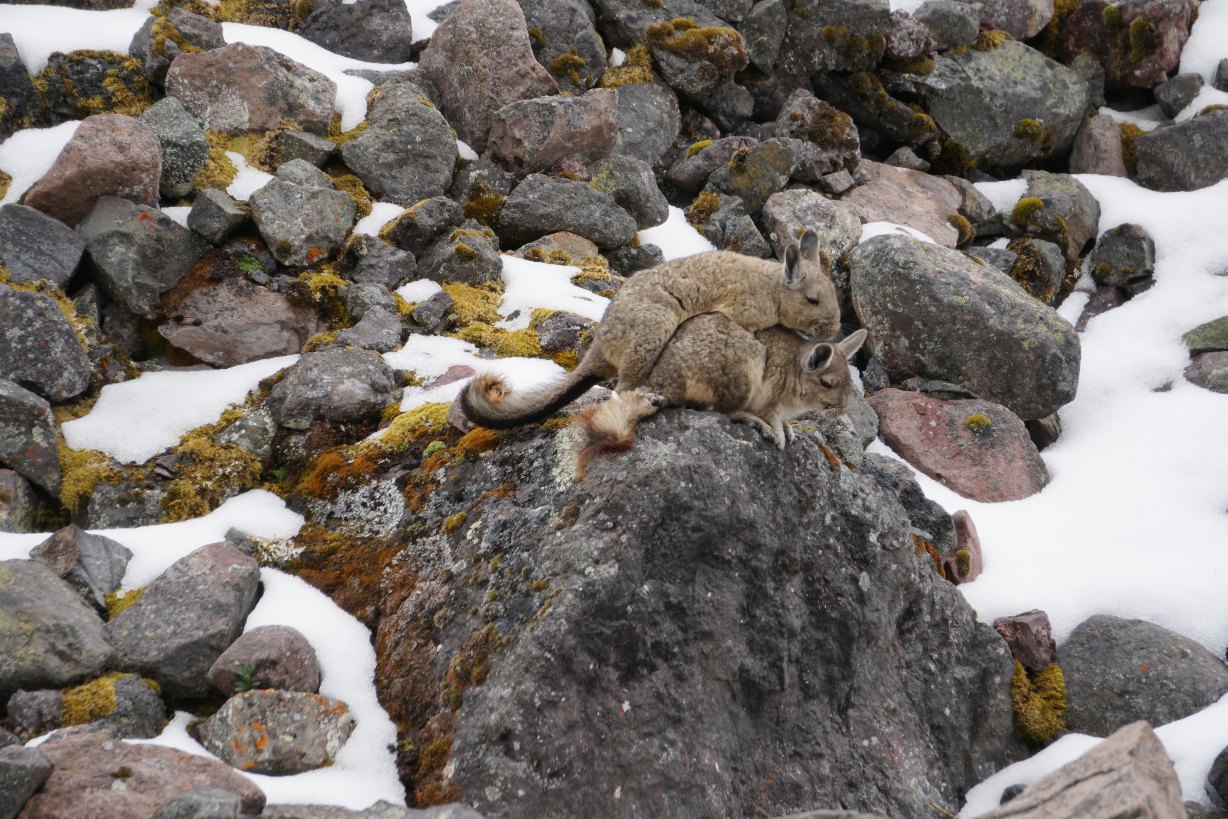About 12:15 pm, we depart and start the climb towards Abra Palomani. The terrain is still covered with yesterday’s hail although the trail is mostly clear. Within a half hour we come up on a viscacha couple making the most of the overcast day.