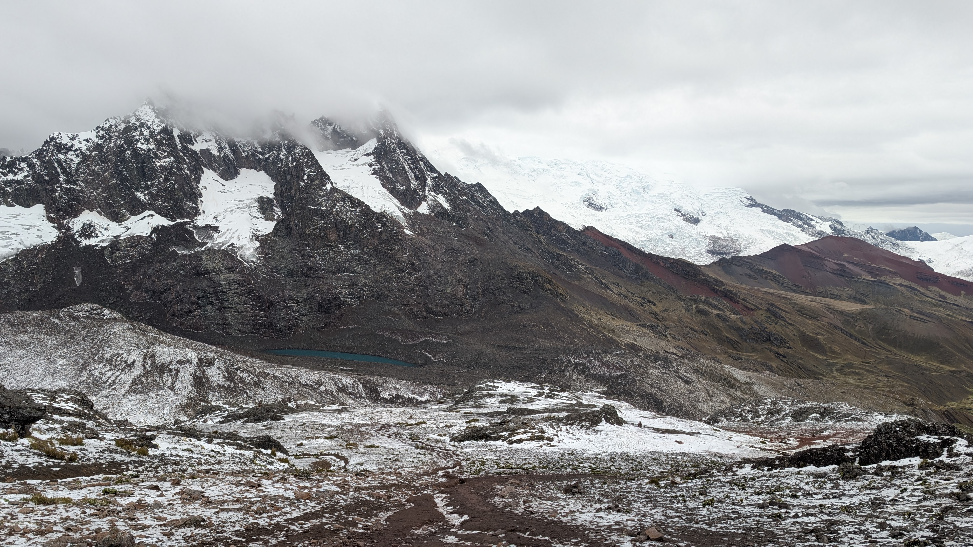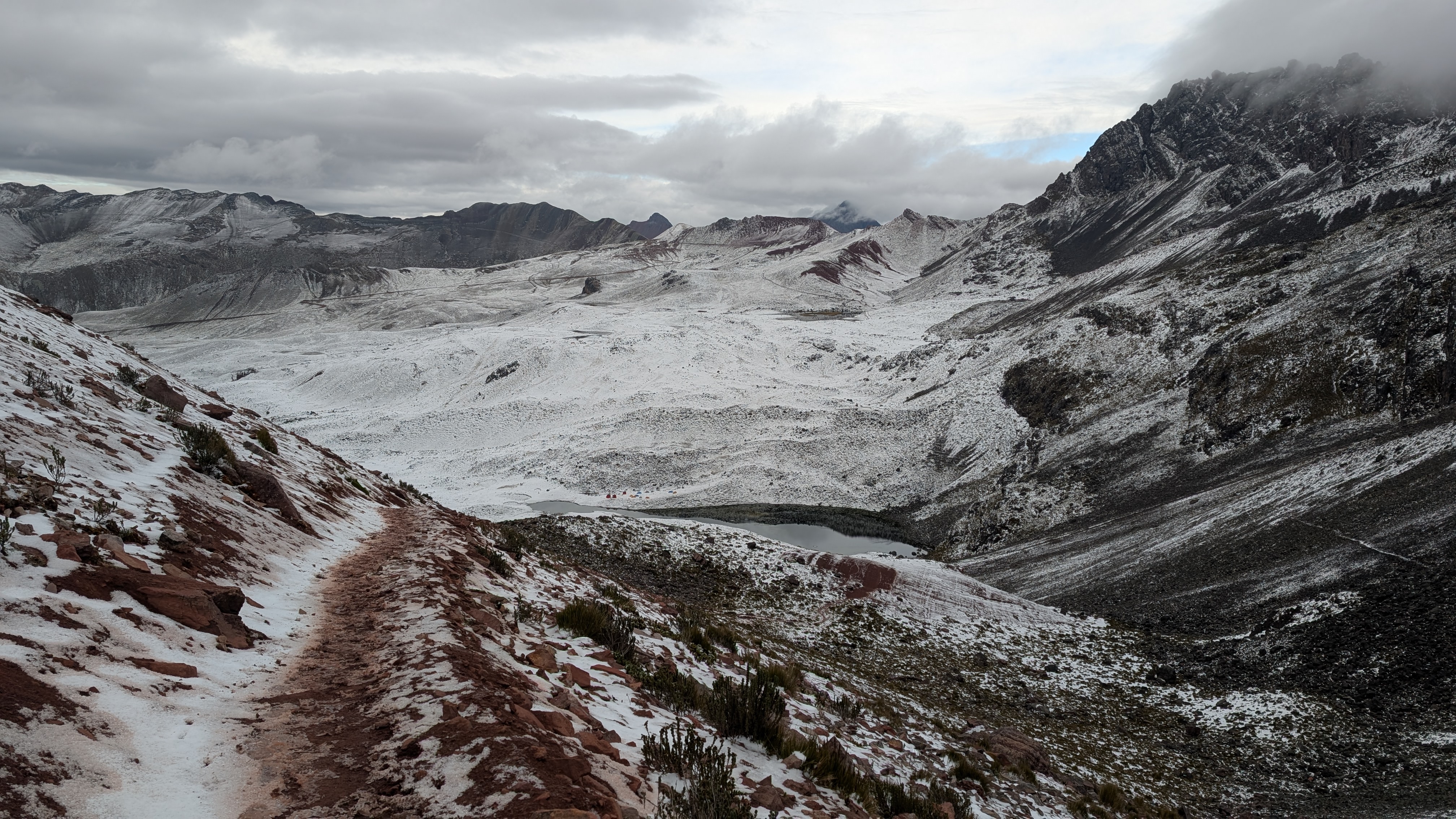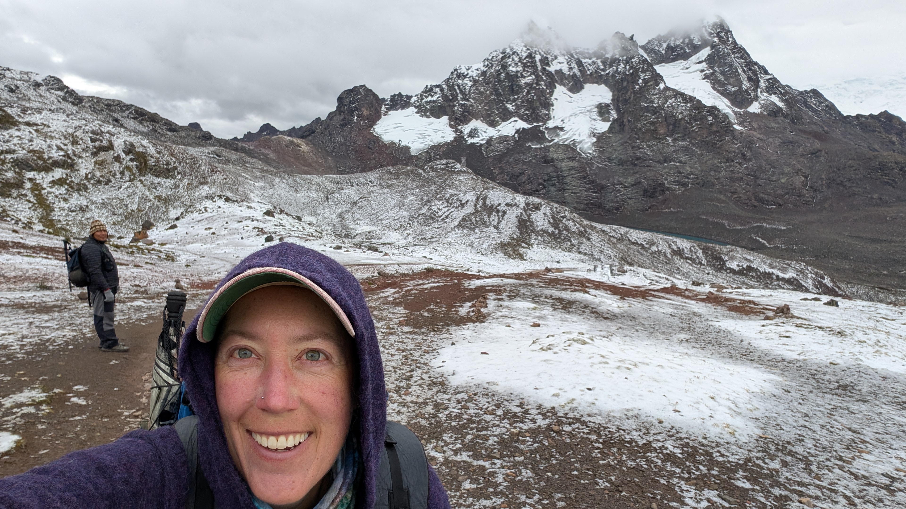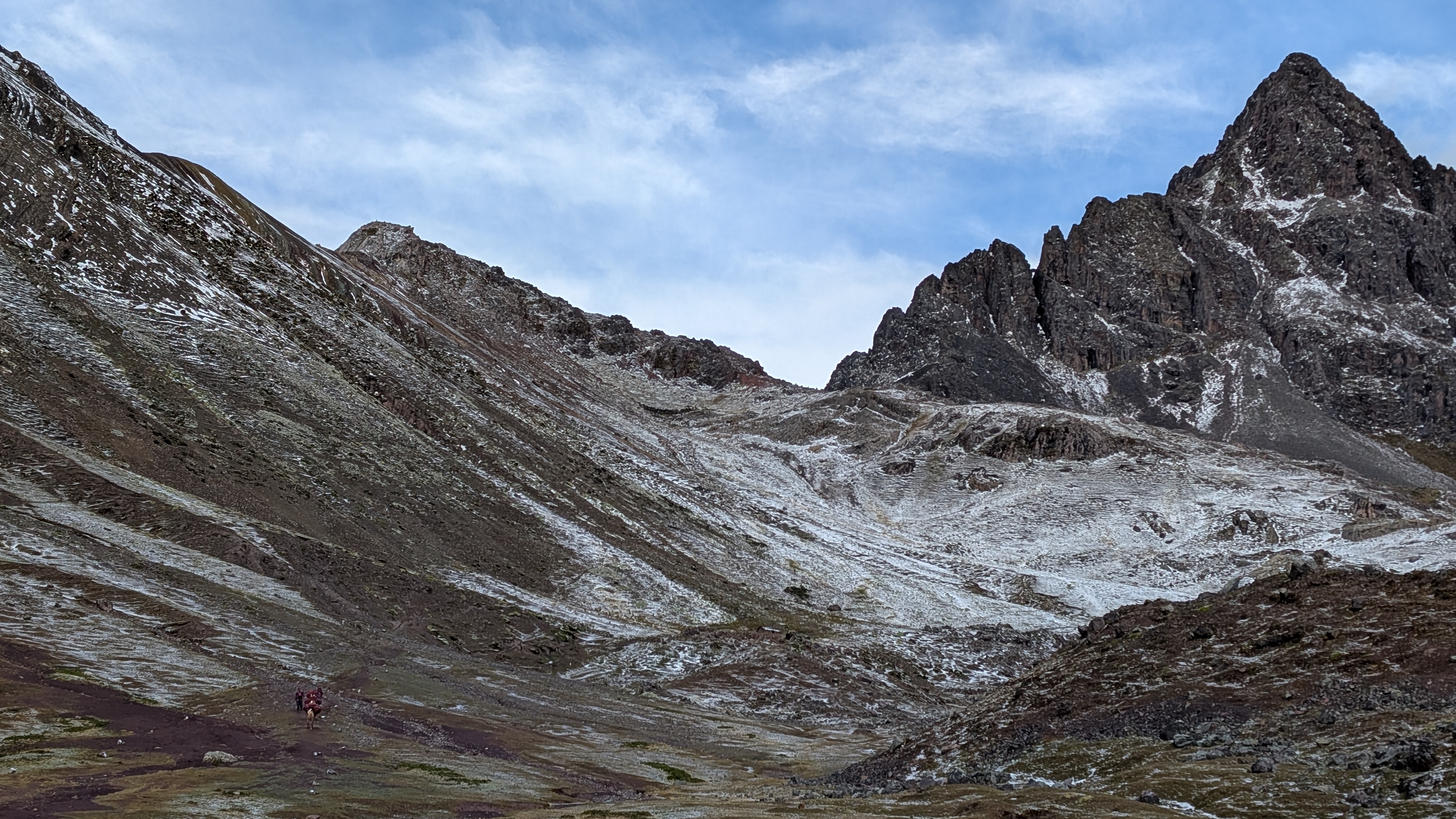 We point ourselves toward Warmisaya Pass and start up the icy trail. I’m very grateful for the added traction provided by my trekking poles but also pay the price with frozen hands. Despite wearing gloves, I can’t feel my fingers. I just bear with the pain knowing that it will eventually kindle into warmth. There’s a couple hikers that approach us on the trail and it looks a lot harder to be going down than up. We top the pass about 7:15 am and there’s a light dusting of hail on the other side too.