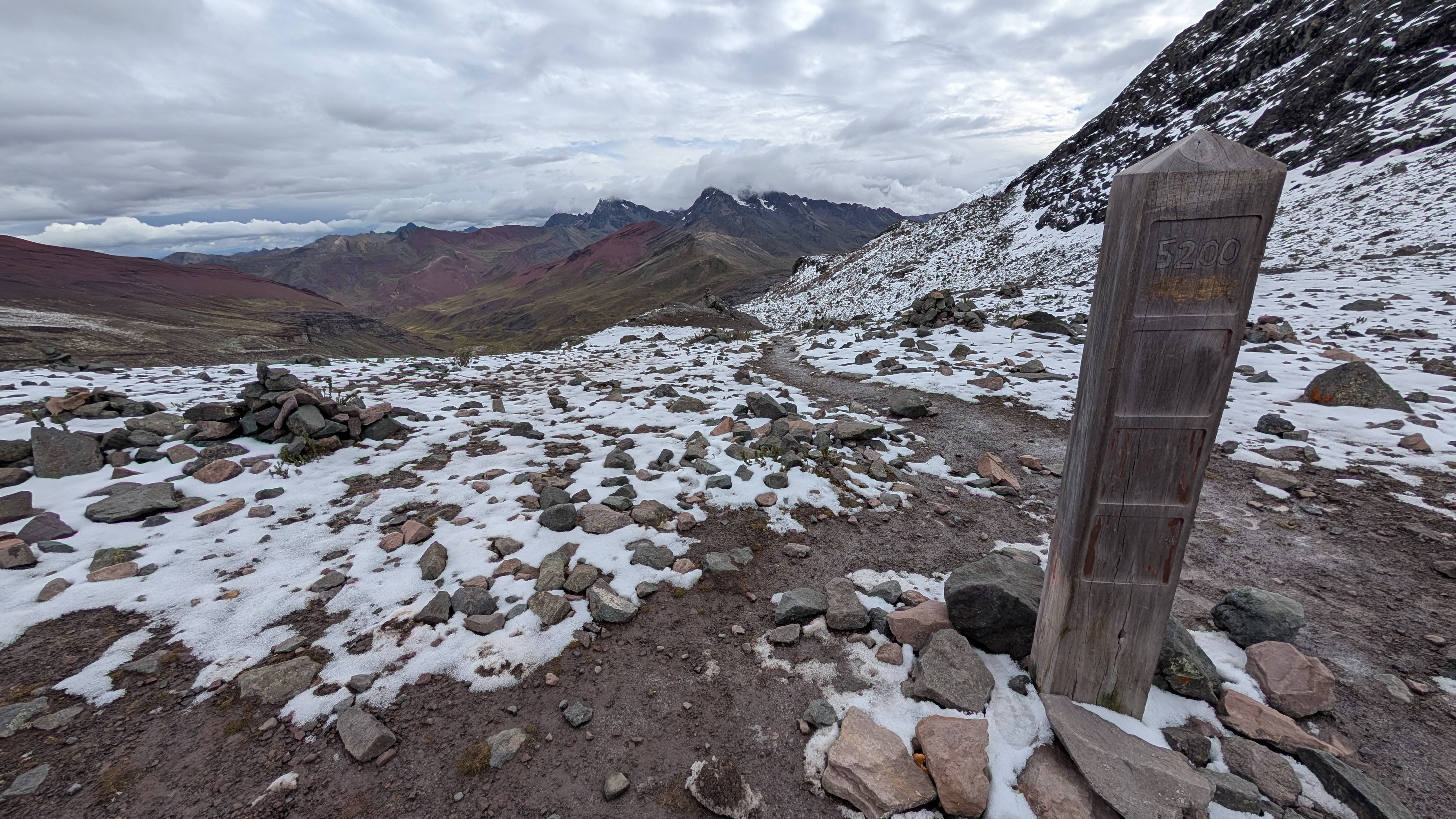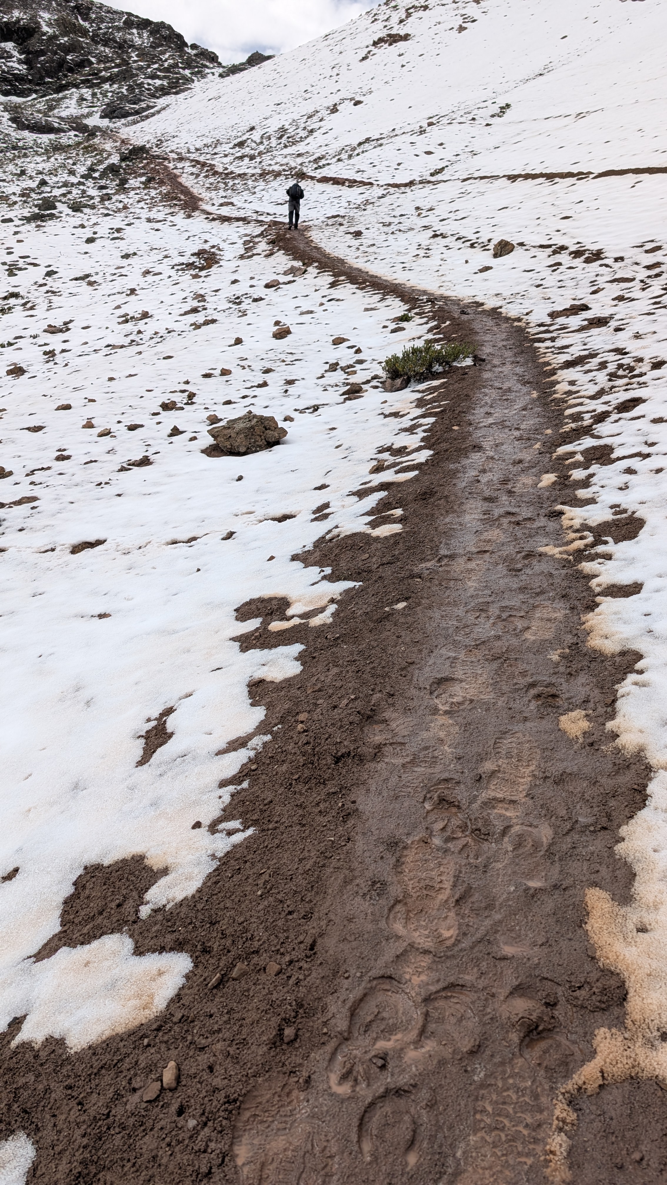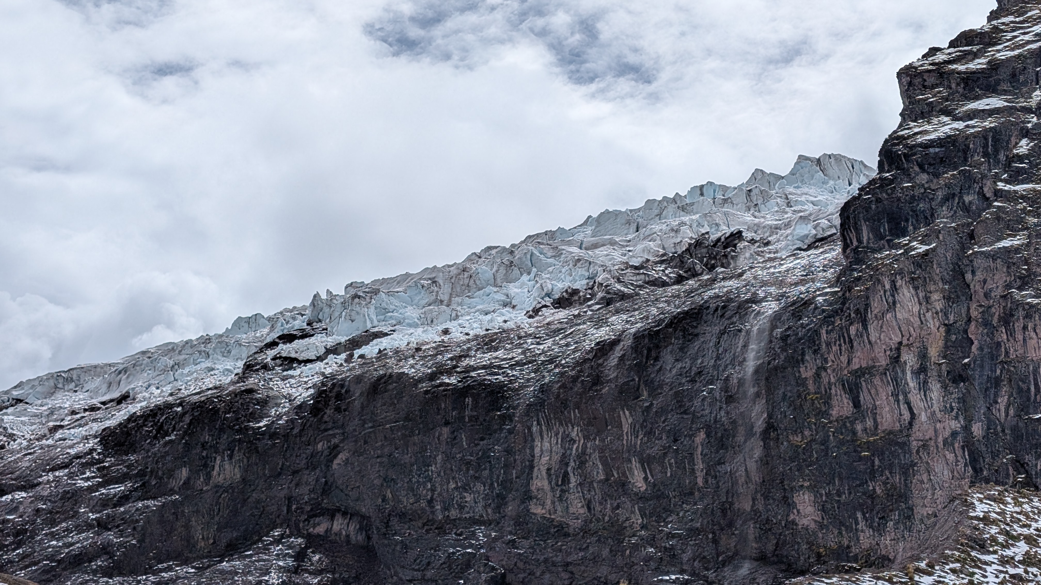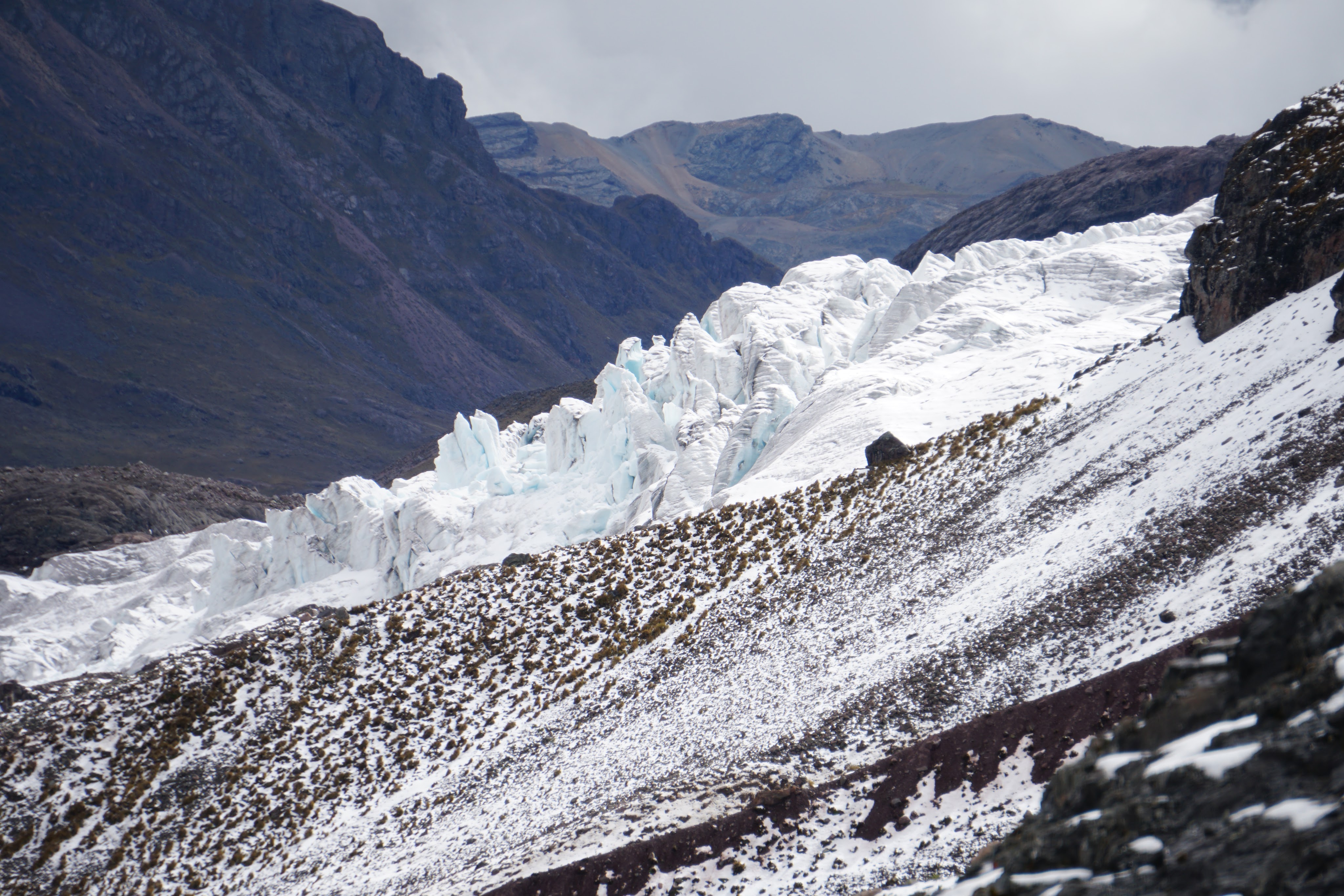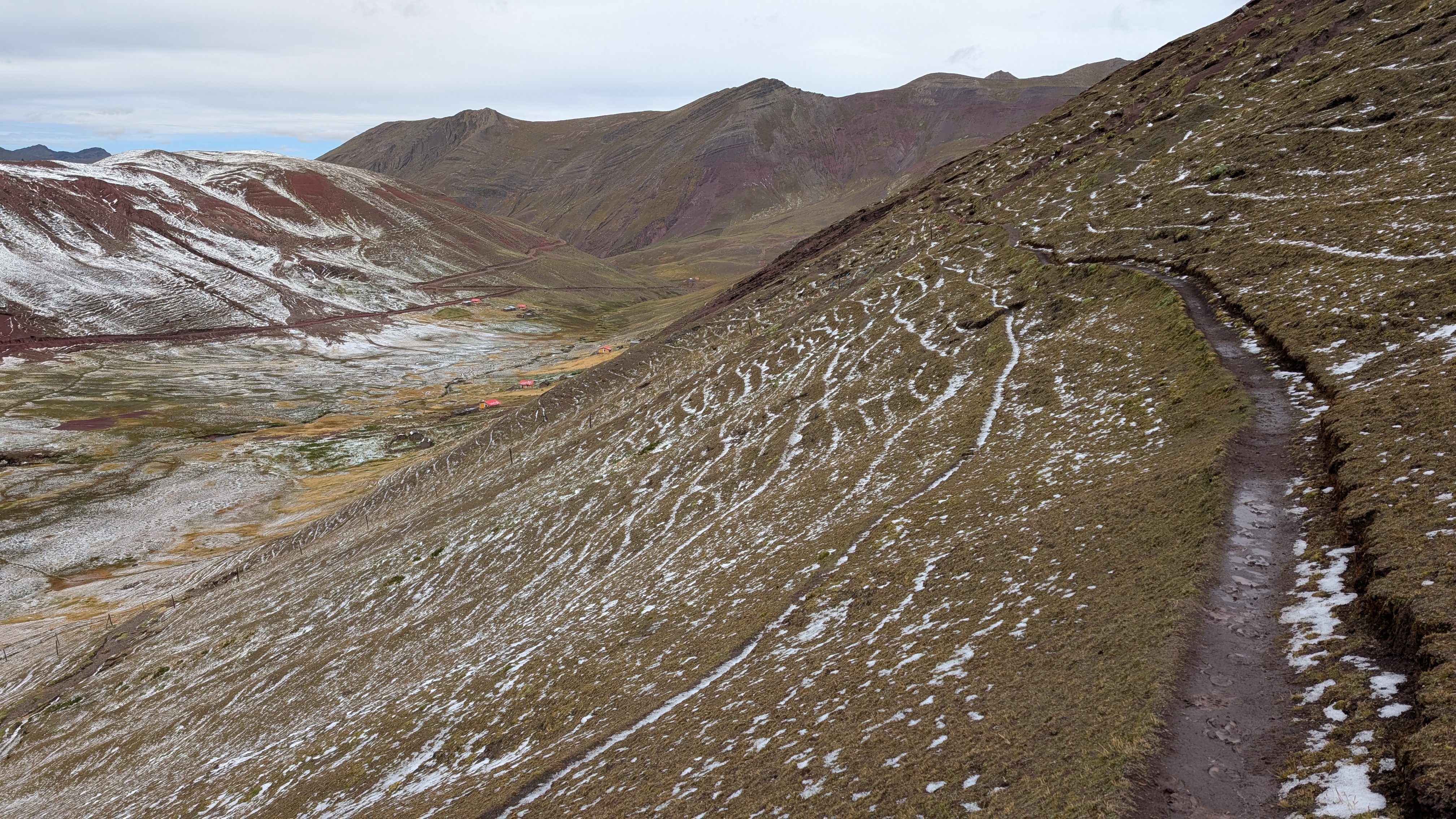 We point ourselves toward Warmisaya Pass and start up the icy trail. I’m very grateful for the added traction provided by my trekking poles but also pay the price with frozen hands. Despite wearing gloves, I can’t feel my fingers. I just bear with the pain knowing that it will eventually kindle into warmth. There’s a couple hikers that approach us on the trail and it looks a lot harder to be going down than up. We top the pass about 7:15 am and there’s a light dusting of hail on the other side too.
