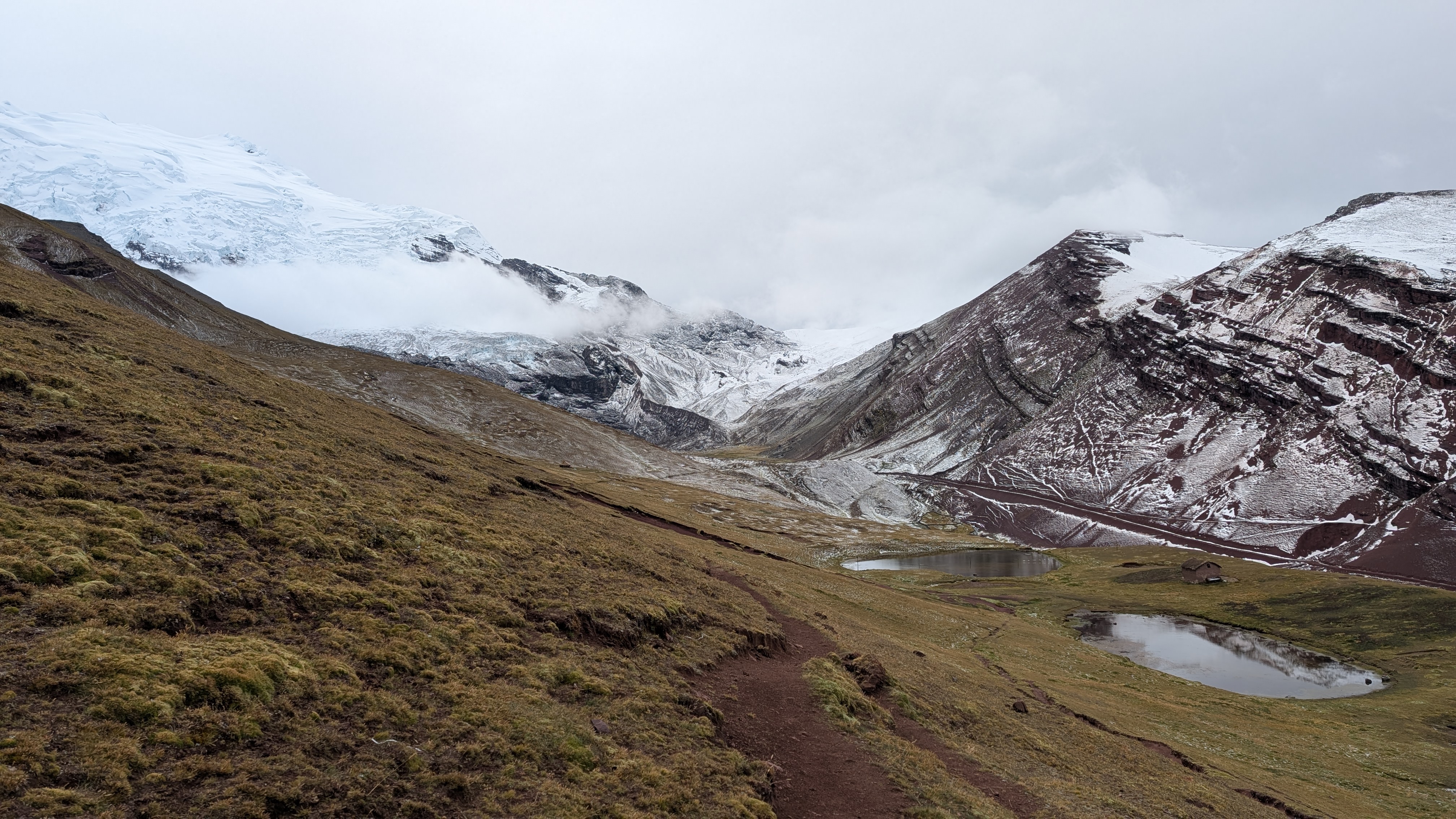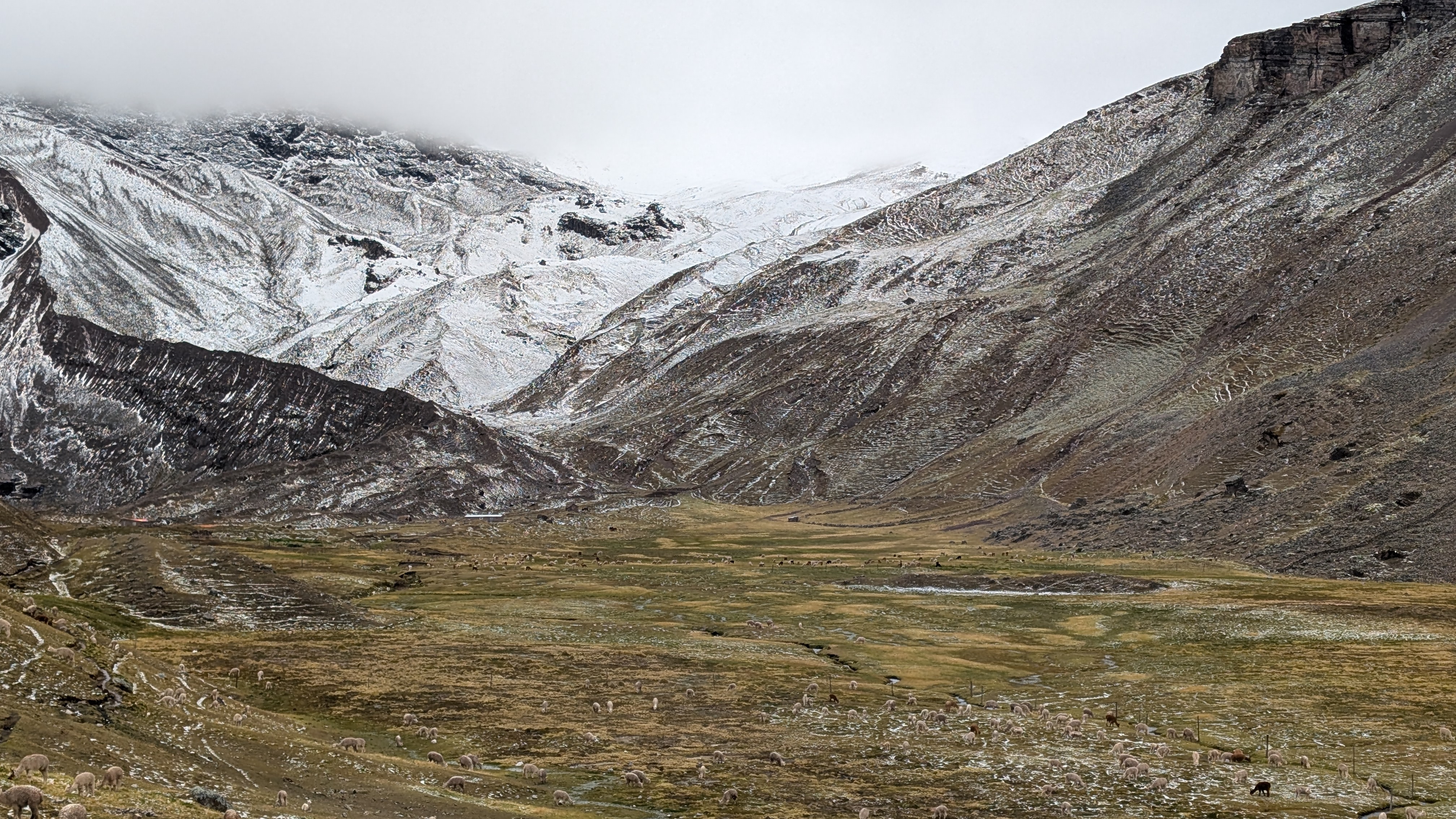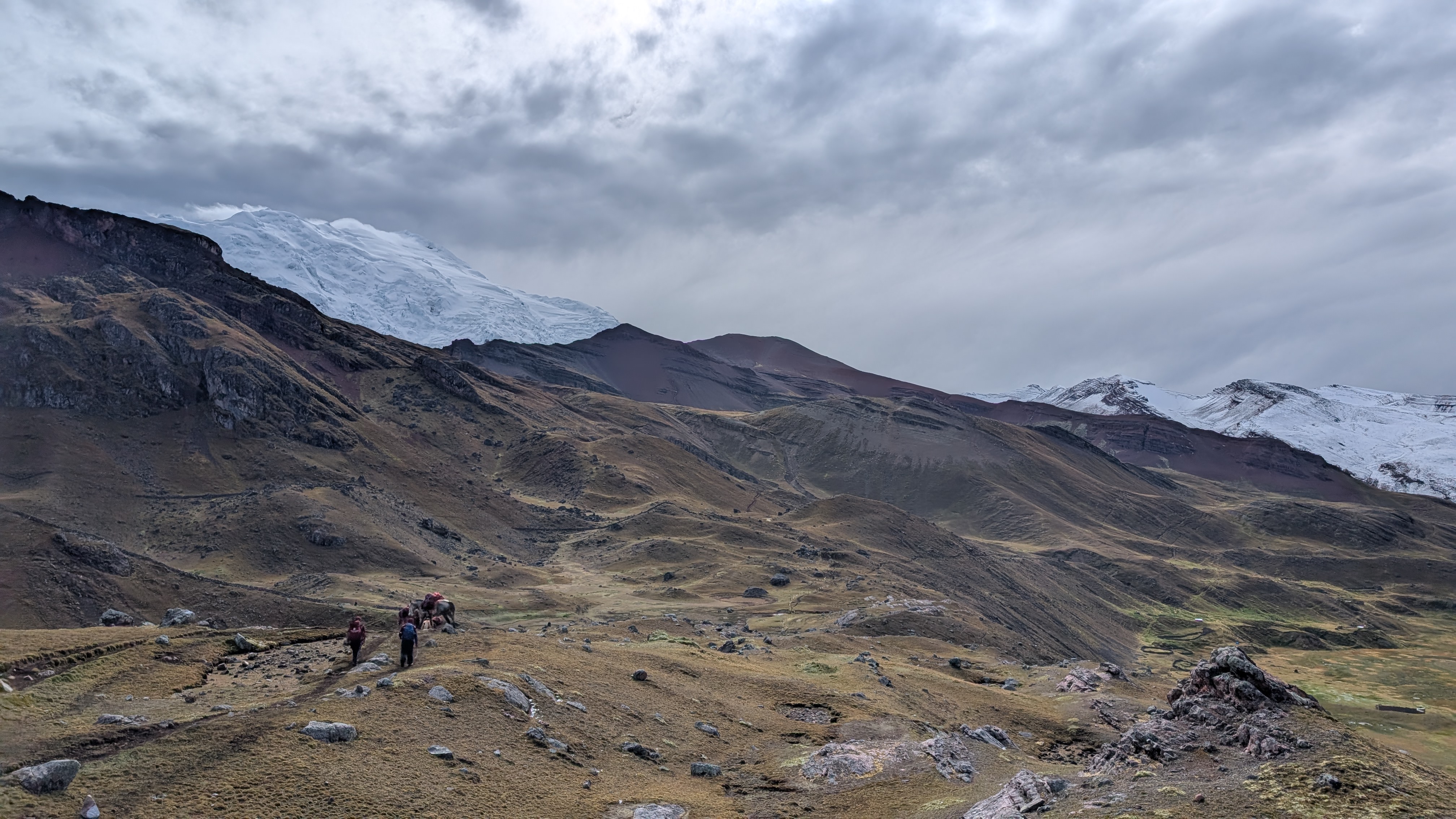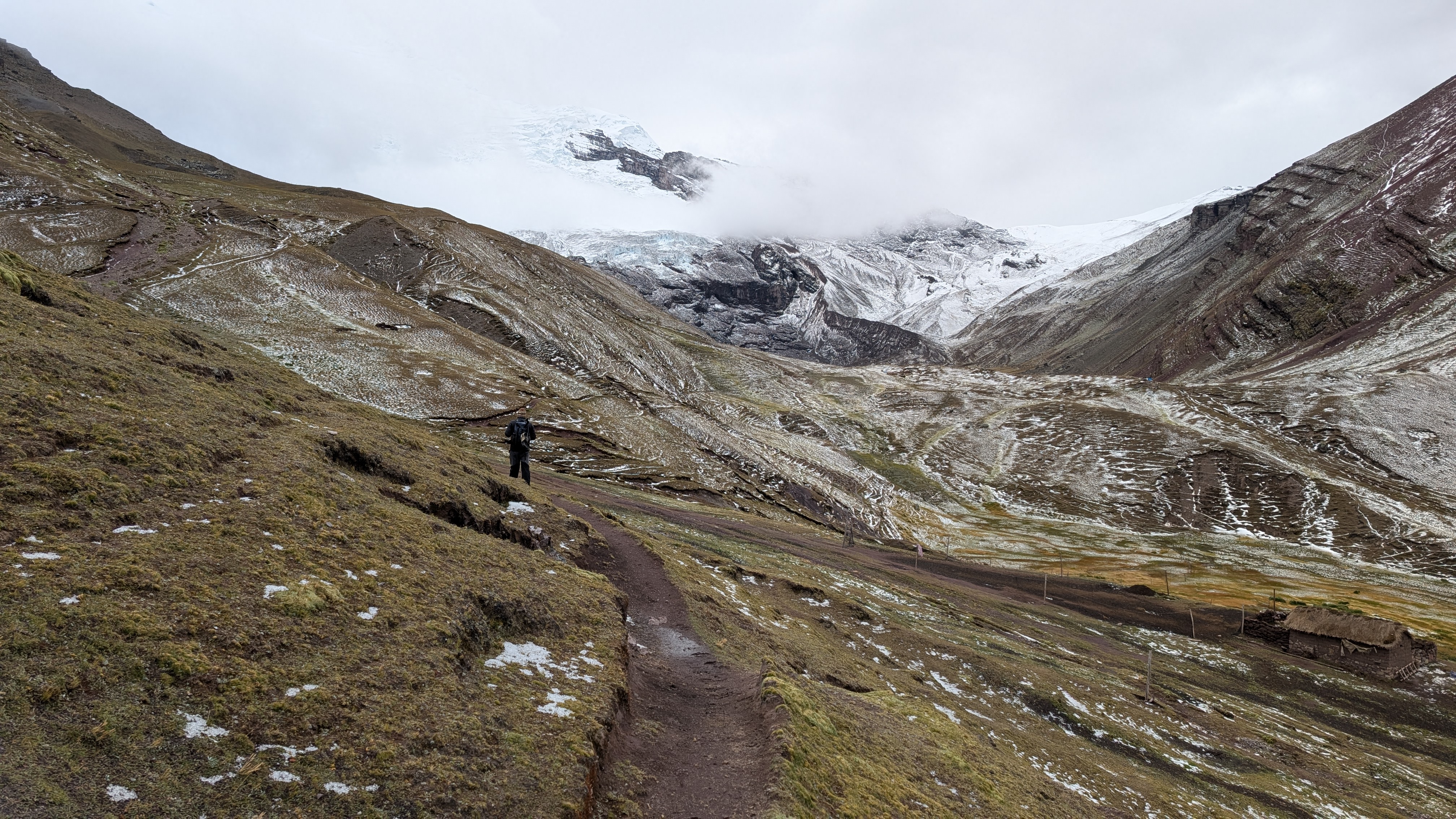 About 9:30 am, Ronnie and I stop in the middle of the vast Alcatauri Gorge. The hillside is filled with what must be alpaca trails and some of them form a flat ledge which makes a perfect spot to sit for a break. Any hope for the sun has diminished and the cloudy cold hangs around us. We hike another 15 minutes before the trail curves left around the hillside and we point ourselves back towards Apu Ausangate and up a new valley.
