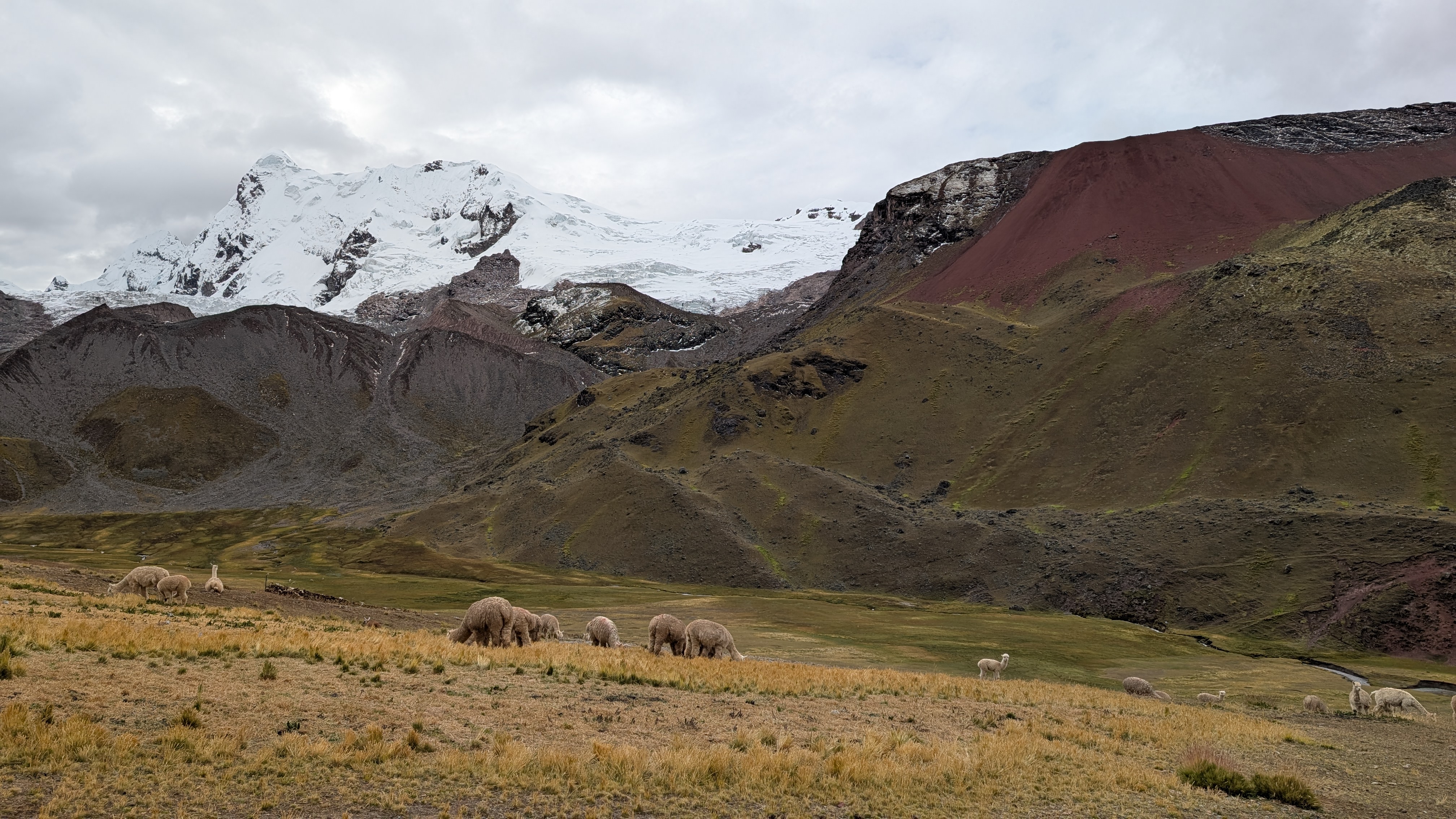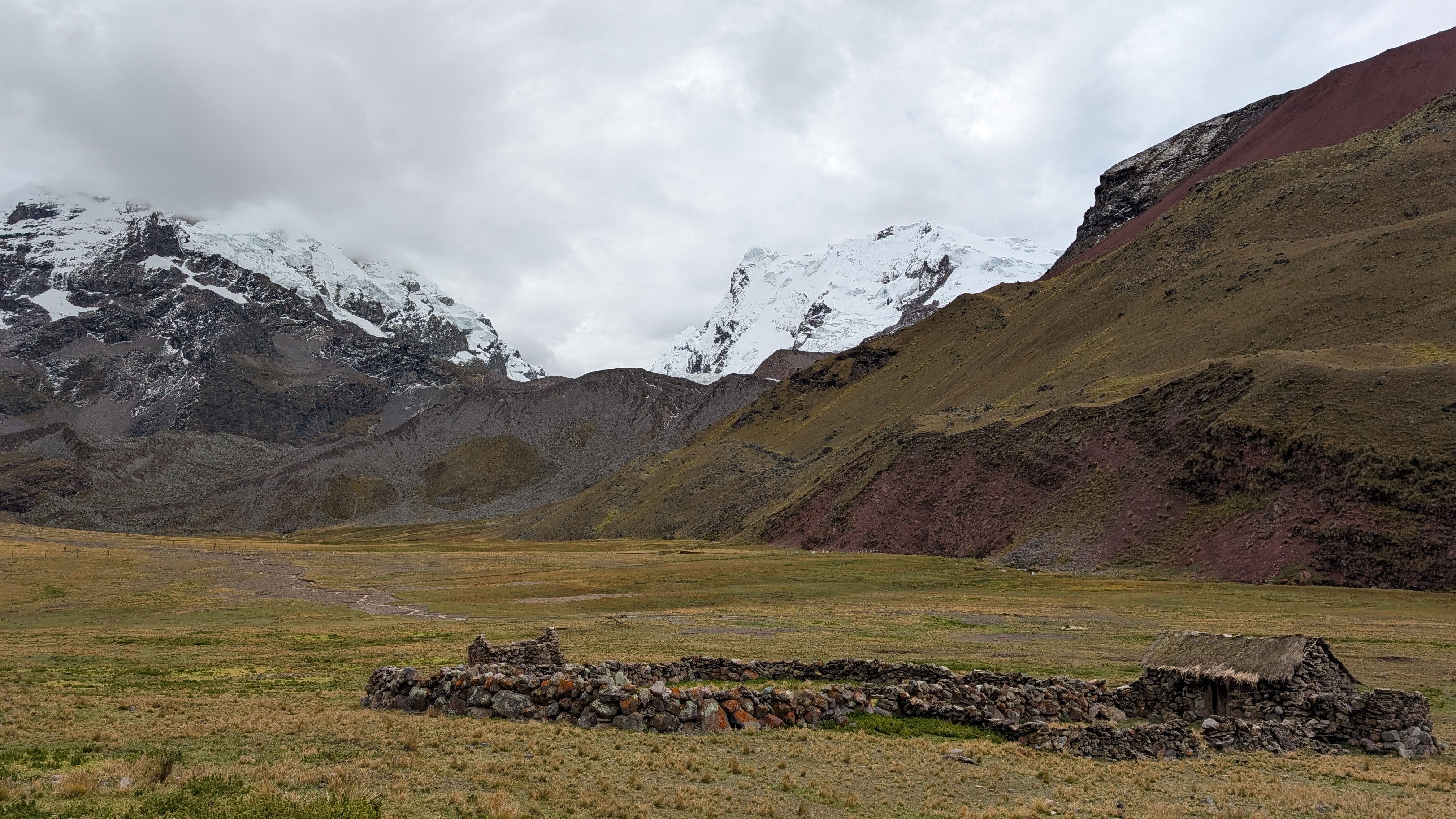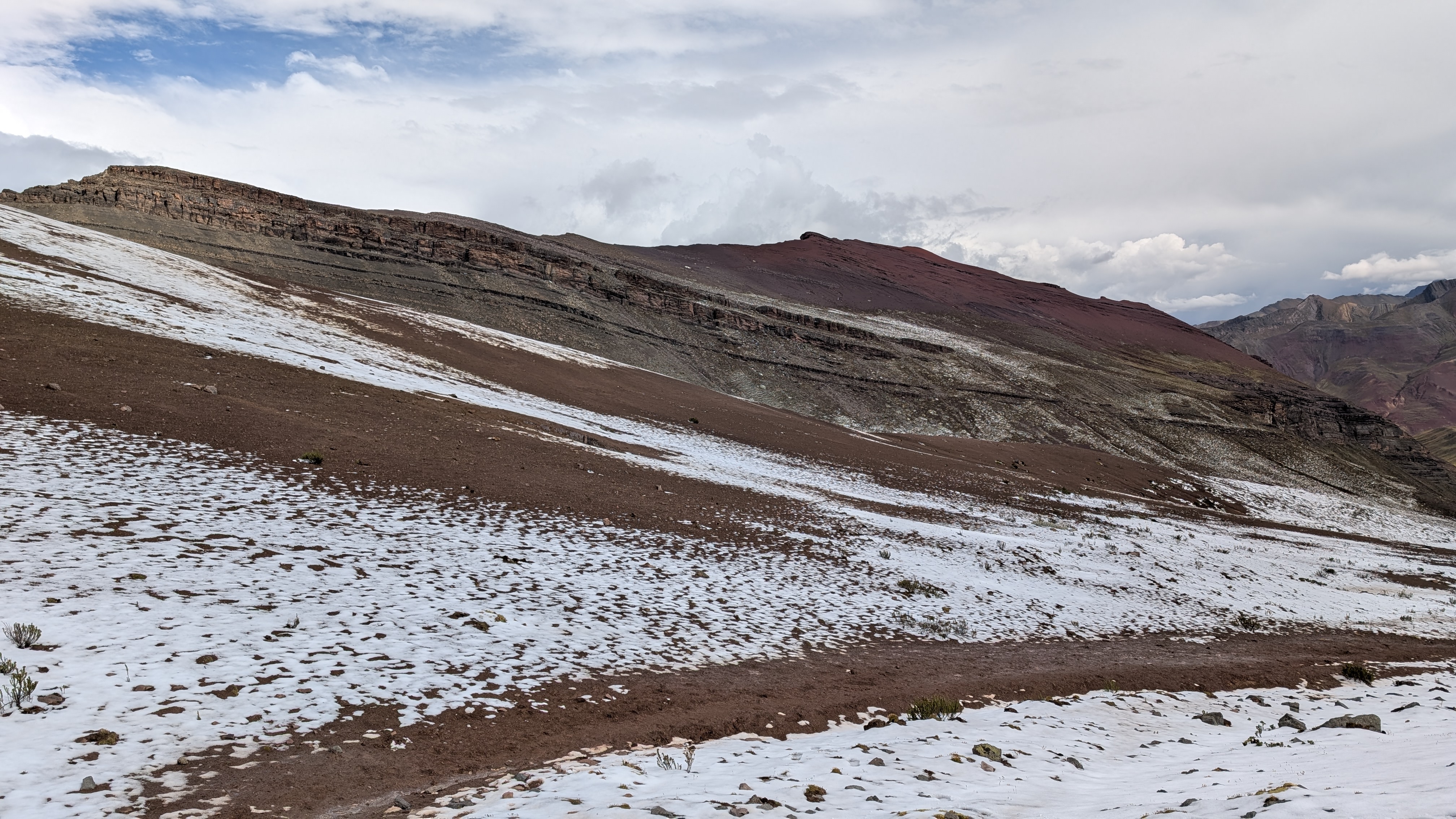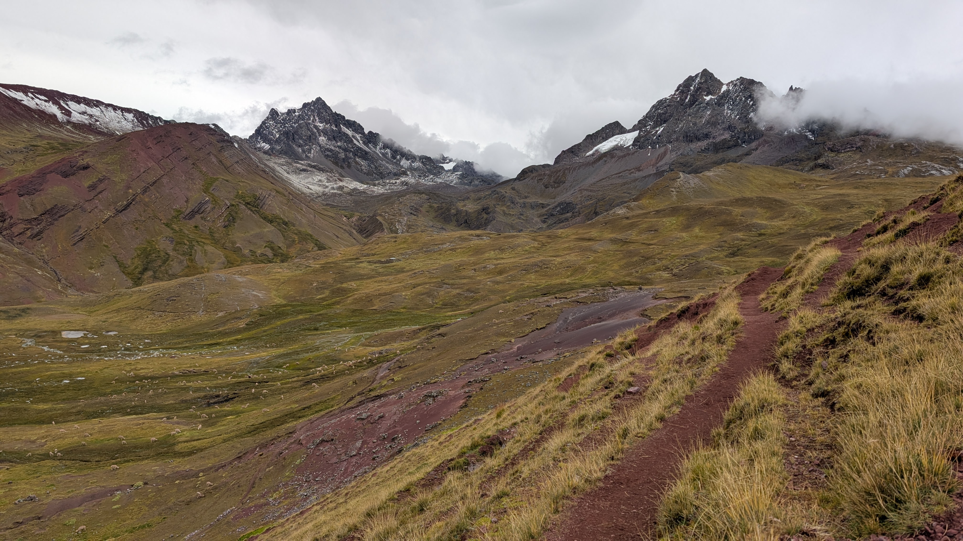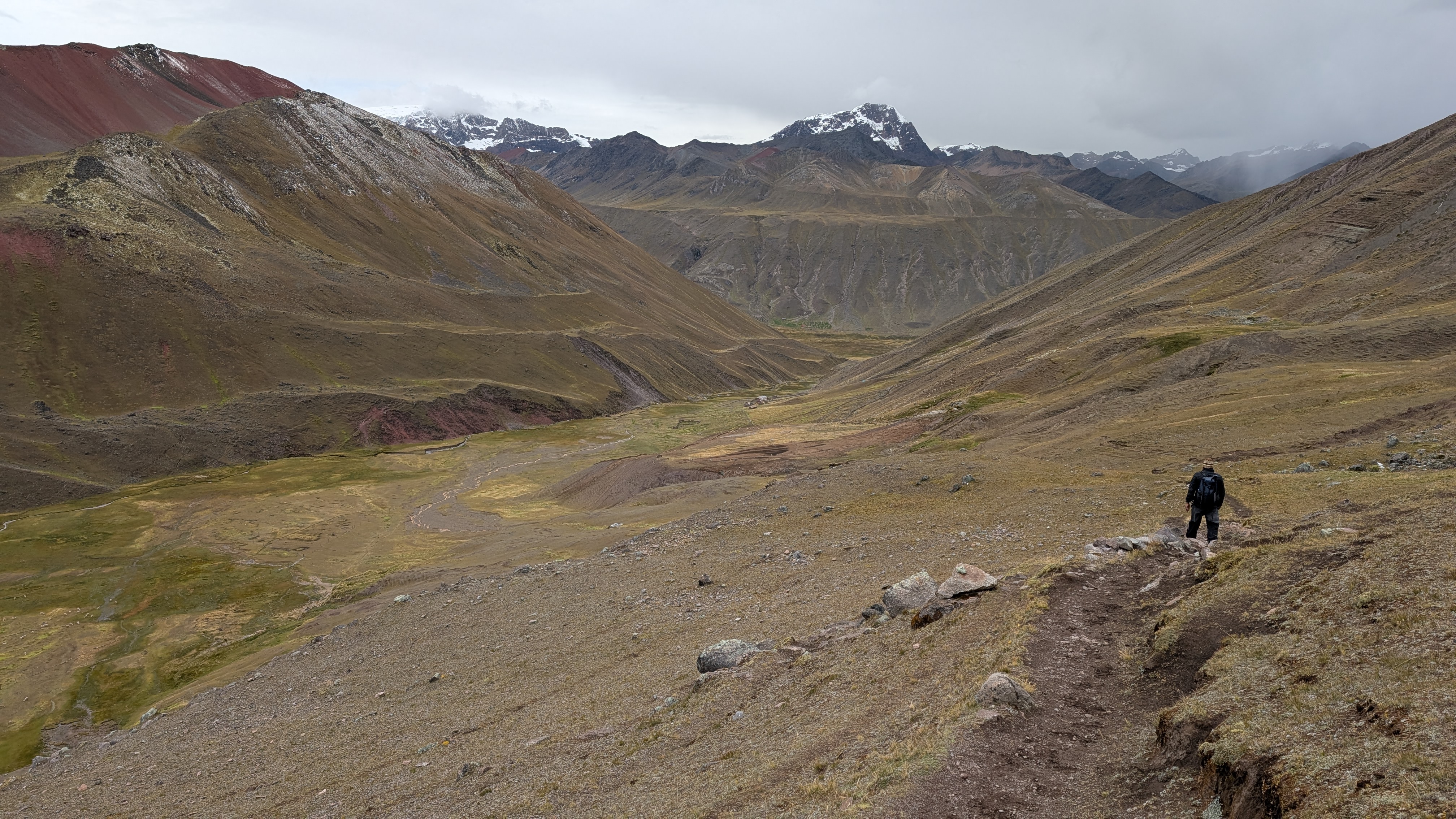 About 9:30 am, Ronnie and I stop in the middle of the vast Alcatauri Gorge. The hillside is filled with what must be alpaca trails and some of them form a flat ledge which makes a perfect spot to sit for a break. Any hope for the sun has diminished and the cloudy cold hangs around us. We hike another 15 minutes before the trail curves left around the hillside and we point ourselves back towards Apu Ausangate and up a new valley.