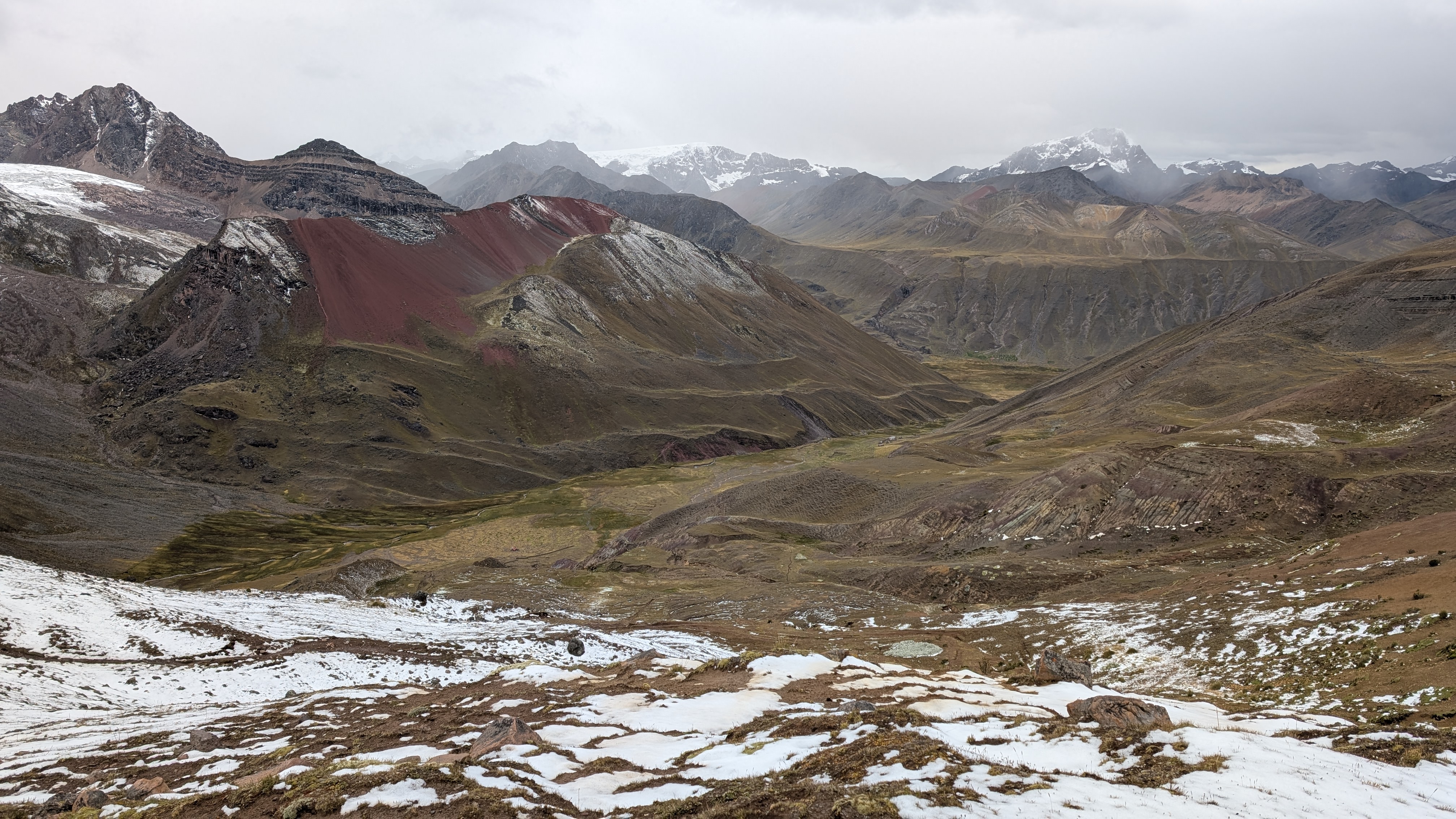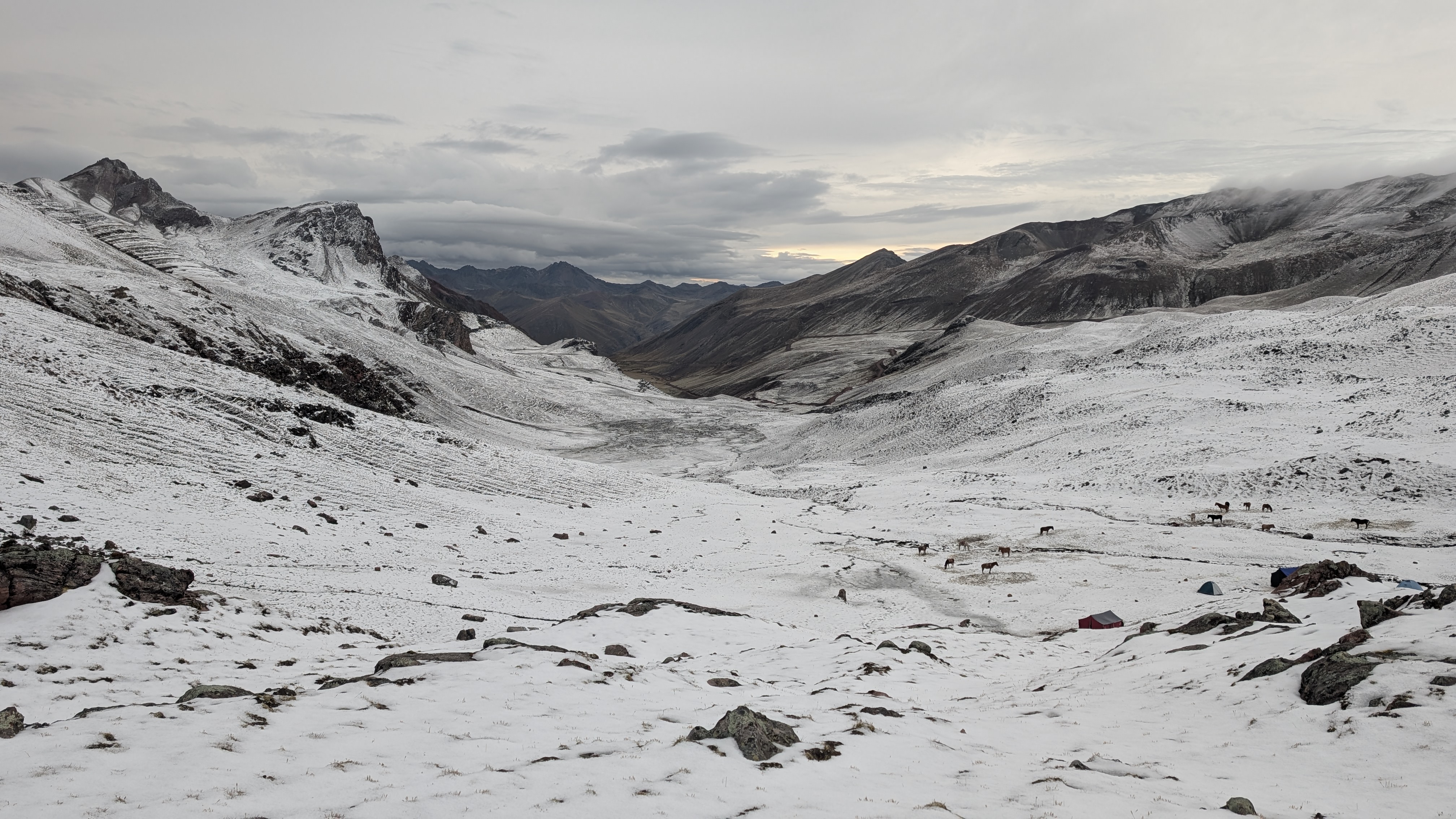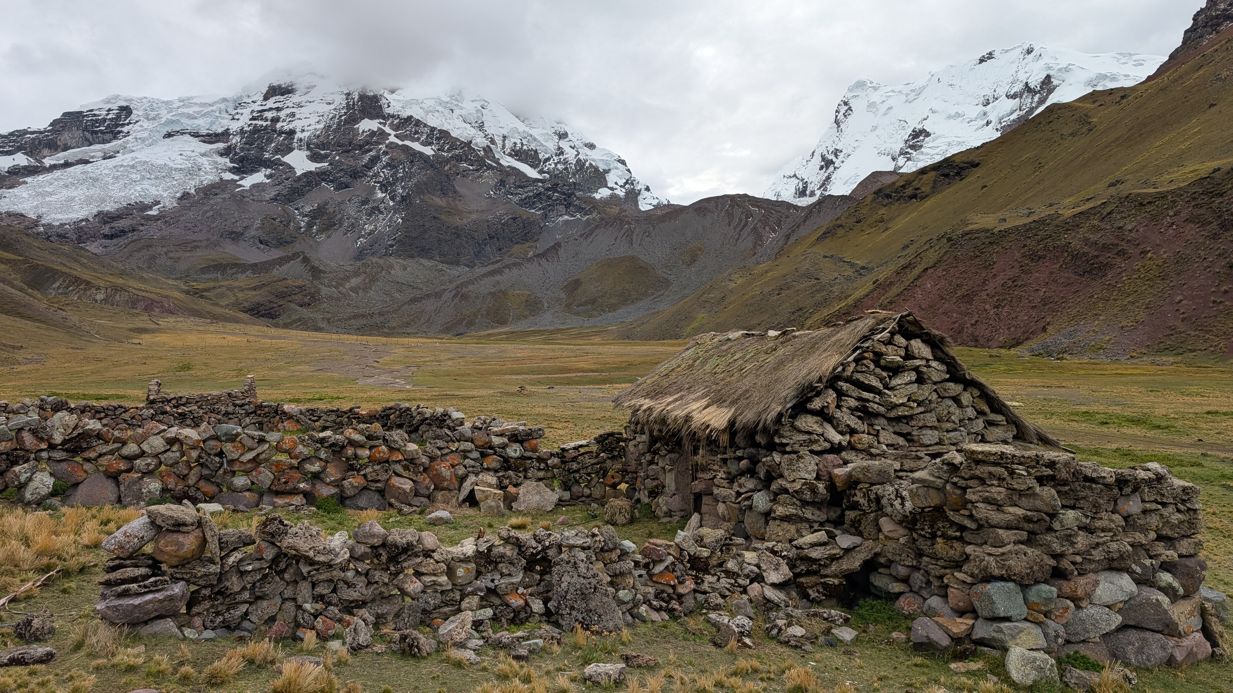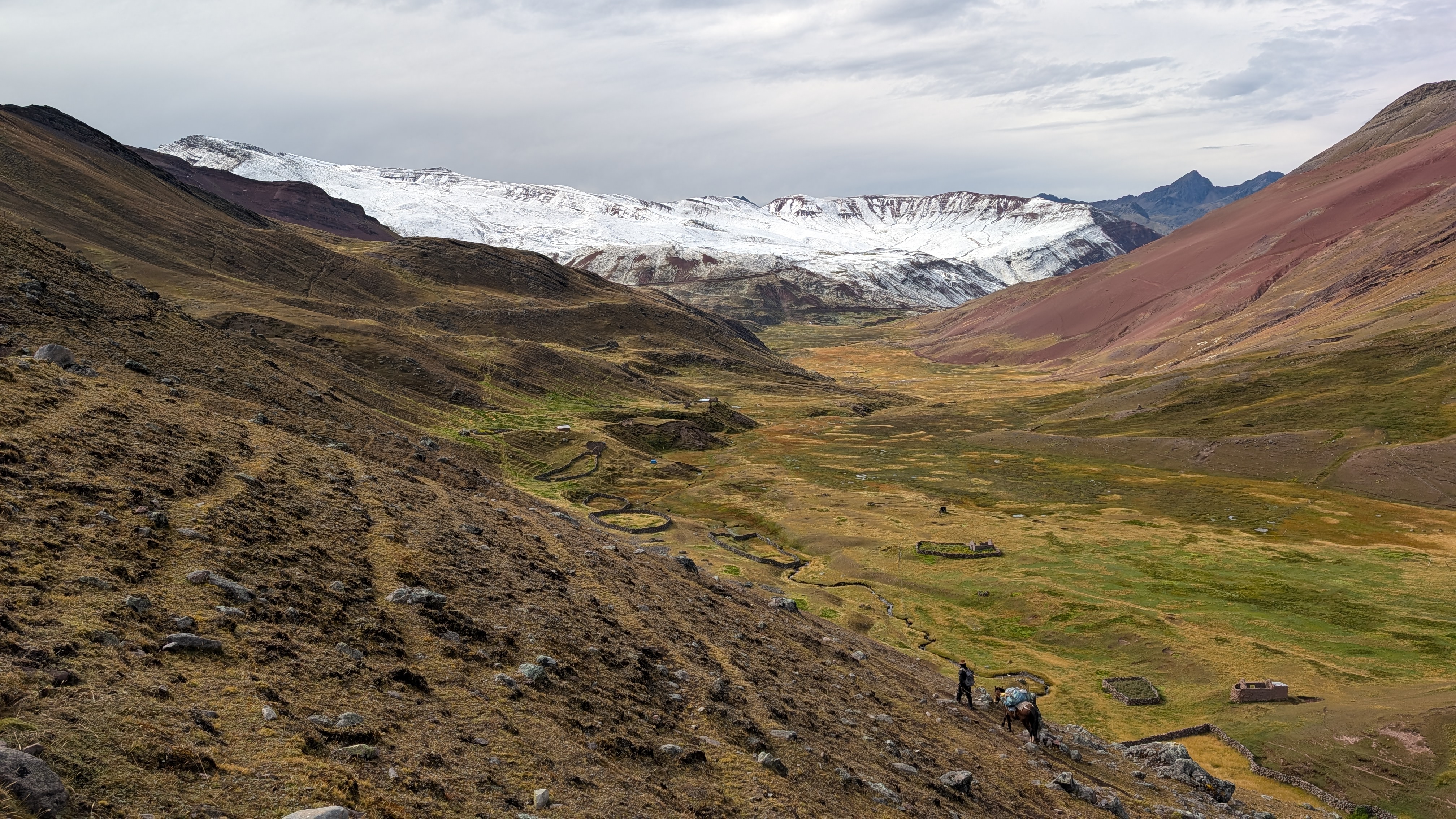 About 9:30 am, Ronnie and I stop in the middle of the vast Alcatauri Gorge. The hillside is filled with what must be alpaca trails and some of them form a flat ledge which makes a perfect spot to sit for a break. Any hope for the sun has diminished and the cloudy cold hangs around us. We hike another 15 minutes before the trail curves left around the hillside and we point ourselves back towards Apu Ausangate and up a new valley.