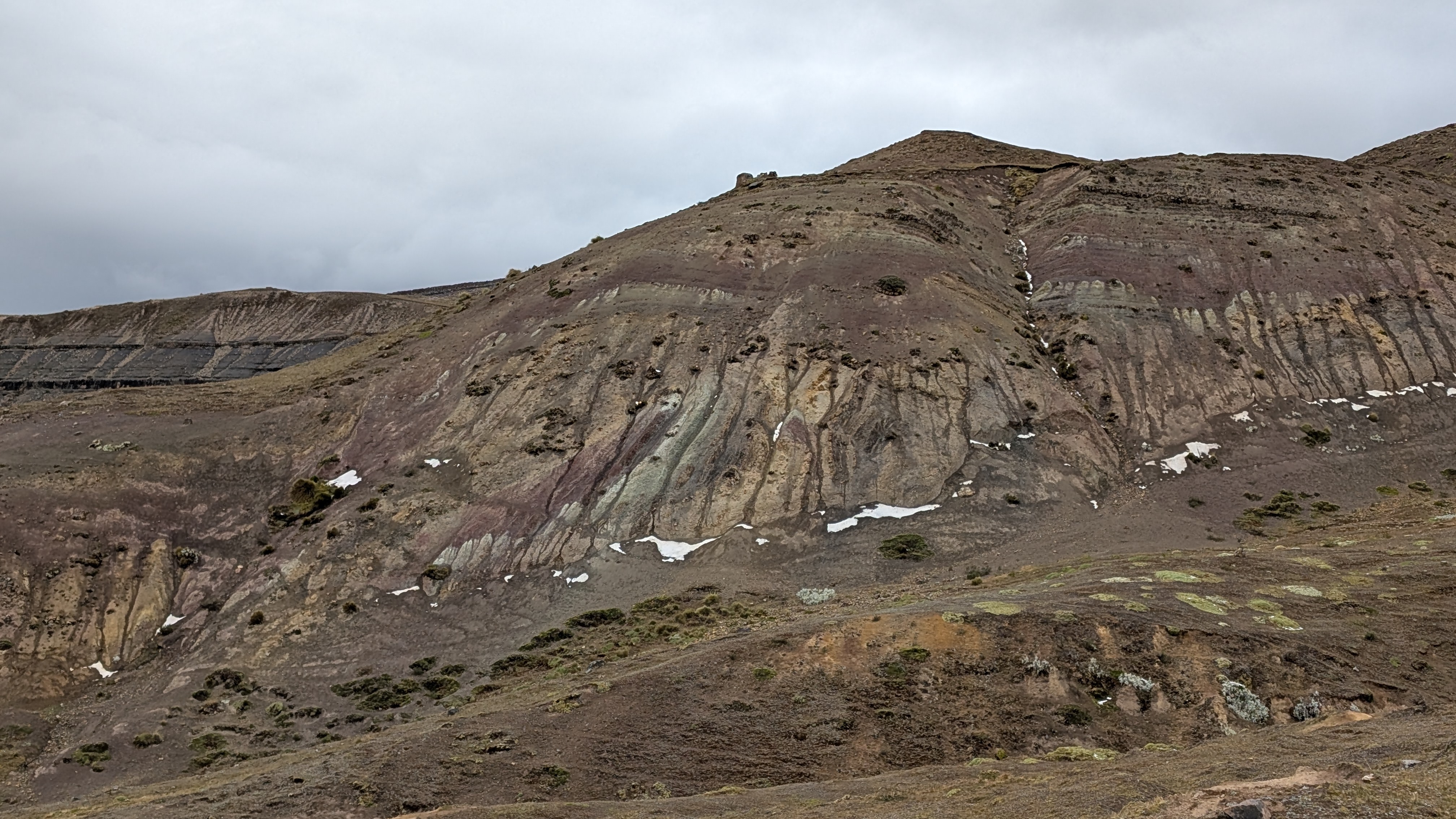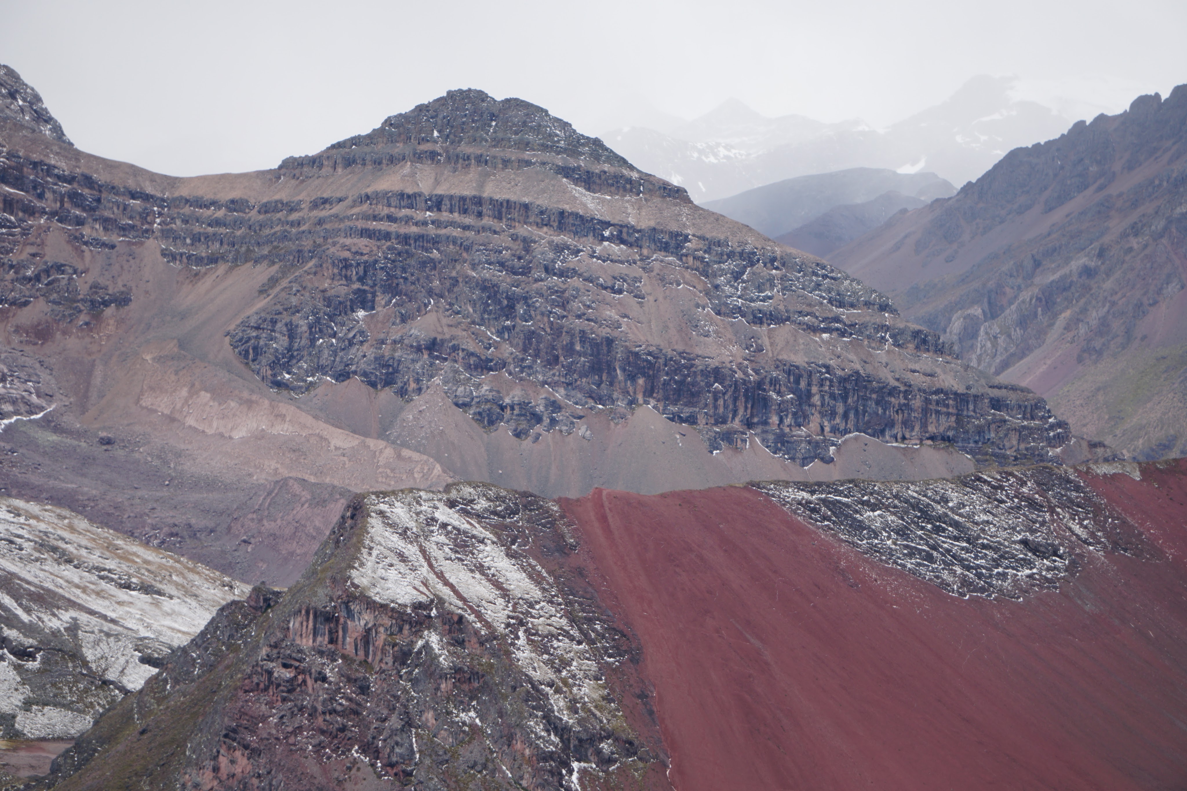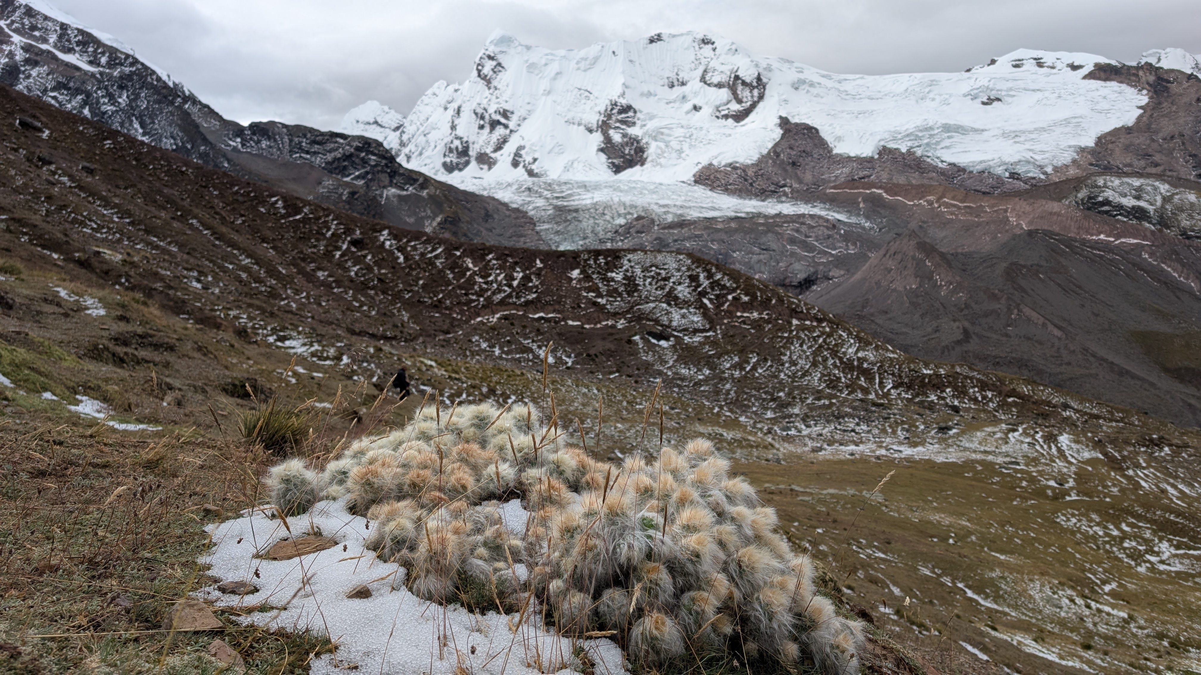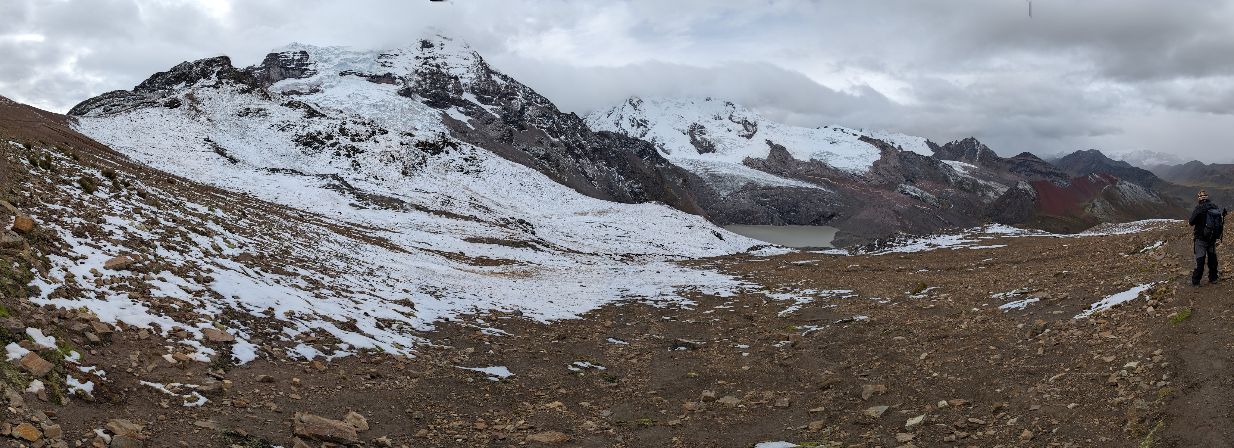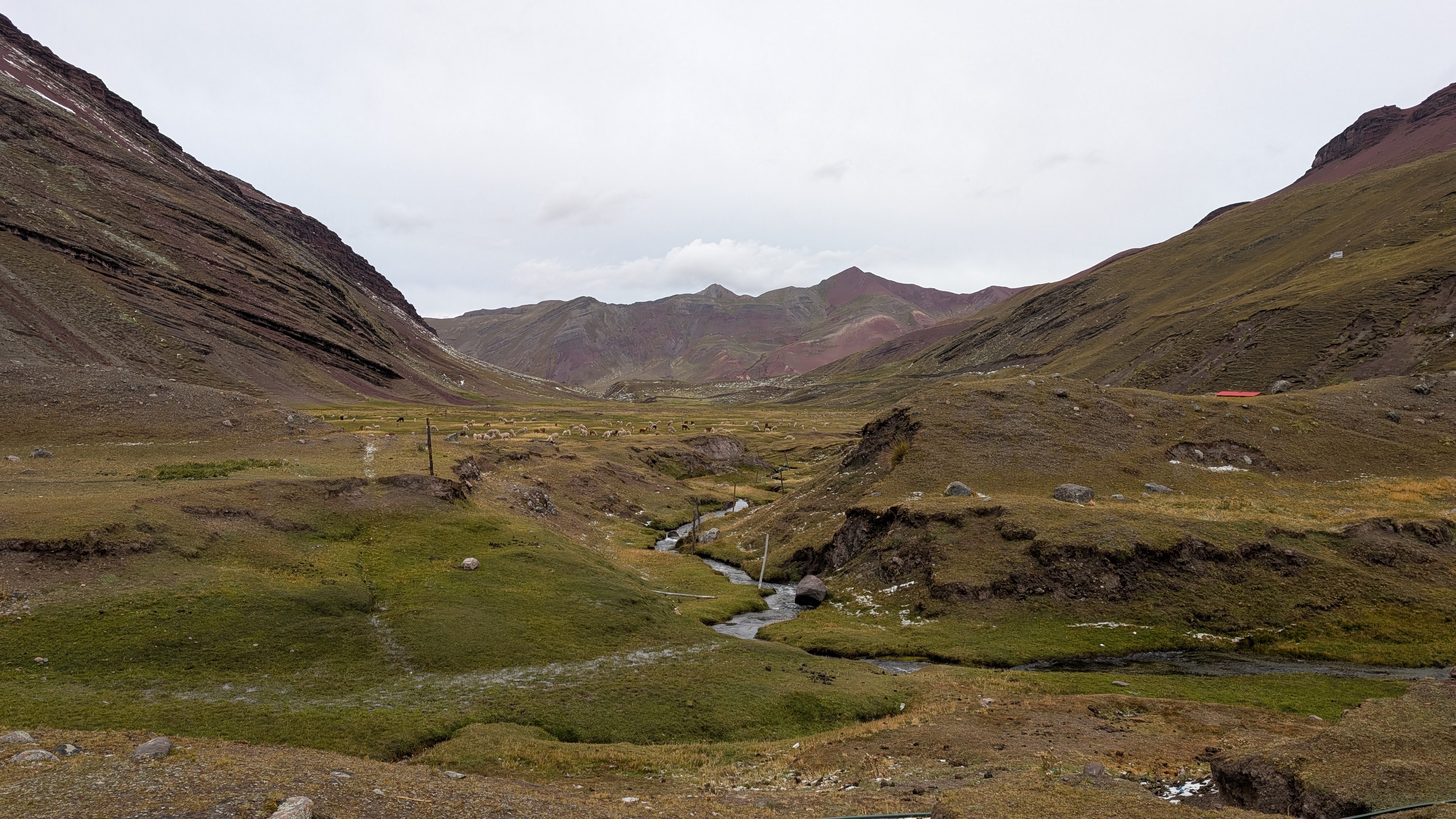 About 9:30 am, Ronnie and I stop in the middle of the vast Alcatauri Gorge. The hillside is filled with what must be alpaca trails and some of them form a flat ledge which makes a perfect spot to sit for a break. Any hope for the sun has diminished and the cloudy cold hangs around us. We hike another 15 minutes before the trail curves left around the hillside and we point ourselves back towards Apu Ausangate and up a new valley.