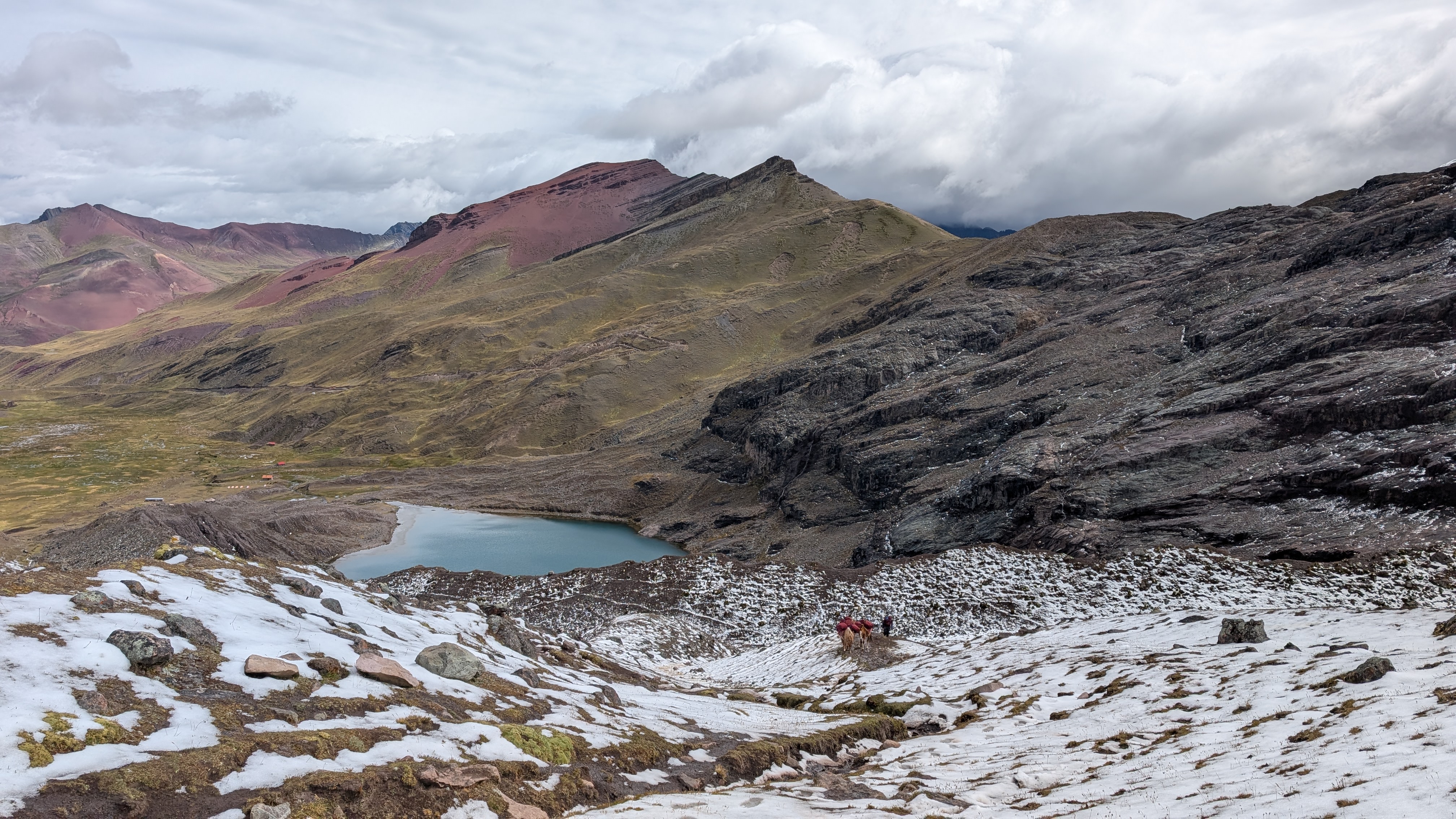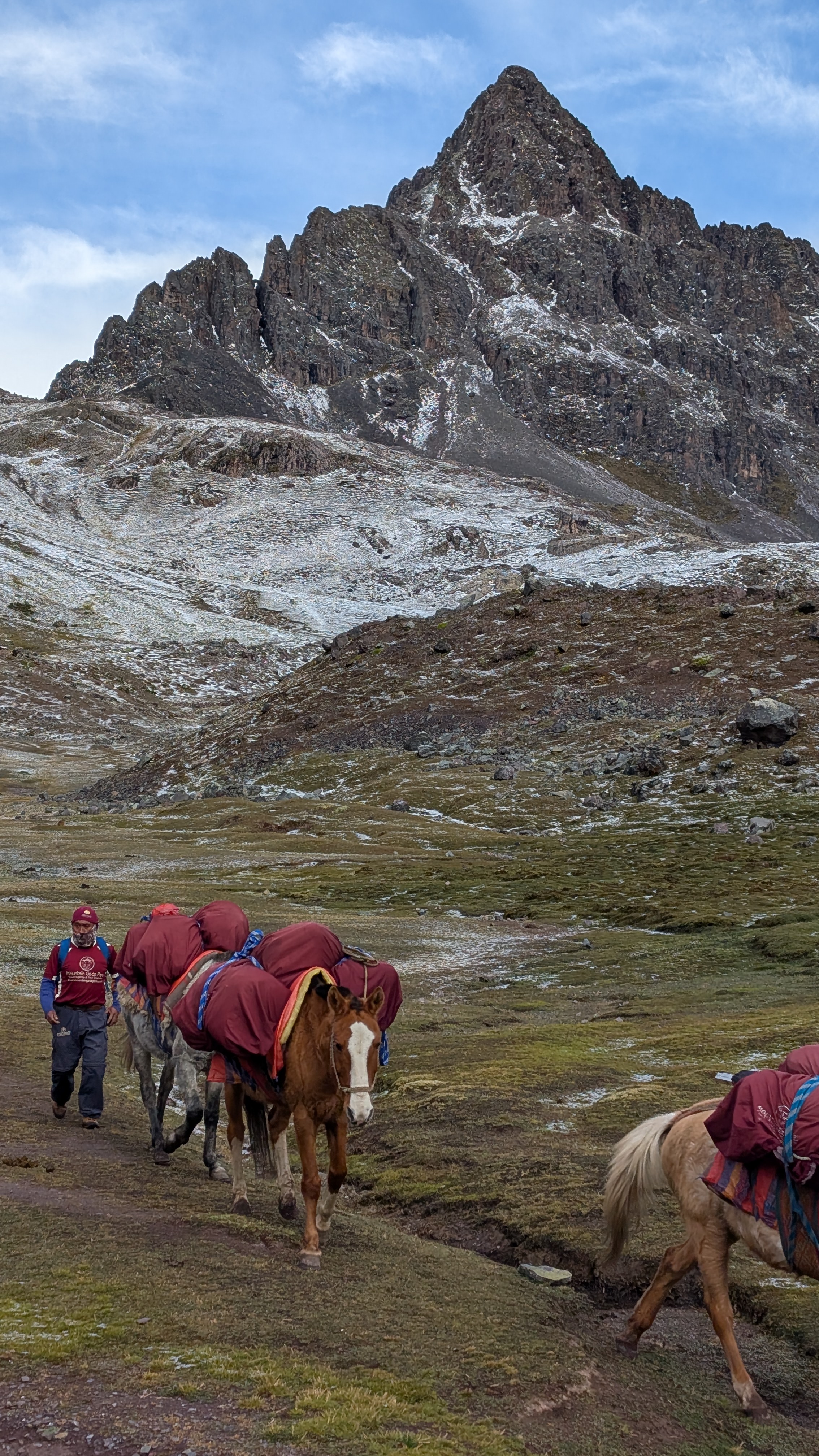 We slowly make our way up above Ausangate Lake on a sort of switchback trail. Ronnie comments about the danger if there is a large rock fall or glacier calving into the lake which would displace a deadly amount of water onto the small community where we just had lunch. The Mountain Gods Peru team approaches and passes us at about 1 pm. Wow, they are super fast on the clean-up and repacking!