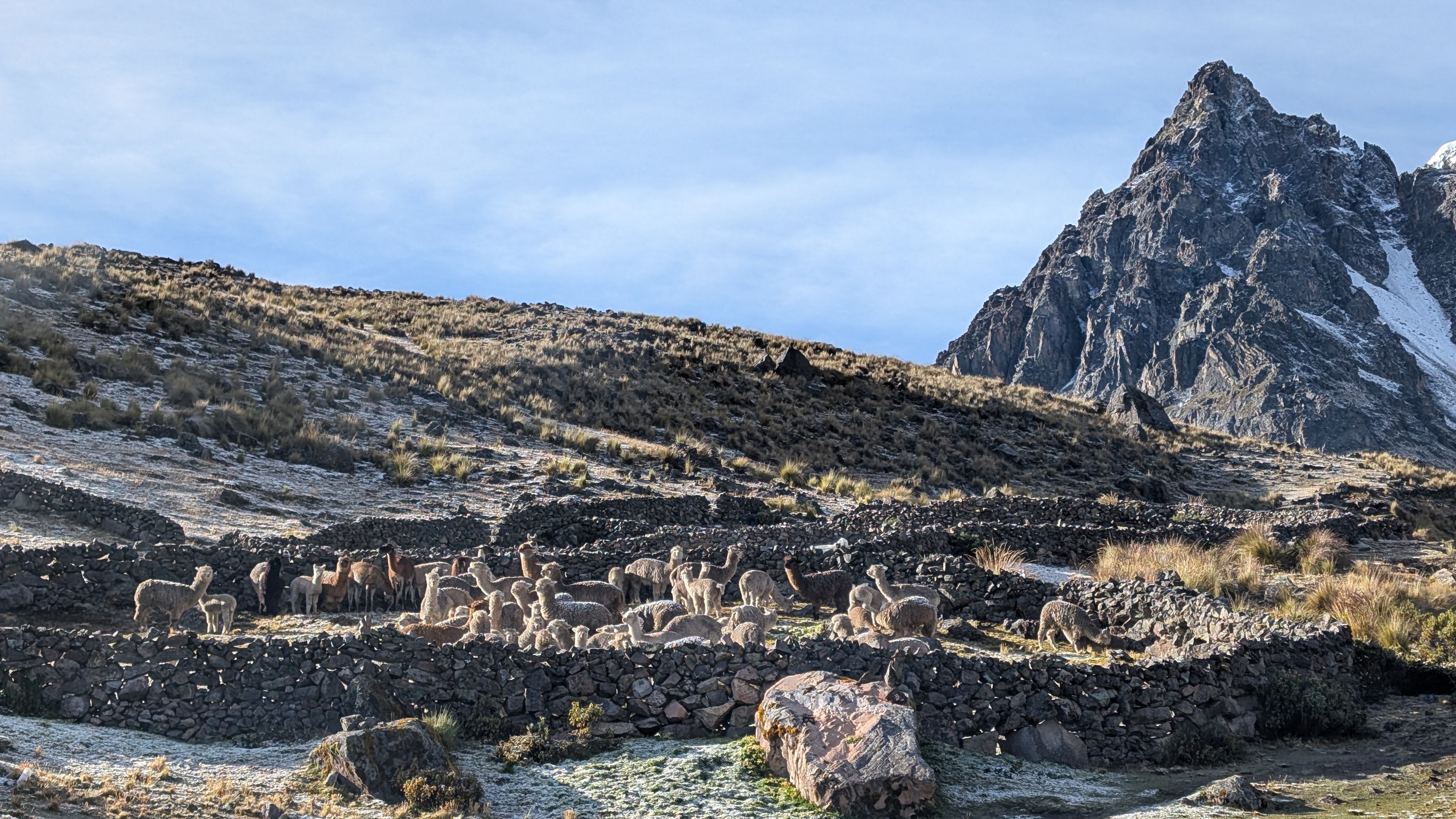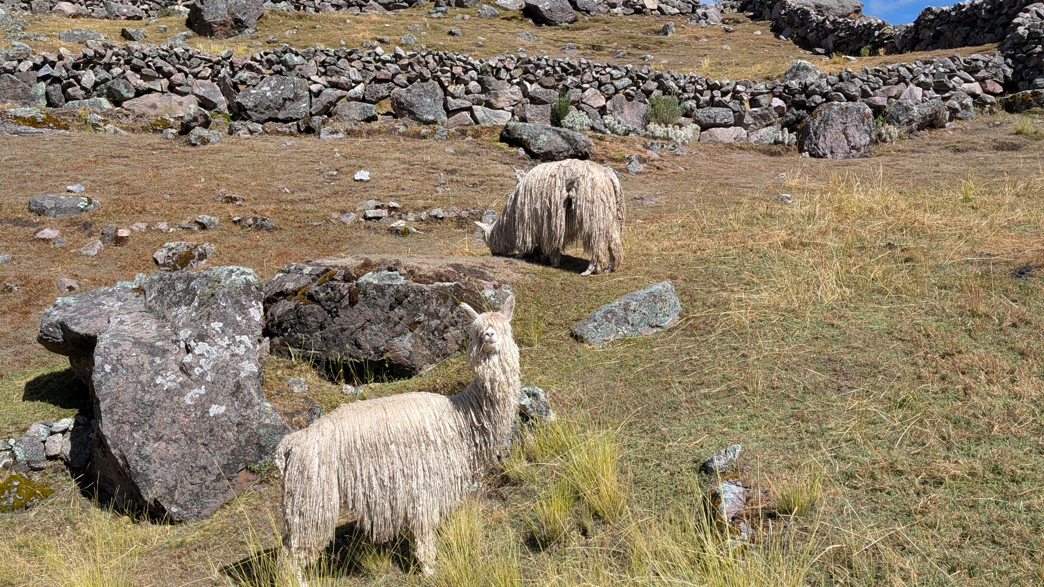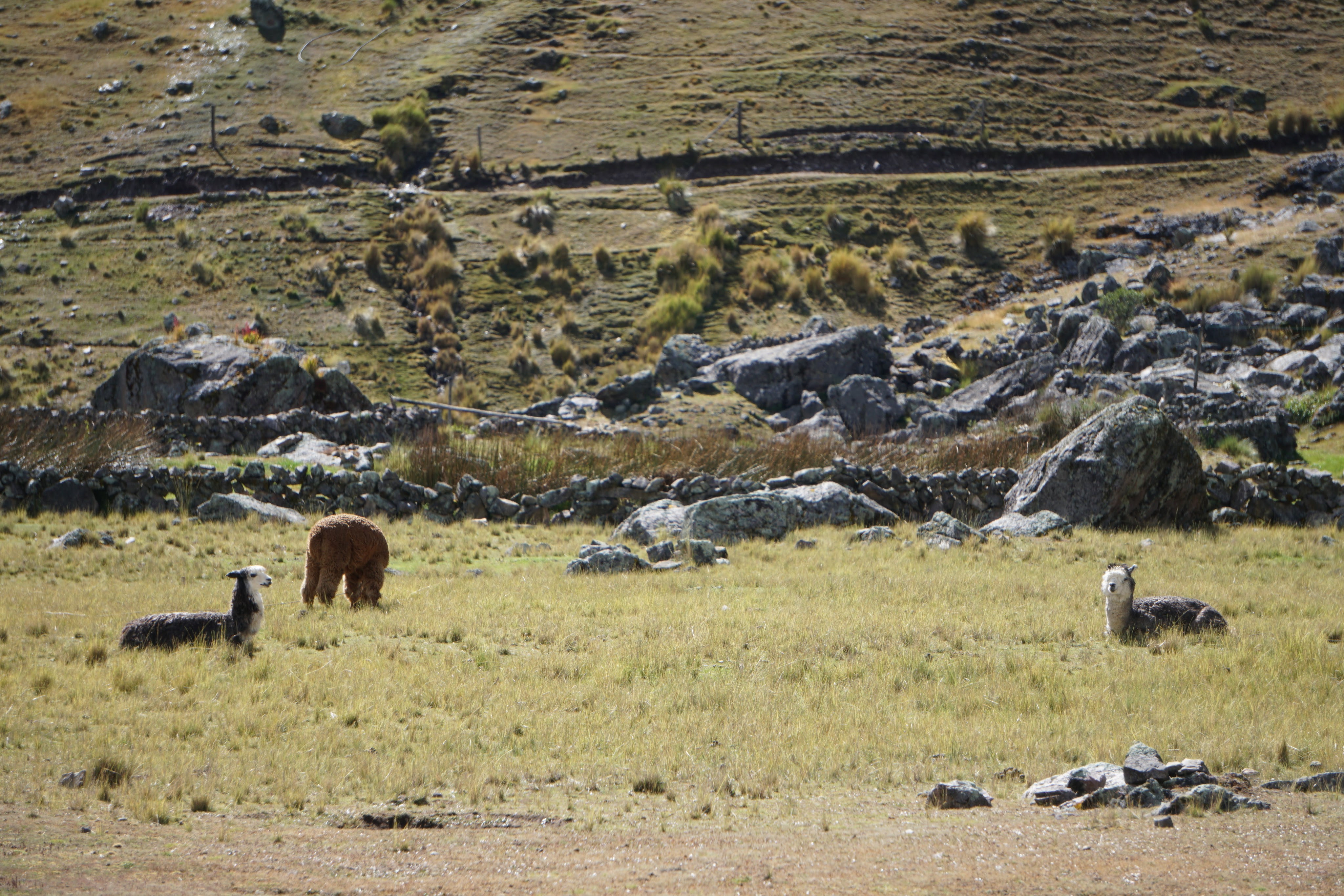 As we hike down along the side of the Pacchanta River, day trip tourists appear and are huffing and puffing their way up the 7 Lakes Route. Many tourists are also riding horses which is a bit of an amusing sight as they try to manage their new ride. We pass more alpaca farms whose pens are marked by rock borders.