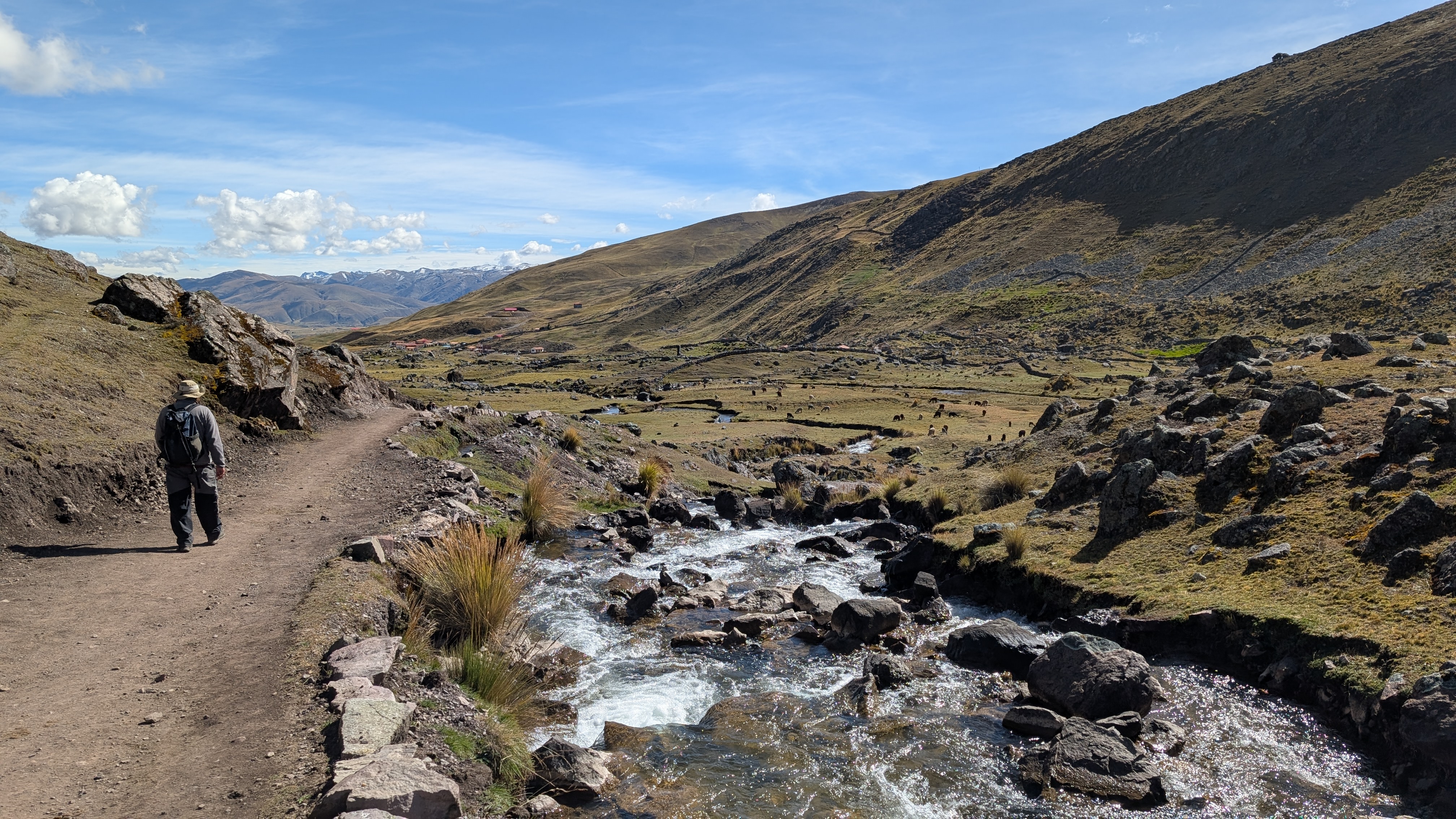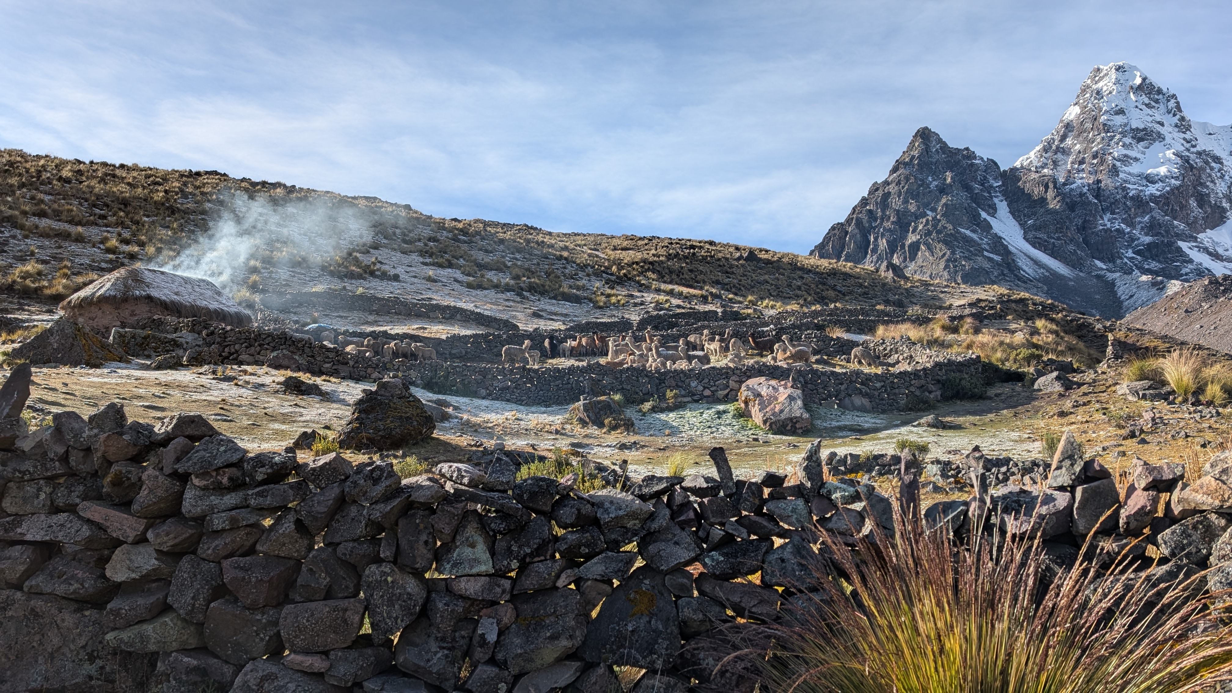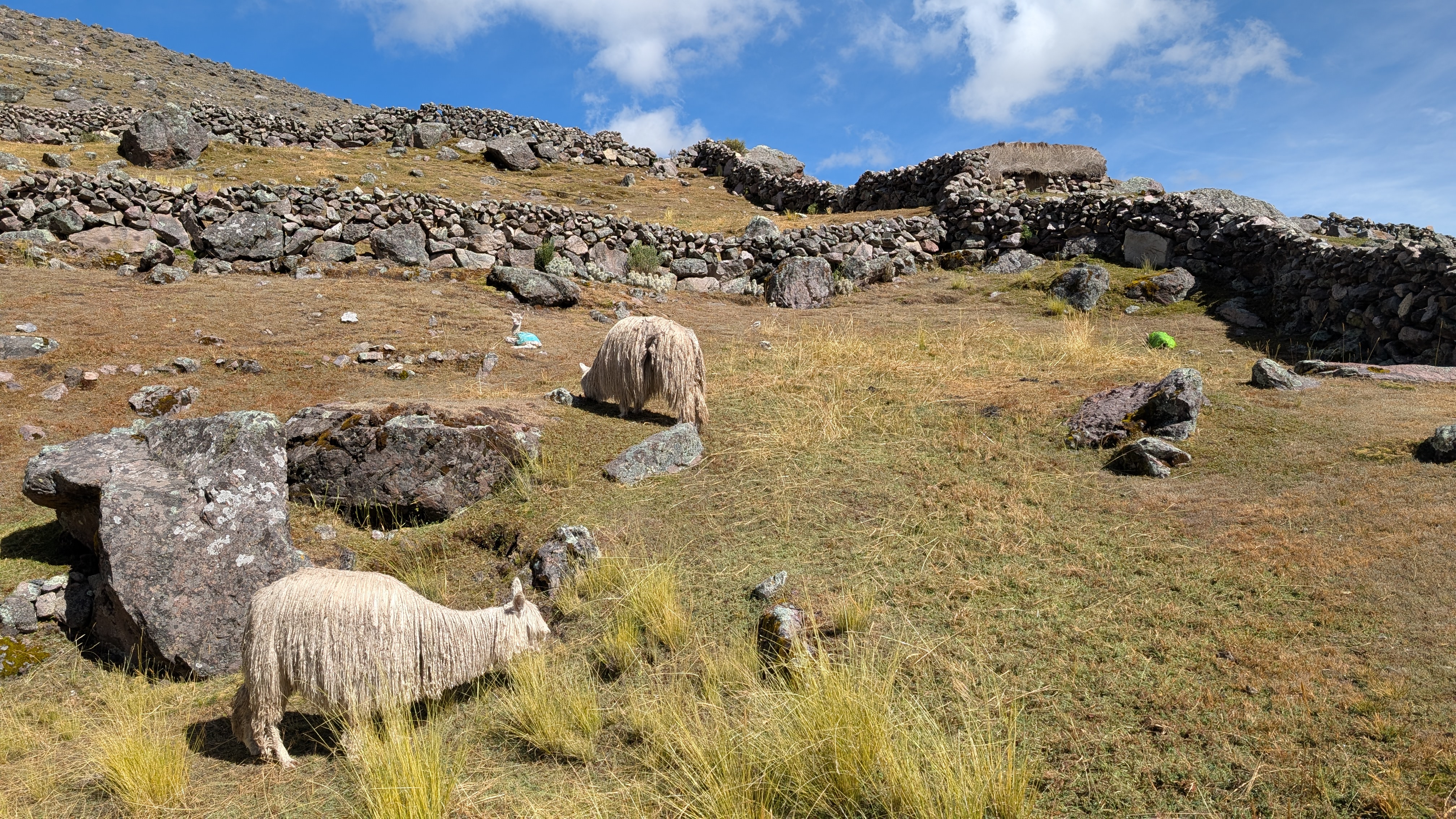 As we hike down along the side of the Pacchanta River, day trip tourists appear and are huffing and puffing their way up the 7 Lakes Route. Many tourists are also riding horses which is a bit of an amusing sight as they try to manage their new ride. We pass more alpaca farms whose pens are marked by rock borders.