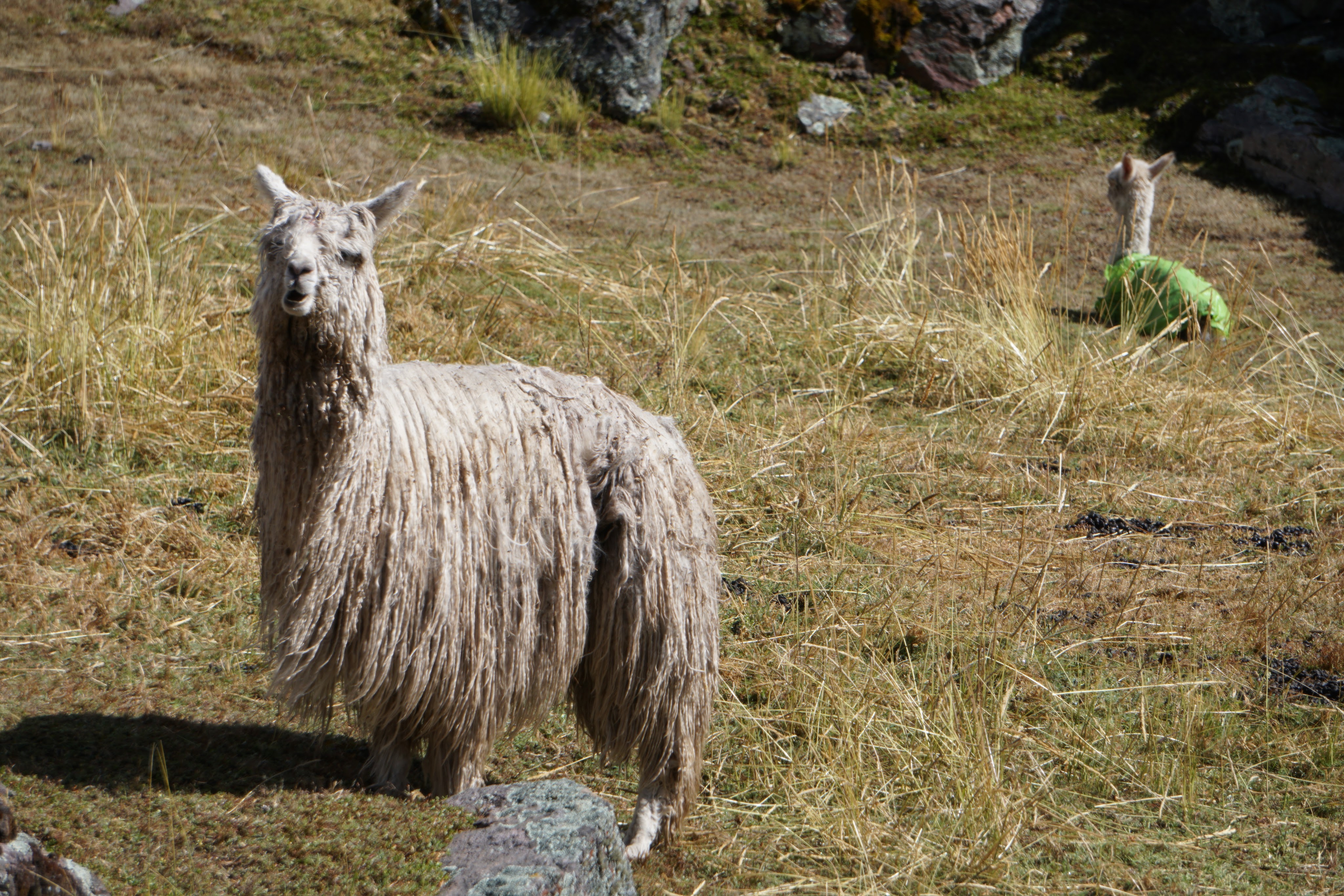 We even pass some Suri alpaca with some very new born babies. Suri alpaca have long, stringy dreadlock-type wool. The predominant alpaca breed is Huacaya while Suri alpaca comprise only about 10% of the worldwide alpaca population. Look for the babies which are wearing green and blue plastic wraps to help keep them warm.