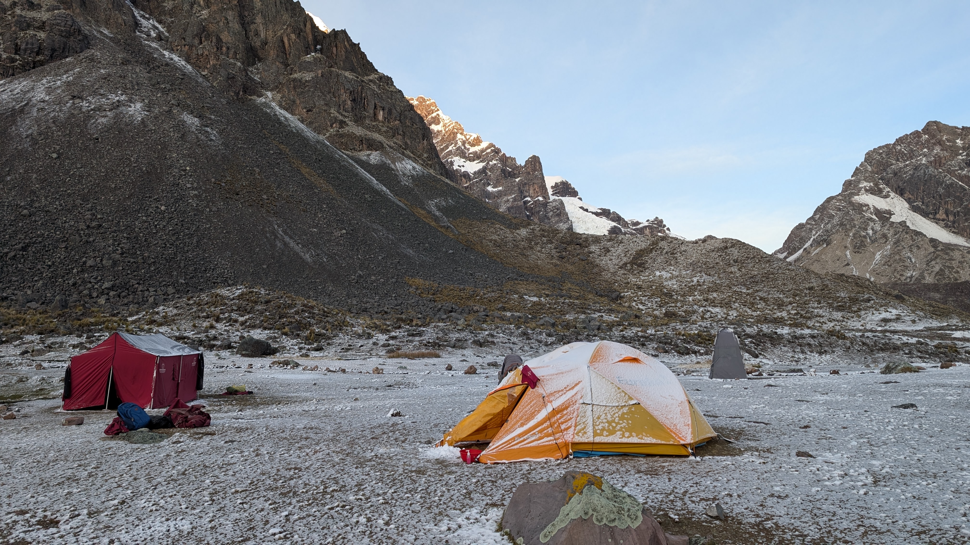 Because we have a short day of hiking, the morning schedule is more relaxed and I don’t have to wake up until 5:30 am. I emerge from my tent just after 6 am to find the sun already starting its descent into the valley. The layer of hail persists and thinly blankets the surrounding area. We have breakfast at 6:30 am before departing just after 7 am.