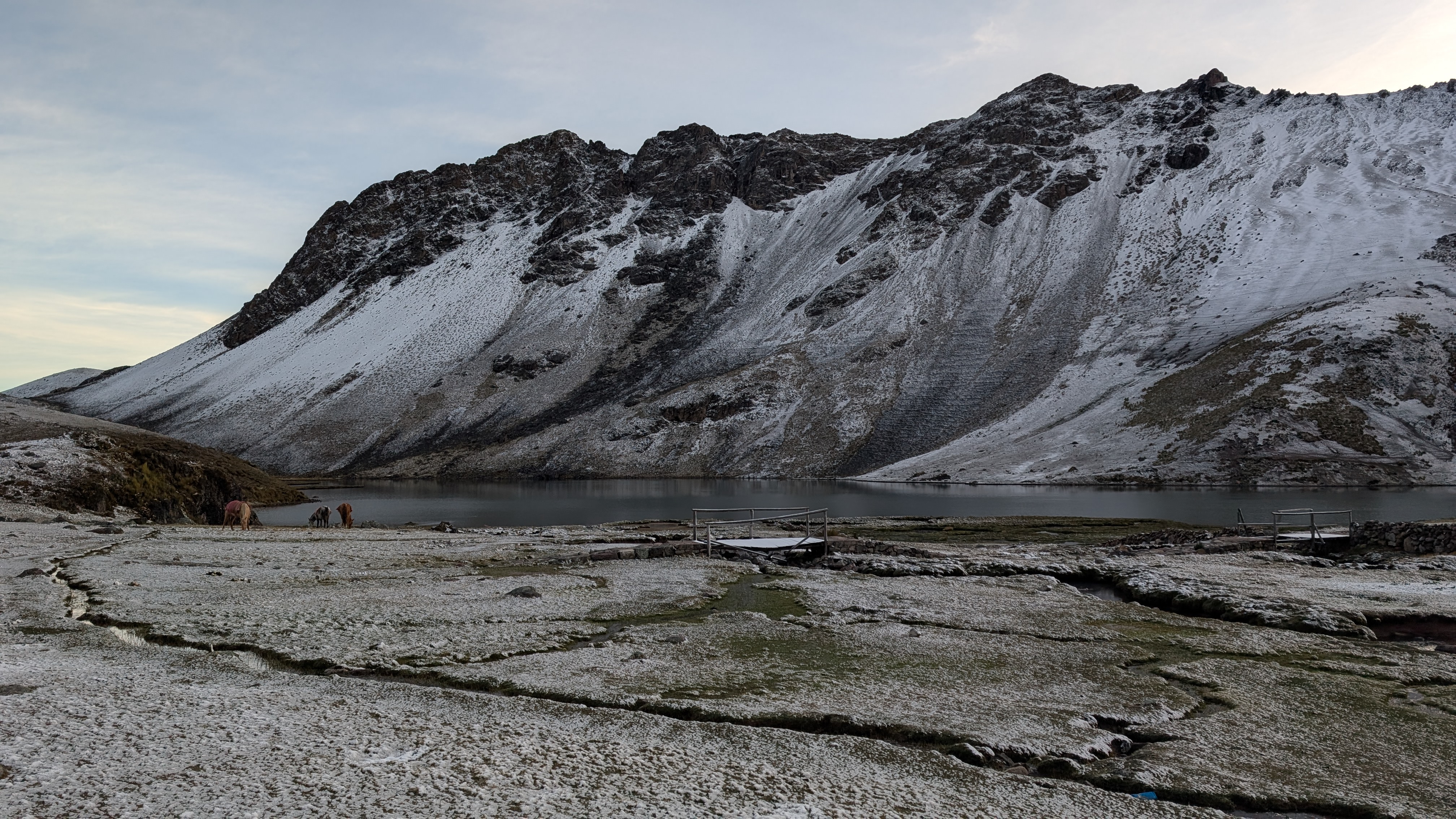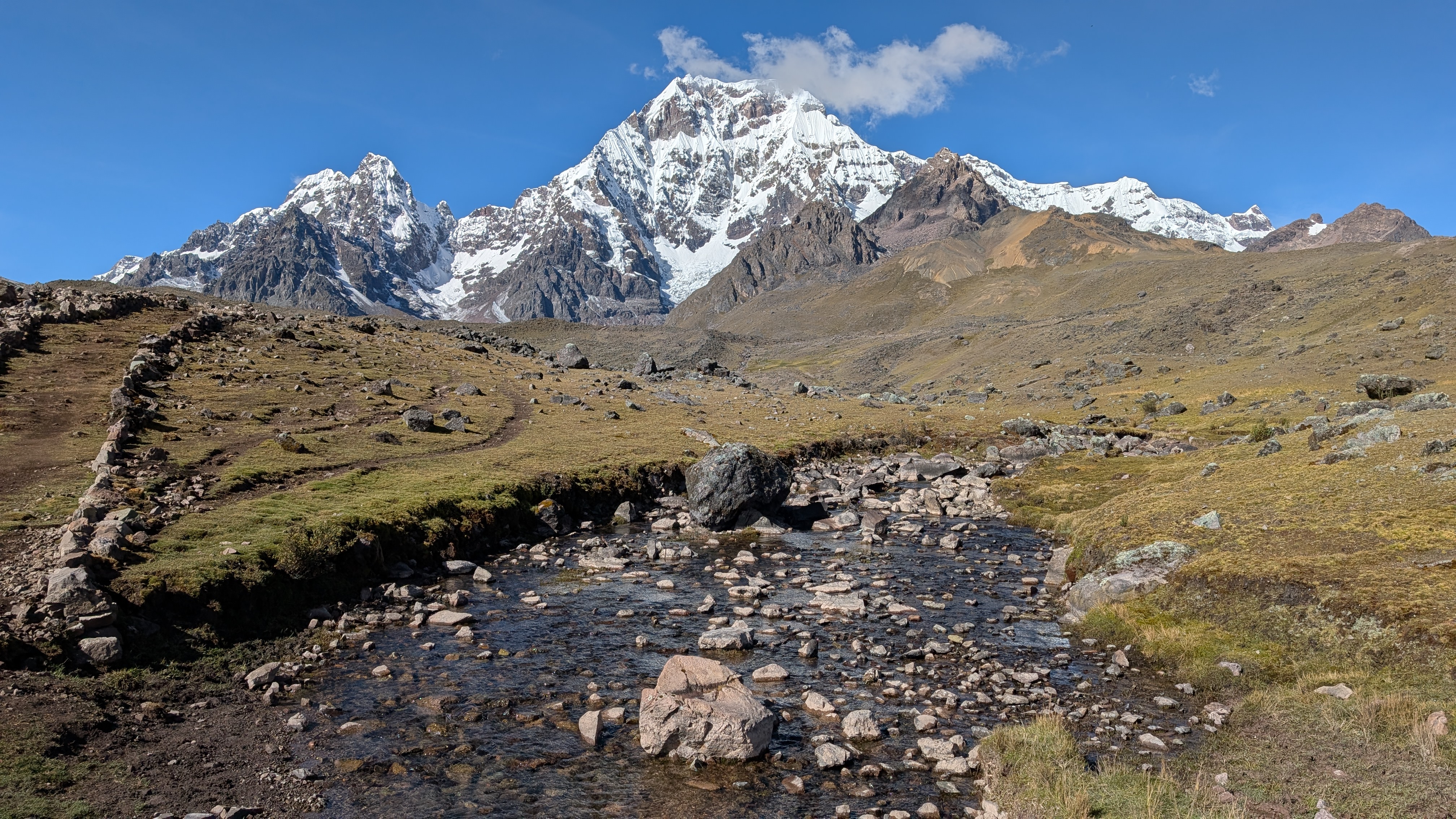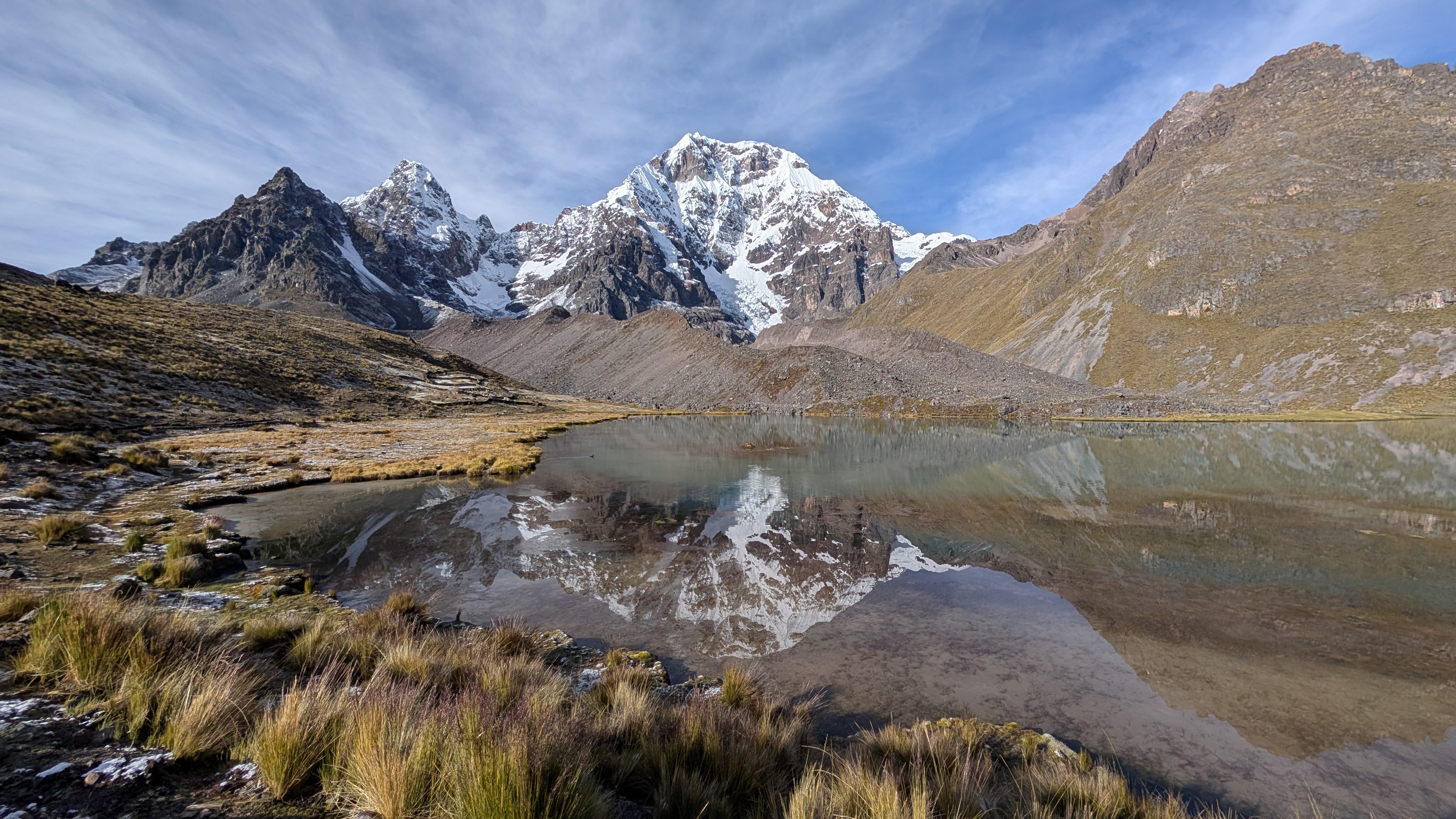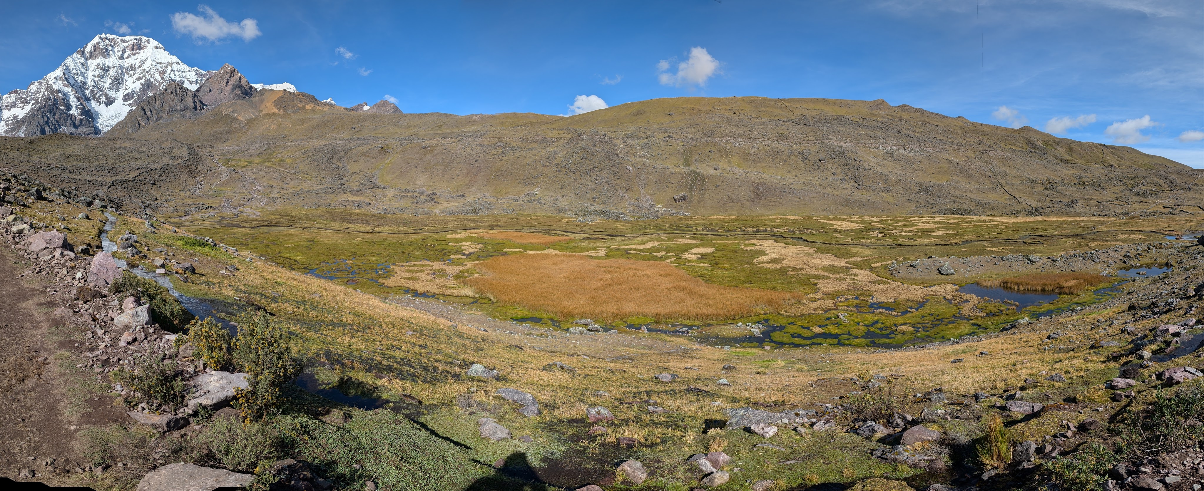 Below: Looking across a lagoon whose water source is flowing from Anqas Qocha.