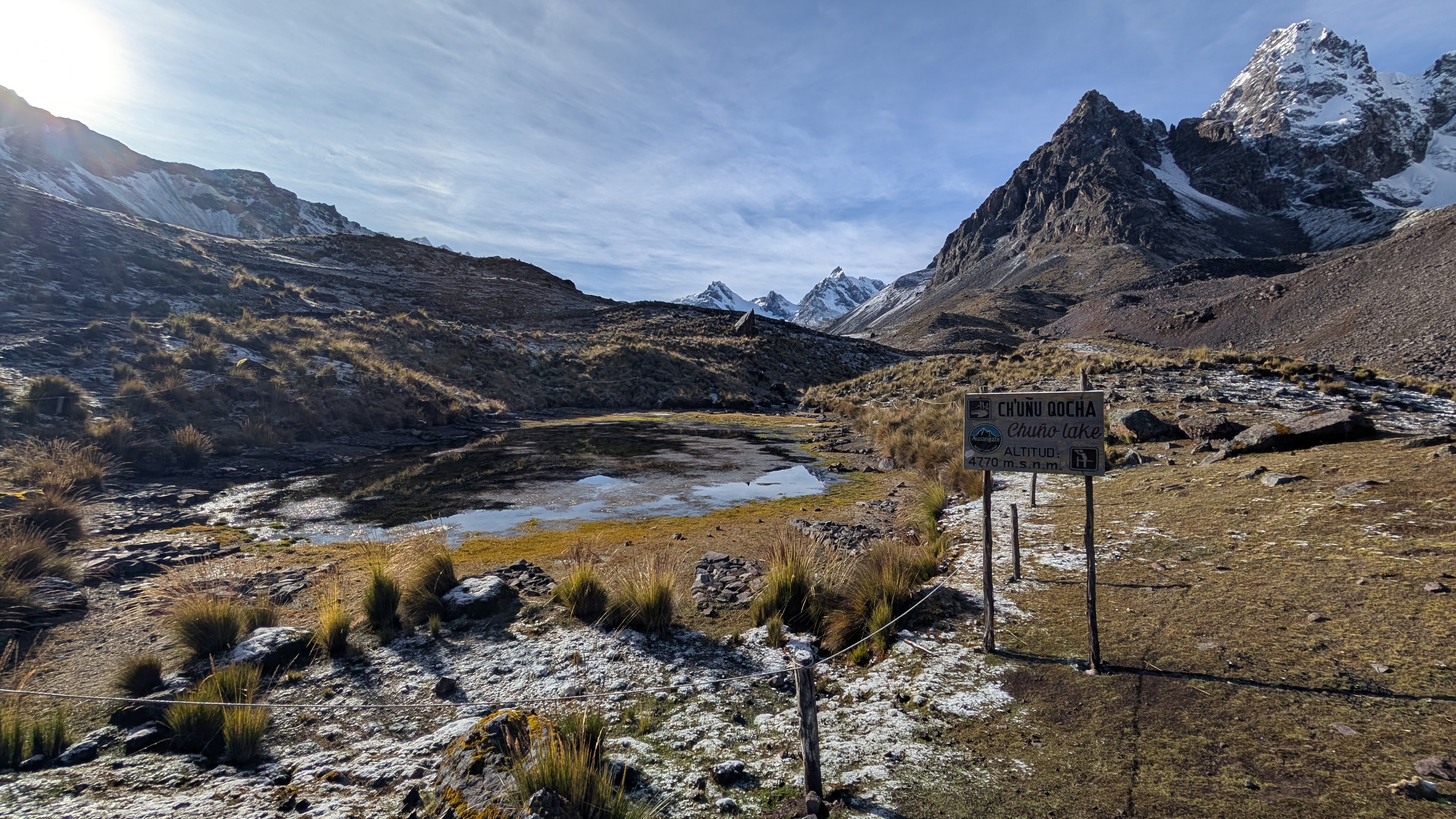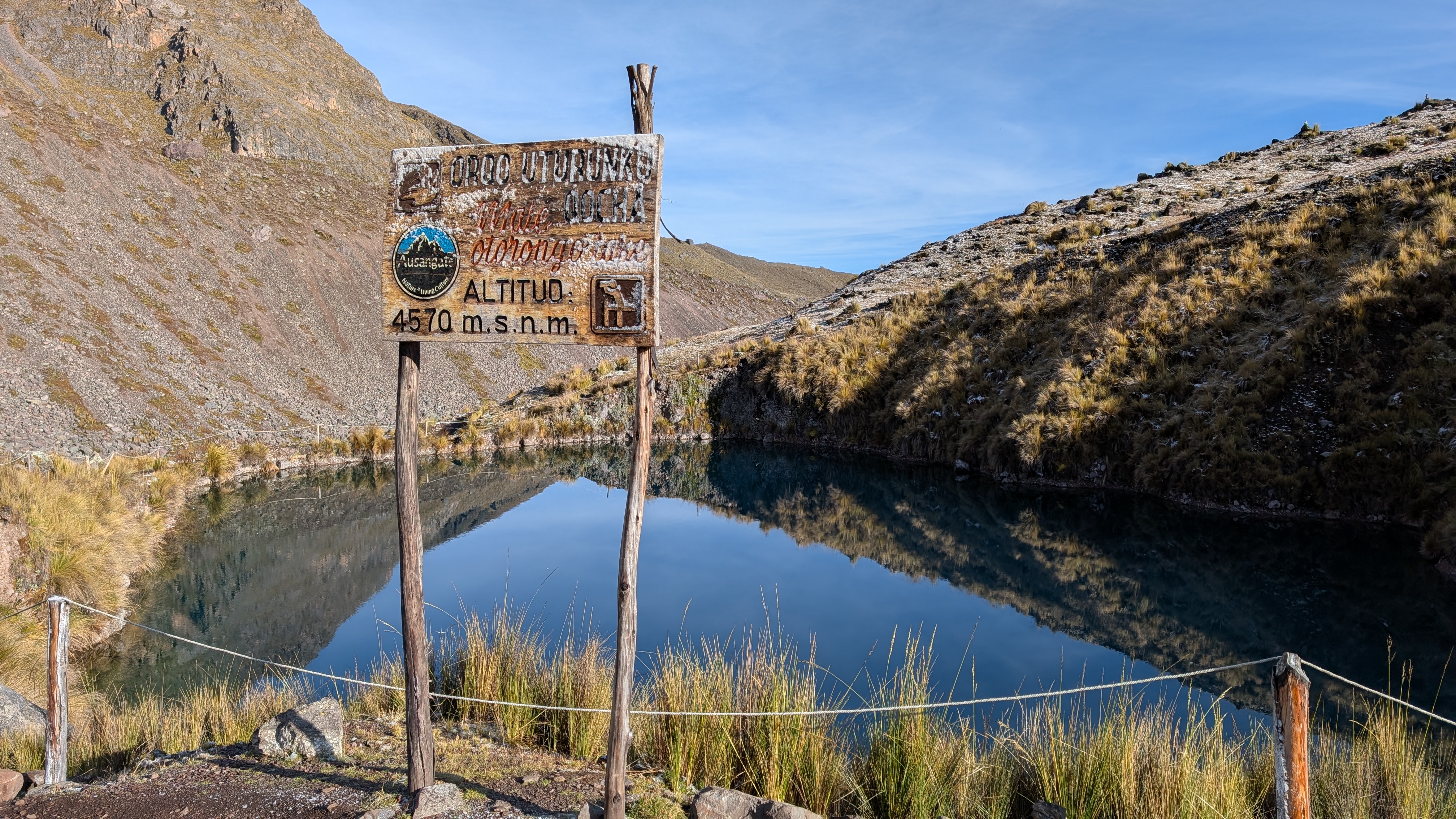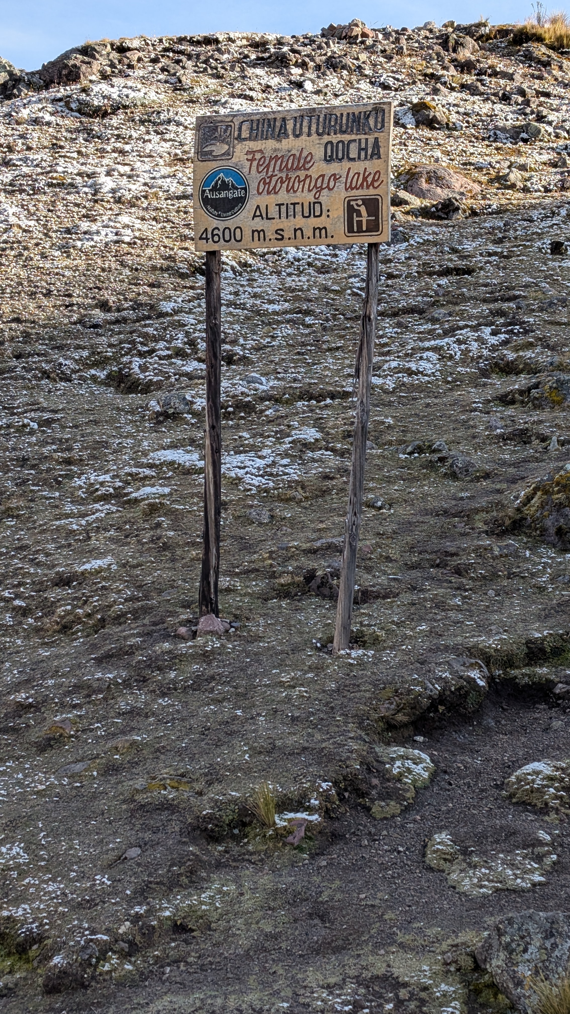 We pass several small lakes with signs before reaching the large Anqas Qocha. Ch’uño Qocha, China Uturunku Qocha or Female Jaguar Lake, Orqo Uturunku Qocha or Male Jaguar Lake. Remember that ch’uño or chuño are Andean freeze-dried potatoes made through natural processes which Elizabeth explained to me on the Salkantay Trek.