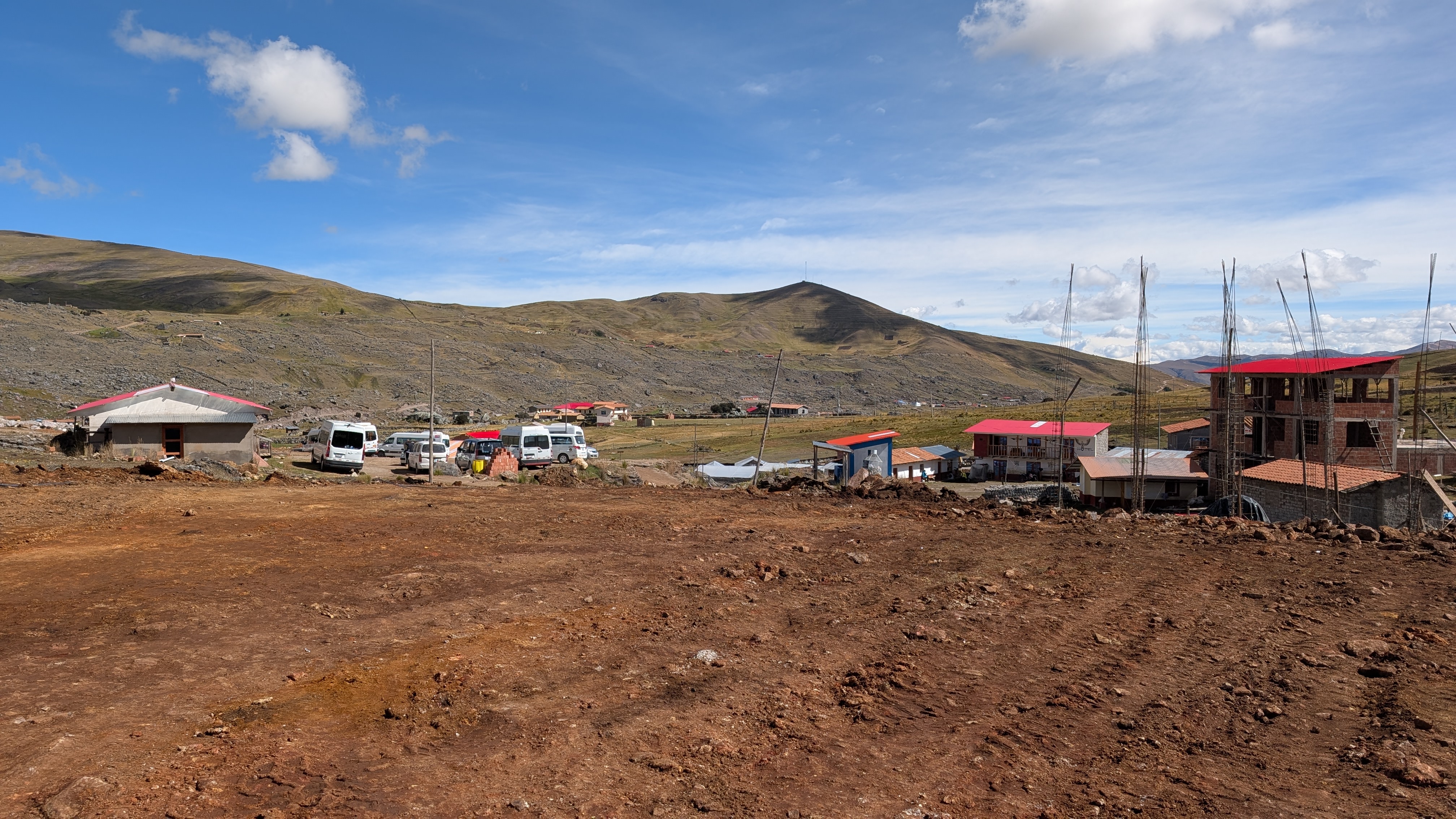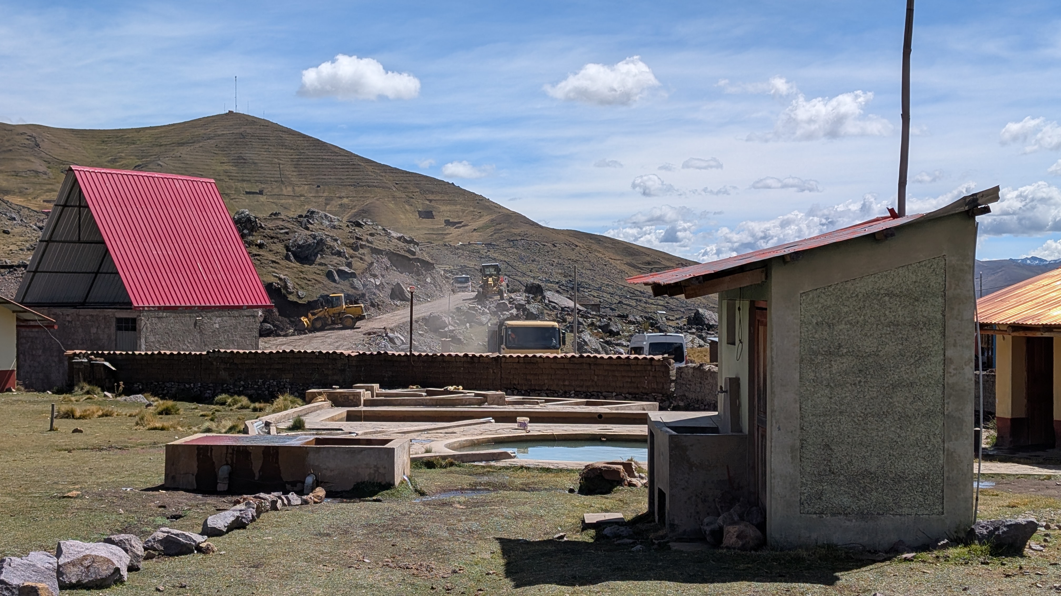 We arrive to Pacchanta about 10 am and the community is bustling with construction noise. There are buildings going up and roads being built. We wander around a little bit searching for our team and pass a place called Michi House. In Quechua, michi is an affectionate way to refer to a cat. We eventually make our way to Hotel Ausangate and our team arrives not long after. Hotel Ausangate also has nicely made hot spring pools. In the picture below, you can see the pools but also the road construction happening in the background.