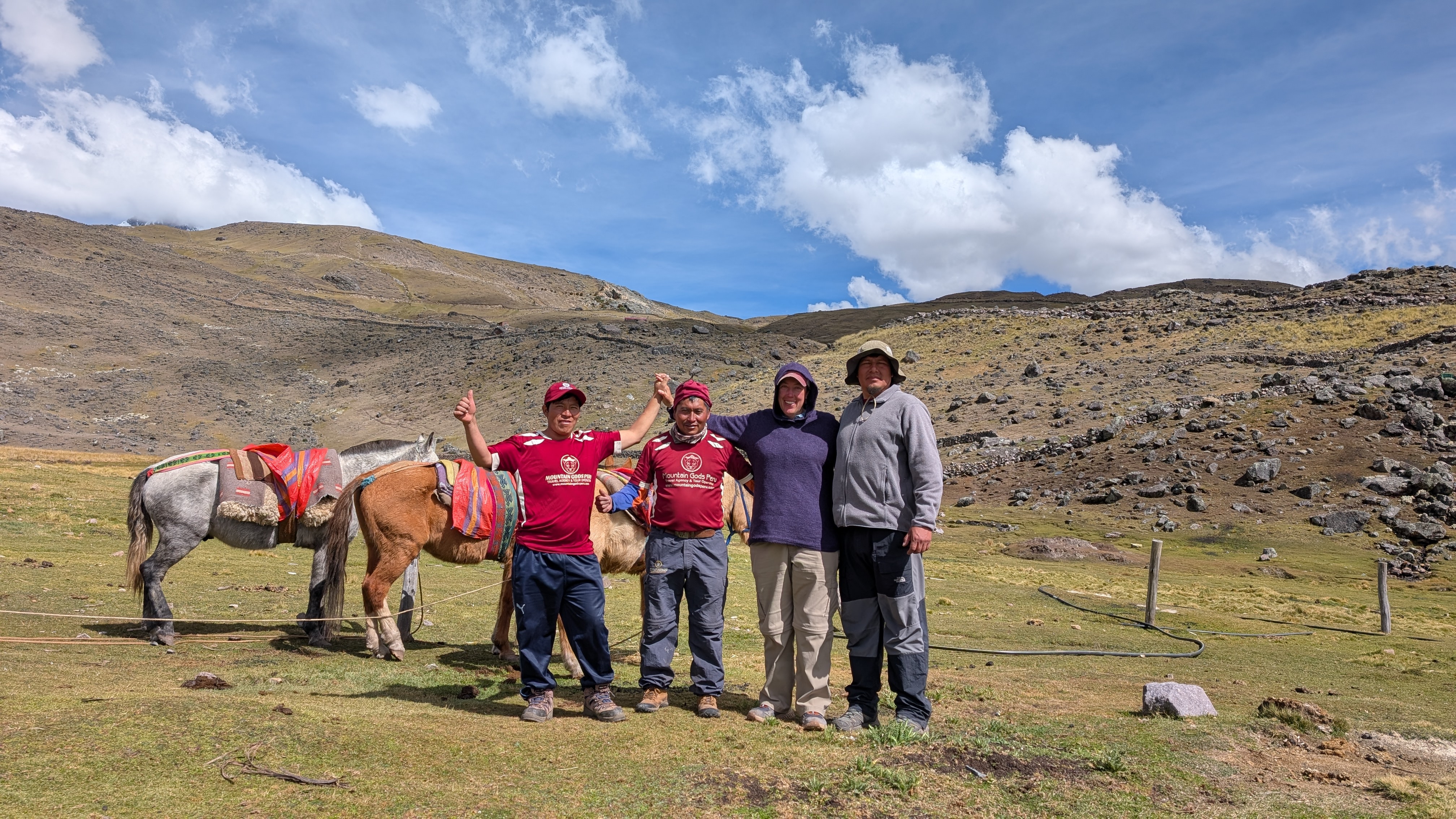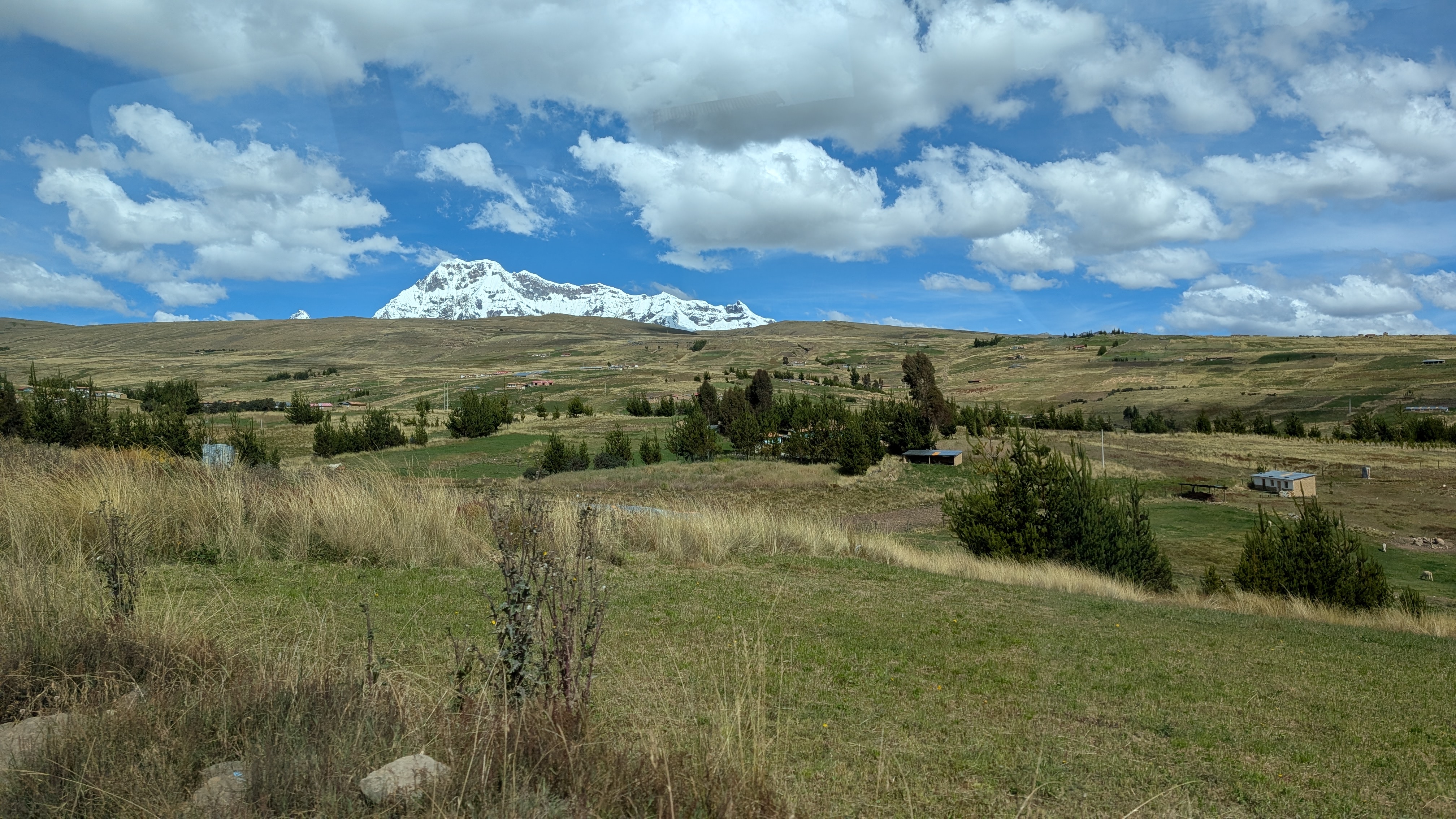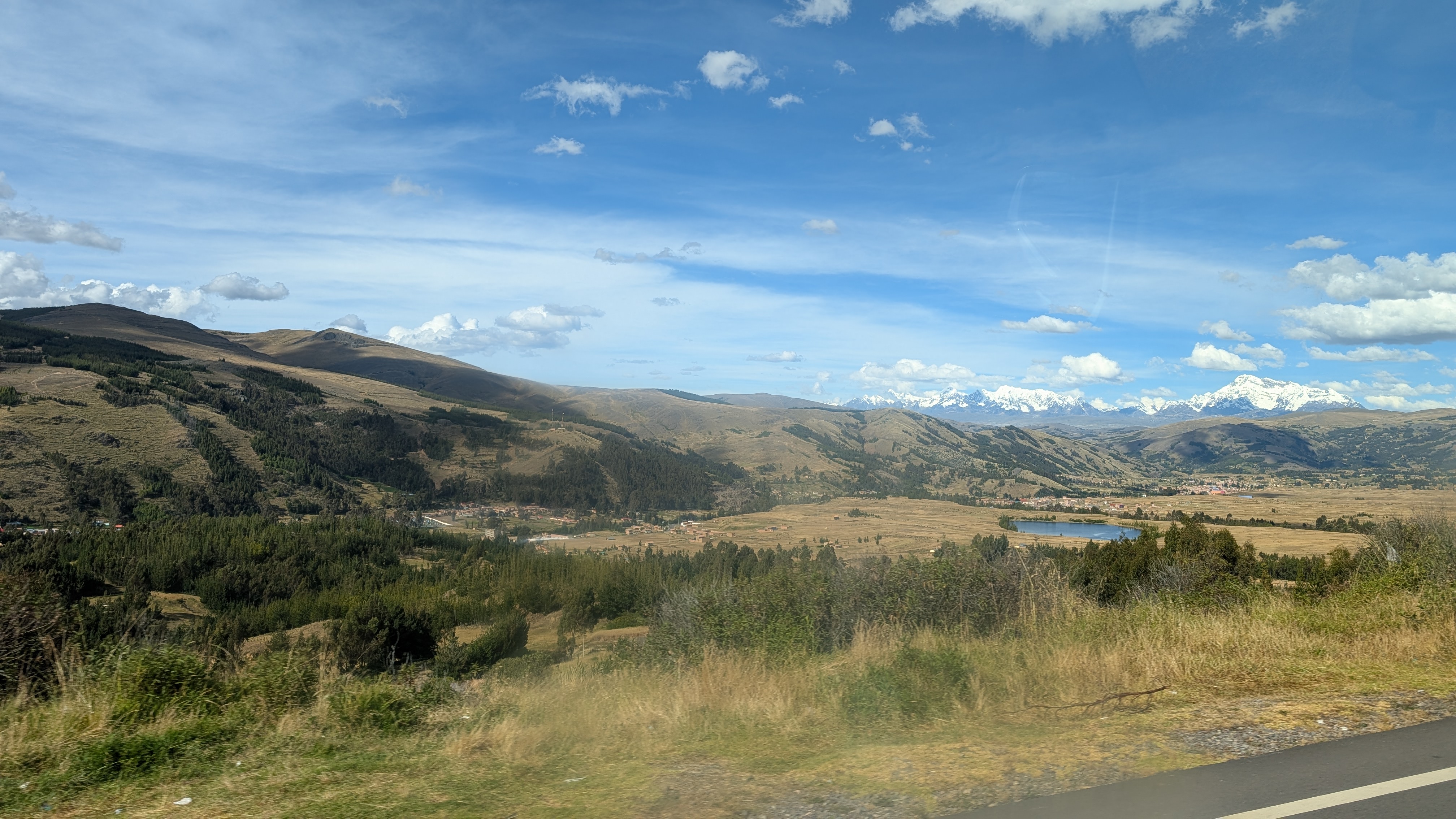 L-R: Julio, Helario, me and Ronnie. As best I understand, Hilario calls the darker horse Coli and the lighter horses seem to both be called Vicuña. It’s just after 1 pm when we depart on the drive back to Cusco. It’s quite clear today and there are snow-capped mountains visible in all directions.