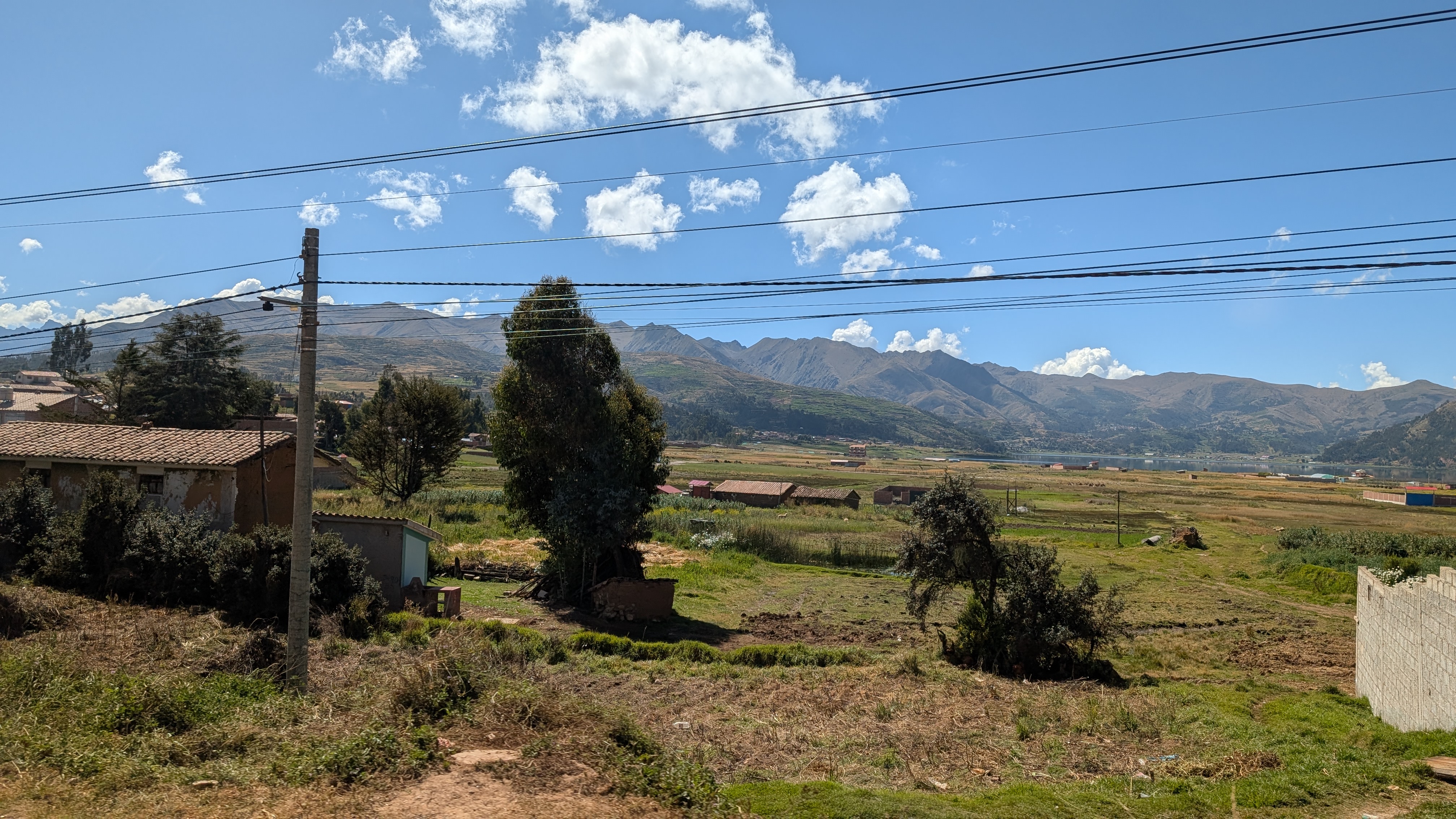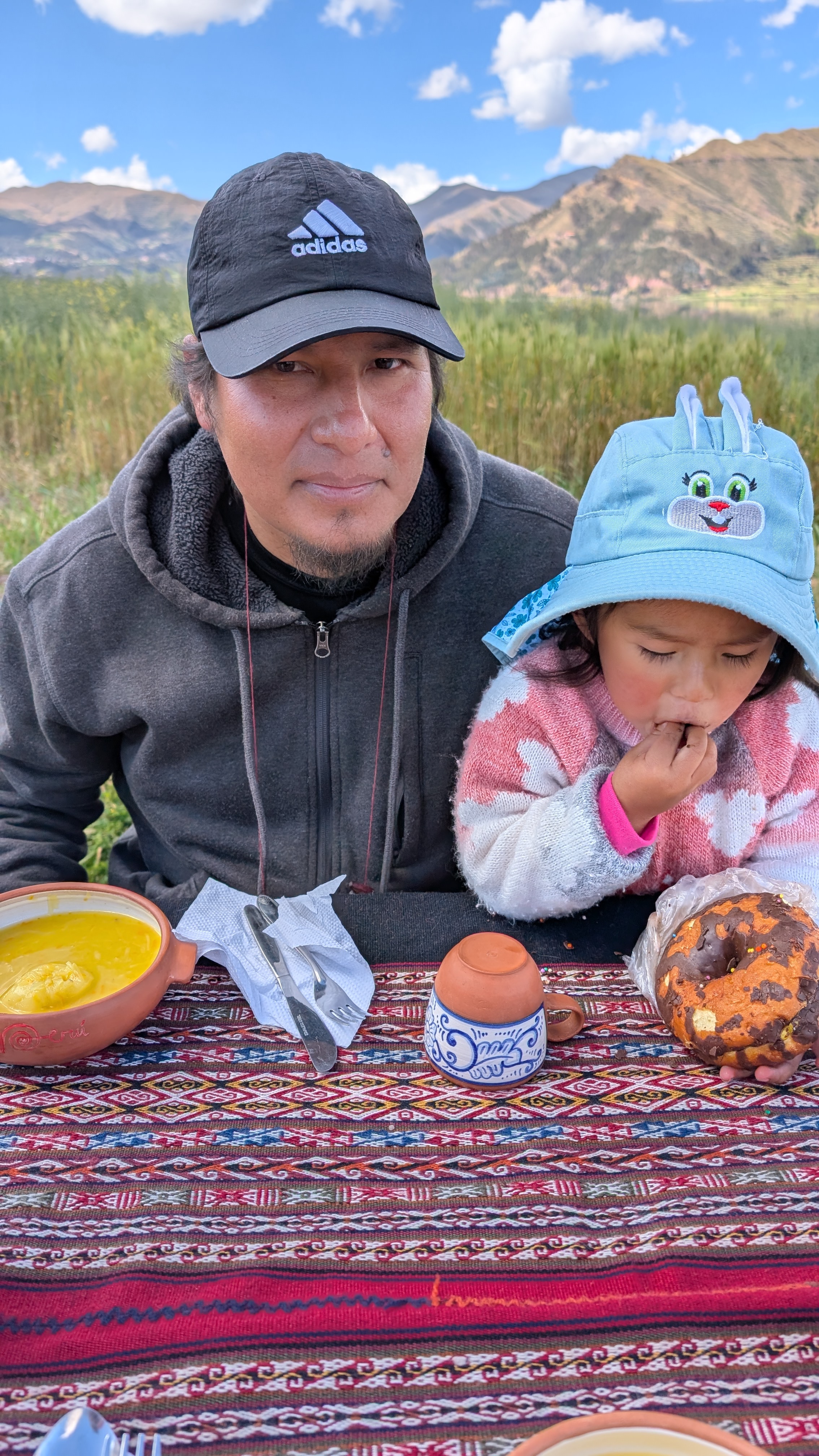 Ronnie arrives promptly and he’s got Luna with him too. Ronnie keeps Luna occupied in the front seat with food. We pull over one time to buy watermelon from a street vendor. As we arrive in Chinchero, Ronnie pulls over again at a bakery and buys Luna a sweet treat.