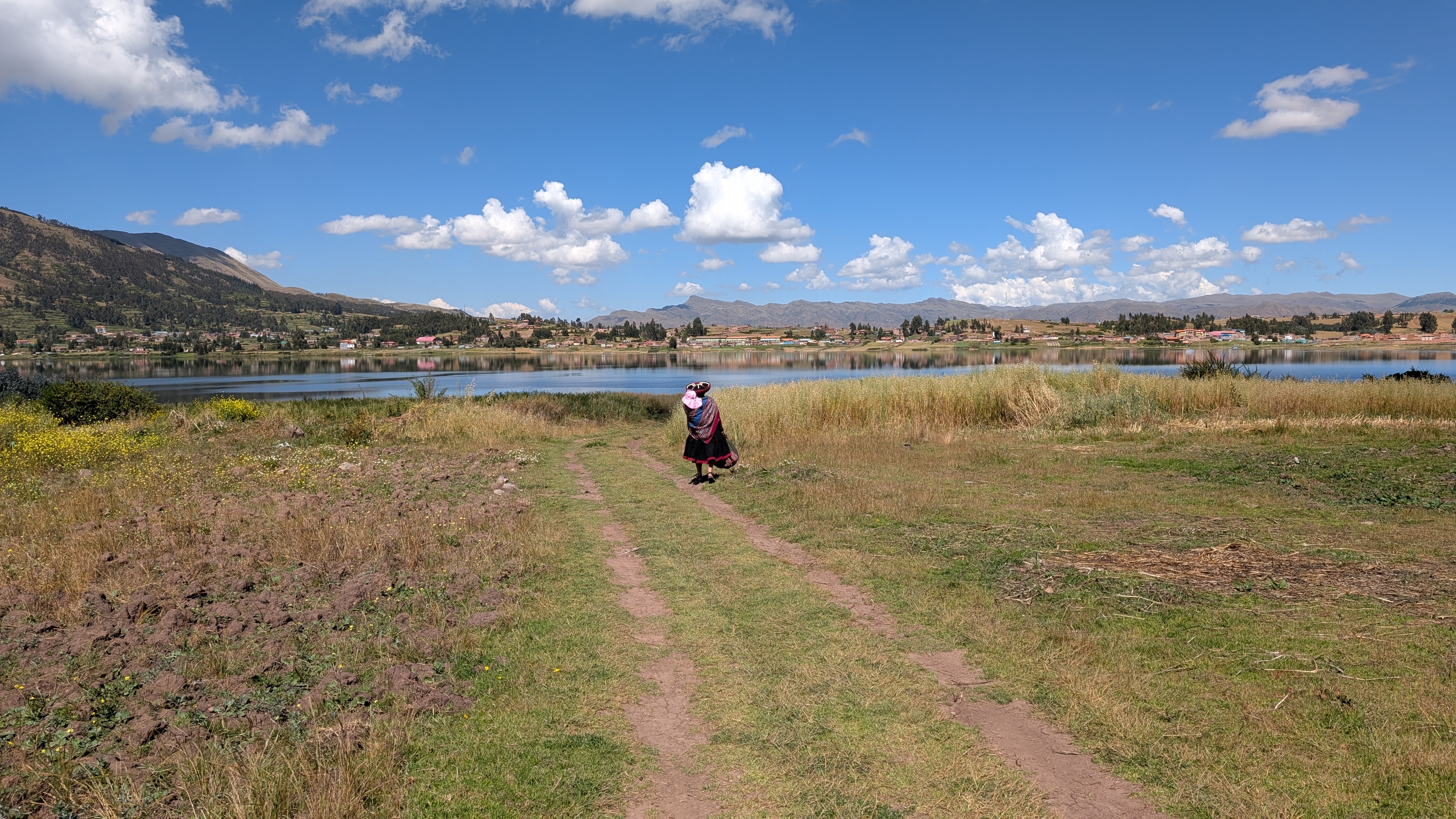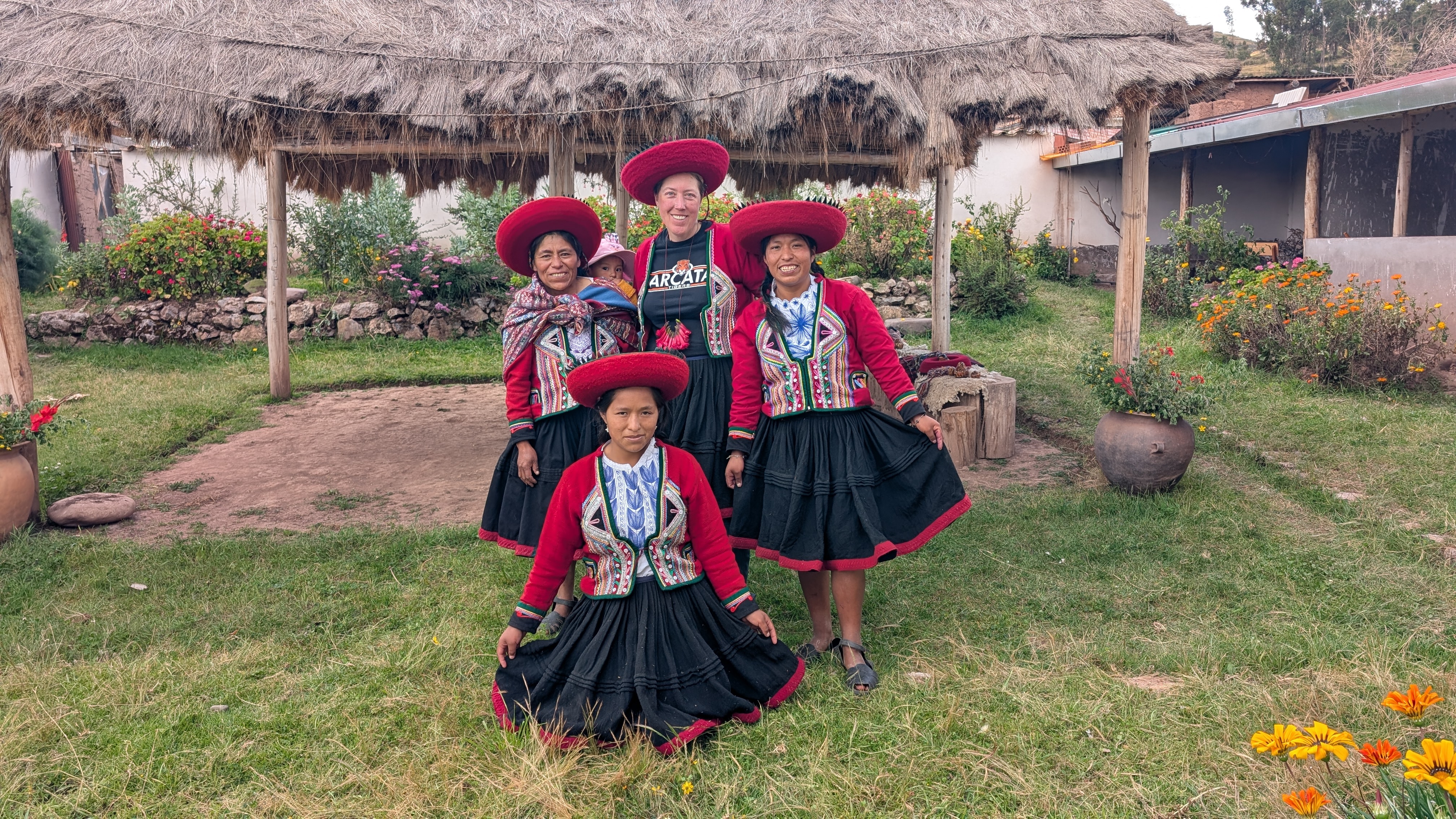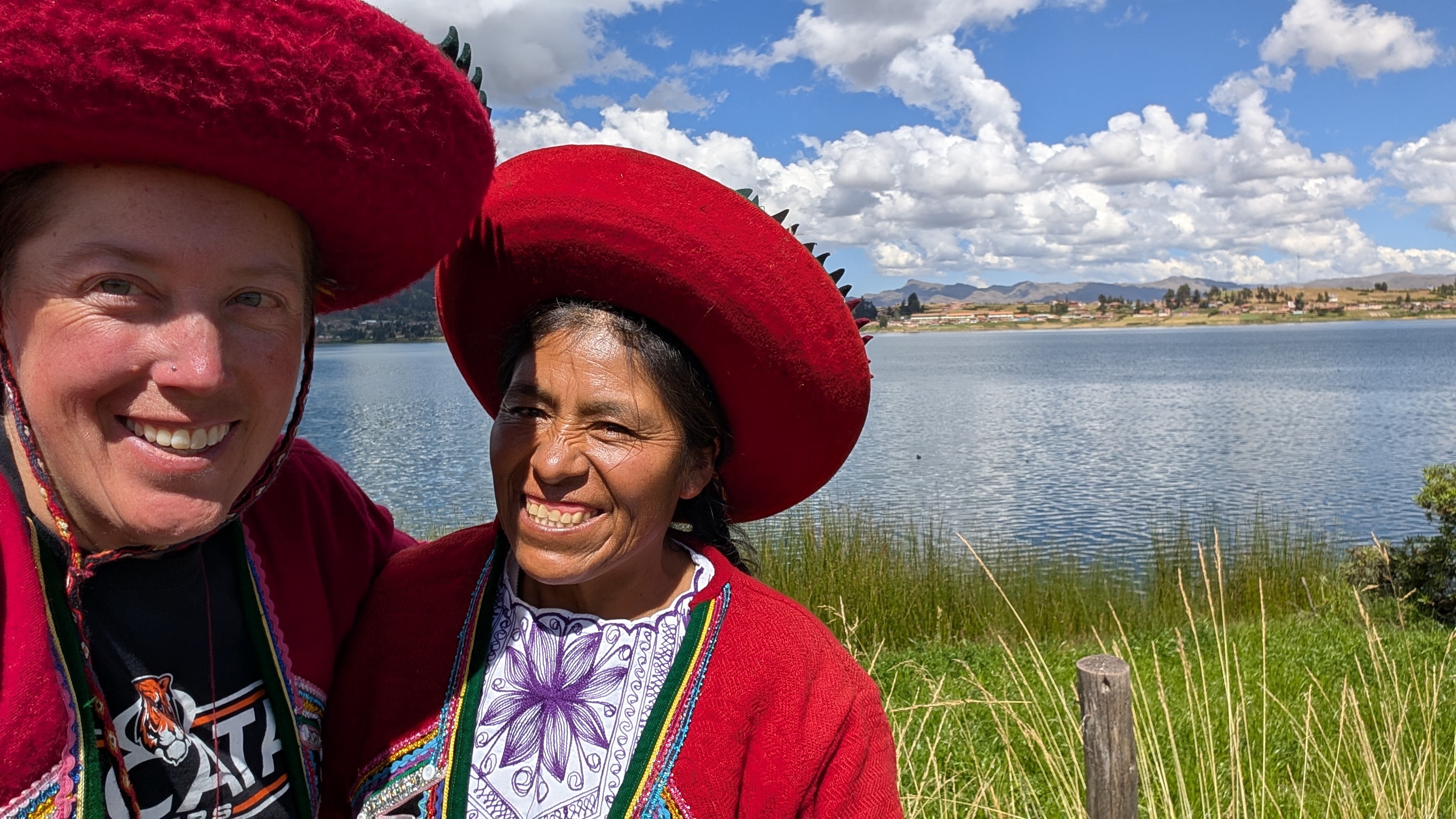 We arrive at a small compound about 10:30 am and are warmly greeted by Bellia, Damiana and Nudia who place a Cantua flower necklace around my neck. I use the lovely restroom before they start to dress me in their traditional clothing. I am given a skirt, jacket and hat. It takes a bit of contorting since I’m not as petite as most. The black skirt represents Pachamama and the red embroidered jacket represents strength and blood. Bellia, Damiana and Nudia are also wearing white shirts with blue embroidery which represent purity. Then a traditional woven blanket is strapped around my shoulders and secured with a large pin in the front. My personal items are added to my ‘backpack’ and we all start the walk towards Laguna de Huaypo about 11 am.