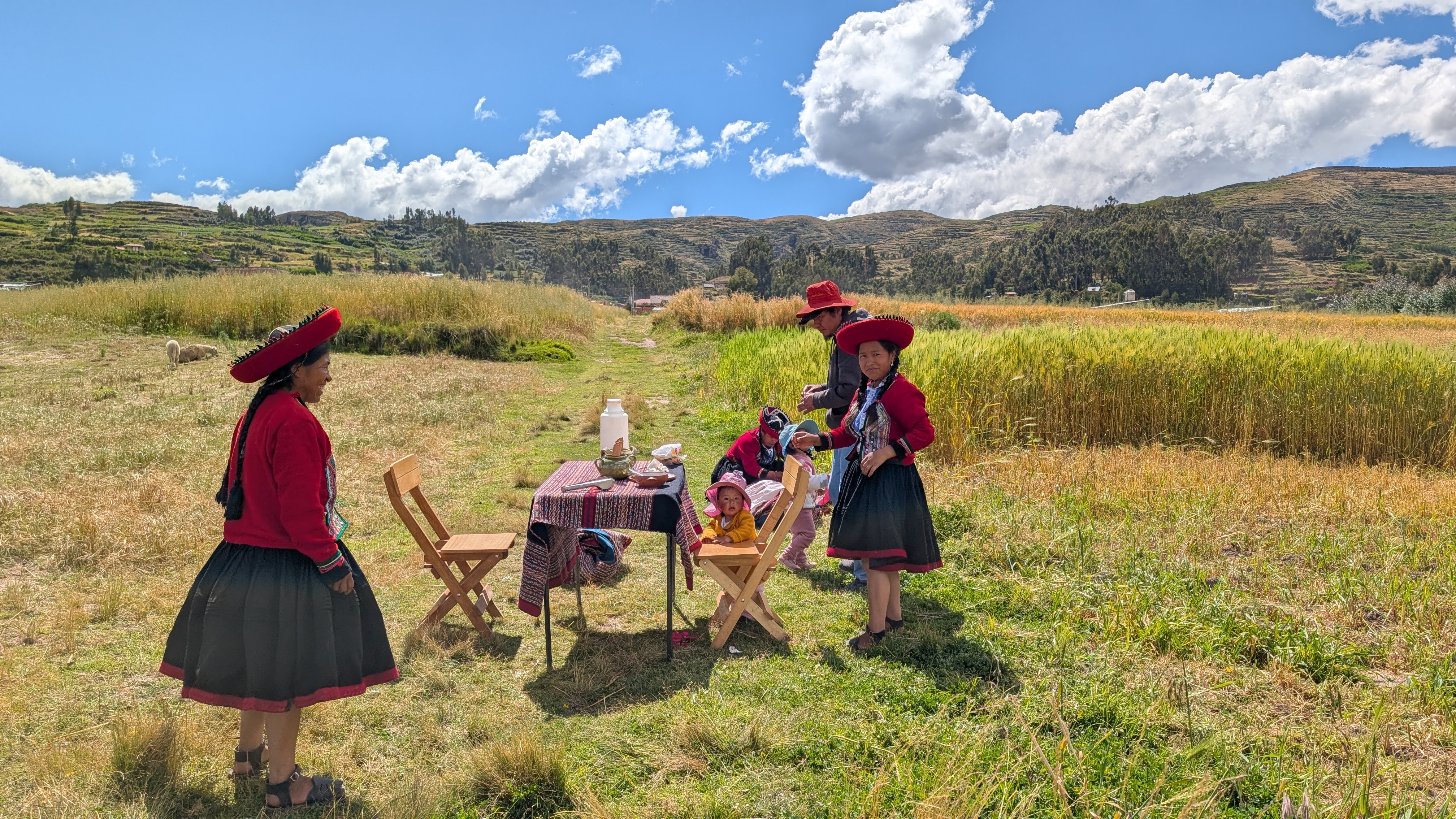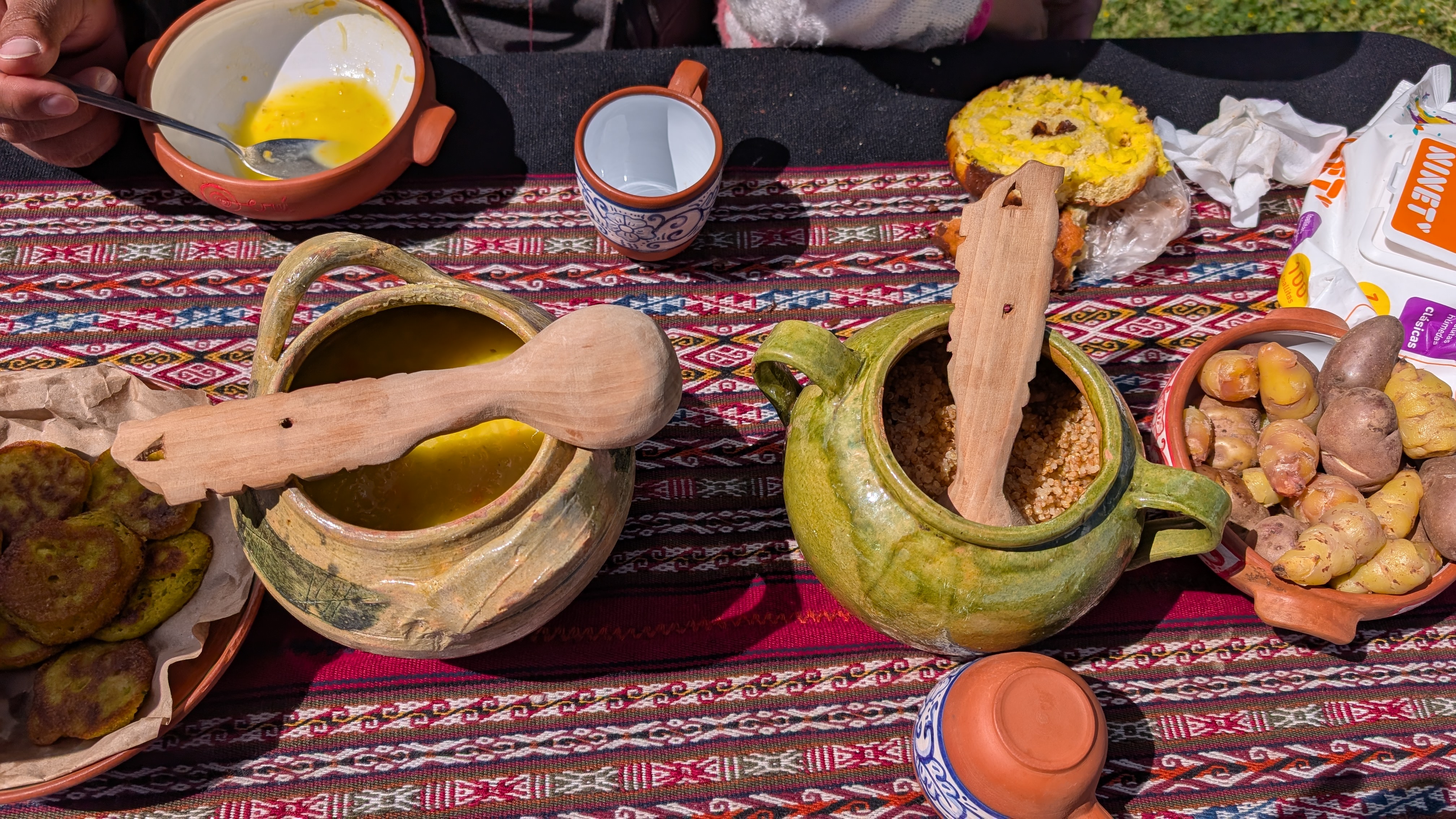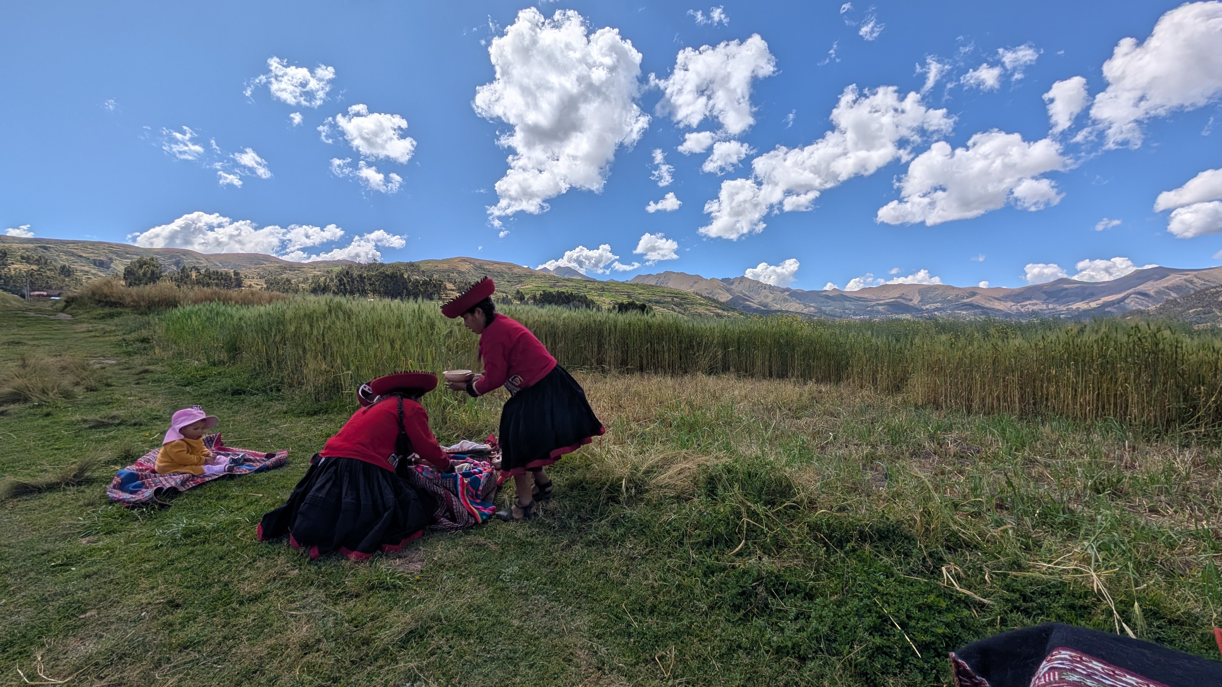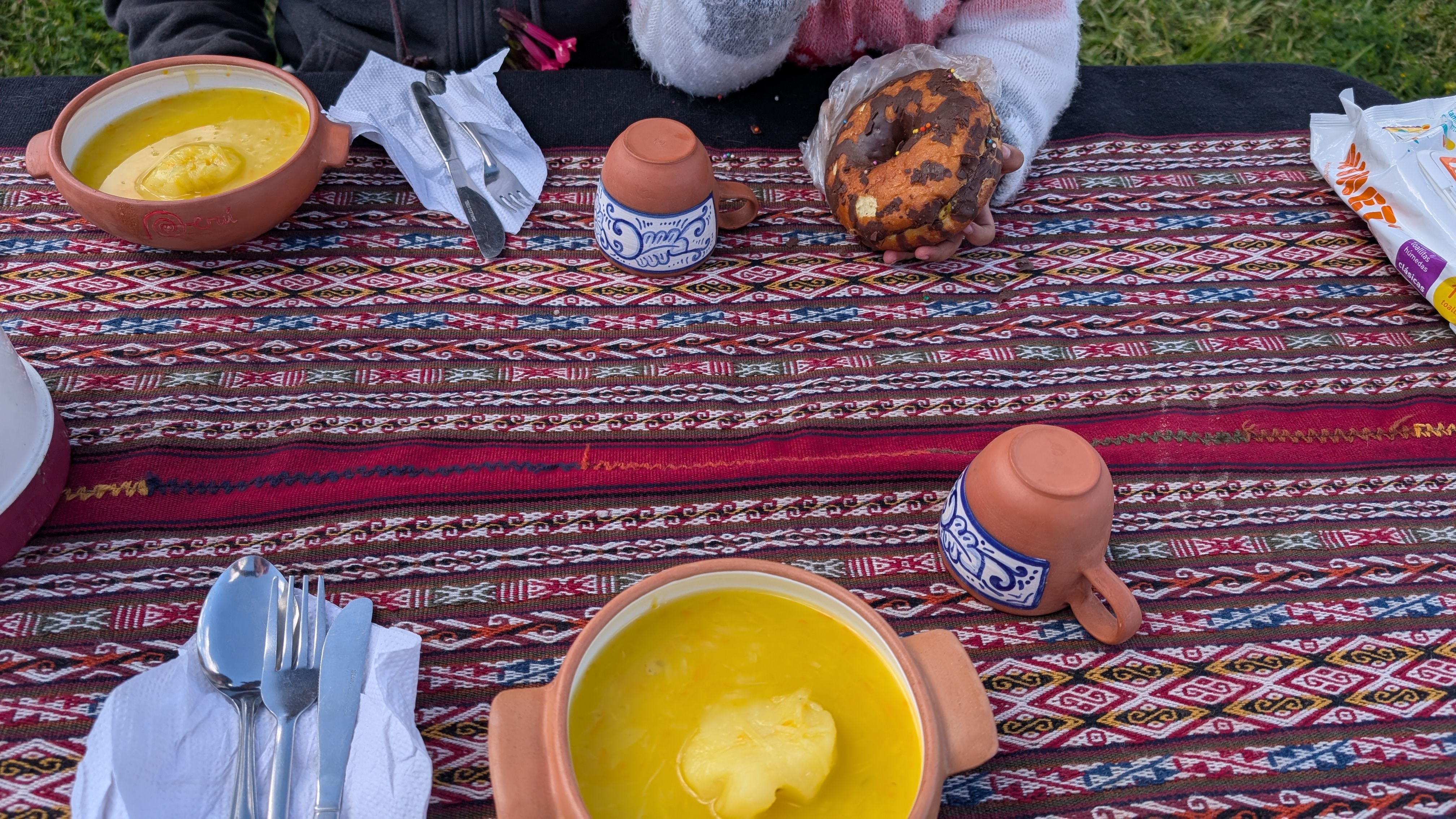 They manage to haul a table, chairs, all the food in stoneware, dishes, beverages and a young child in their traditional carrying pouches to the lakes edge. I didn’t expect all of this and thought I was just coming to learn about weaving. Ronnie, Luna and I sit at the table and are served the most scrumptious potato soup for the first course.