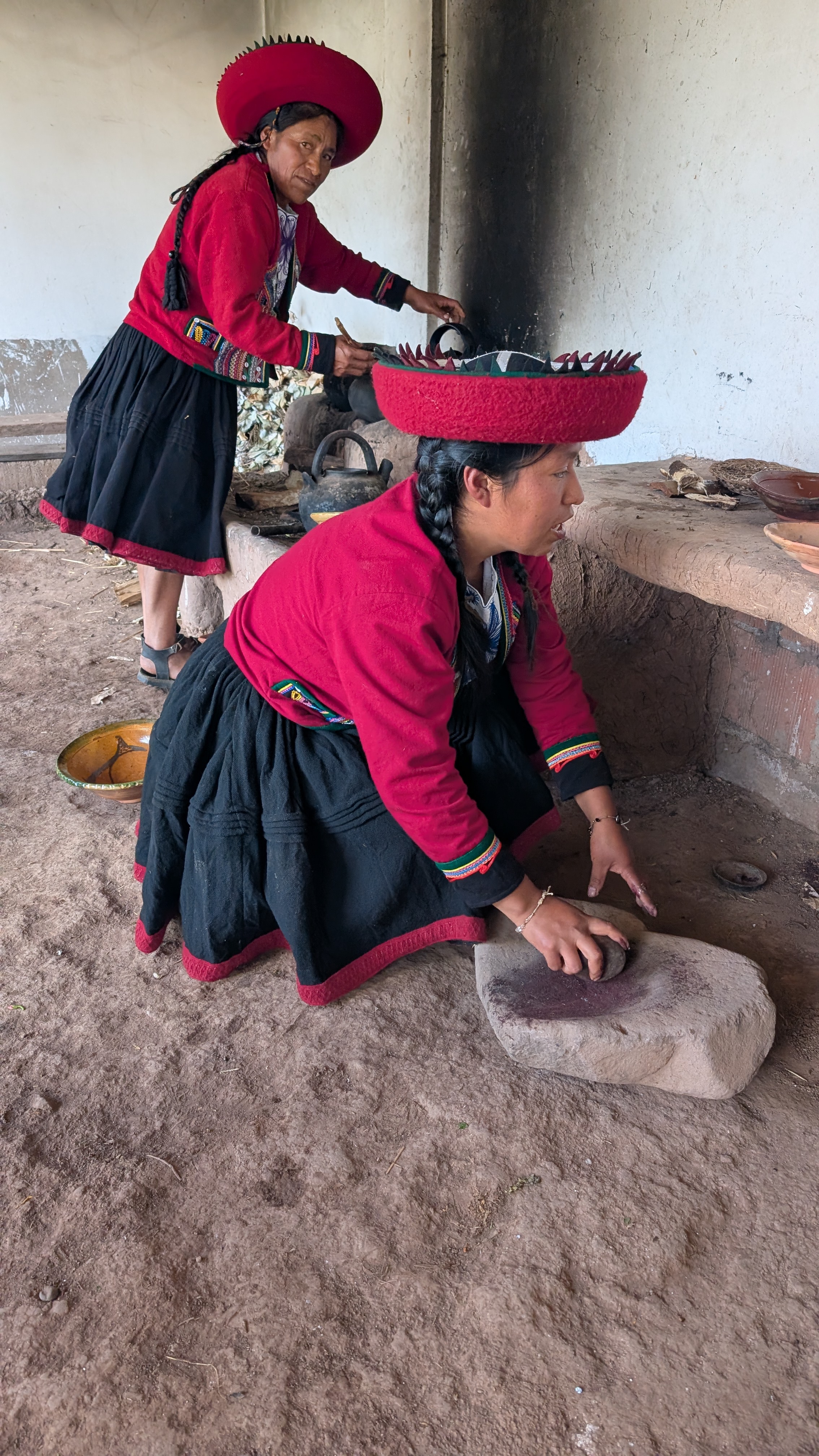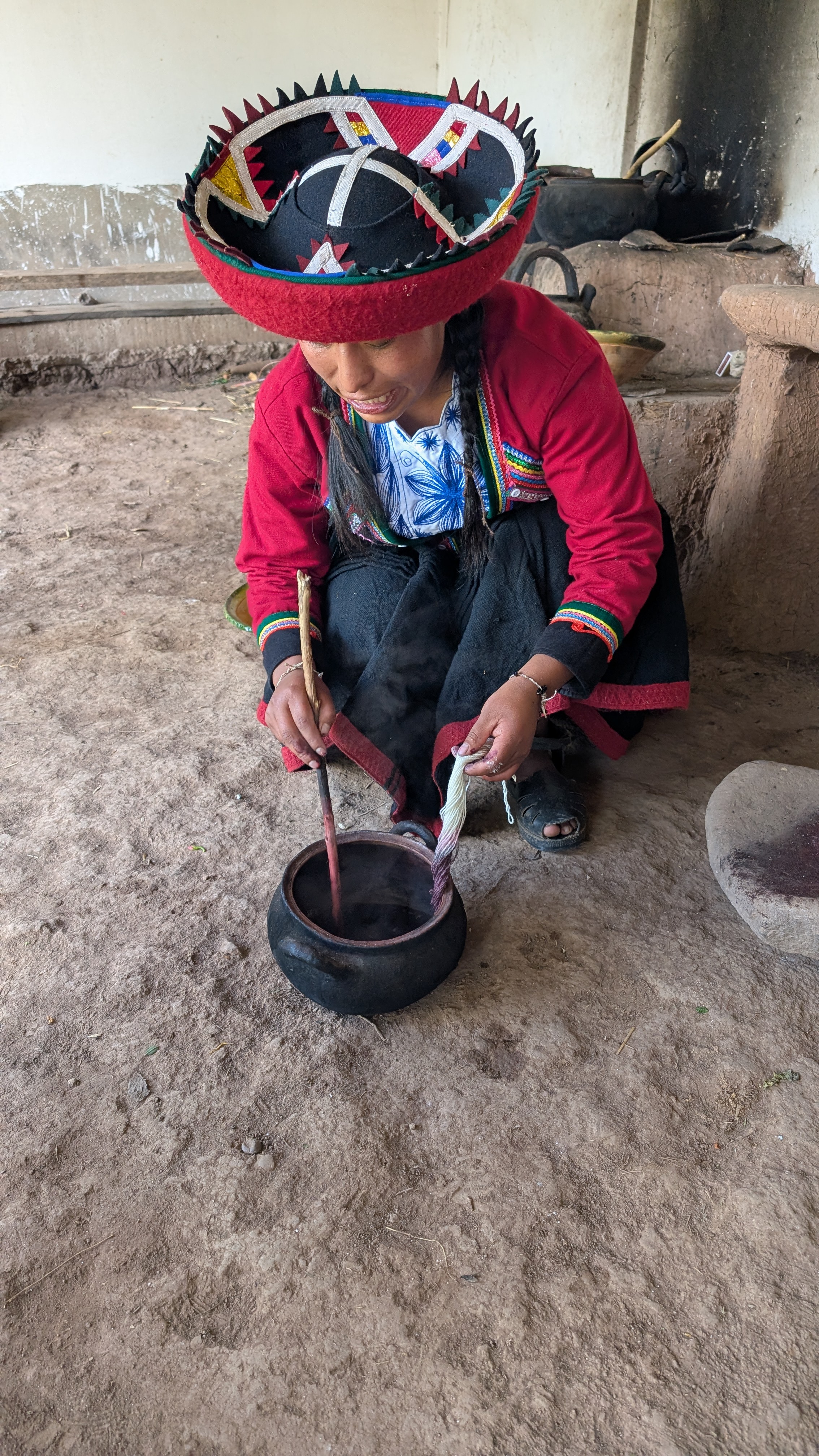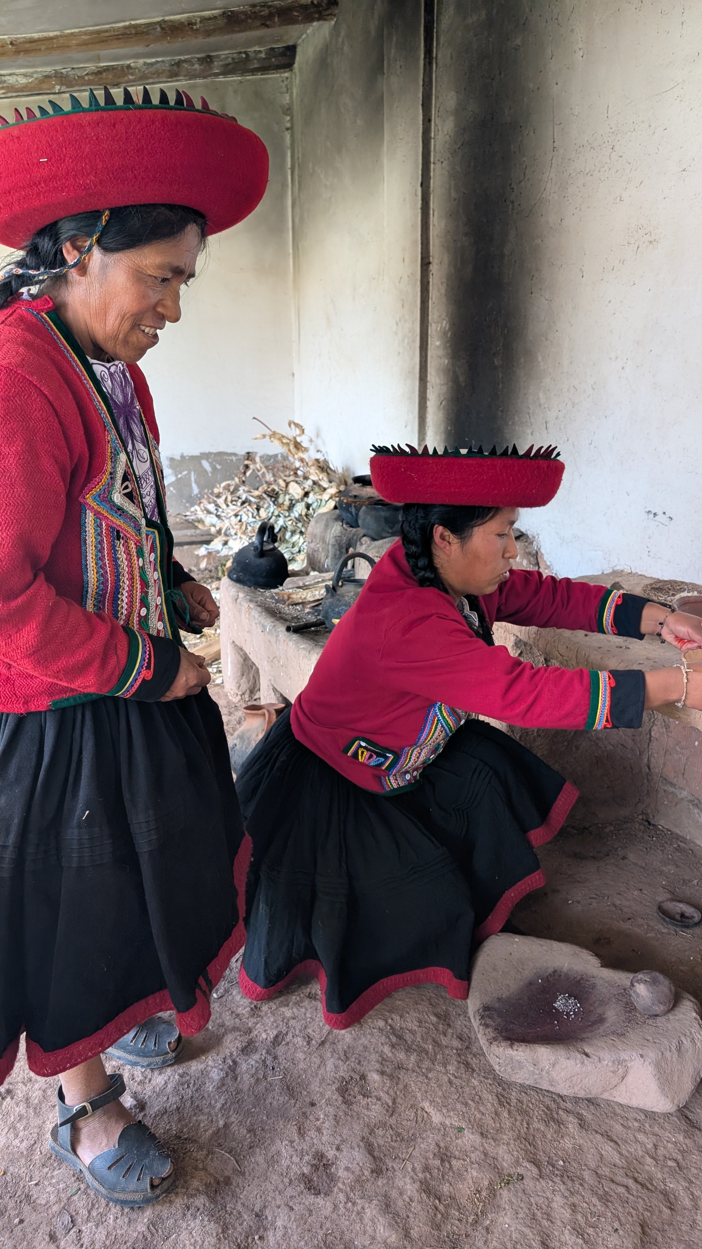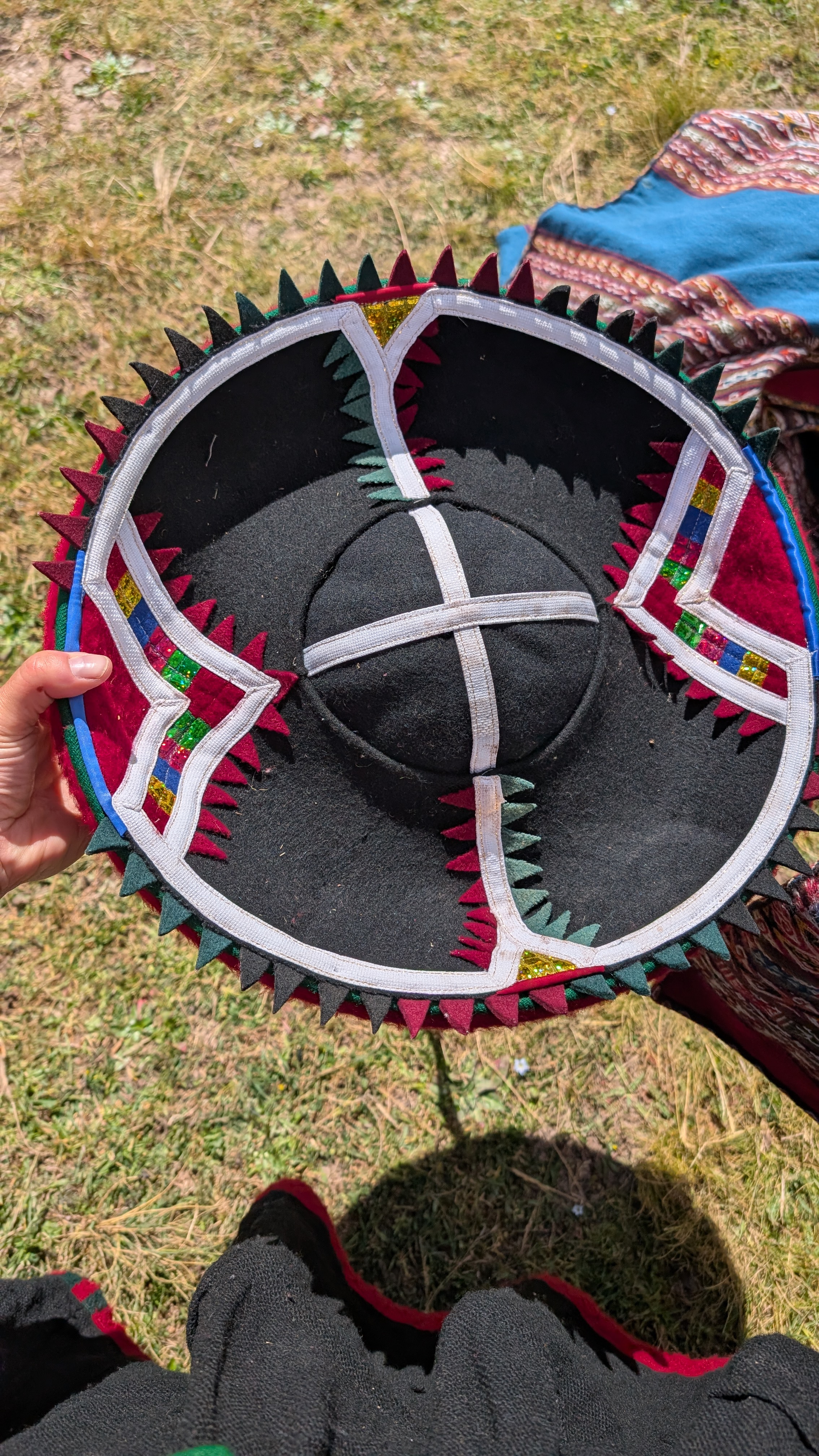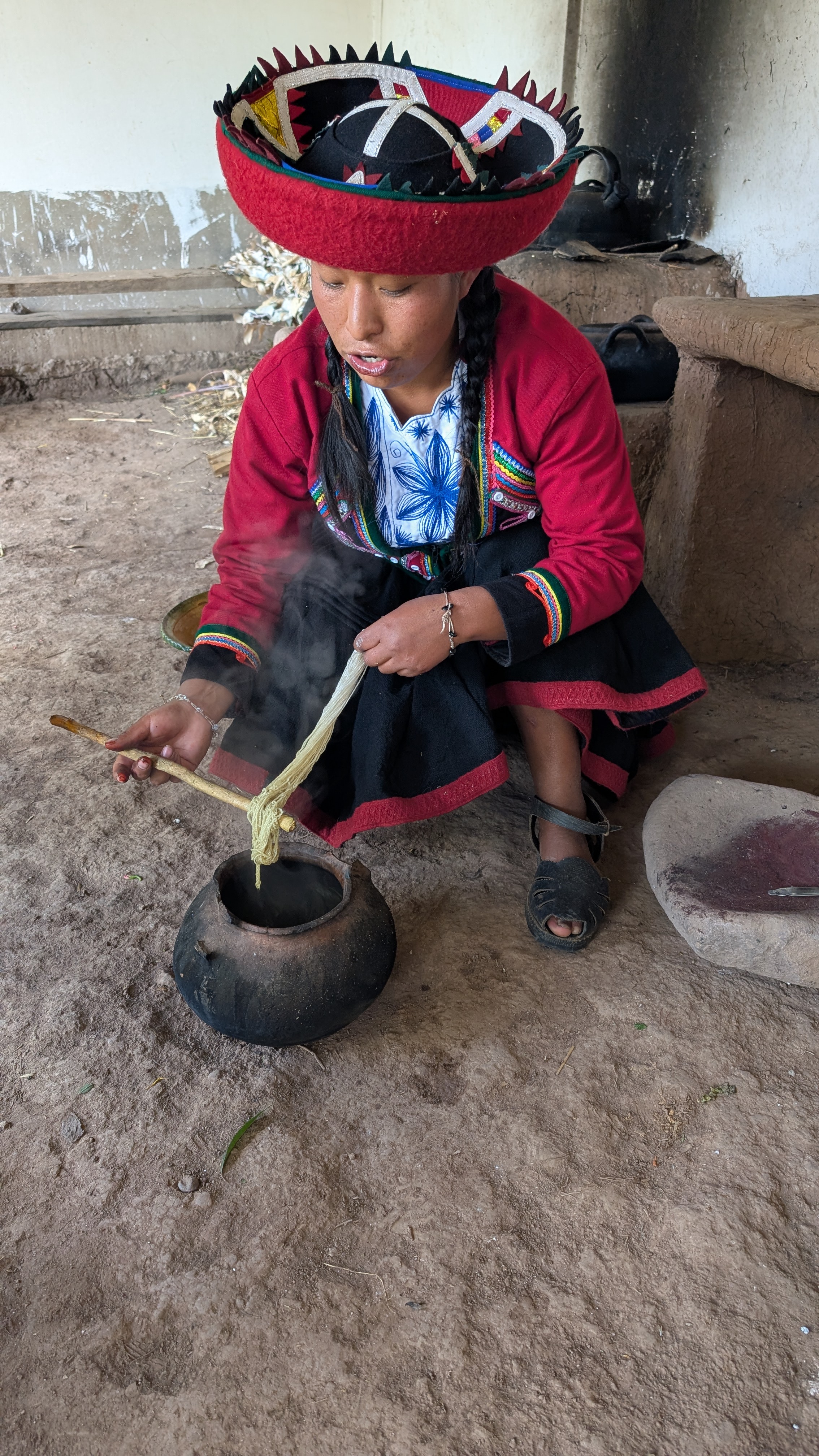 The rigid hats that we are wearing are quite heavy and when I investigate, I find a beautiful pattern on the top. The traditional hat, or montera, whose design is specific to Chinchero, represents the community identity. The white stripes represent pathways or stone steps (like the Inca Trail). The rainbow-like bands represent the k’uychi or rainbow, which is a symbol of Divine Protection. The triangles often represent mountains or Apus. And the red and green represent the vibrant landscape. I’m sure there’s much more to know about the intricacies of the hat but I forgot to get a tutorial when there in person.