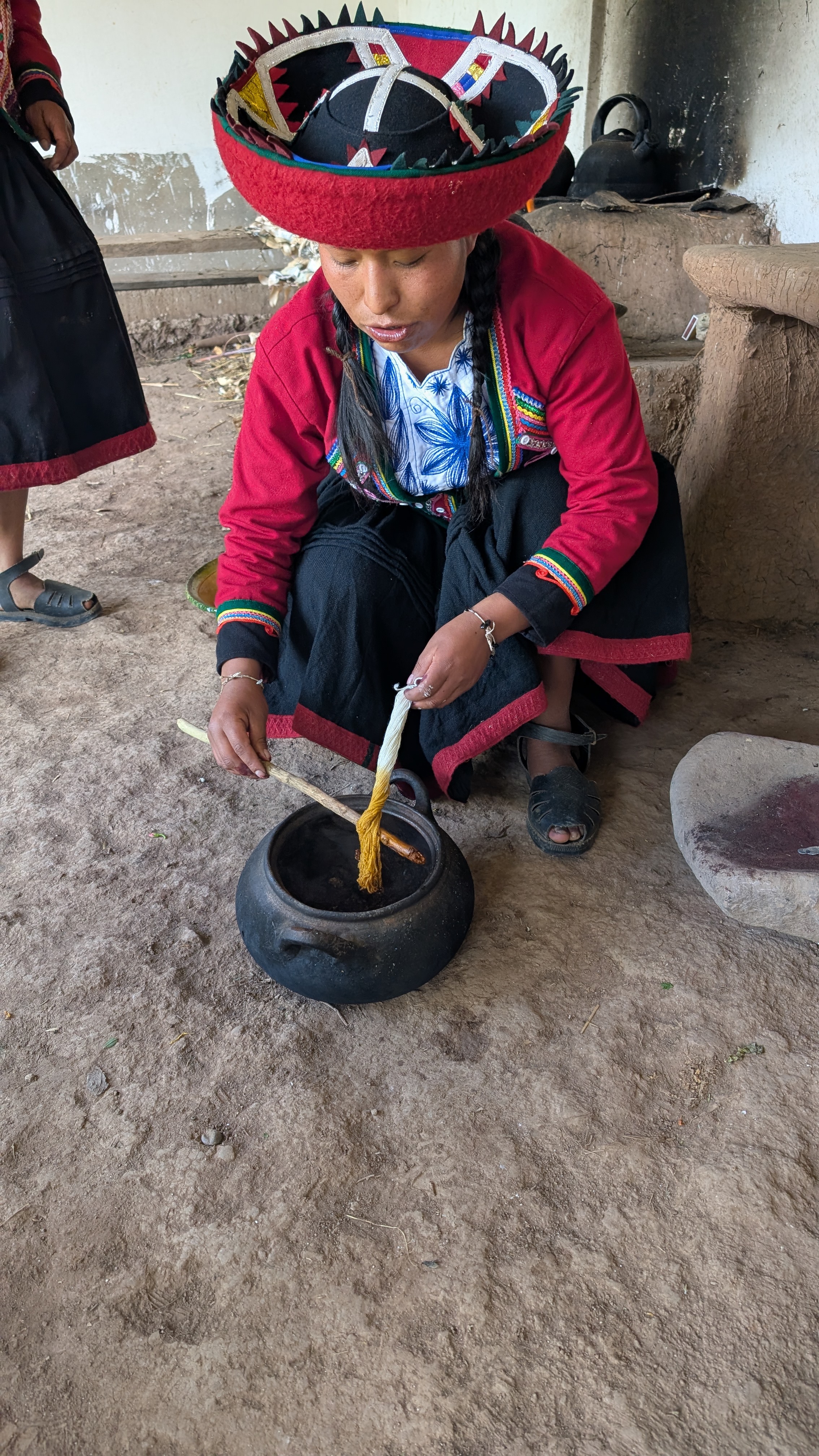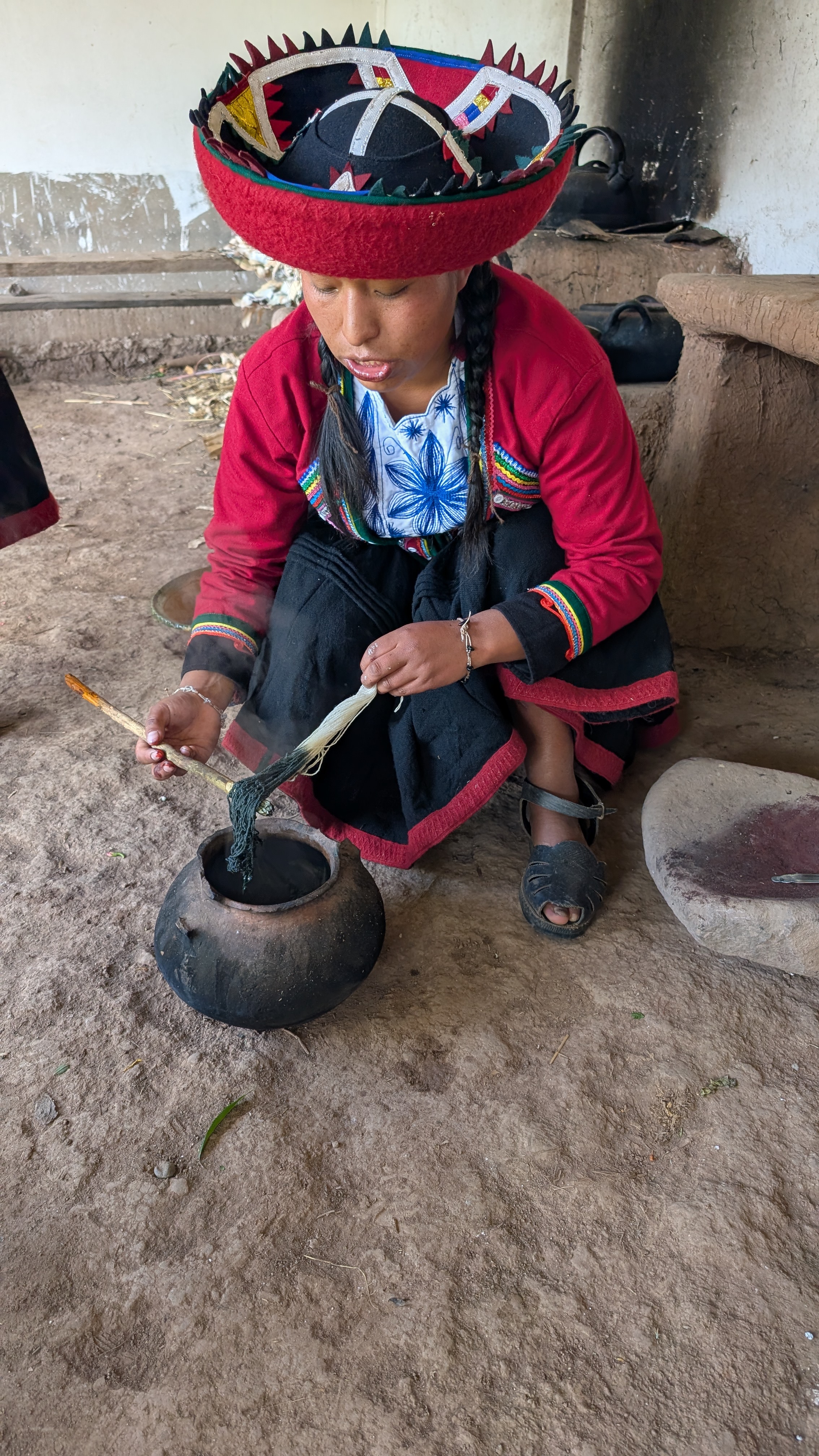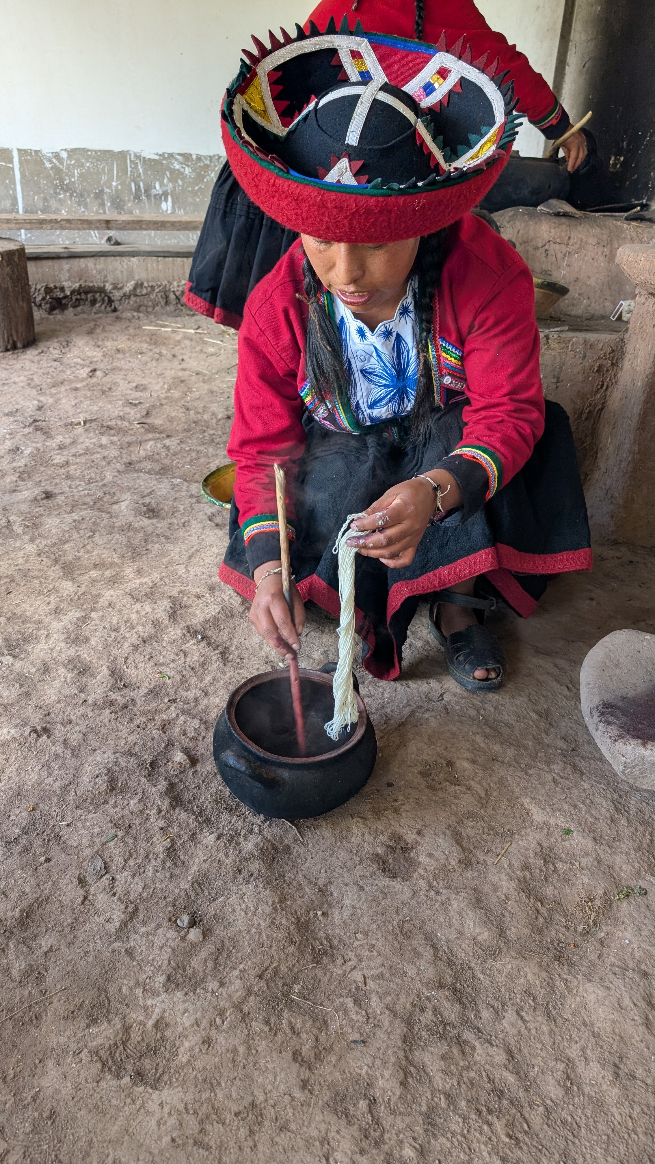 Obviously, the first step is that the sheep or alpaca wool must be harvested. Then comes the cleaning and spinning. They clean the wool by hand using a soap made from yucca root. They spin the wool using a drop spindle called a pushqa. Bellia, Damiana and Nudia all have big smiles on their faces about how they spin while doing all sorts of other tasks. Spin while cooking. Spin while caring for children. Spin while walking to town. Always spinning! And proud of it!
