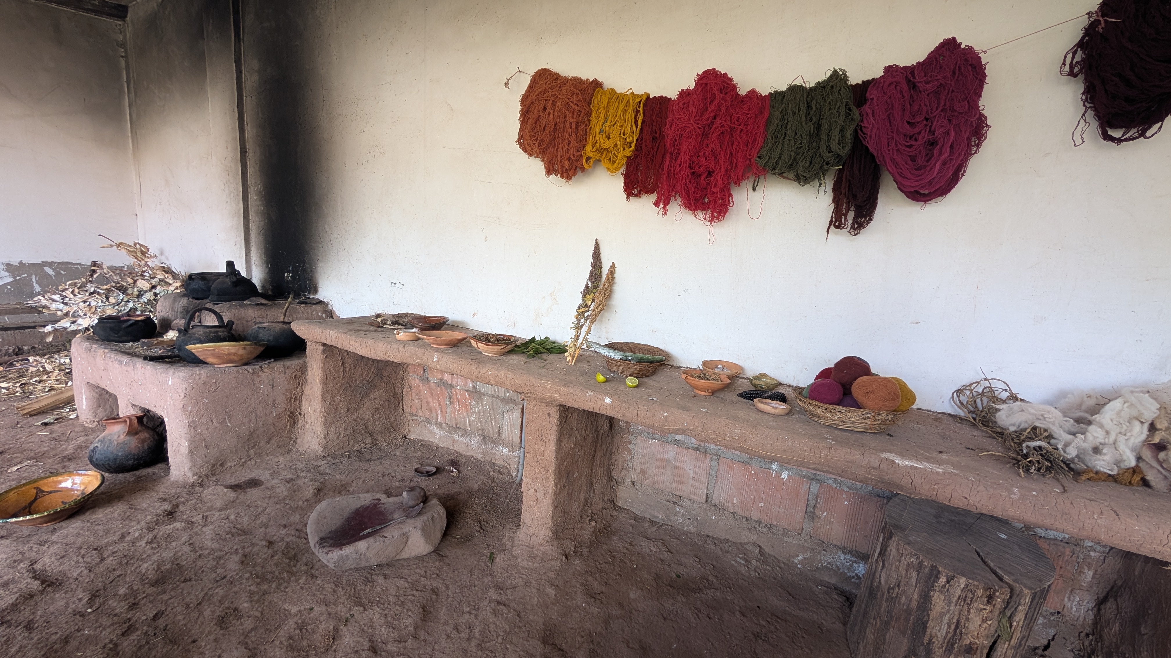 Above: Zoom in to check out the earthen stove, pots, grinding stone, different plants, citrus, unspun and hanging dyed wool.