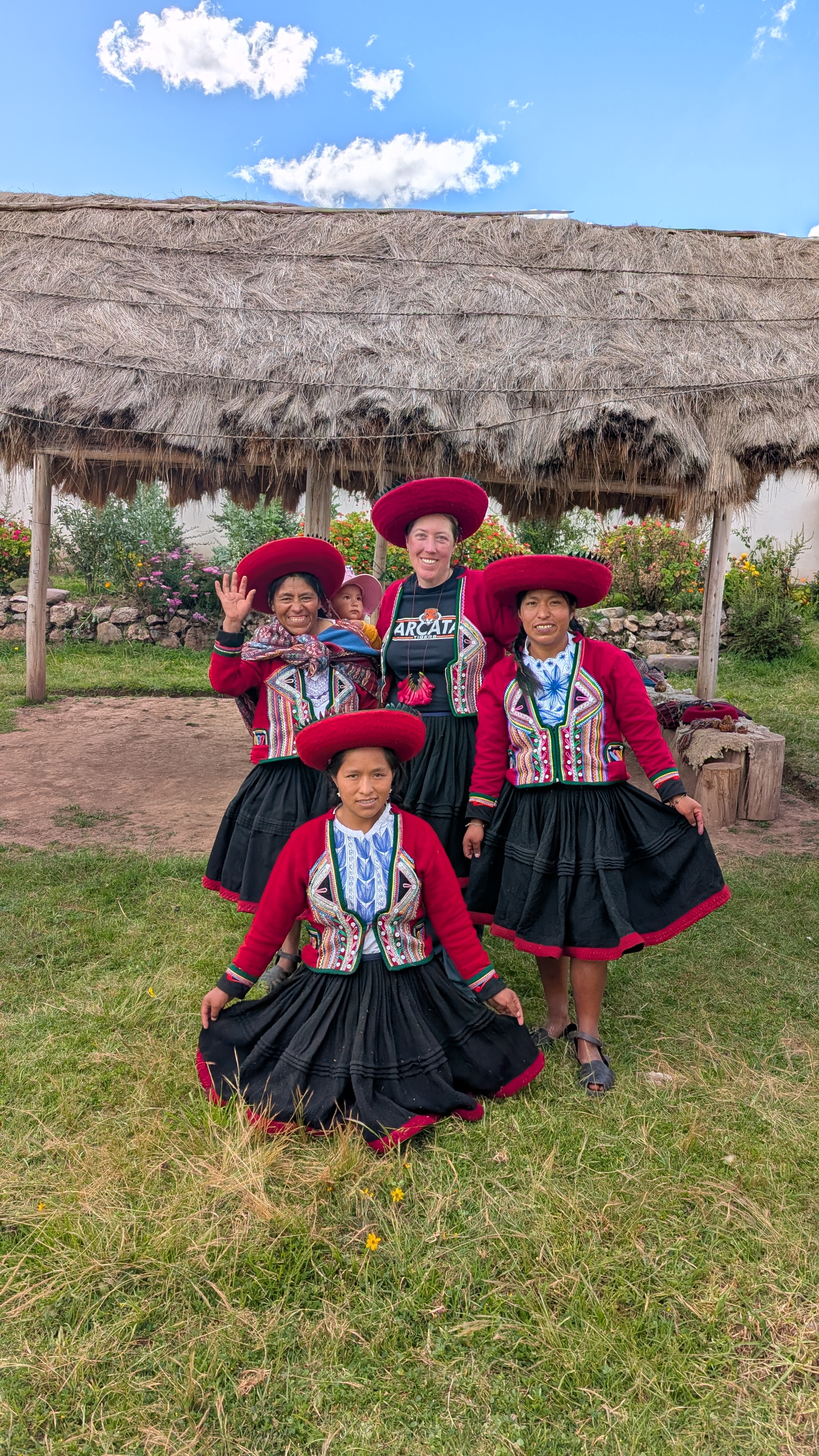 After the weaving demonstration they show me into a room where they have woven items for sale. My main goal is to purchase a blanket or manta but they have many things, and I wish I could buy them all. Blankets, purses, placemats, pouches and more! They have three or four blankets for sale and it’s hard to choose. I had thought that I would get a blanket made out of alpaca but the one I like the most is made from sheep’s wool. The blankets or mantas are $300 USD but I’m five dollars short (because I gave the driver from Ausangate a $5 tip). Luckily, $295 is enough. With soles, I also buy a hand-stitched hanging decoration with small balls of yarn and the Cantua flower and an etched gourd. I don’t know what today’s excursion should cost but I donate as much as I can while leaving enough to give Ronnie for arranging everything and driving. Before I take off the traditional clothing I’ve been honored to wear, we get a group photo. As I prepare to leave, they bring out some woven bracelets and ask me to choose one. I narrow it down to two that I like the most and then I ask Nudia to choose. She selects one and helps put it on my wrist.