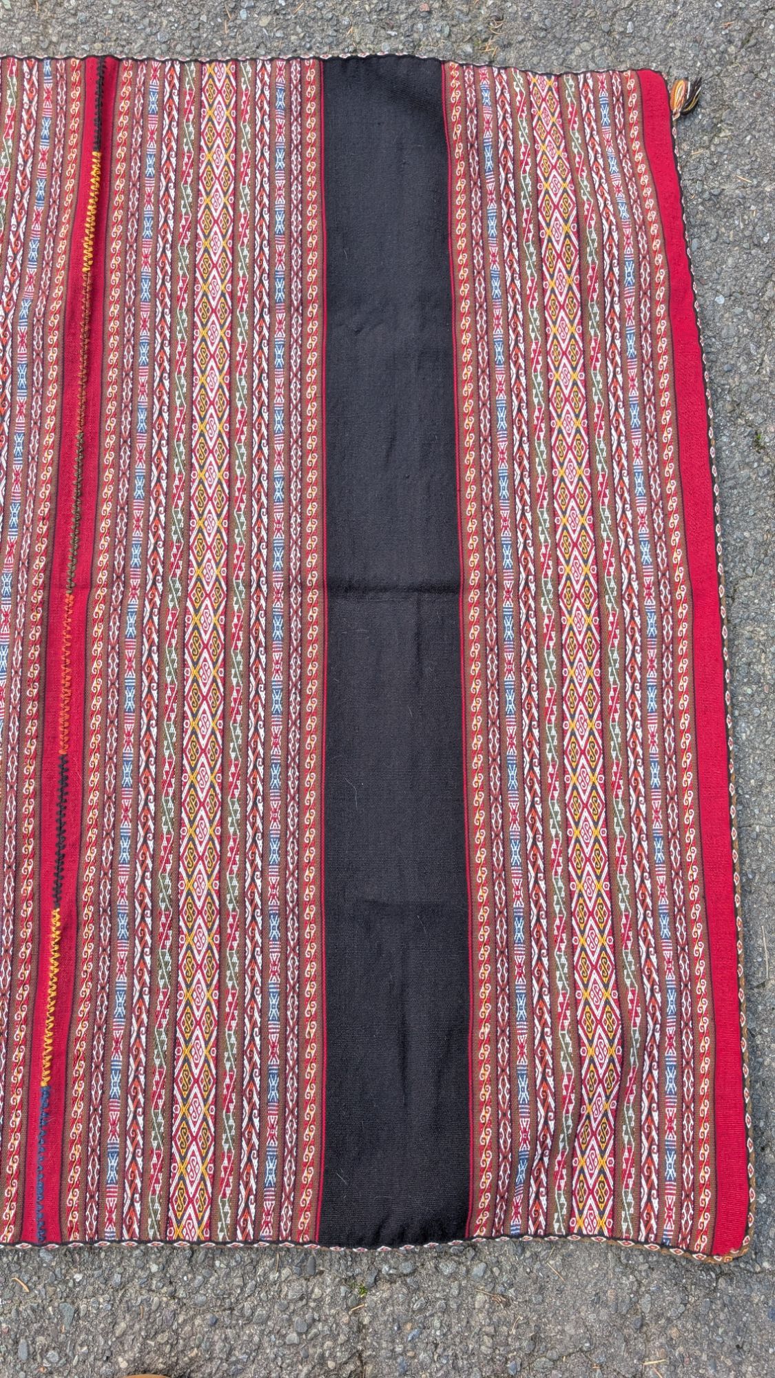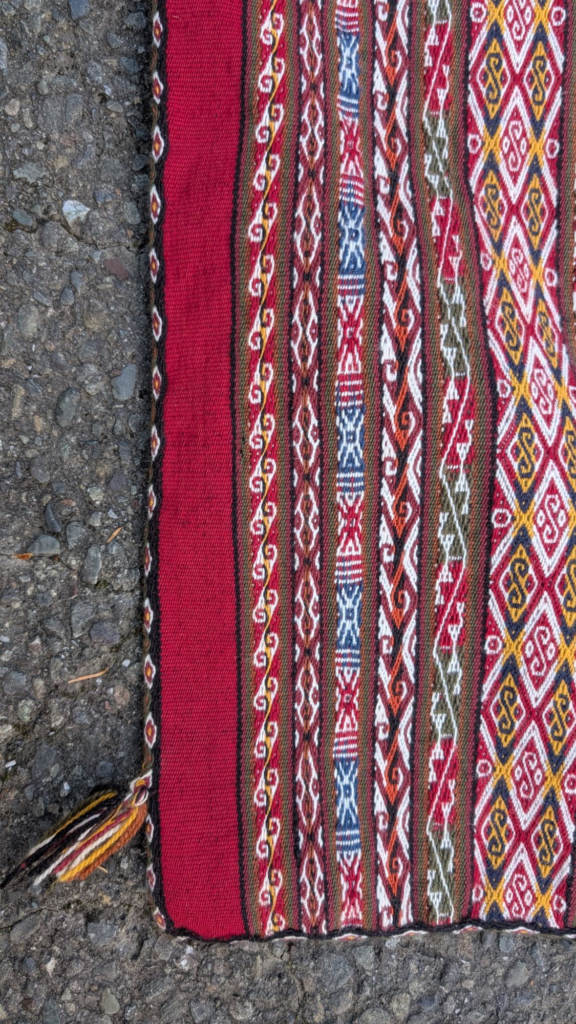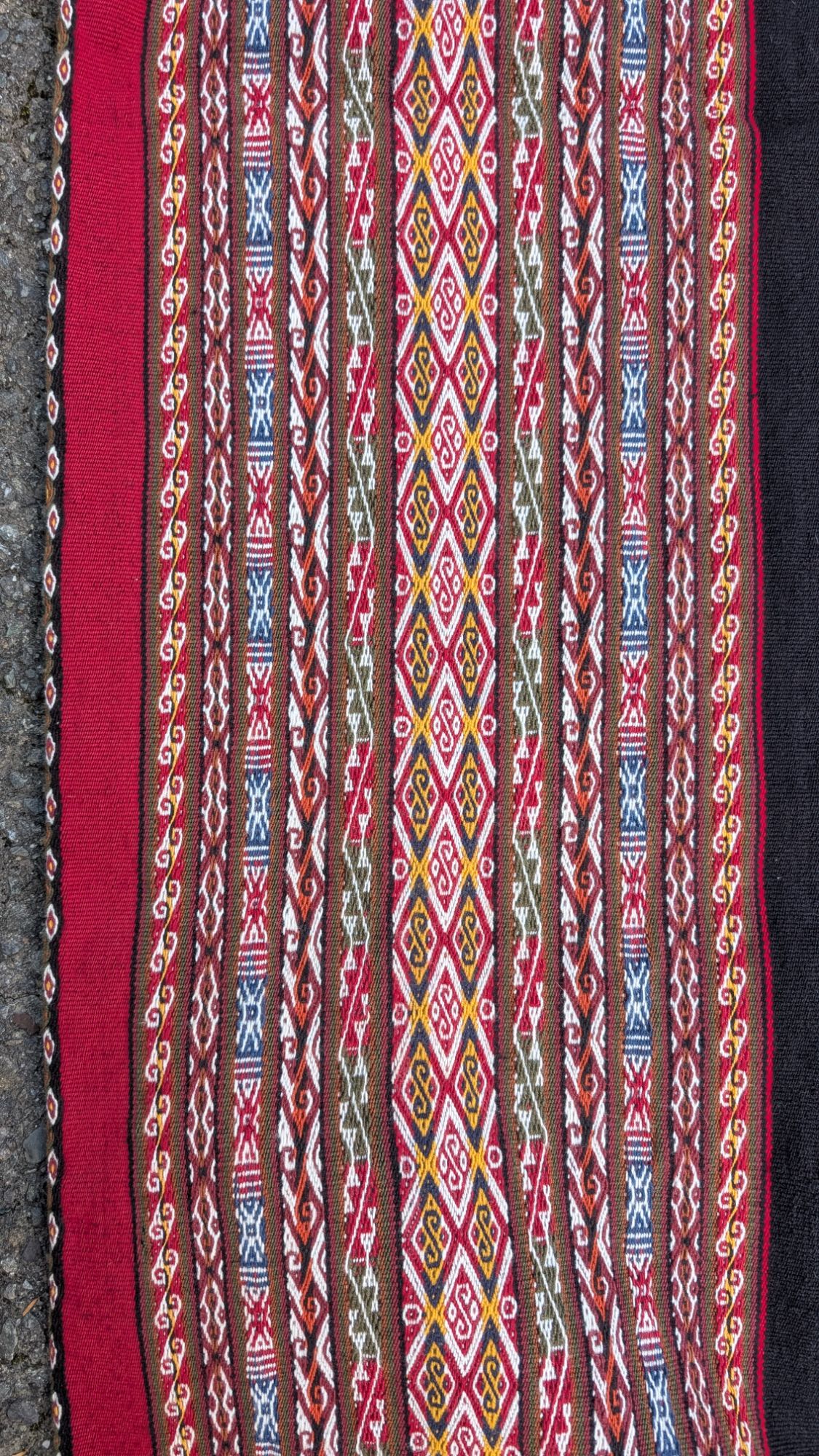 Here’s the piece of Chinchero weaving art that I was able to bring home with me. It was made as two separate pieces and then hand stitched together – that’s the zigzag stitch down the middle. The different designs represent things that are central to their culture like the Inca Trail, puma, weaving tools, mountains, rivers and plants. The four-color luraypo pattern (main motif) is displayed prominently as the center of design sections. The white cross with the yellow center represents the four cardinal points with Cusco as the center of the world. The white circles represent the puma’s eyes. The red circles/diamonds represent the two lagoons in Chinchero and the red points of the diamond represent the mountains. The black symbol is the representation of an agricultural tool. Moving outwards is the red and green Inca Trail. The other patterns may represent meandering rivers, puma footprints, flowers, plants that grow on rocks, stars and the reflection of light in water. In Chinchero, textiles are often finished with a tubular edging called ñawi awapa, meaning “eye border” in Quechua. The cord is patterned with woven eyes which watch over the fabric protecting it spiritually, and guard it from physical wear. Chinchero’s textiles are globally recognized for their quality and authenticity. These mantas carry the legacy of a tradition that has endured for centuries.