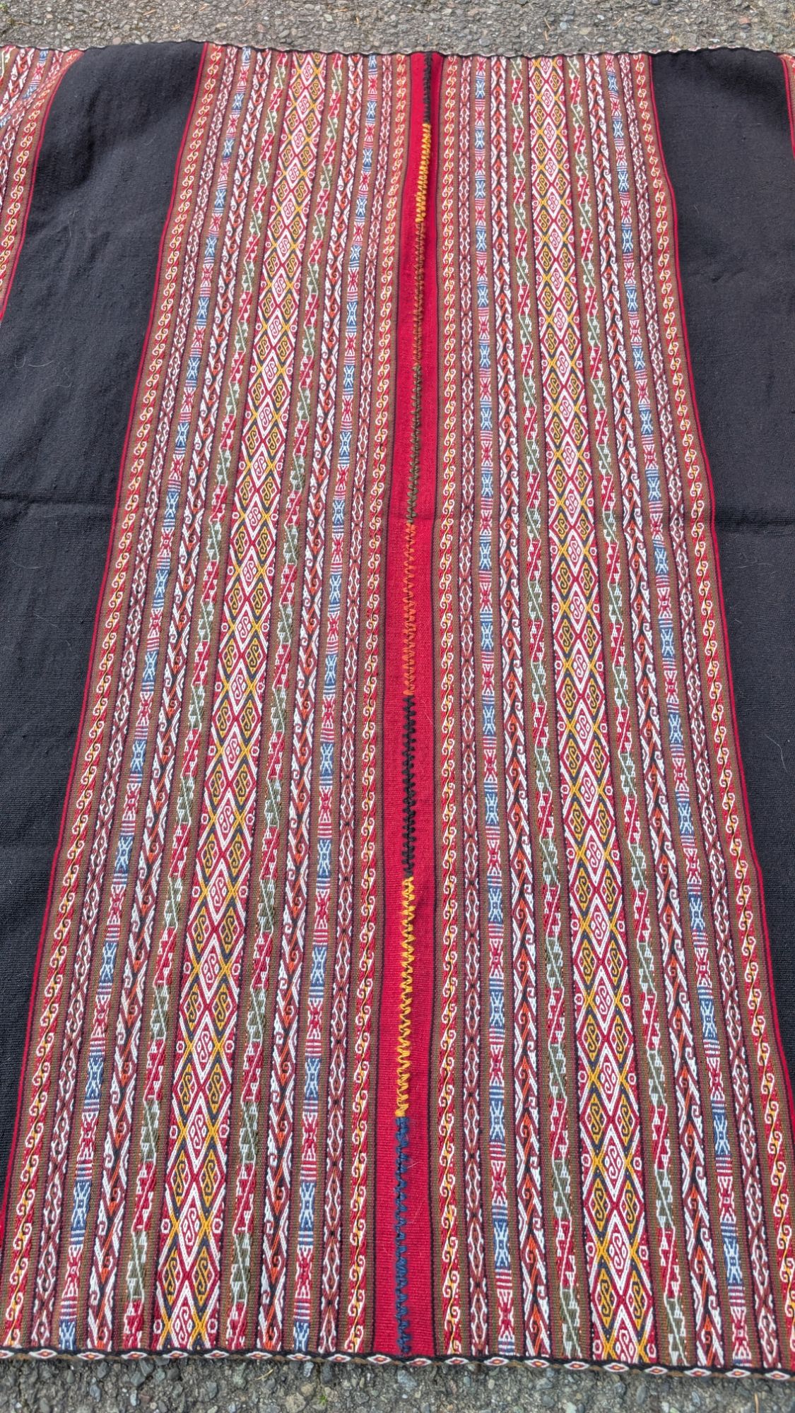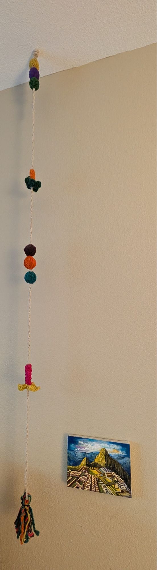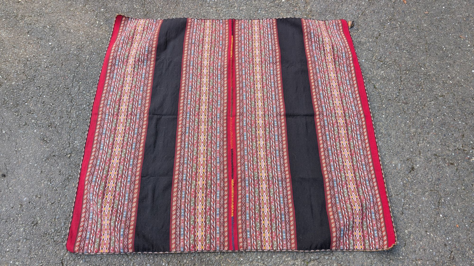 Here’s the piece of Chinchero weaving art that I was able to bring home with me. It was made as two separate pieces and then hand stitched together – that’s the zigzag stitch down the middle. The different designs represent things that are central to their culture like the Inca Trail, puma, weaving tools, mountains, rivers and plants. The four-color luraypo pattern (main motif) is displayed prominently as the center of design sections. The white cross with the yellow center represents the four cardinal points with Cusco as the center of the world. The white circles represent the puma’s eyes. The red circles/diamonds represent the two lagoons in Chinchero and the red points of the diamond represent the mountains. The black symbol is the representation of an agricultural tool. Moving outwards is the red and green Inca Trail. The other patterns may represent meandering rivers, puma footprints, flowers, plants that grow on rocks, stars and the reflection of light in water. In Chinchero, textiles are often finished with a tubular edging called ñawi awapa, meaning “eye border” in Quechua. The cord is patterned with woven eyes which watch over the fabric protecting it spiritually, and guard it from physical wear. Chinchero’s textiles are globally recognized for their quality and authenticity. These mantas carry the legacy of a tradition that has endured for centuries.