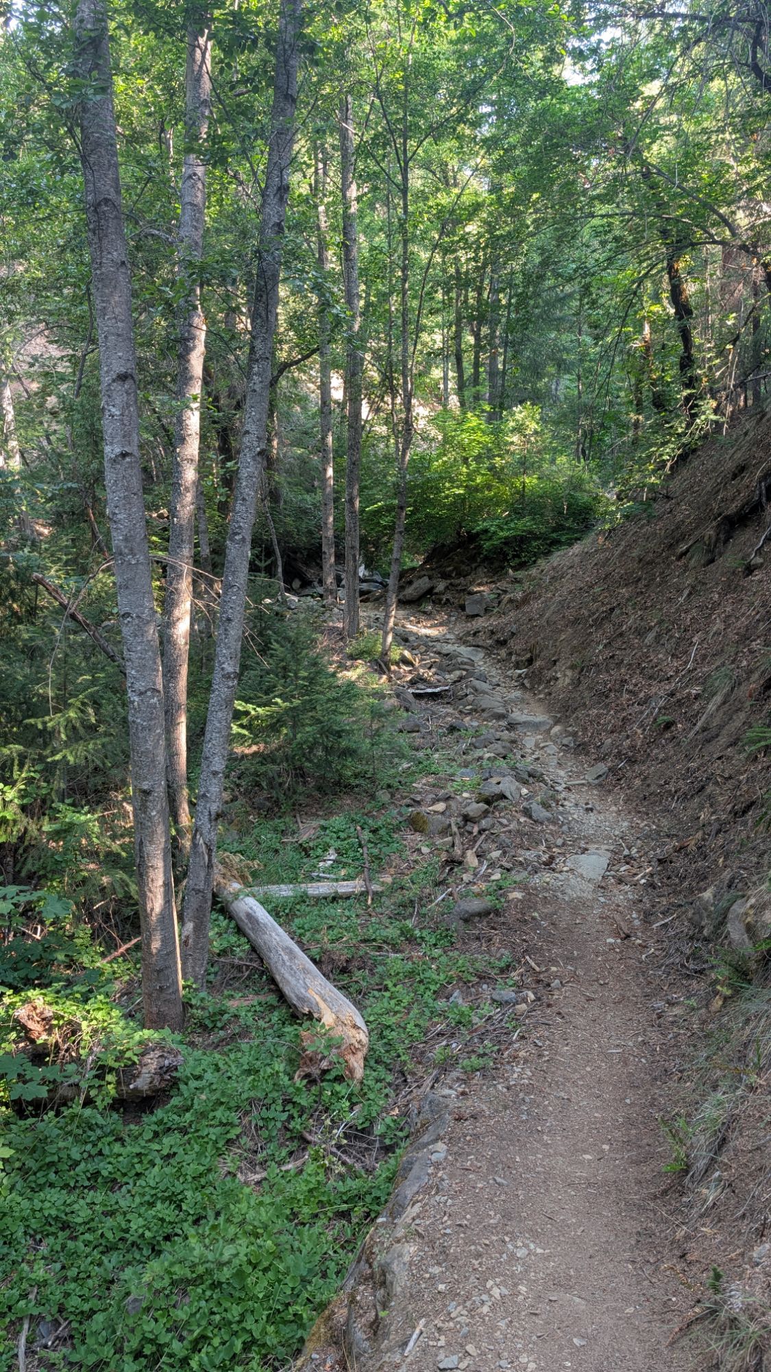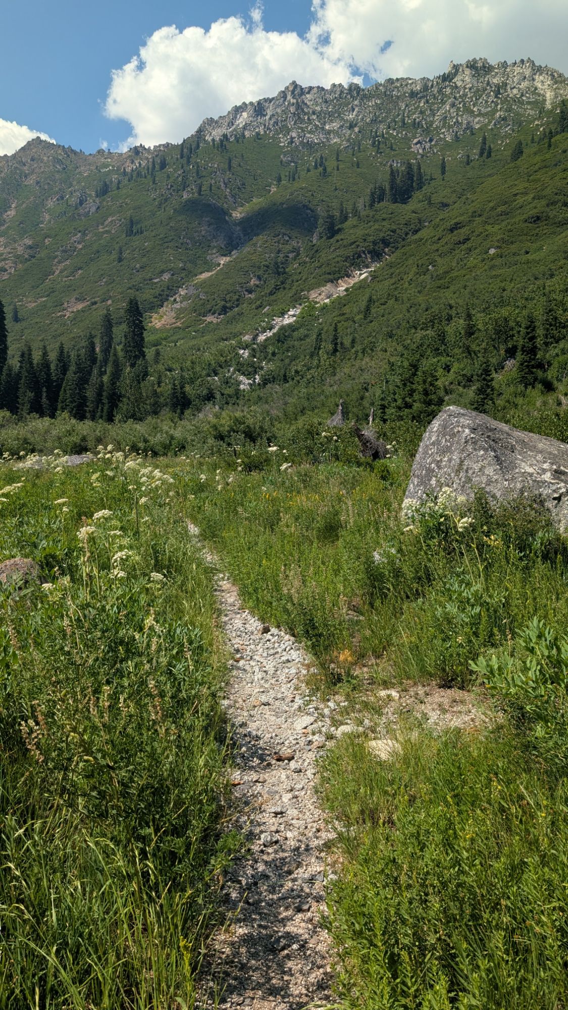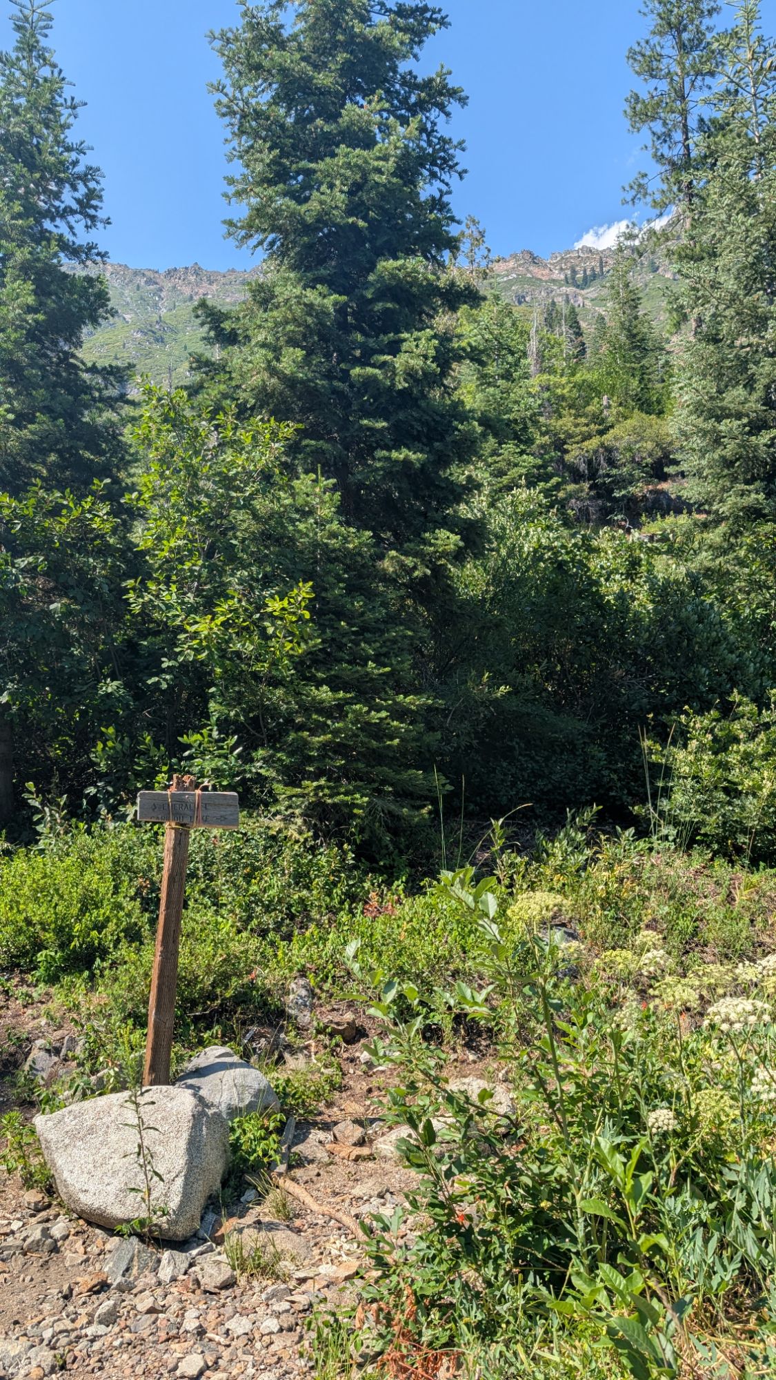 Stuart Fork rushes loudly to my left as I start to climb gradually. There’s a few hover flies in my face but they are easy enough to clear. The trail is shaded and I easily cross over small tributaries to Stuart Fork. An older hippy woman wearing a t-shirt with a lot of words on it and her dog approach me at a bend in the trail. I’m quite surprised to see her wearing big headphones which are now around her neck. I think she is the first person I’ve ever seen that’s older than me wearing headphones. Ever. Not to mention out in nature on a trail. As her dog passes me, it starts to growl and she laughs. I kind of mutter under my breath that it’s not funny.