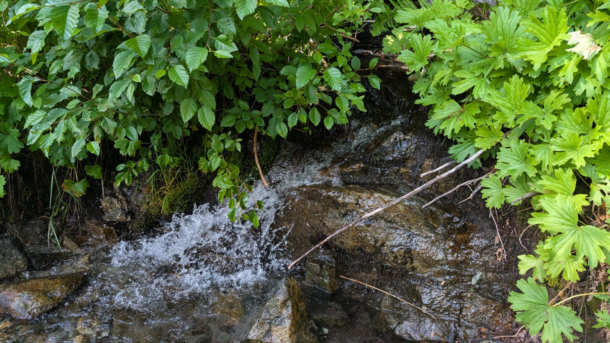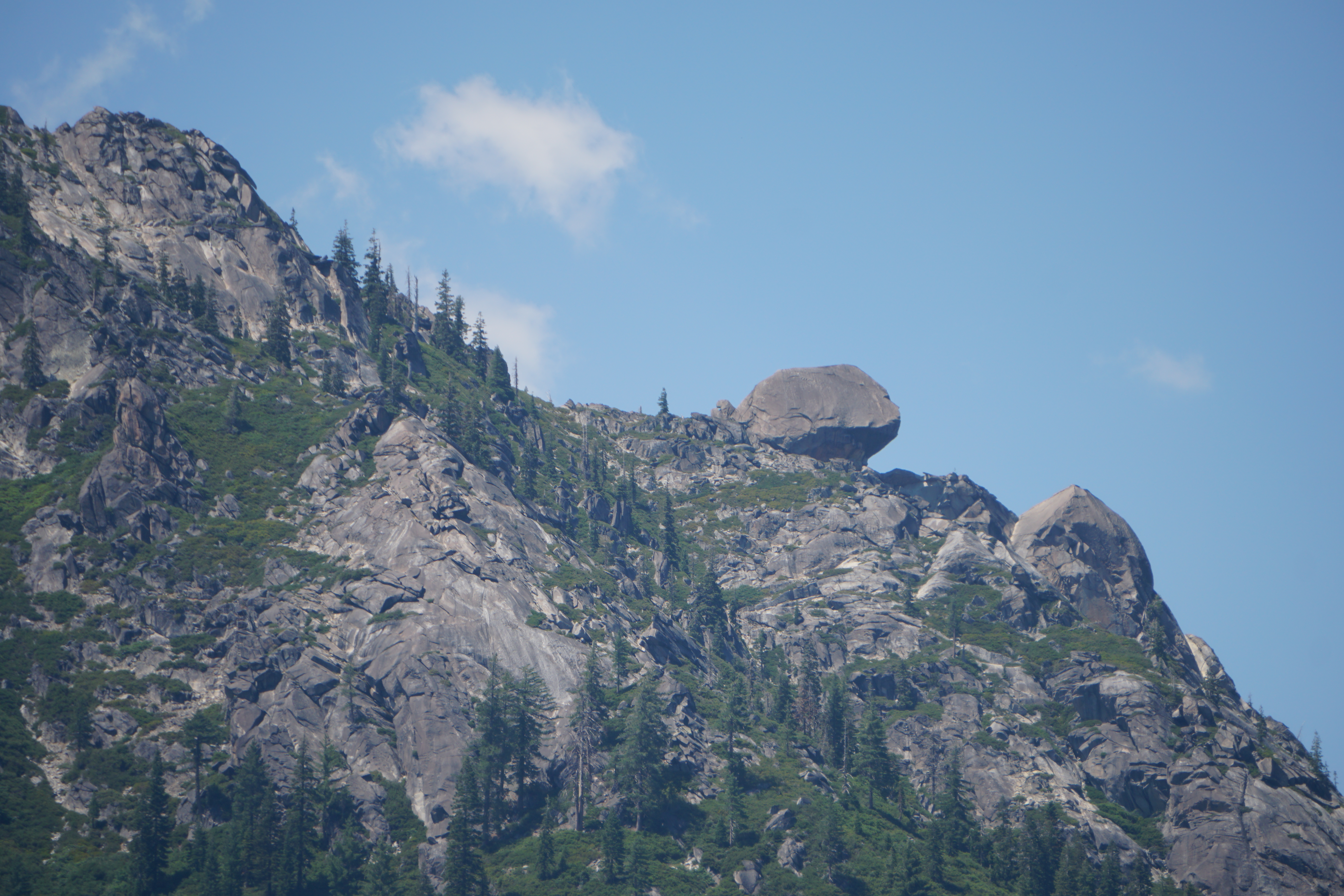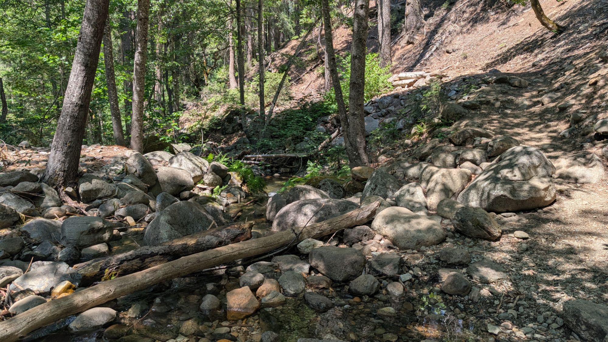 Stuart Fork rushes loudly to my left as I start to climb gradually. There’s a few hover flies in my face but they are easy enough to clear. The trail is shaded and I easily cross over small tributaries to Stuart Fork. An older hippy woman wearing a t-shirt with a lot of words on it and her dog approach me at a bend in the trail. I’m quite surprised to see her wearing big headphones which are now around her neck. I think she is the first person I’ve ever seen that’s older than me wearing headphones. Ever. Not to mention out in nature on a trail. As her dog passes me, it starts to growl and she laughs. I kind of mutter under my breath that it’s not funny.