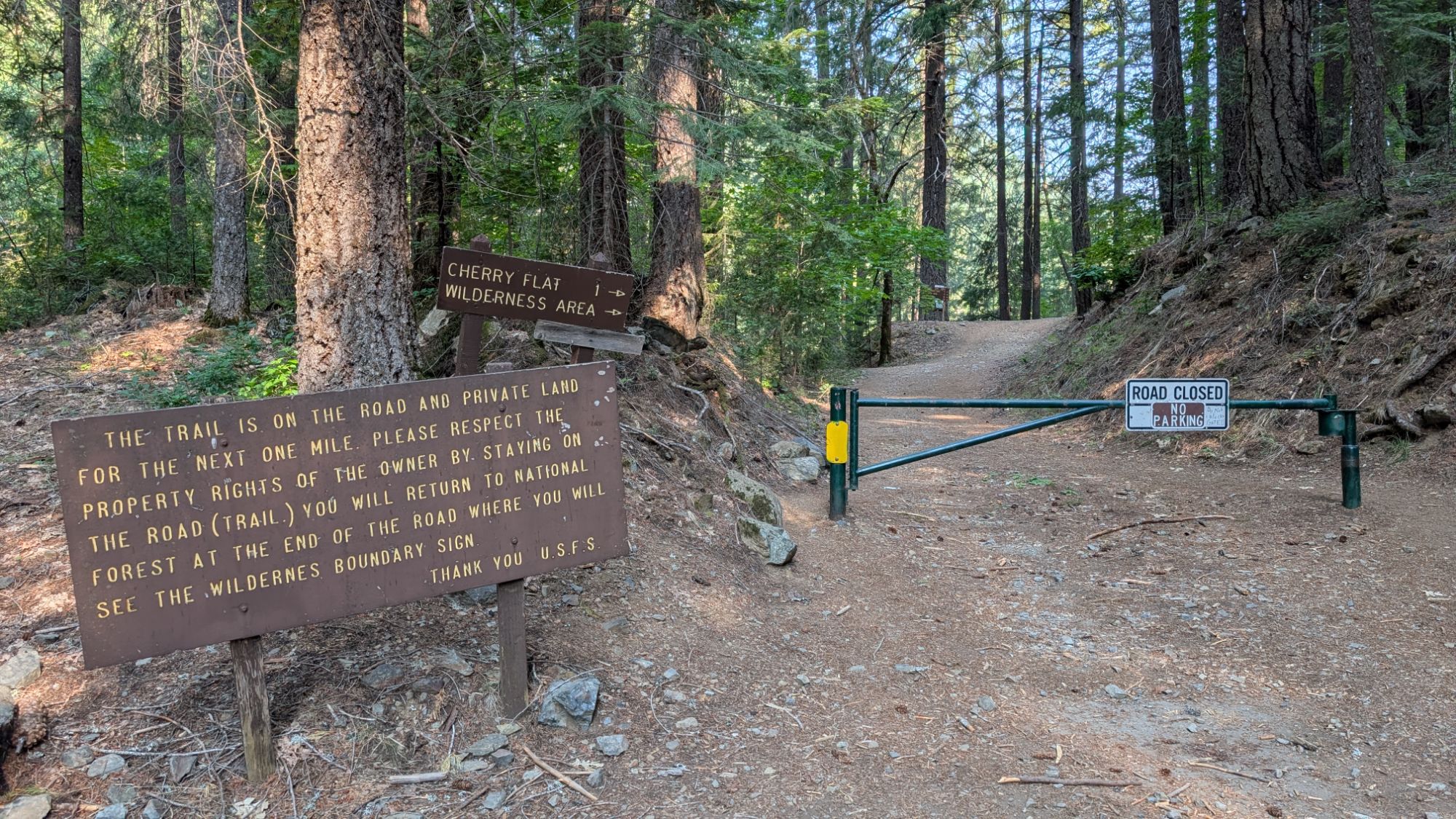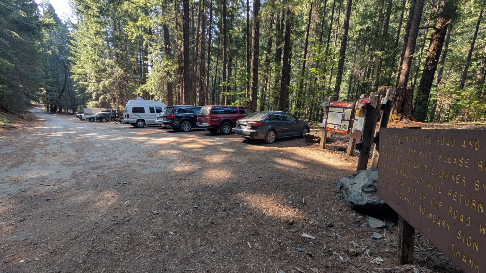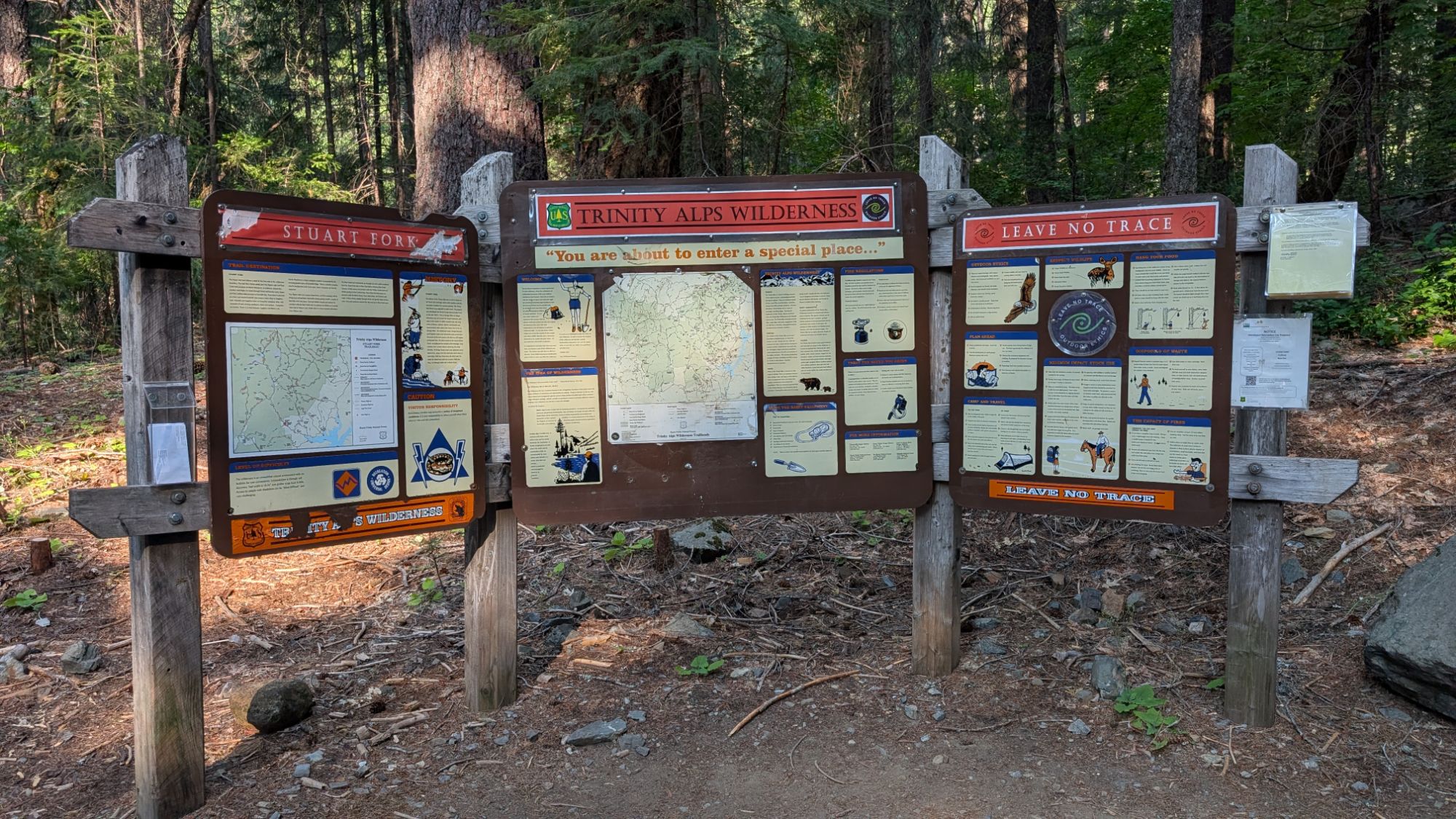 I hit the road at 6 am to start the 2 hour drive to Weaverville. There’s quite a bit of construction and slow trucks so it’s more like 8:15 am when I arrive at the Weaverville Ranger Station. I have the outside air flowing into my truck and it’s already warm. I force myself not to turn on the air conditioning. Luckily I can pick up the free permit outside the ranger office since they don’t open until 8:30 am. I fill out the card and drop the little stub with all my details in the wooden box. I head north on hwy 3 before turning left onto Trinity Alps Road. It’s a paved road and I pass guys on bicycles and moms pushing strollers who must be guests at the Trinity Alps Resort. The road goes right through the resort so I drive extra slow since there are families riding bicycles and kids playing in the road. Not far past the general store, there’s a sign that reads Stuart Fork Trailhead 2 miles. The road turns to dirt and I pull into the trailhead about 9 am.